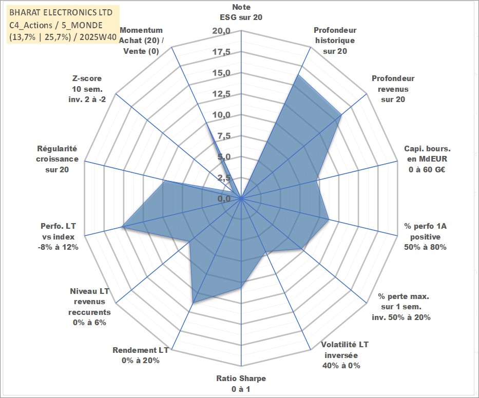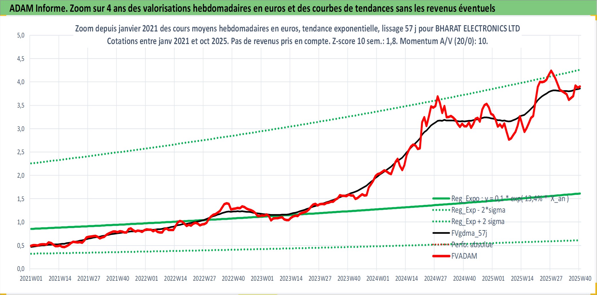 Site dédié aux investisseursPage dédiée sur site financeAnalyse des valorisations hebdomadaires de l'action BHARAT ELECTRONICS LTD. Cet actif est cote en INR. Les valorisations sont en contrevaleur EURO et couvrent les semaines 2002W27 a 2025W40. Les revenus de cet actif financier sont pris en compte depuis la semaine 2002W37. La note ESG de cet actif n'est pas connue.