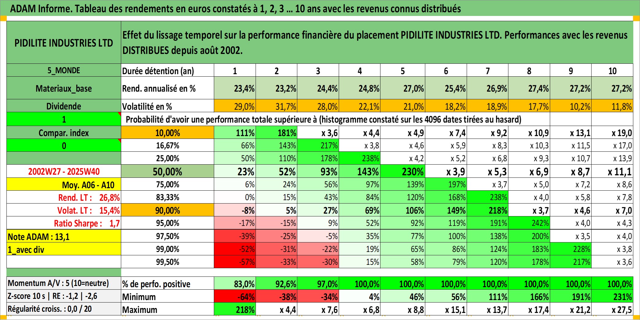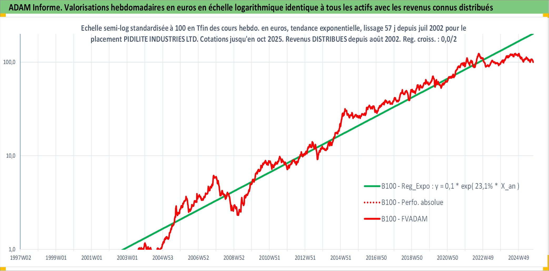 Site dédié aux investisseursPage dédiée sur site financeAnalyse des valorisations hebdomadaires de l'action PIDILITE INDUSTRIES LTD. Cet actif est cote en INR. Les valorisations sont en contrevaleur EURO et couvrent les semaines 2002W27 a 2025W40. Les revenus de cet actif financier sont pris en compte depuis la semaine 2002W34. La note ESG de cet actif n'est pas connue.