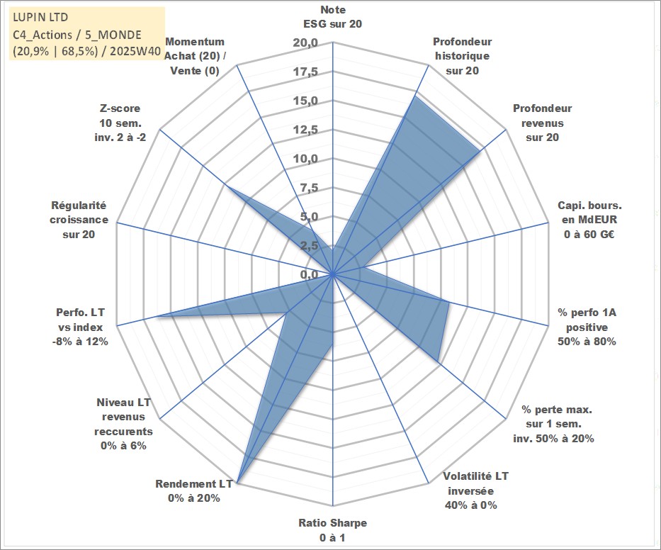 Site dédié aux investisseursPage dédiée sur site financeAnalyse des valorisations hebdomadaires de l'action LUPIN LTD. Cet actif est cote en INR. Les valorisations sont en contrevaleur EURO et couvrent les semaines 2001W37 a 2025W40. Les revenus de cet actif financier sont pris en compte depuis la semaine 2002W04. La note globale ESG de cet actif est estimee a 2.0 (apres rebasage entre 0 et 20).