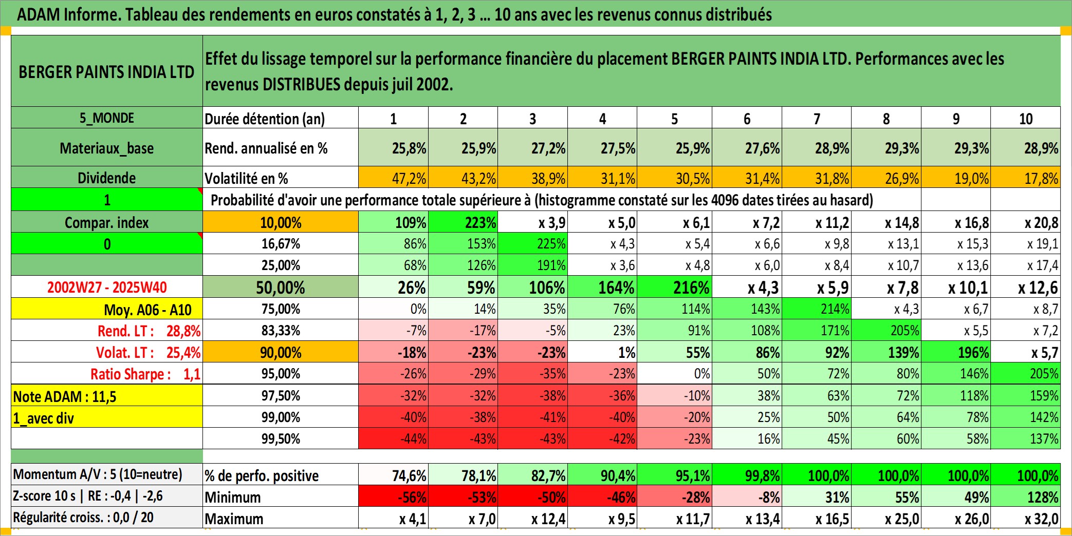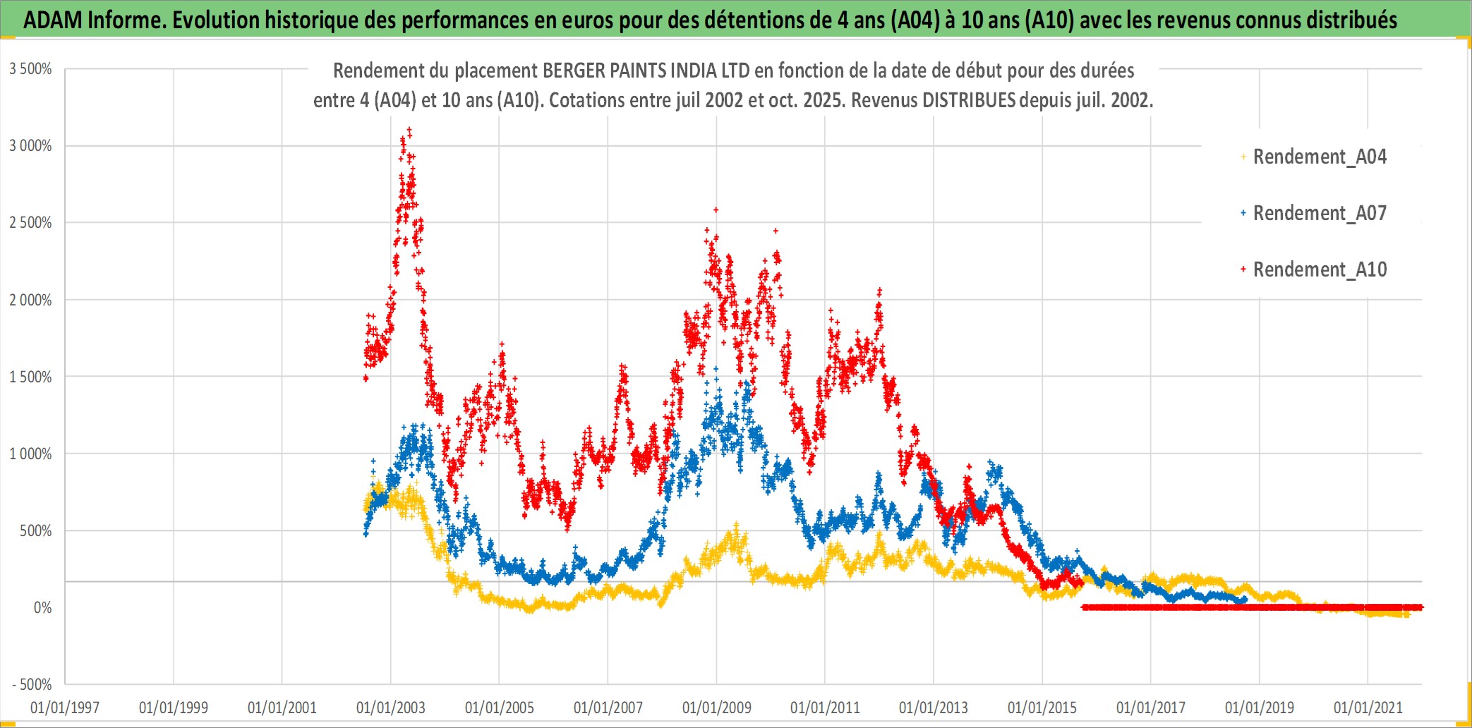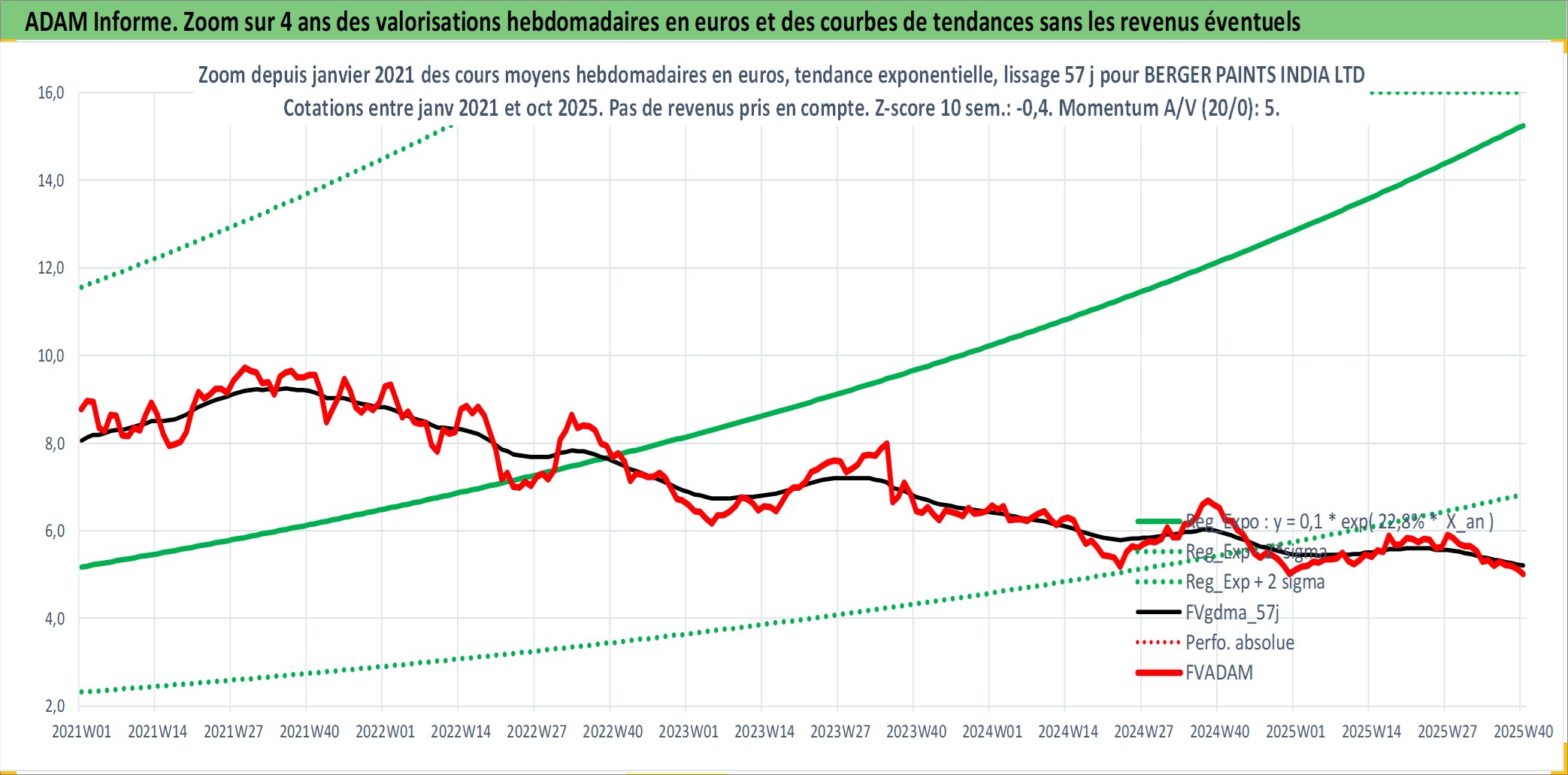 Site dédié aux investisseursPage dédiée sur site financeAnalyse des valorisations hebdomadaires de l'action BERGER PAINTS INDIA LTD. Cet actif est cote en INR. Les valorisations sont en contrevaleur EURO et couvrent les semaines 2002W27 a 2025W40. Les revenus de cet actif financier sont pris en compte depuis la semaine 2002W28. La note ESG de cet actif n'est pas connue.