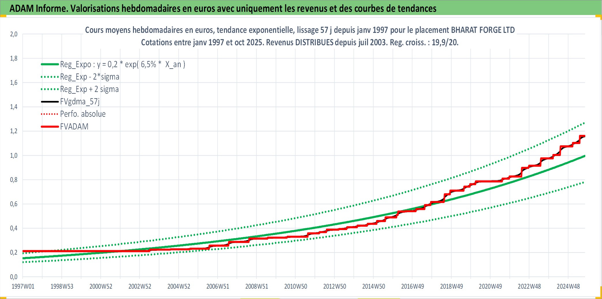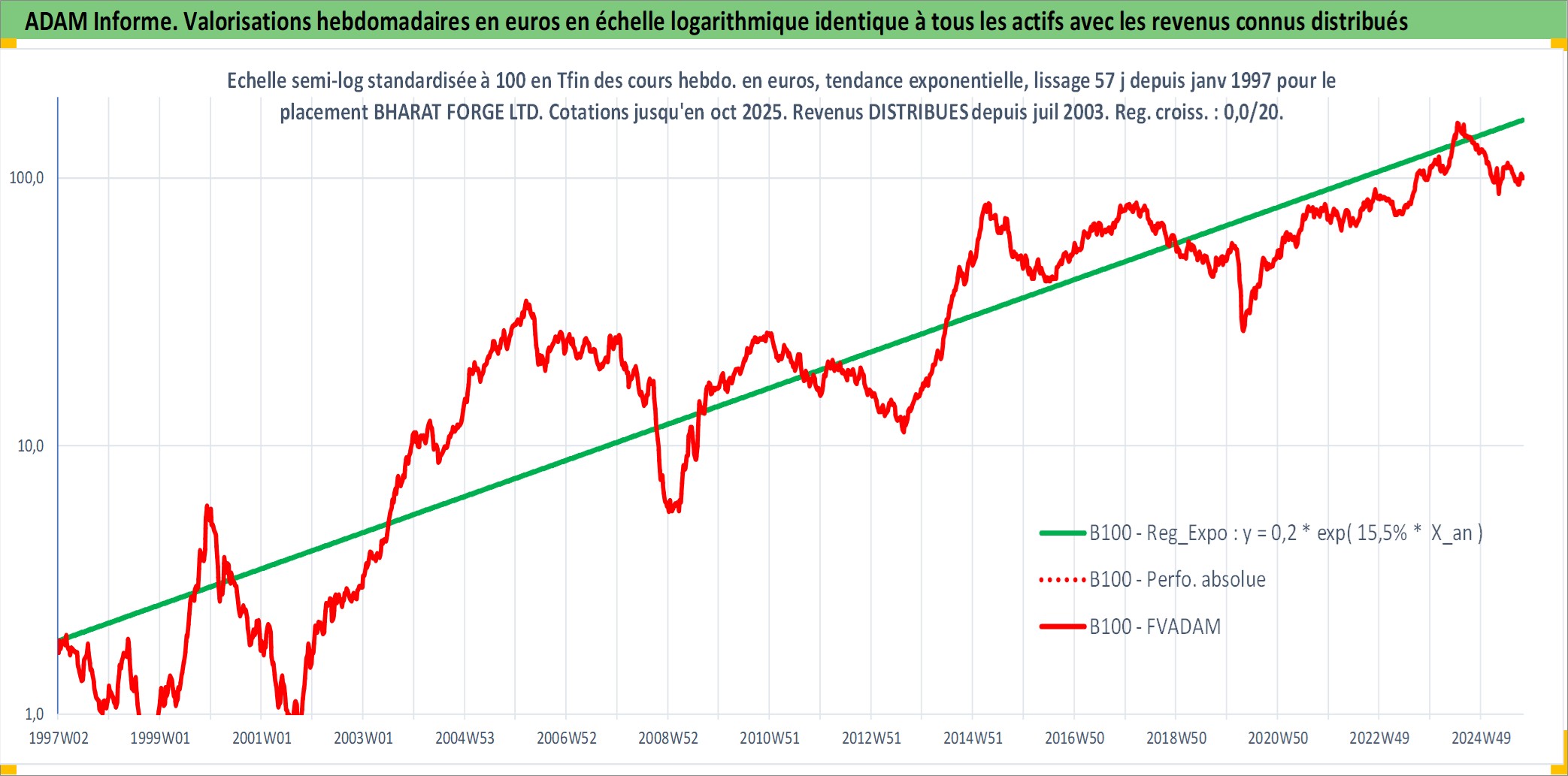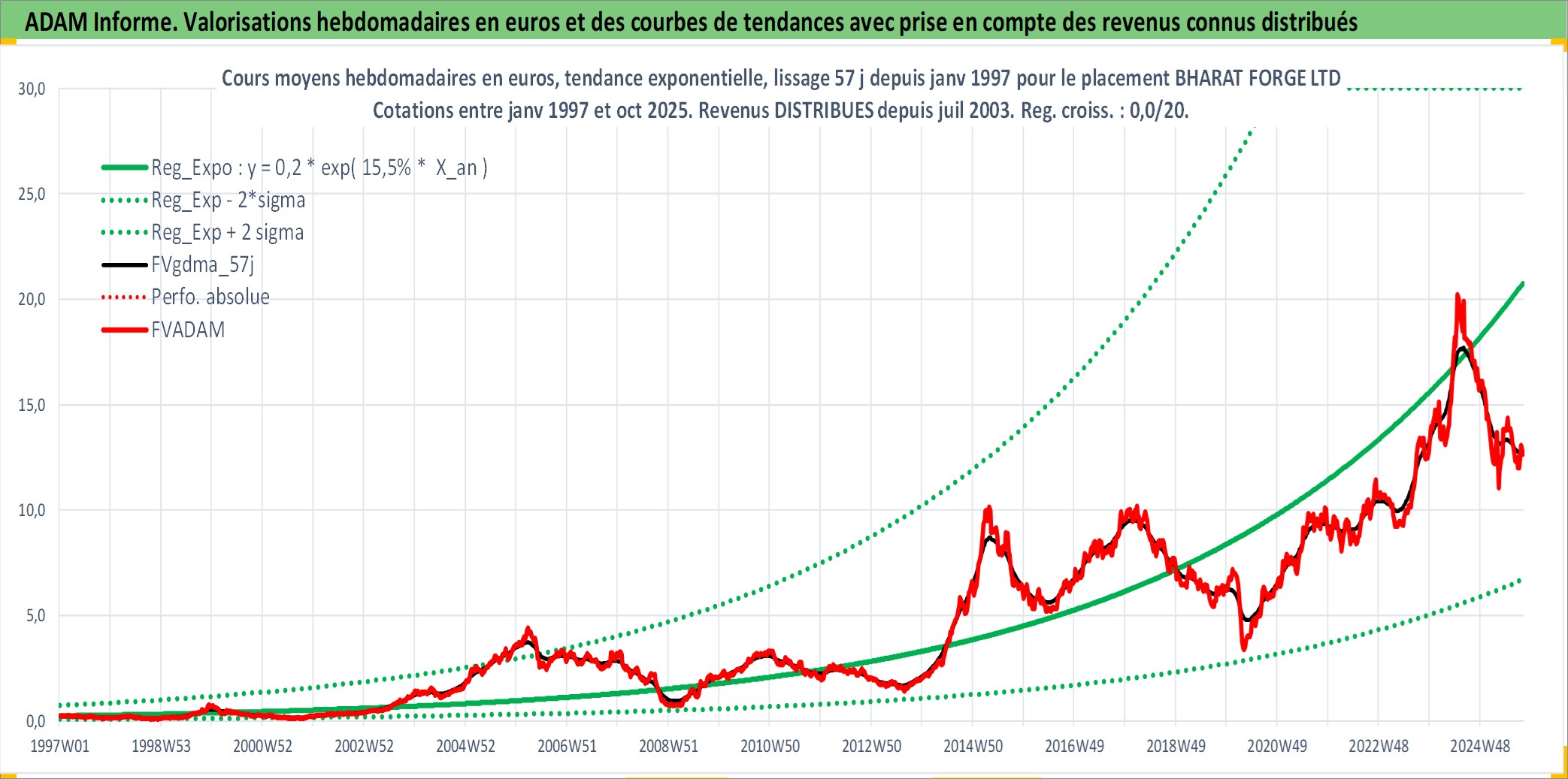 Site dédié aux investisseursPage dédiée sur site financeAnalyse des valorisations hebdomadaires de l'action BHARAT FORGE LTD. Cet actif est cote en INR. Les valorisations sont en contrevaleur EURO et couvrent les semaines 1997W01 a 2025W40. Les revenus de cet actif financier sont pris en compte depuis la semaine 2003W27. La note ESG de cet actif n'est pas connue.