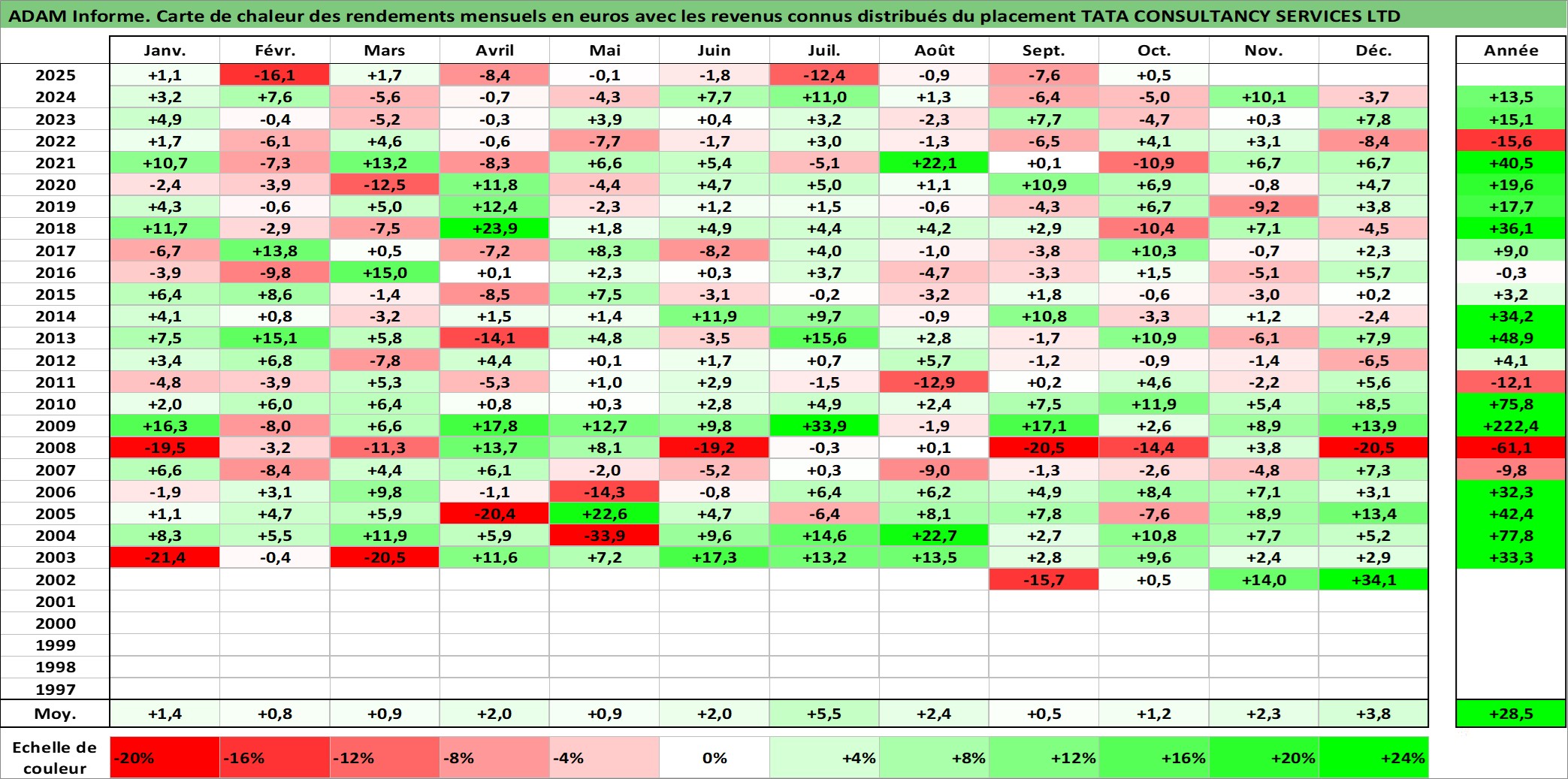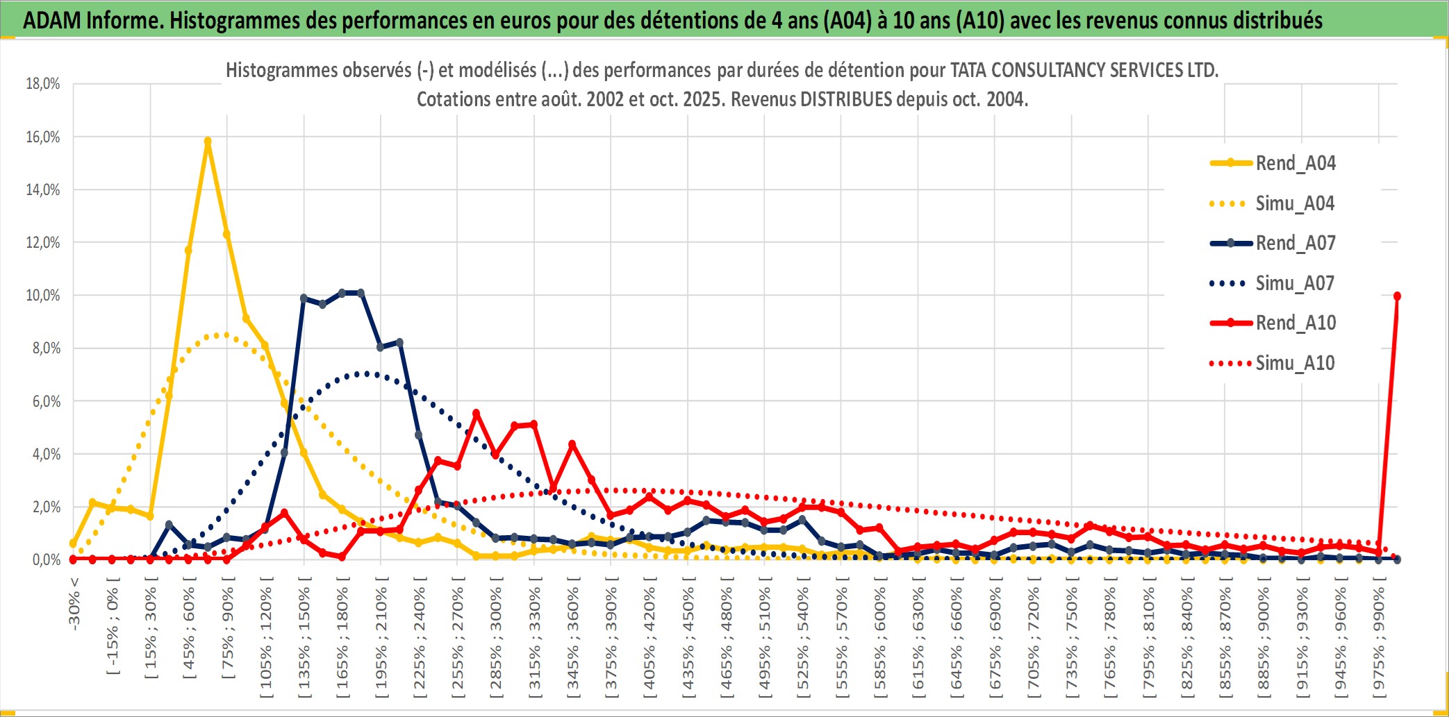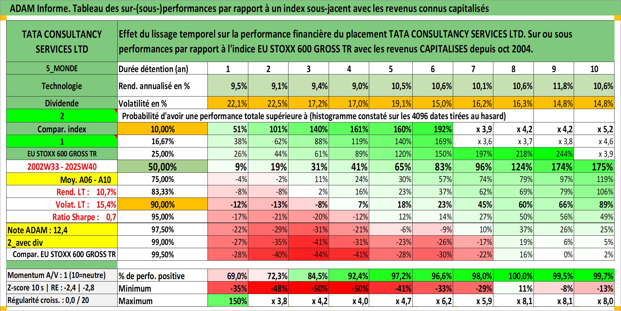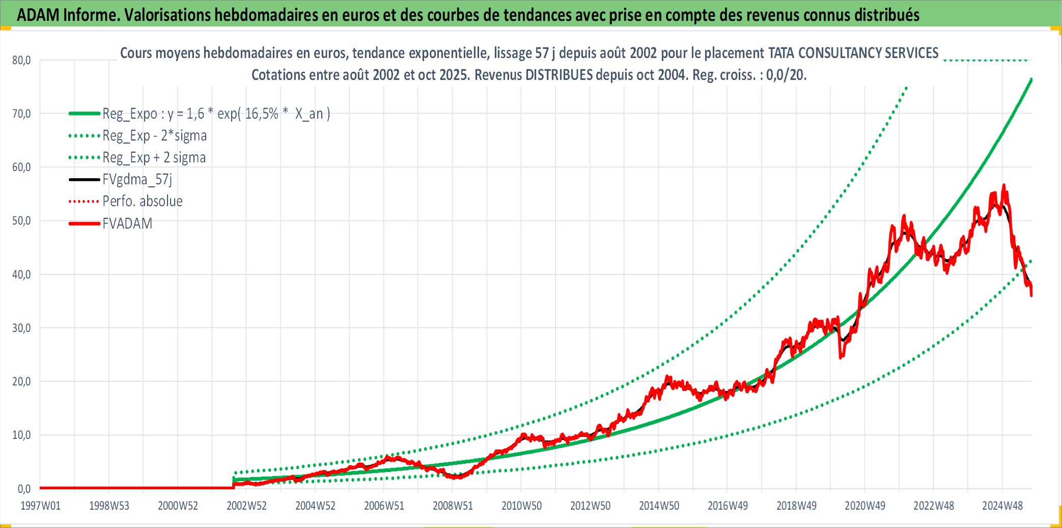 Site dédié aux investisseursPage dédiée sur site financeAnalyse des valorisations hebdomadaires de l'action TATA CONSULTANCY SERVICES LTD. Cet actif est cote en INR. Les valorisations sont en contrevaleur EURO et couvrent les semaines 2002W33 a 2025W40. Les revenus de cet actif financier sont pris en compte depuis la semaine 2004W44. La note globale ESG de cet actif est estimee a 14.0 (apres rebasage entre 0 et 20).