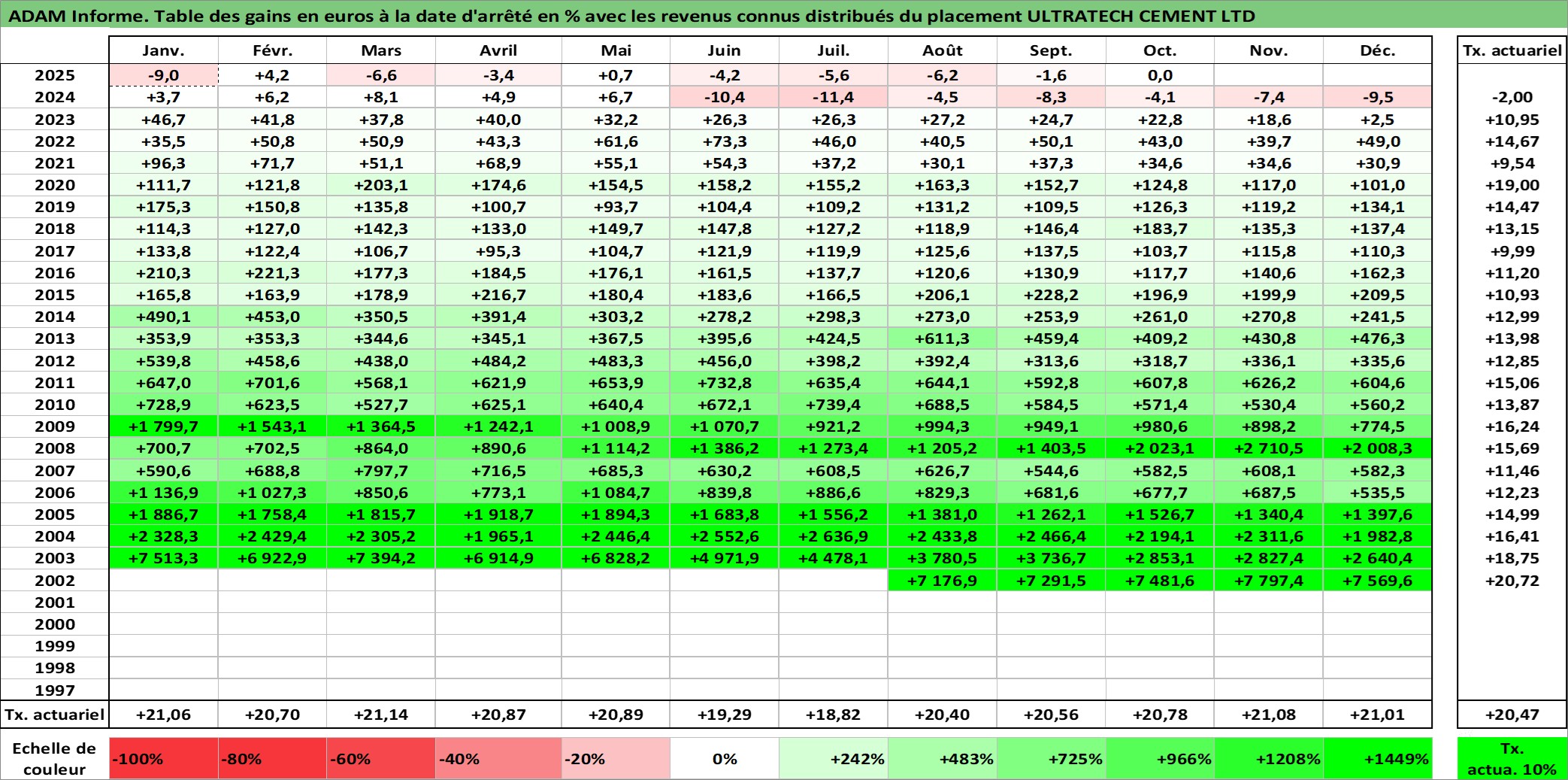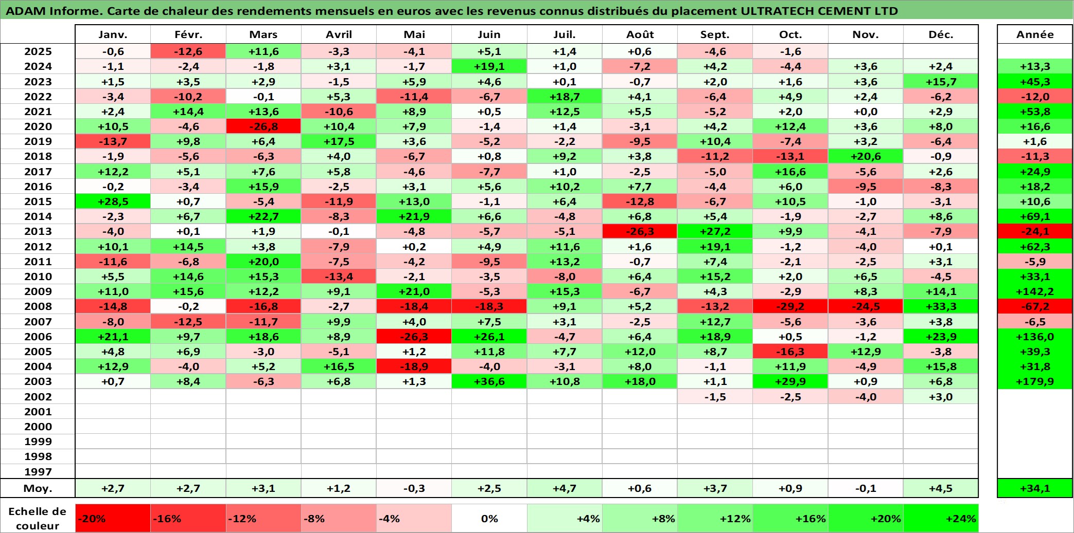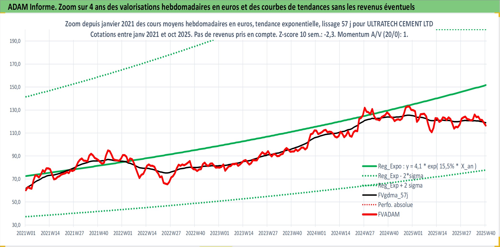 Site dédié aux investisseursPage dédiée sur site financeAnalyse des valorisations hebdomadaires de l'action ULTRATECH CEMENT LTD. Cet actif est cote en INR. Les valorisations sont en contrevaleur EURO et couvrent les semaines 2002W33 a 2025W40. Les revenus de cet actif financier sont pris en compte depuis la semaine 2004W40. La note globale ESG de cet actif est estimee a 3.0 (apres rebasage entre 0 et 20).