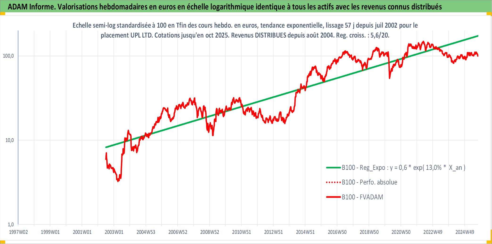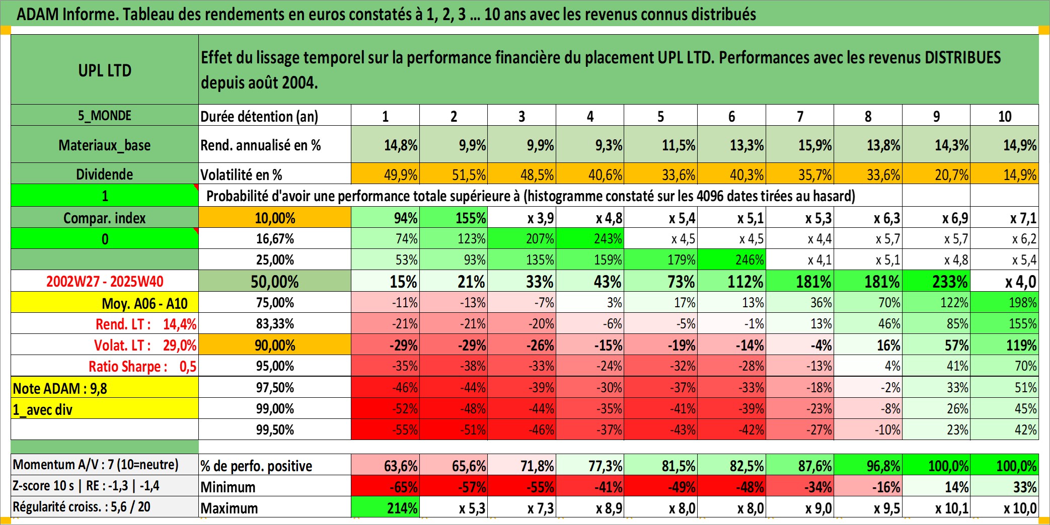 Site dédié aux investisseursPage dédiée sur site financeAnalyse des valorisations hebdomadaires de l'action UPL LTD. Cet actif est cote en INR. Les valorisations sont en contrevaleur EURO et couvrent les semaines 2002W27 a 2025W40. Les revenus de cet actif financier sont pris en compte depuis la semaine 2004W34. La note globale ESG de cet actif est estimee a 10.0 (apres rebasage entre 0 et 20).
