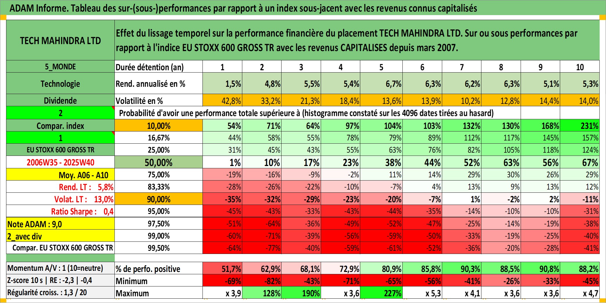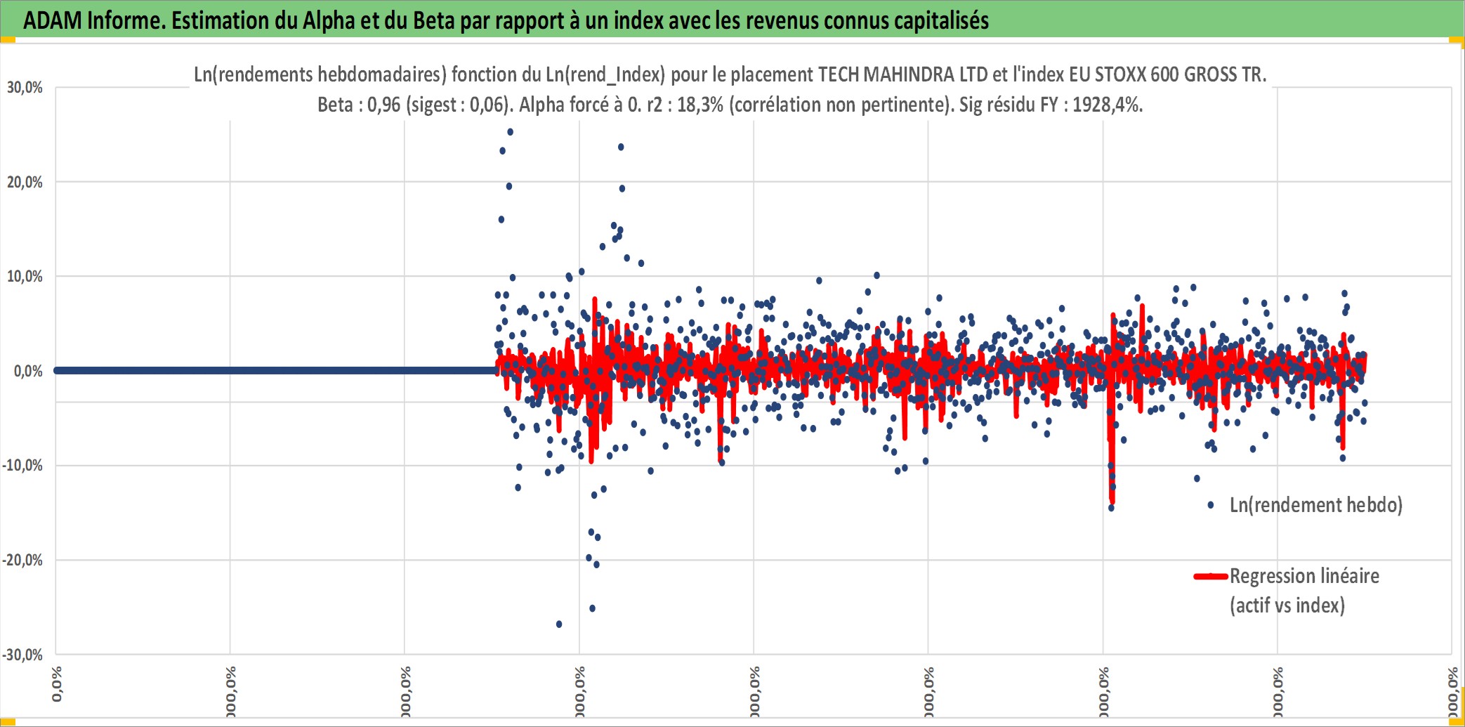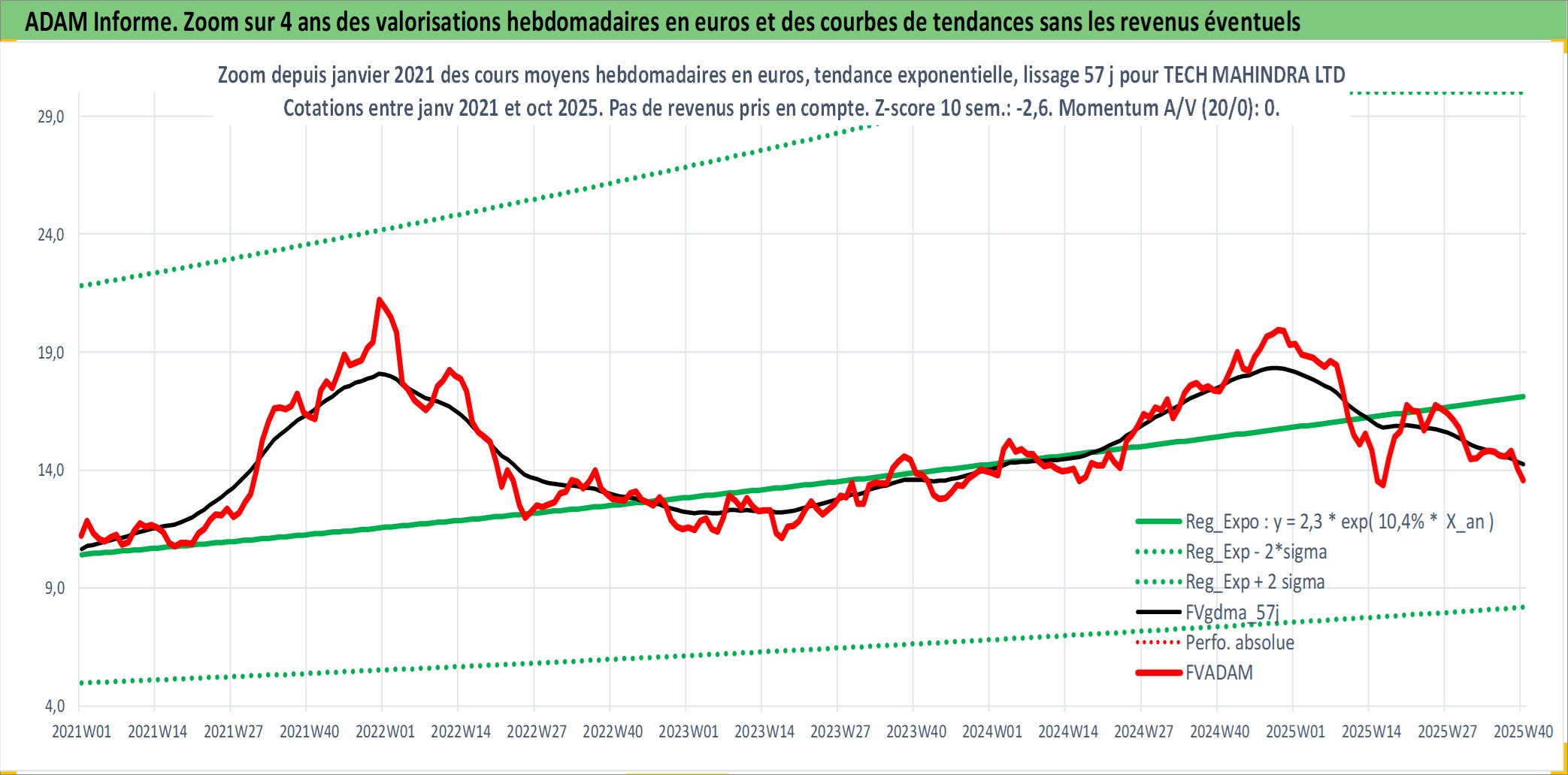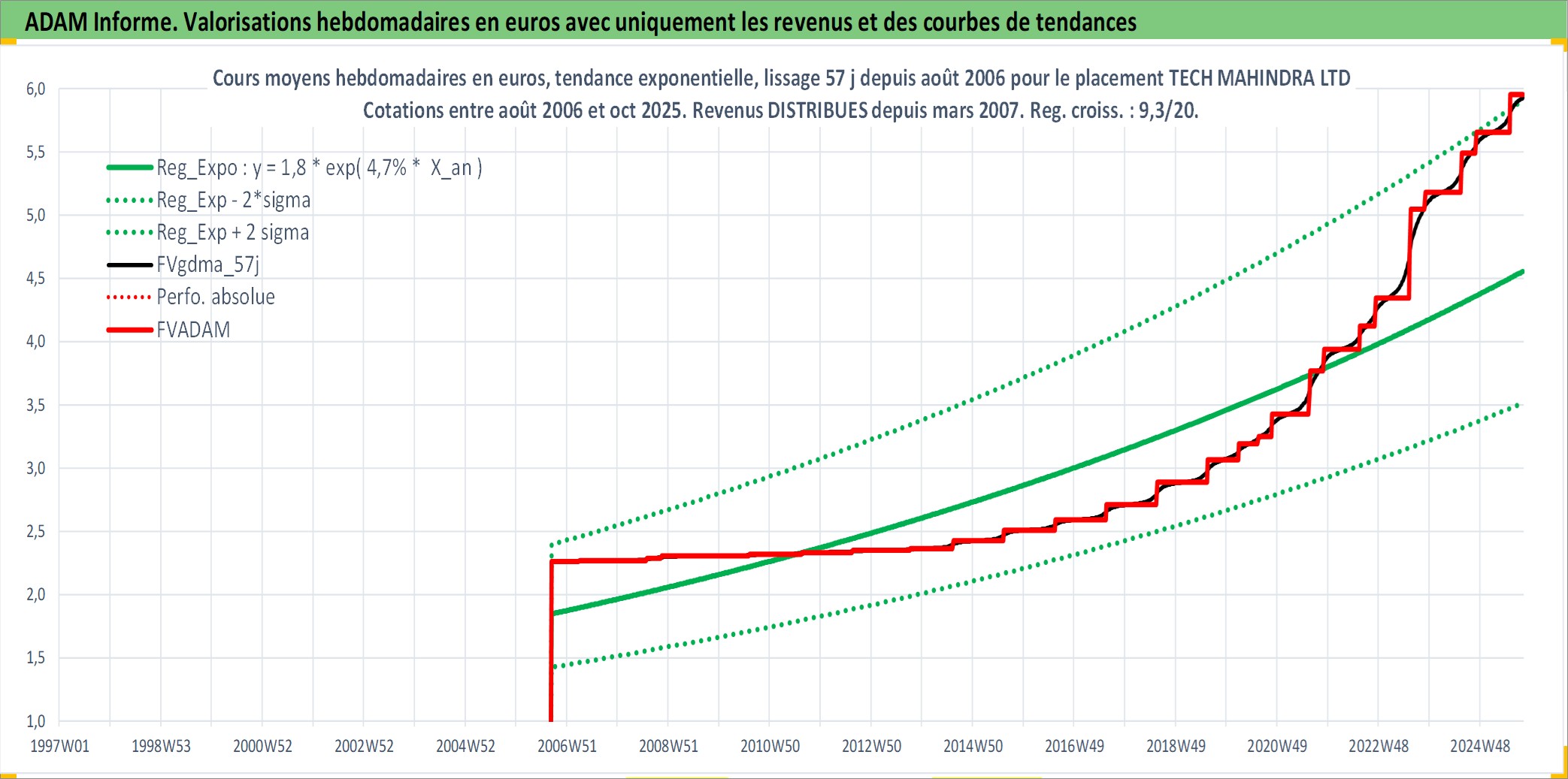 Site dédié aux investisseursPage dédiée sur site financeAnalyse des valorisations hebdomadaires de l'action TECH MAHINDRA LTD. Cet actif est cote en INR. Les valorisations sont en contrevaleur EURO et couvrent les semaines 2006W35 a 2025W40. Les revenus de cet actif financier sont pris en compte depuis la semaine 2007W12. La note globale ESG de cet actif est estimee a 15.0 (apres rebasage entre 0 et 20).