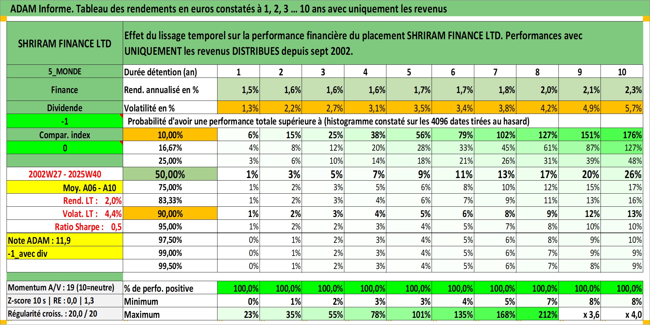 Site dédié aux investisseursPage dédiée sur site financeAnalyse des valorisations hebdomadaires de l'action SHRIRAM FINANCE LTD. Cet actif est cote en INR. Les valorisations sont en contrevaleur EURO et couvrent les semaines 2002W27 a 2025W40. Les revenus de cet actif financier sont pris en compte depuis la semaine 2002W37. La note ESG de cet actif n'est pas connue.