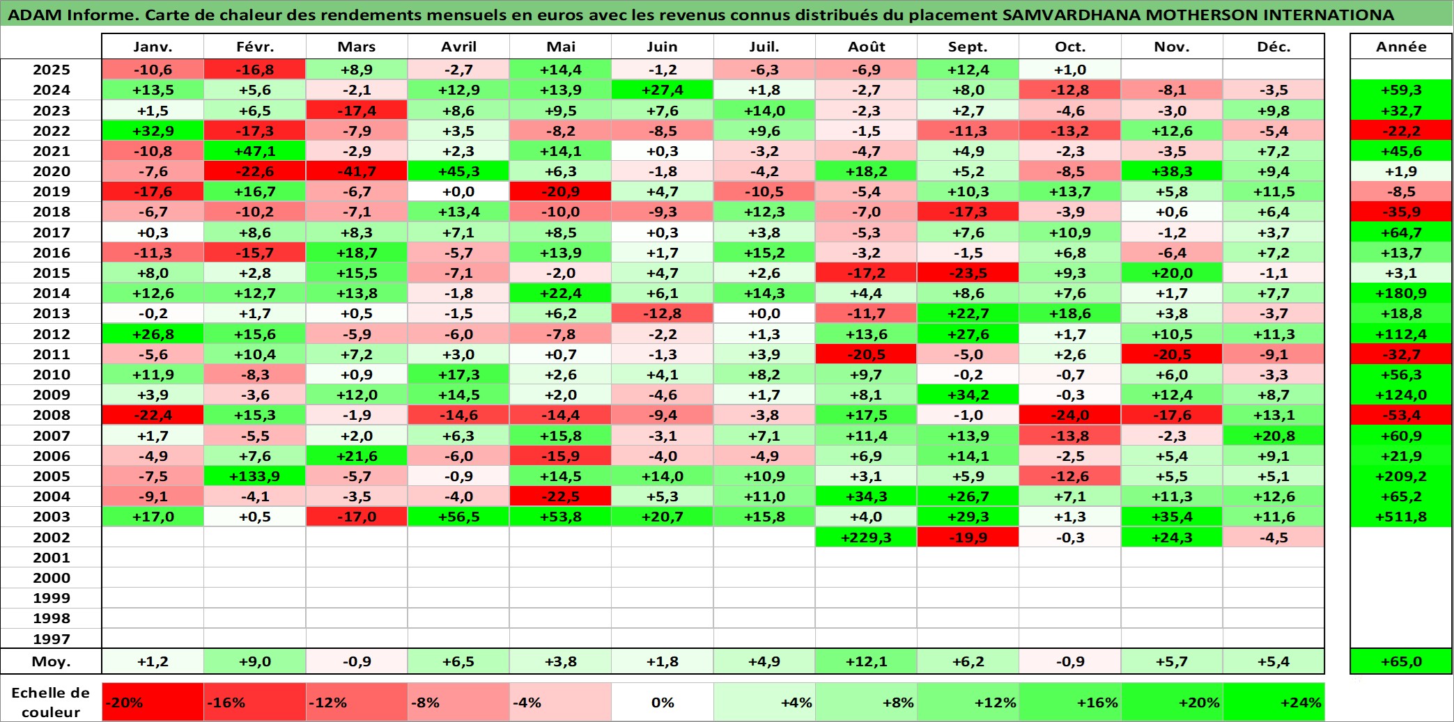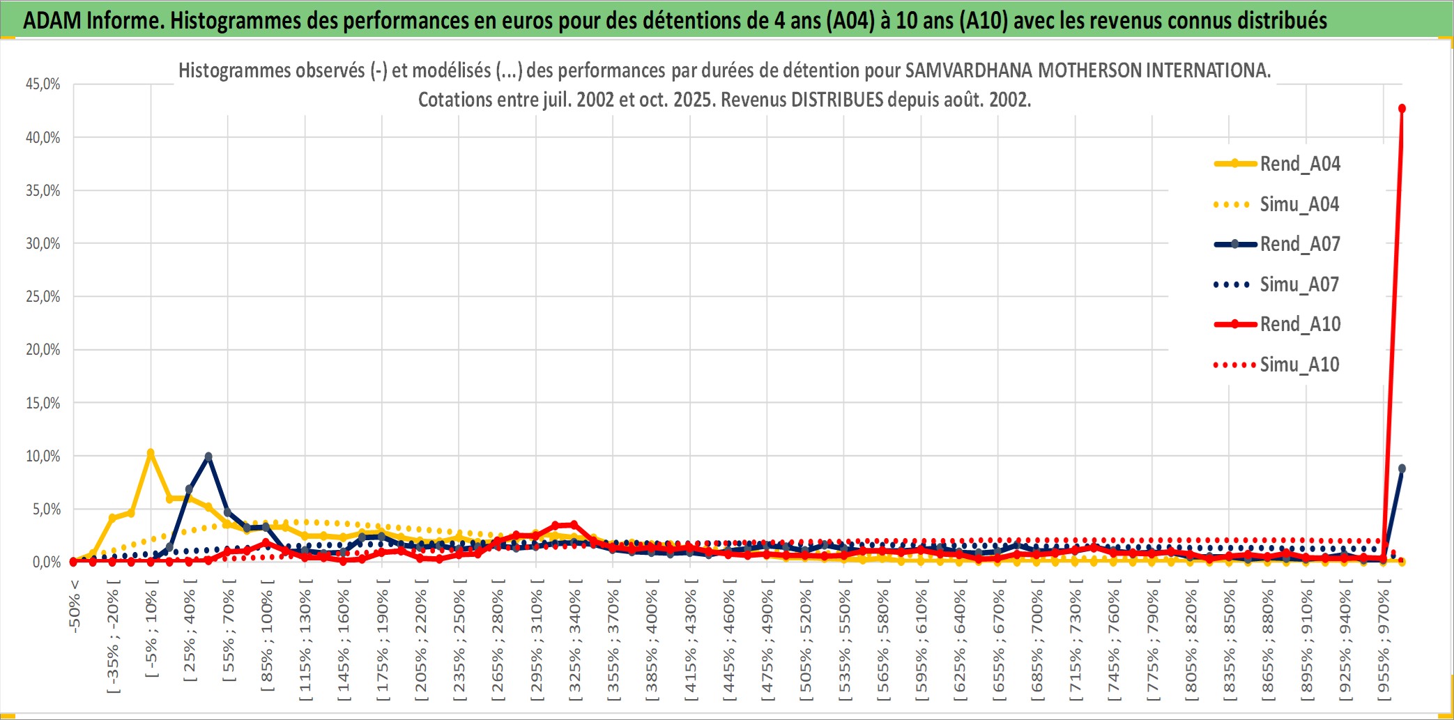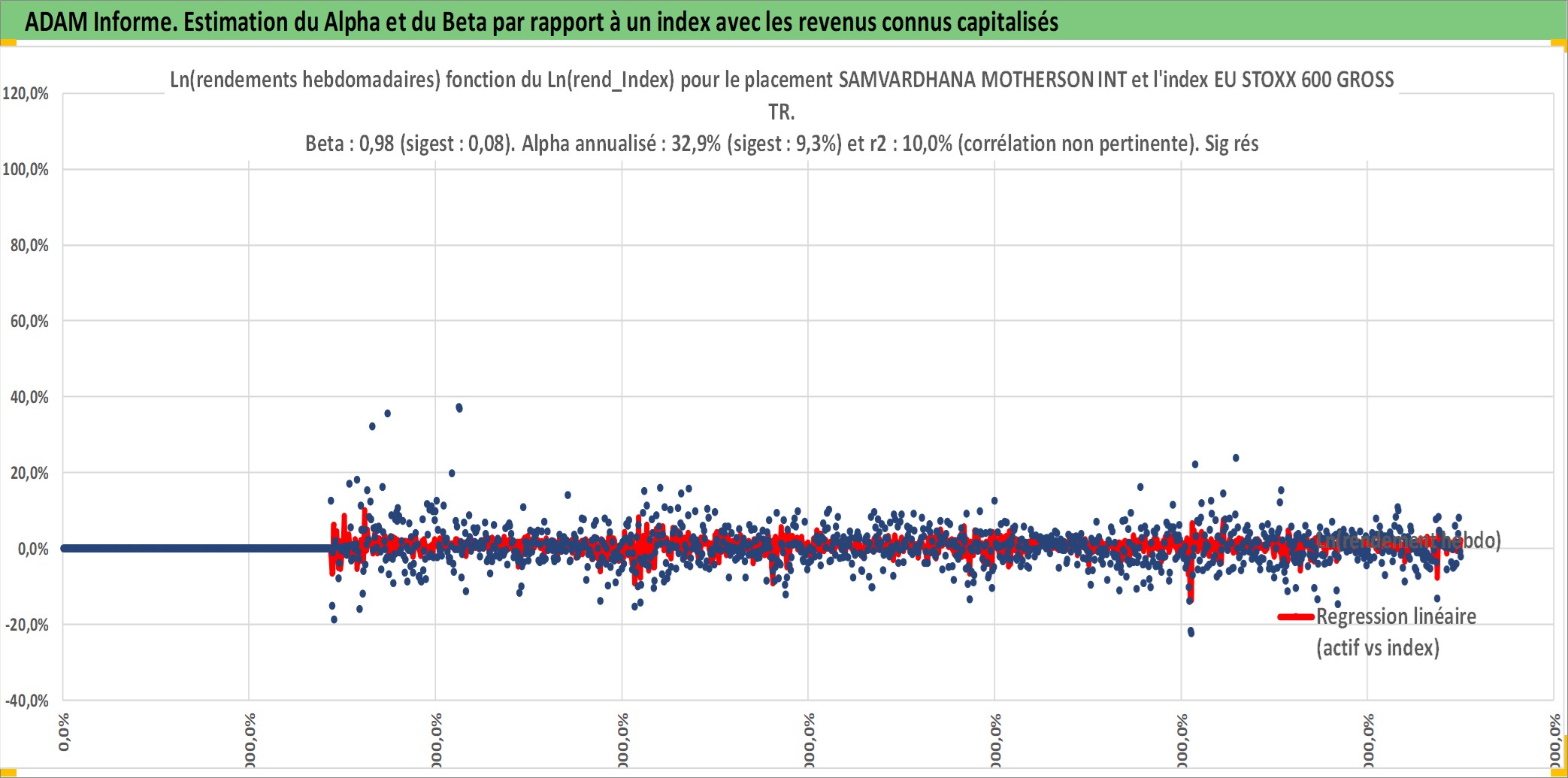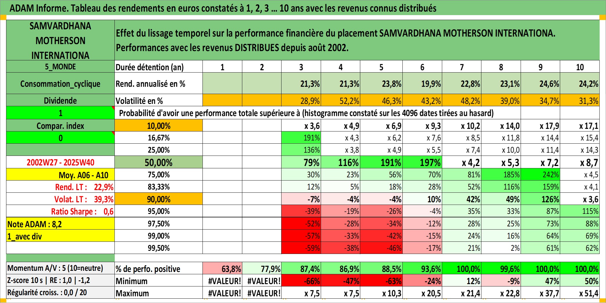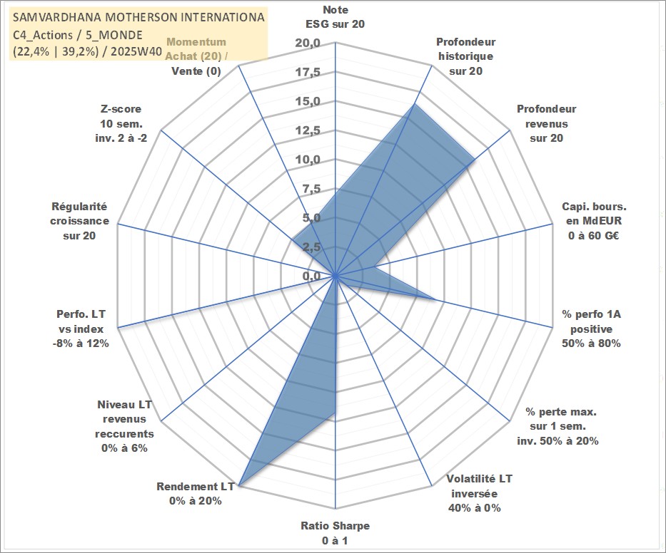Site dédié aux investisseursPage dédiée sur site financeAnalyse des valorisations hebdomadaires de l'action SAMVARDHANA MOTHERSON INTERNATIONA. Cet actif est cote en INR. Les valorisations sont en contrevaleur EURO et couvrent les semaines 2002W27 a 2025W40. Les revenus de cet actif financier sont pris en compte depuis la semaine 2002W35. La note globale ESG de cet actif est estimee a 7.0 (apres rebasage entre 0 et 20).