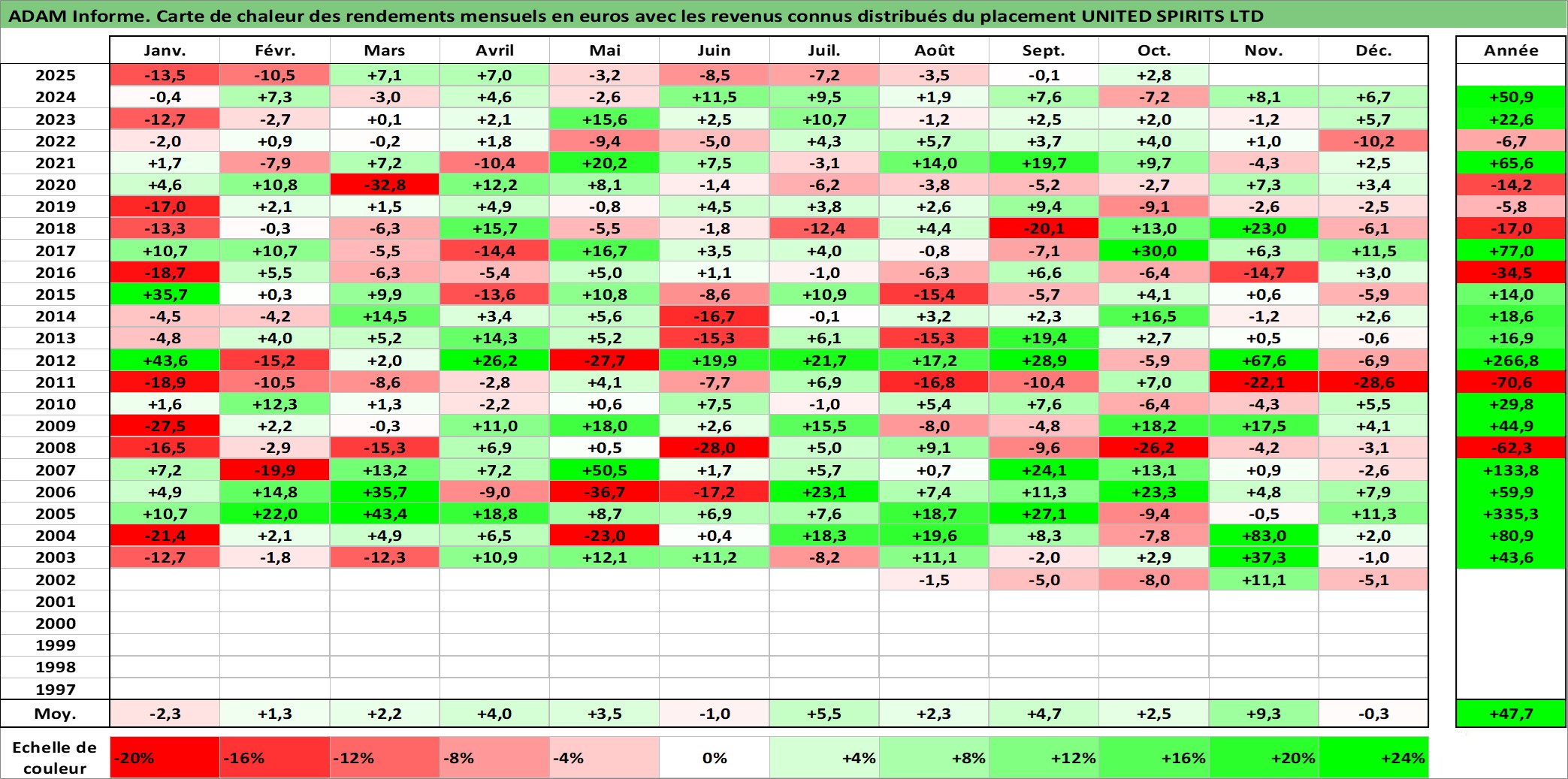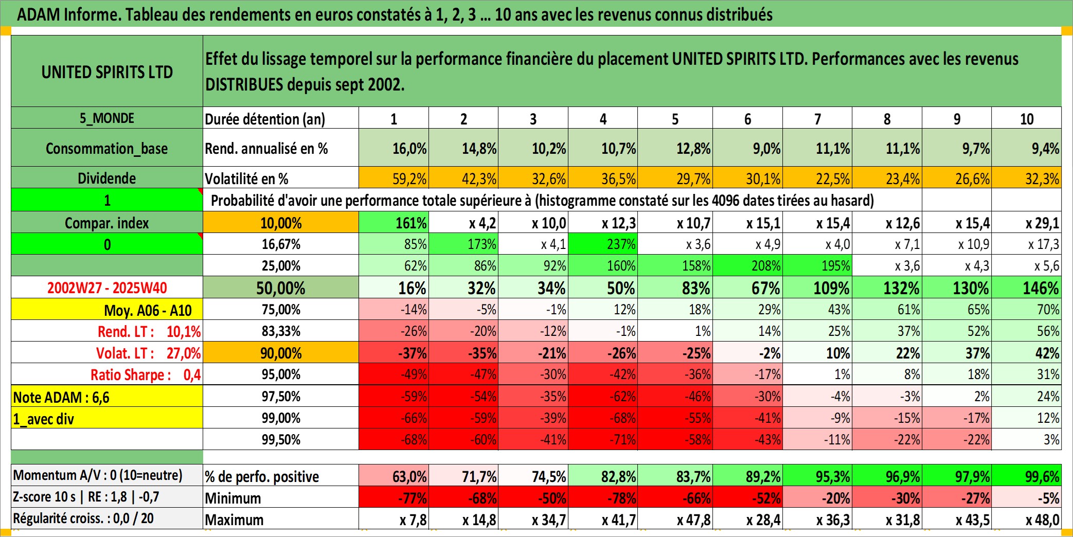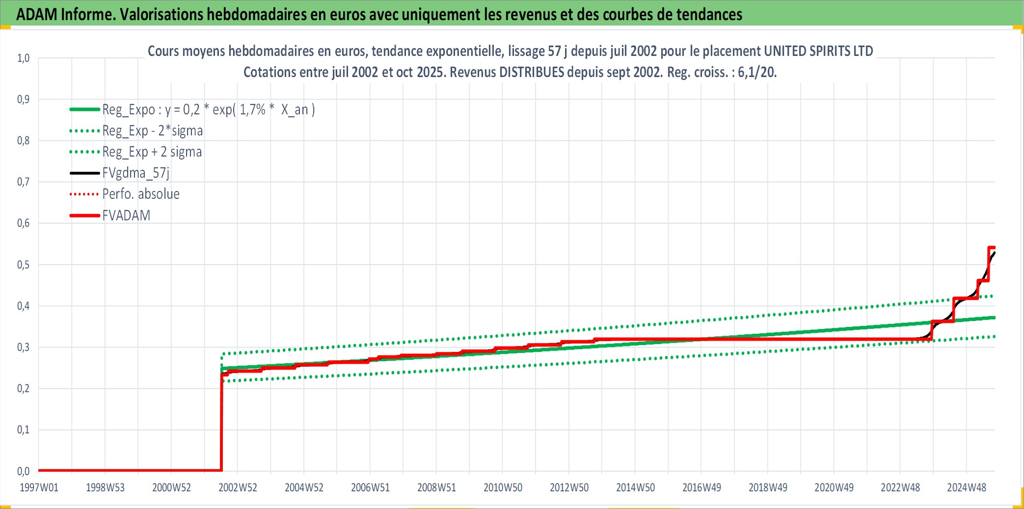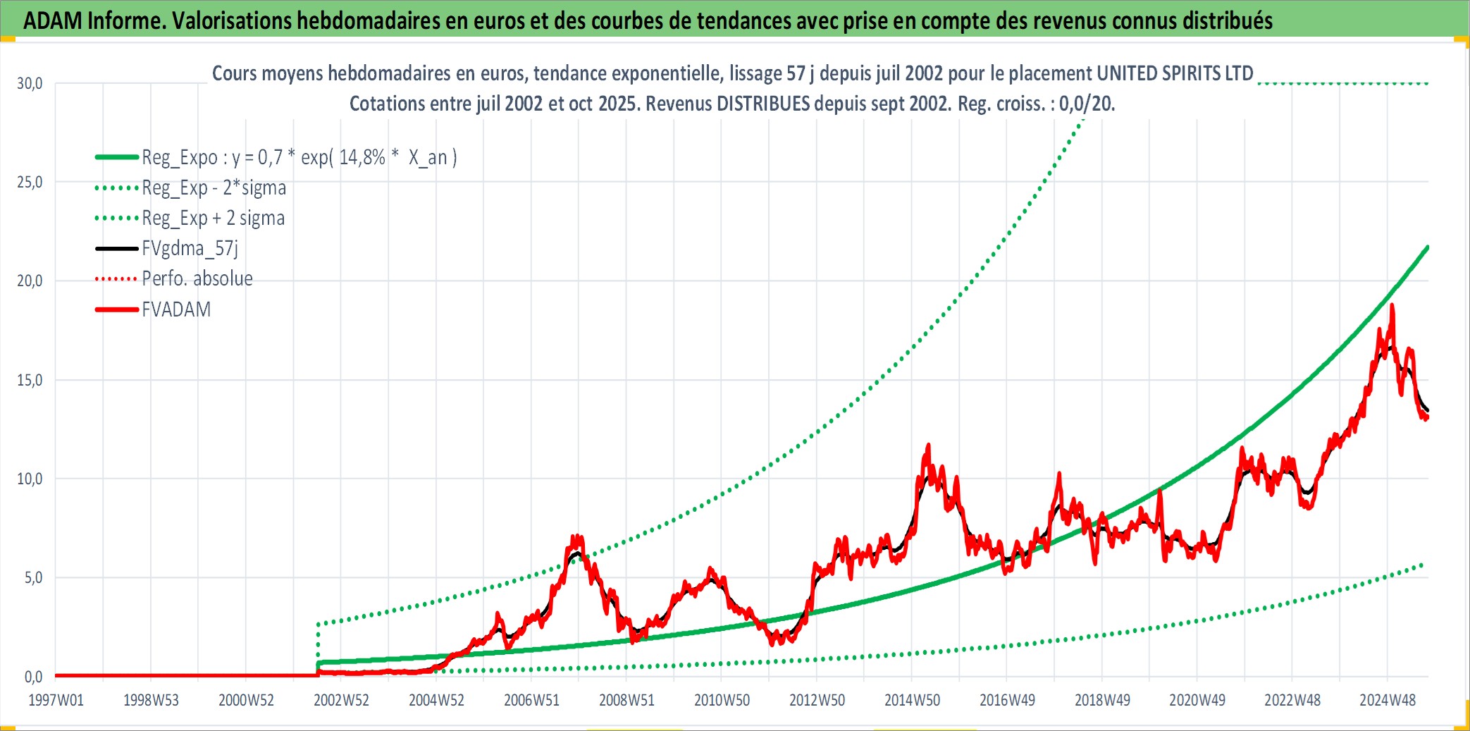 Site dédié aux investisseursPage dédiée sur site financeAnalyse des valorisations hebdomadaires de l'action UNITED SPIRITS LTD. Cet actif est cote en INR. Les valorisations sont en contrevaleur EURO et couvrent les semaines 2002W27 a 2025W40. Les revenus de cet actif financier sont pris en compte depuis la semaine 2002W37. La note globale ESG de cet actif est estimee a 9.0 (apres rebasage entre 0 et 20).