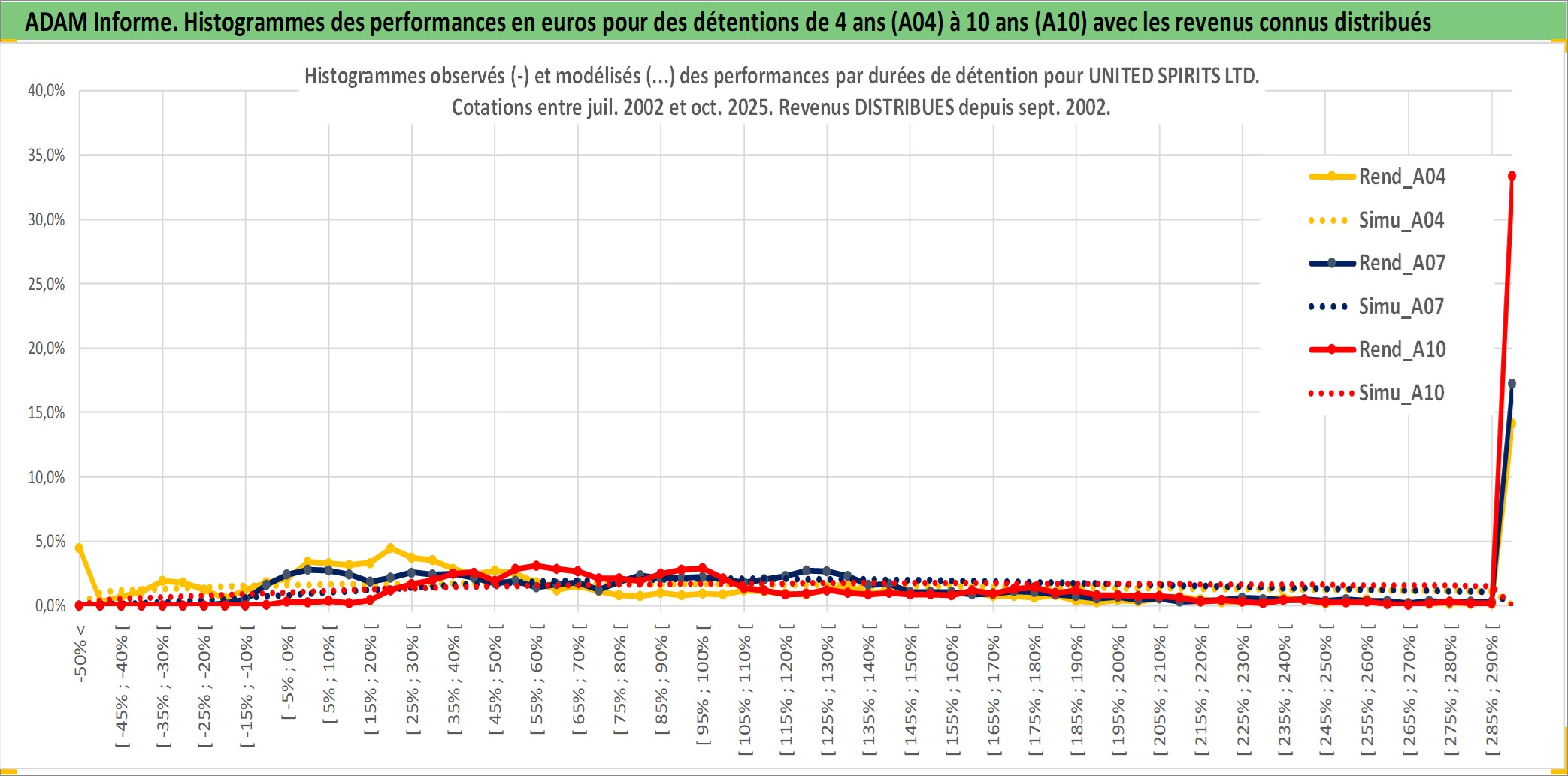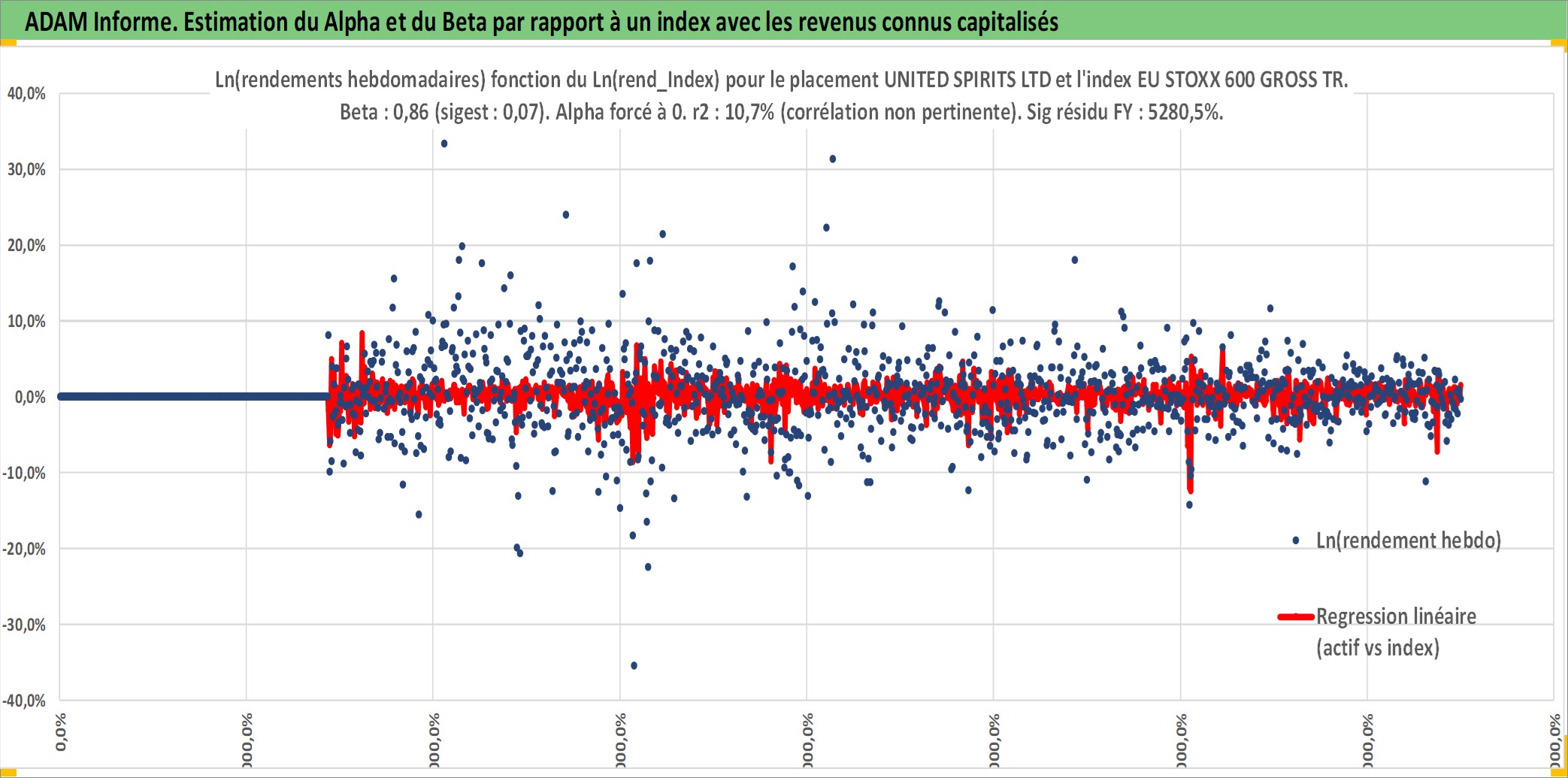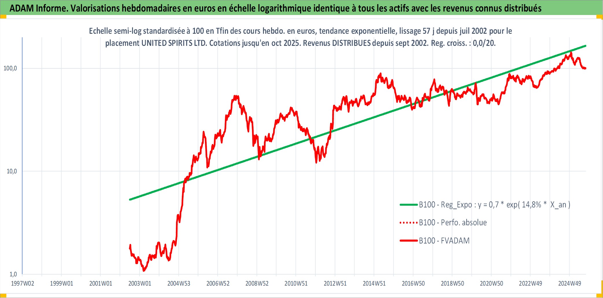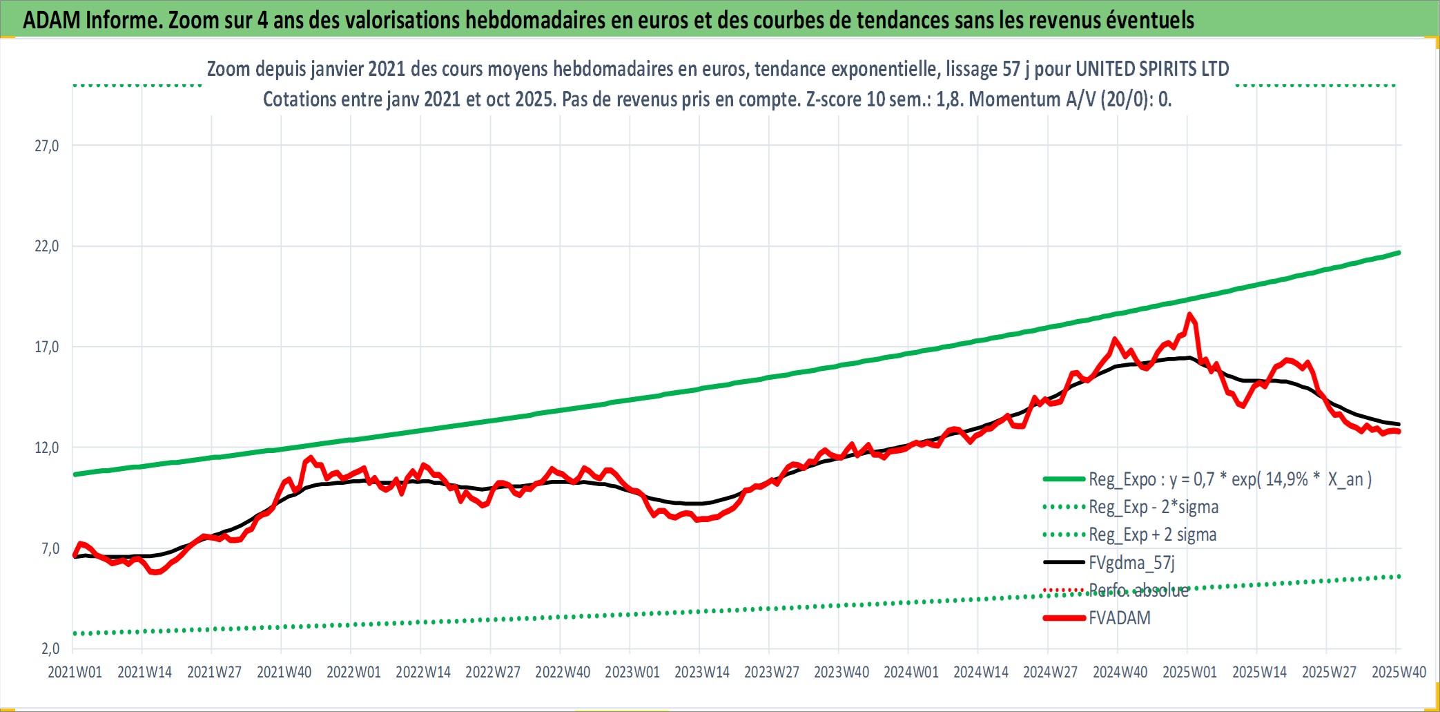 Site dédié aux investisseursPage dédiée sur site financeAnalyse des valorisations hebdomadaires de l'action UNITED SPIRITS LTD. Cet actif est cote en INR. Les valorisations sont en contrevaleur EURO et couvrent les semaines 2002W27 a 2025W40. Les revenus de cet actif financier sont pris en compte depuis la semaine 2002W37. La note globale ESG de cet actif est estimee a 9.0 (apres rebasage entre 0 et 20).