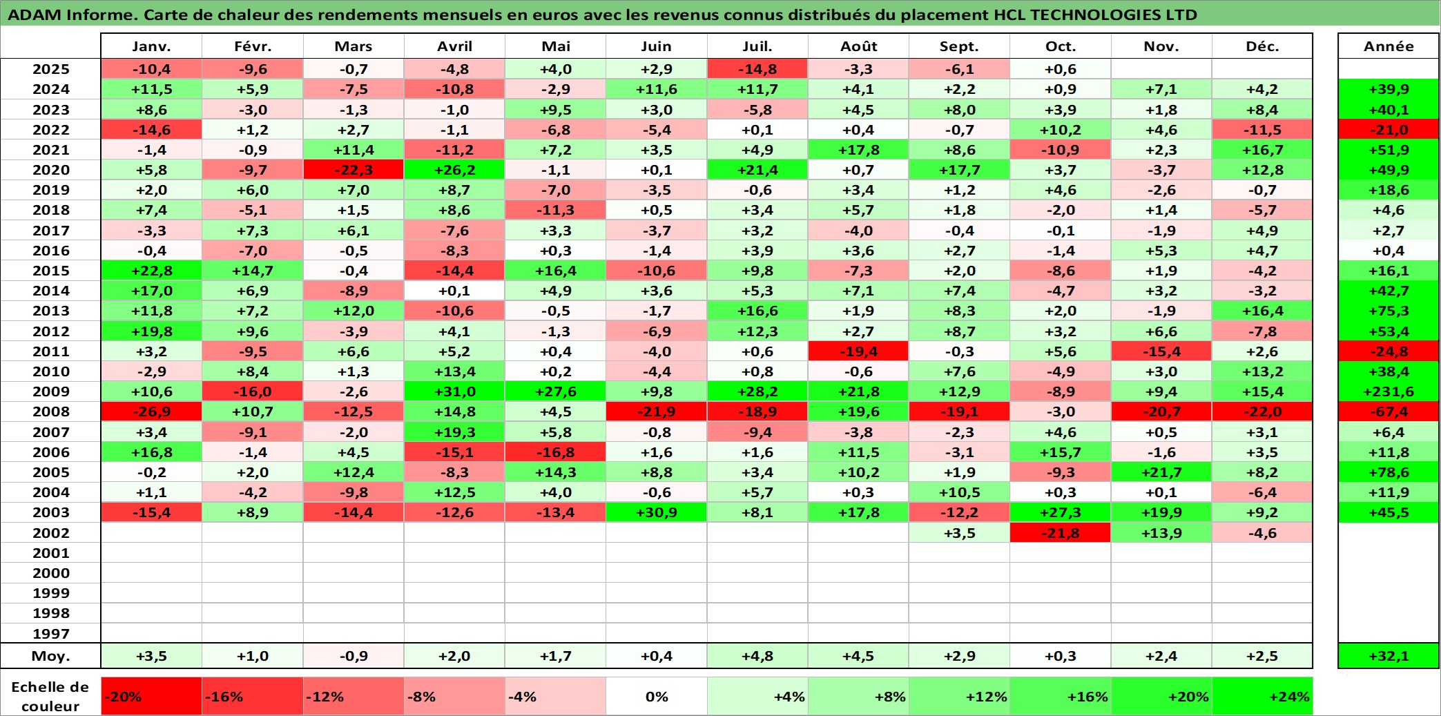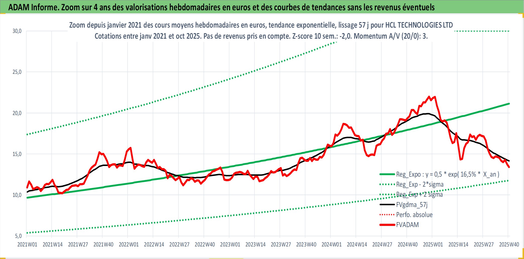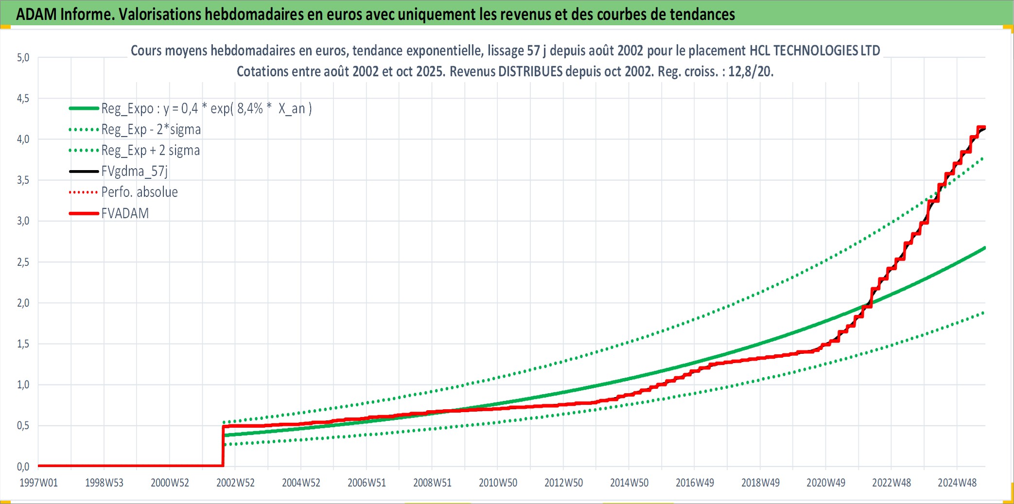 Site dédié aux investisseursPage dédiée sur site financeAnalyse des valorisations hebdomadaires de l'action HCL TECHNOLOGIES LTD. Cet actif est cote en INR. Les valorisations sont en contrevaleur EURO et couvrent les semaines 2002W33 a 2025W40. Les revenus de cet actif financier sont pris en compte depuis la semaine 2002W42. La note globale ESG de cet actif est estimee a 15.0 (apres rebasage entre 0 et 20).