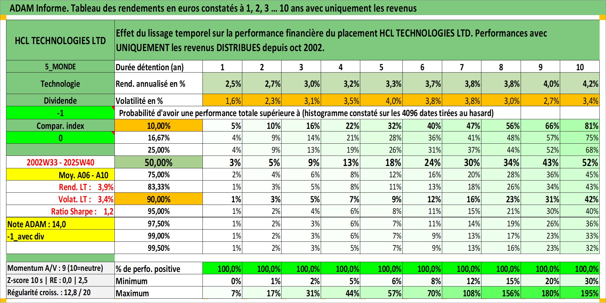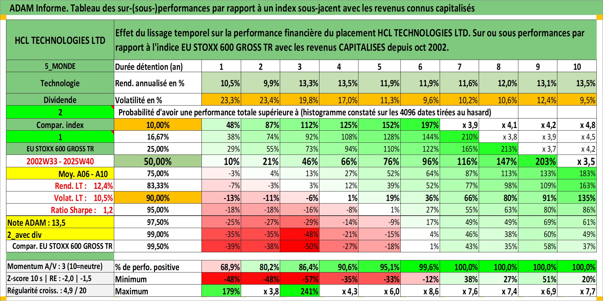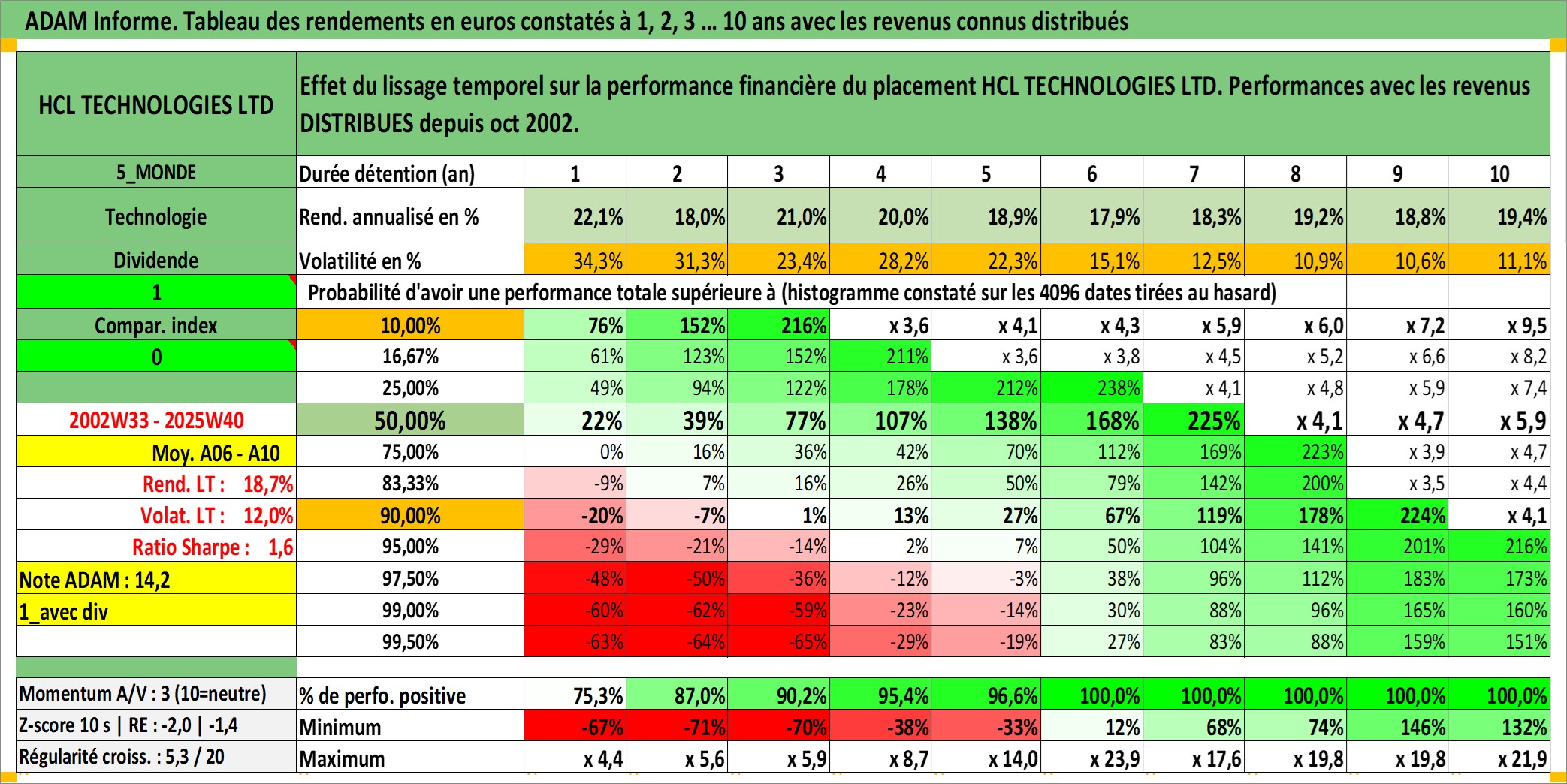 Site dédié aux investisseursPage dédiée sur site financeAnalyse des valorisations hebdomadaires de l'action HCL TECHNOLOGIES LTD. Cet actif est cote en INR. Les valorisations sont en contrevaleur EURO et couvrent les semaines 2002W33 a 2025W40. Les revenus de cet actif financier sont pris en compte depuis la semaine 2002W42. La note globale ESG de cet actif est estimee a 15.0 (apres rebasage entre 0 et 20).