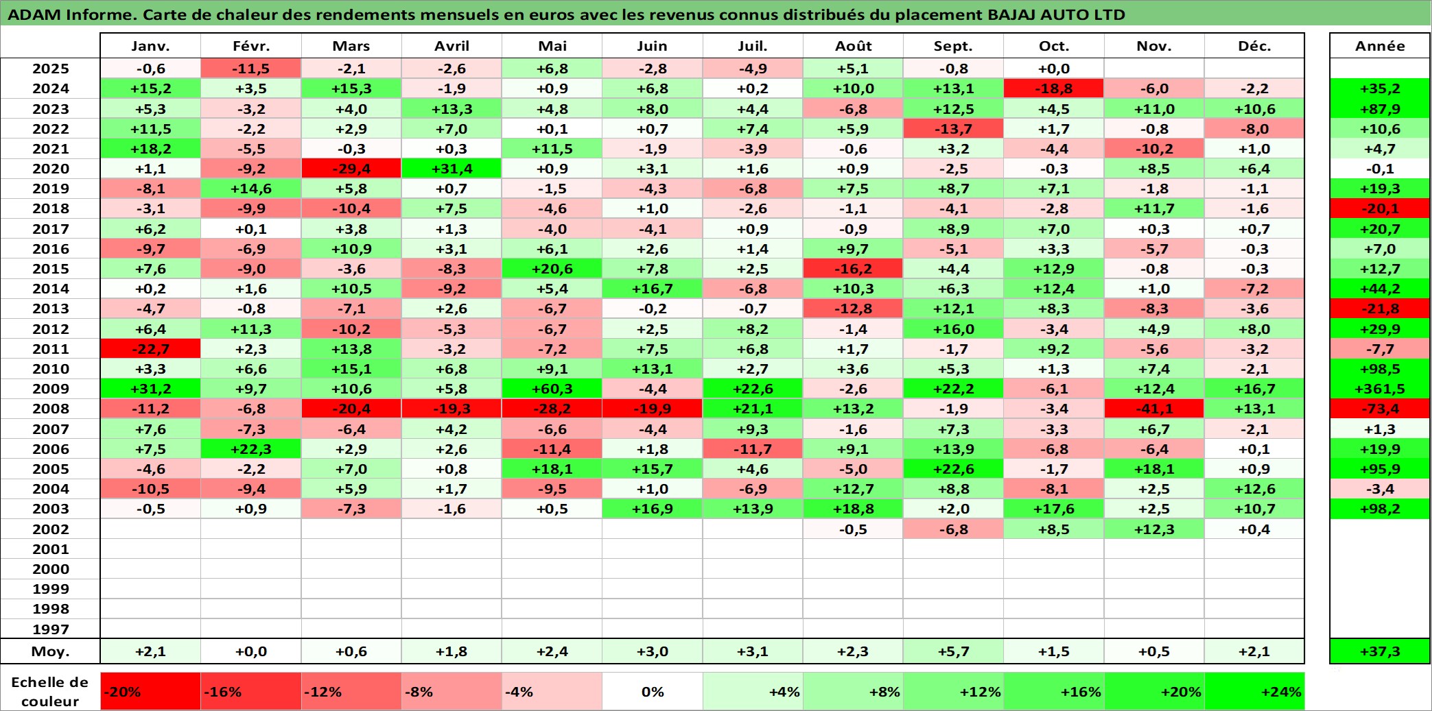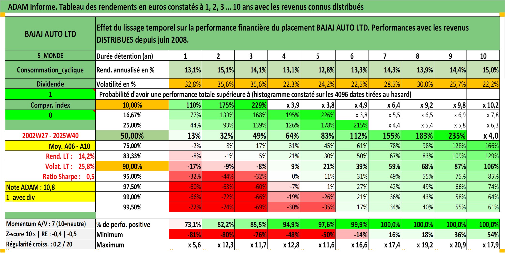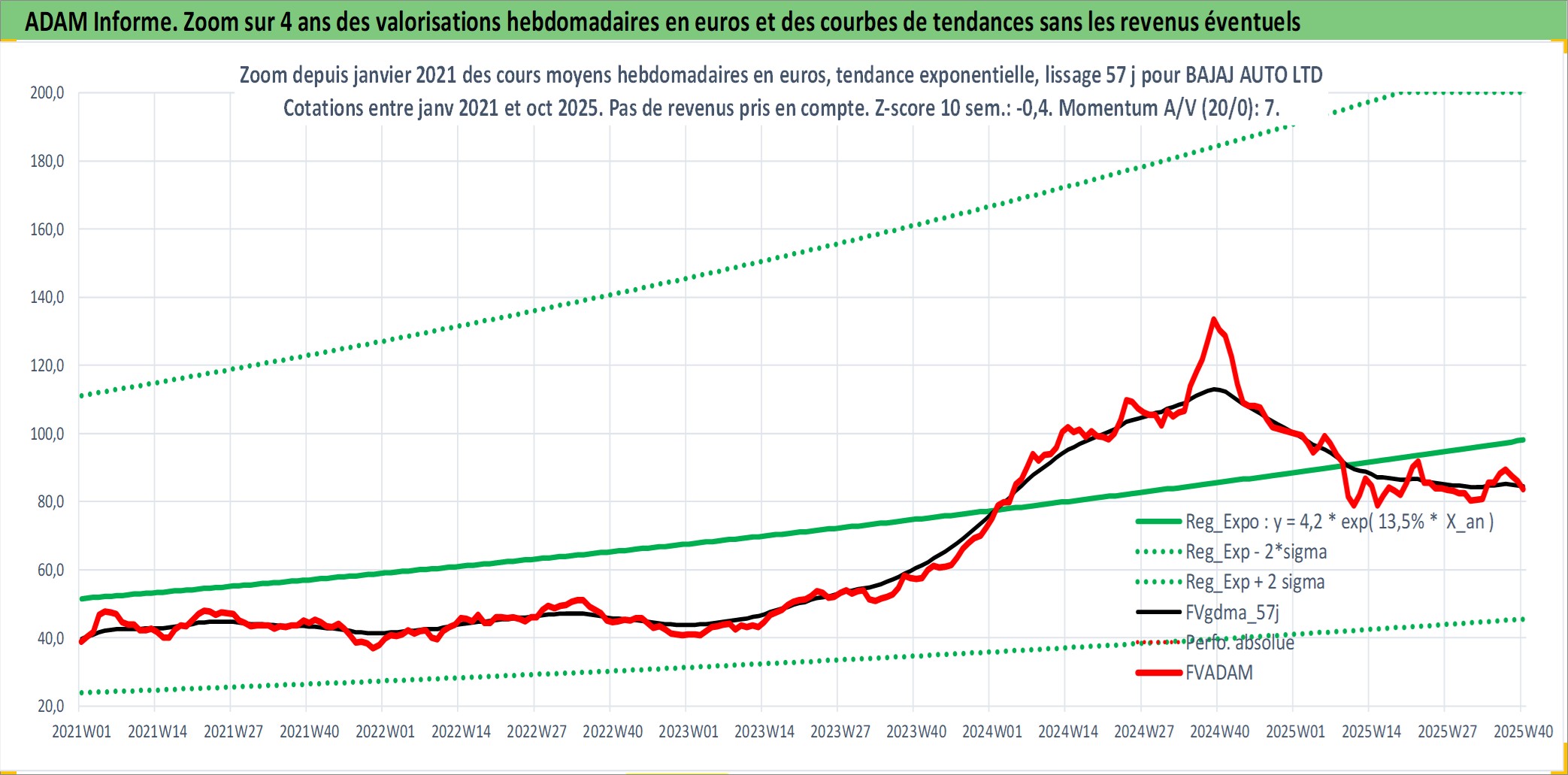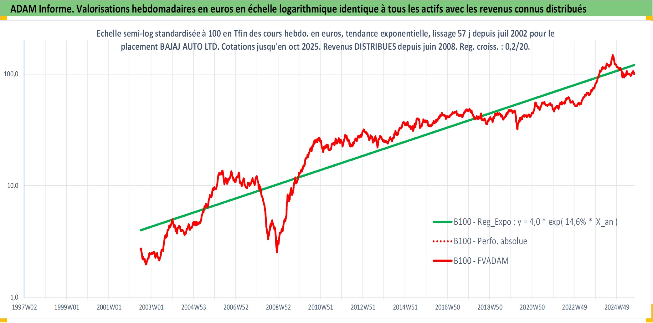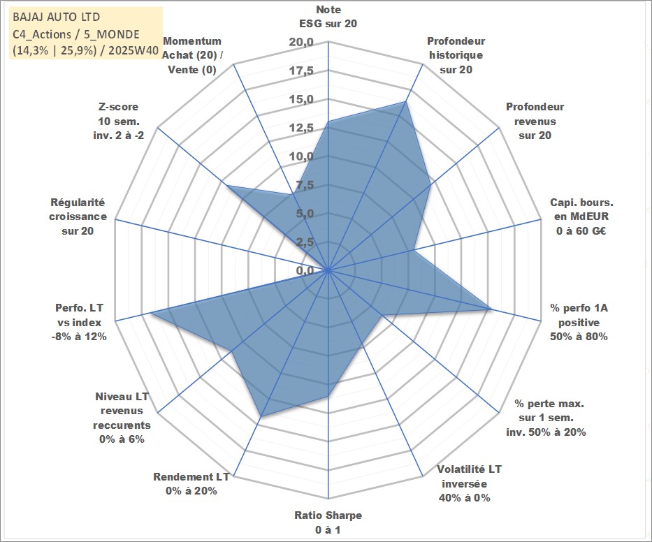 Site dédié aux investisseursPage dédiée sur site financeAnalyse des valorisations hebdomadaires de l'action BAJAJ AUTO LTD. Cet actif est cote en INR. Les valorisations sont en contrevaleur EURO et couvrent les semaines 2002W27 a 2025W40. Les revenus de cet actif financier sont pris en compte depuis la semaine 2008W26. La note globale ESG de cet actif est estimee a 13.0 (apres rebasage entre 0 et 20).
