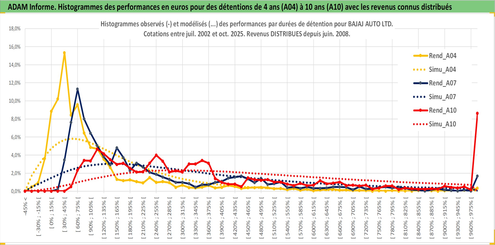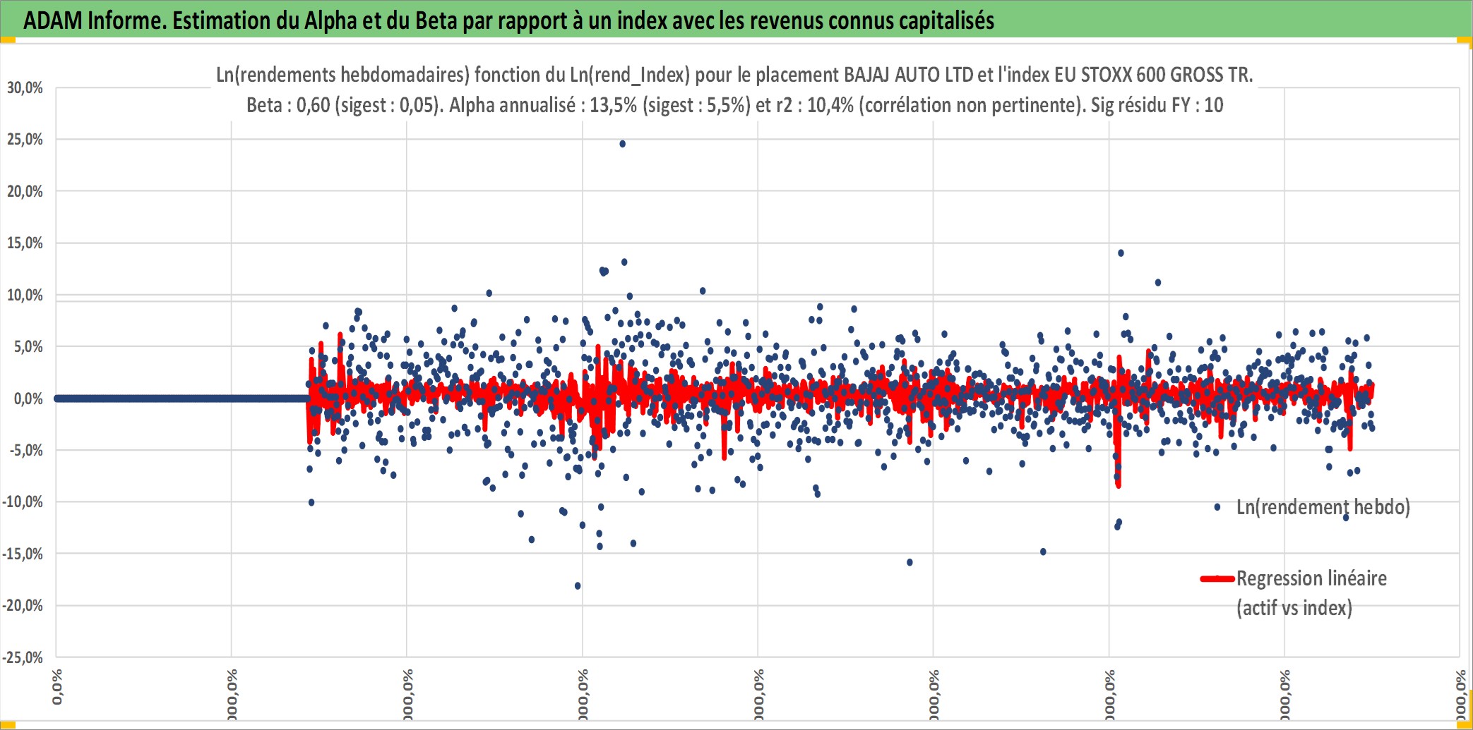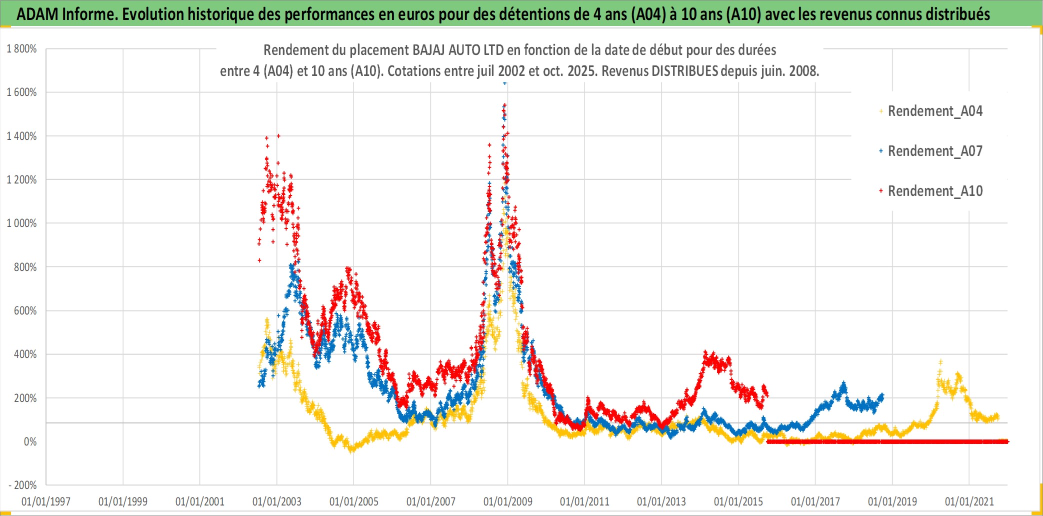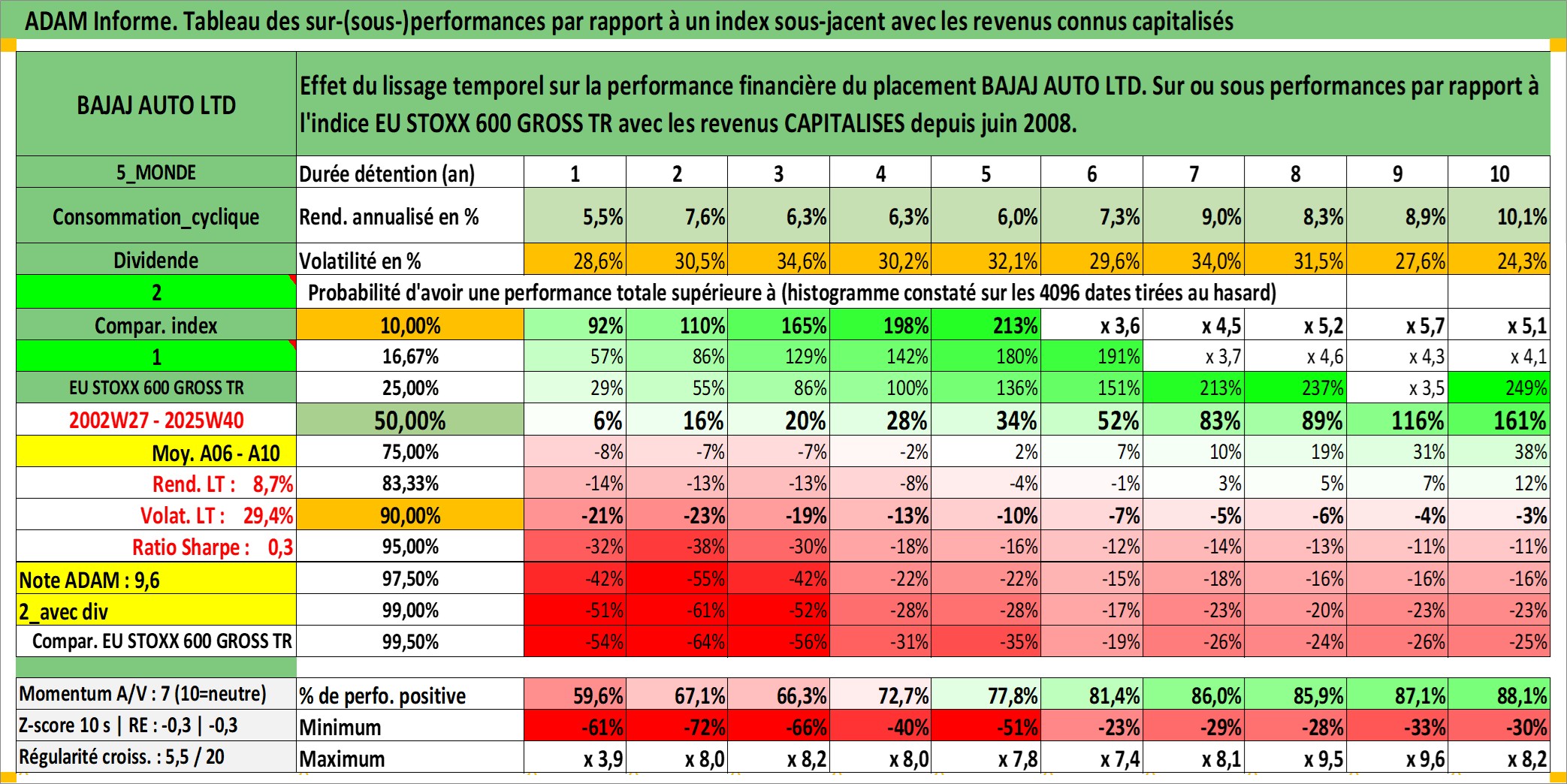 Site dédié aux investisseursPage dédiée sur site financeAnalyse des valorisations hebdomadaires de l'action BAJAJ AUTO LTD. Cet actif est cote en INR. Les valorisations sont en contrevaleur EURO et couvrent les semaines 2002W27 a 2025W40. Les revenus de cet actif financier sont pris en compte depuis la semaine 2008W26. La note globale ESG de cet actif est estimee a 13.0 (apres rebasage entre 0 et 20).