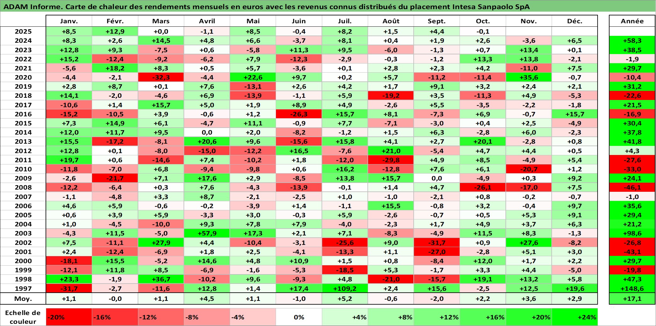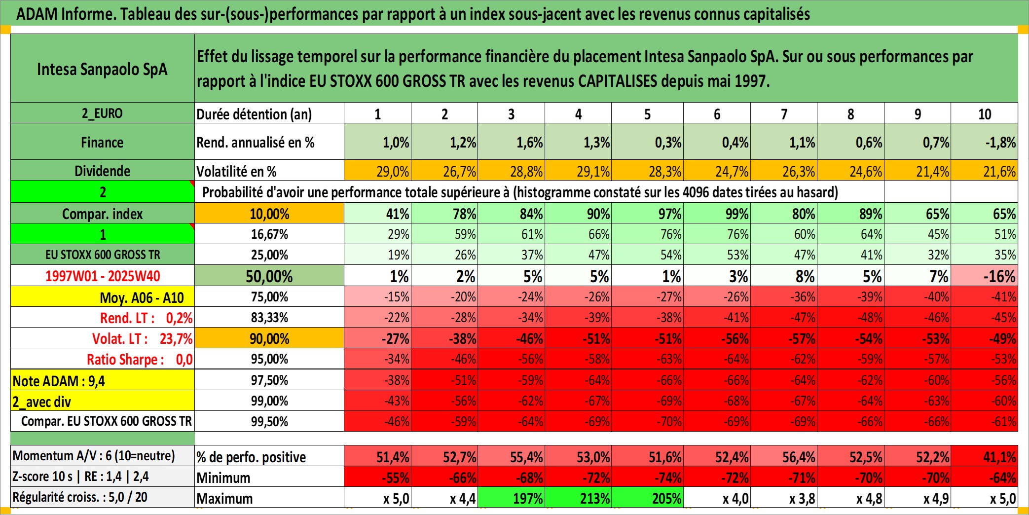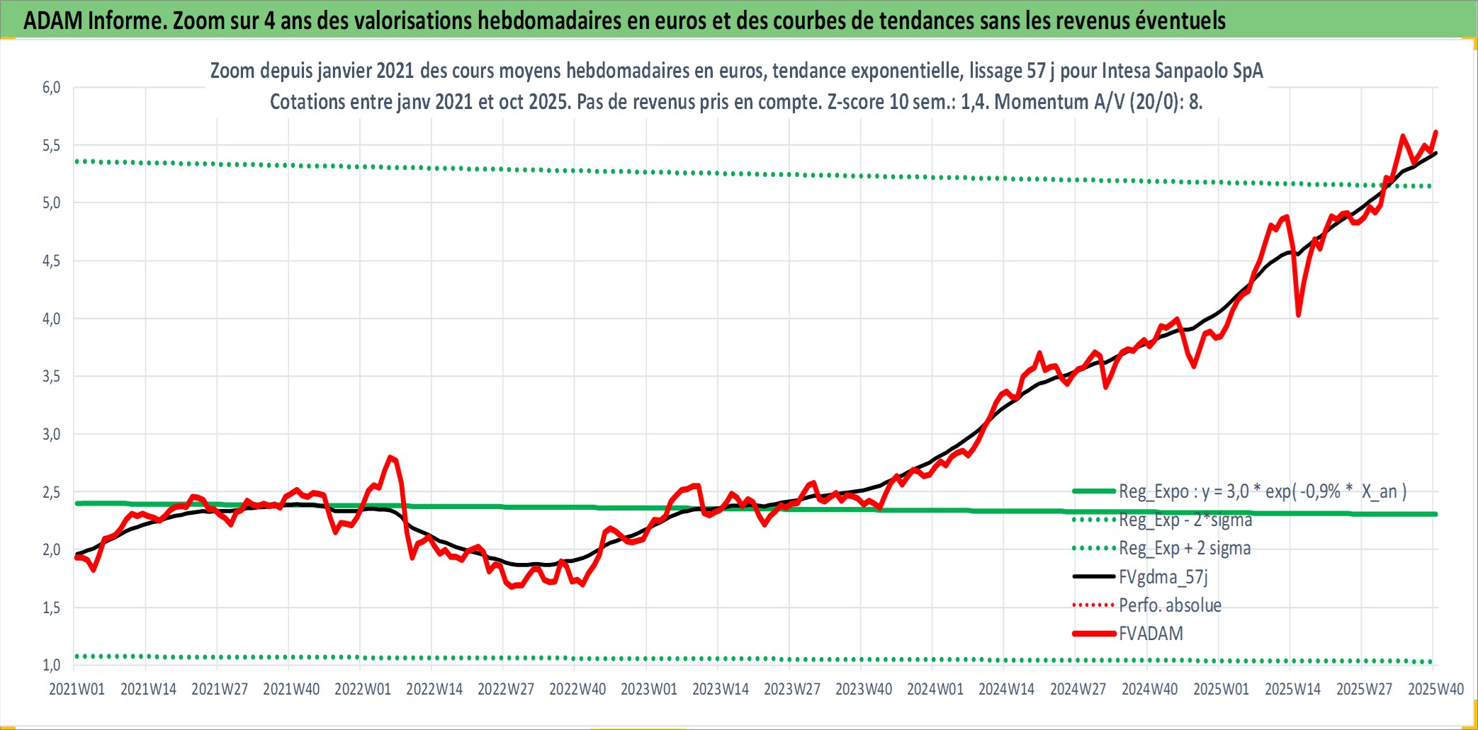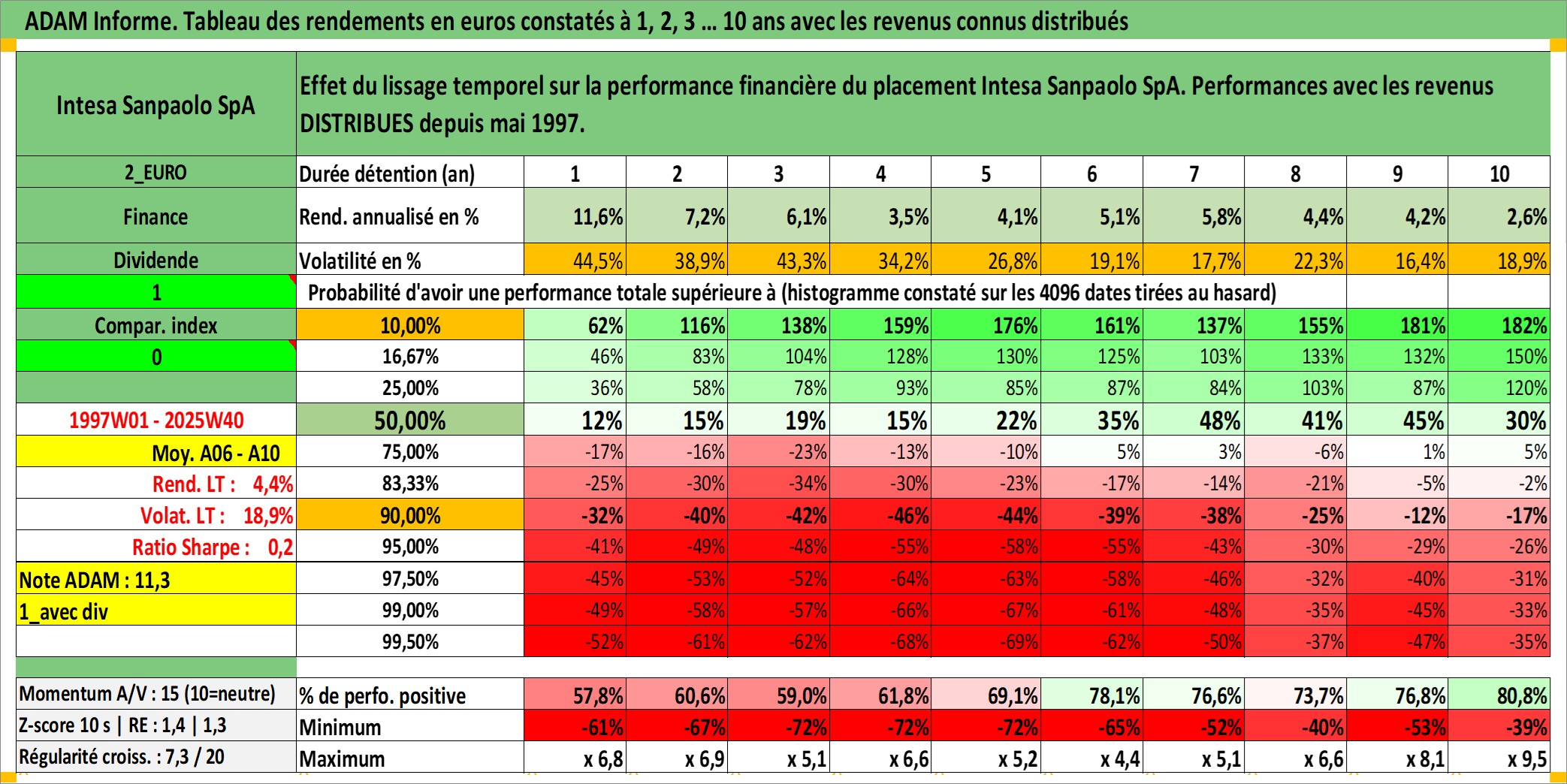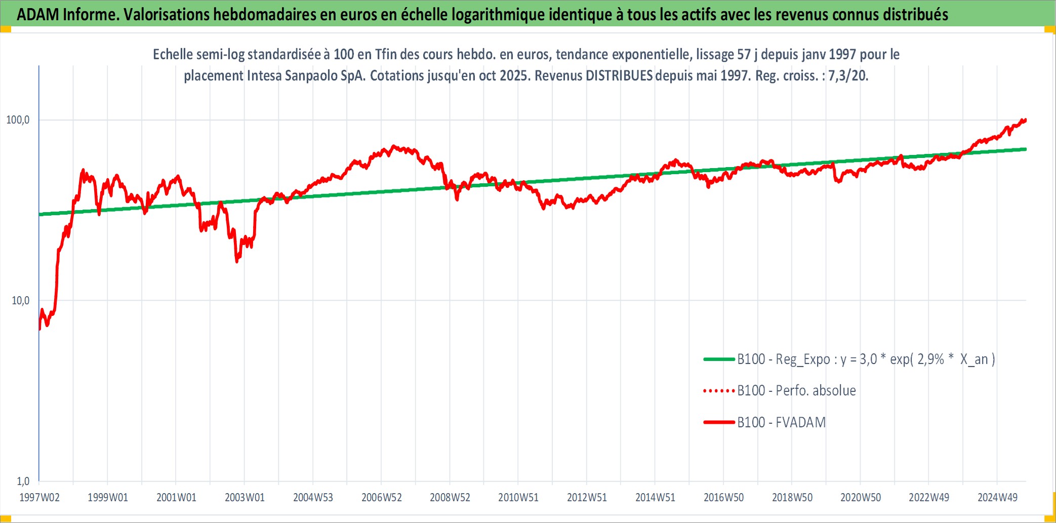 Site dédié aux investisseursPage dédiée sur site financeAnalyse des valorisations hebdomadaires de l'action Intesa Sanpaolo SpA. Cet actif est cote en EUR. Les valorisations couvrent les semaines 1997W01 a 2025W40. Les revenus de cet actif financier sont pris en compte depuis la semaine 1997W21. La note globale ESG de cet actif est estimee a 13.0 (apres rebasage entre 0 et 20).