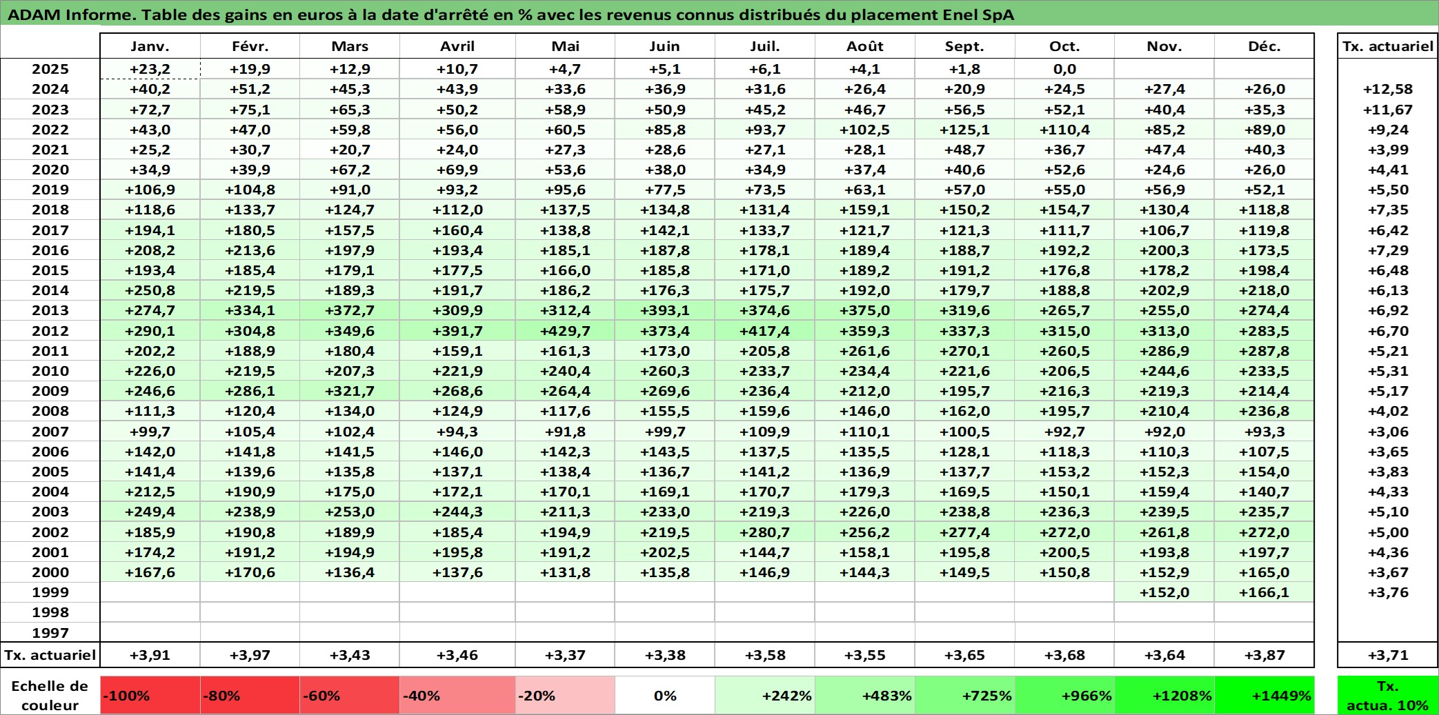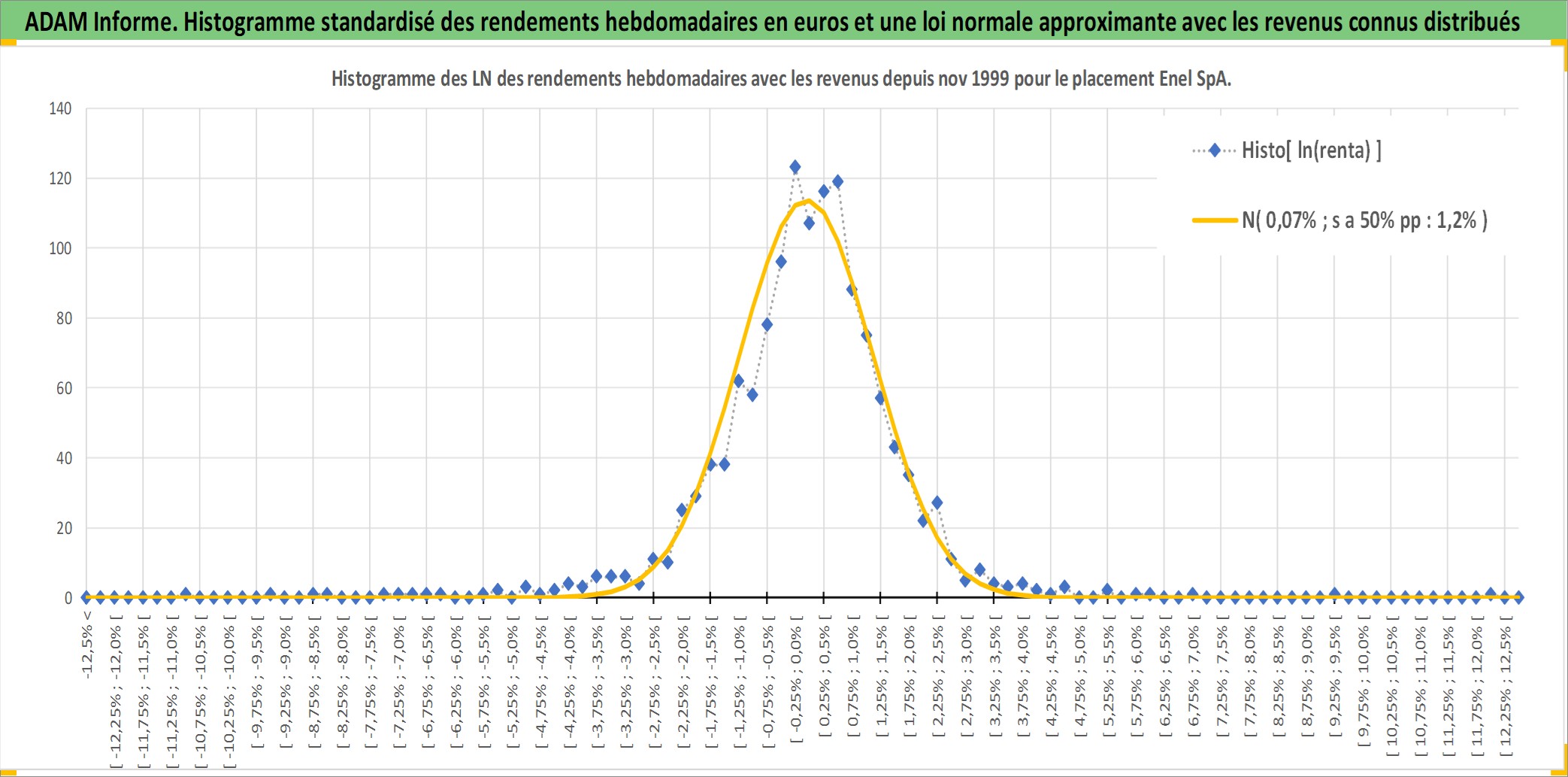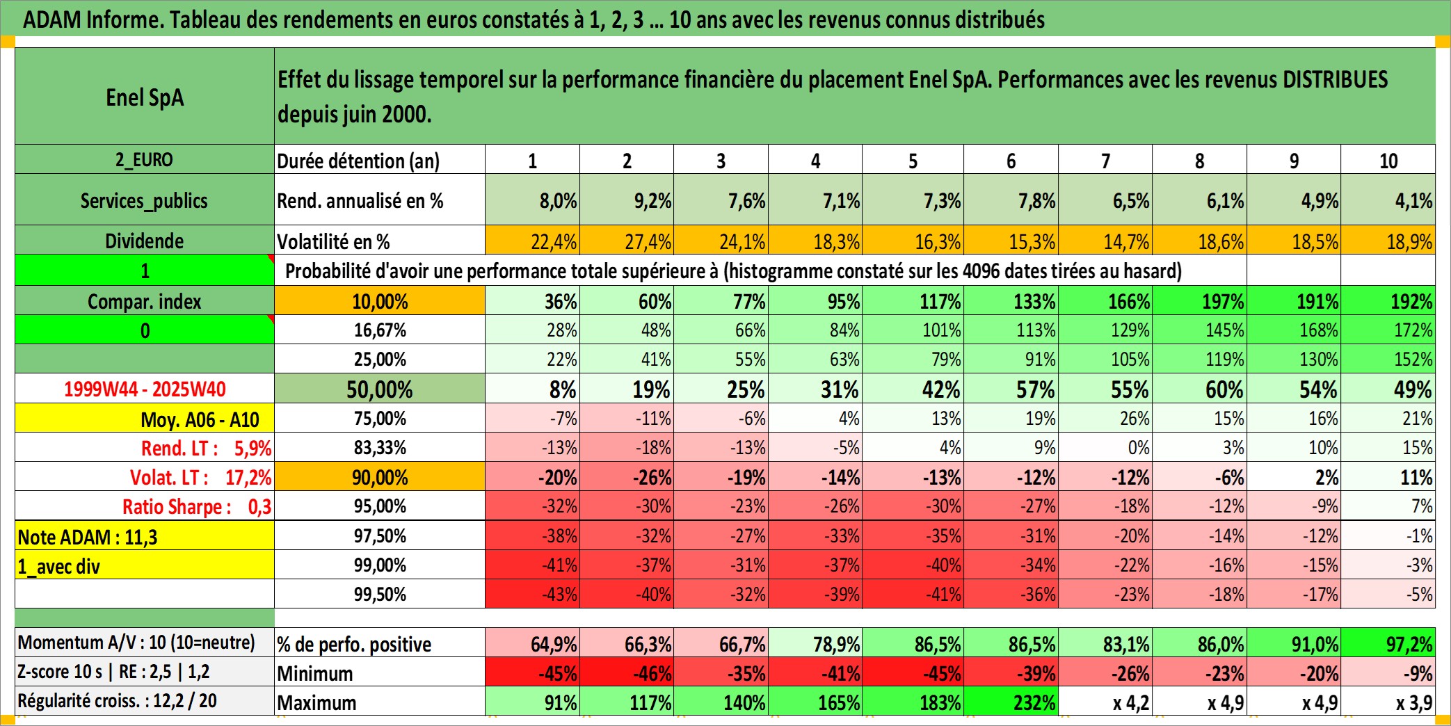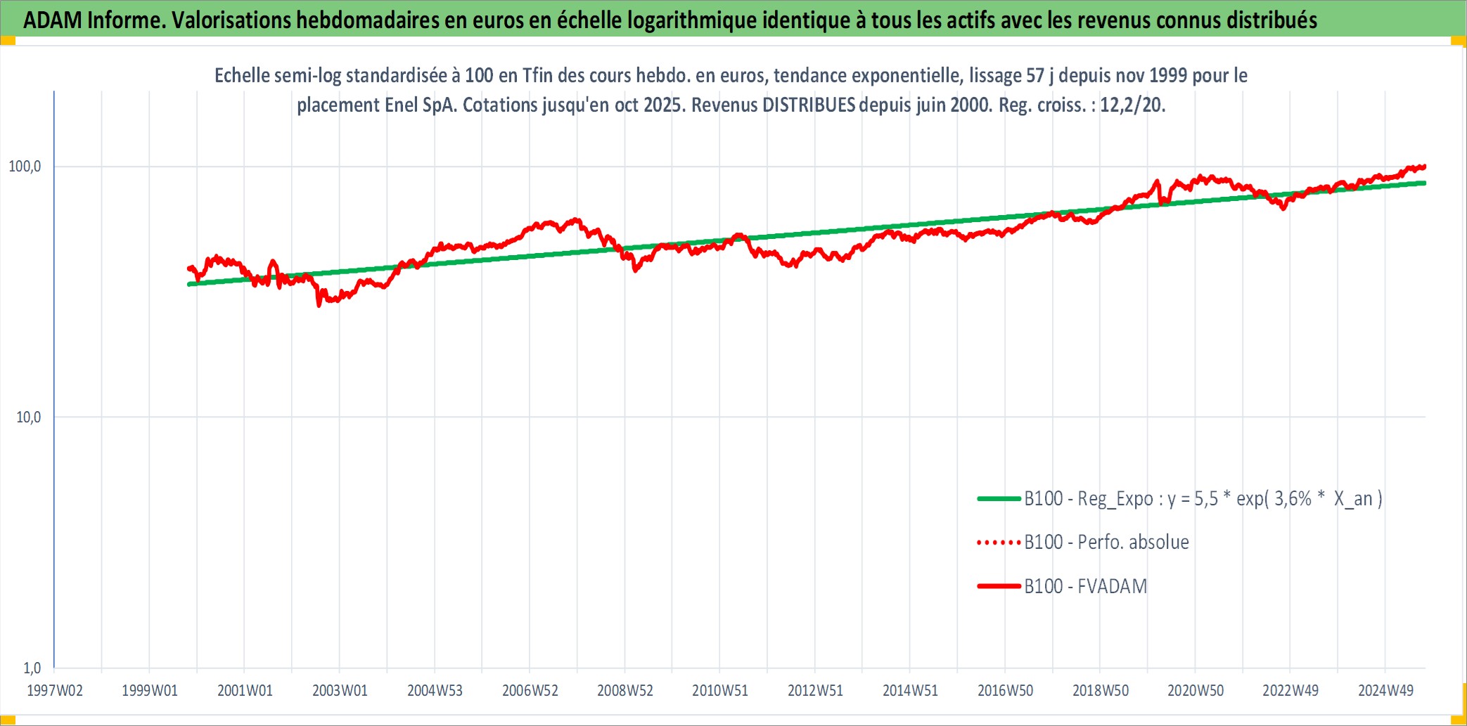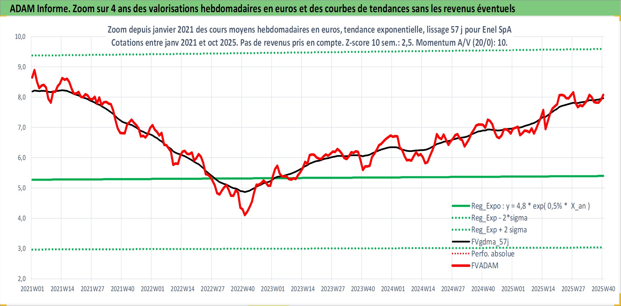 Site dédié aux investisseursPage dédiée sur site financeAnalyse des valorisations hebdomadaires de l'action Enel SpA. Cet actif est cote en EUR. Les valorisations couvrent les semaines 1999W44 a 2025W40. Les revenus de cet actif financier sont pris en compte depuis la semaine 2000W25. La note globale ESG de cet actif est estimee a 9.0 (apres rebasage entre 0 et 20).