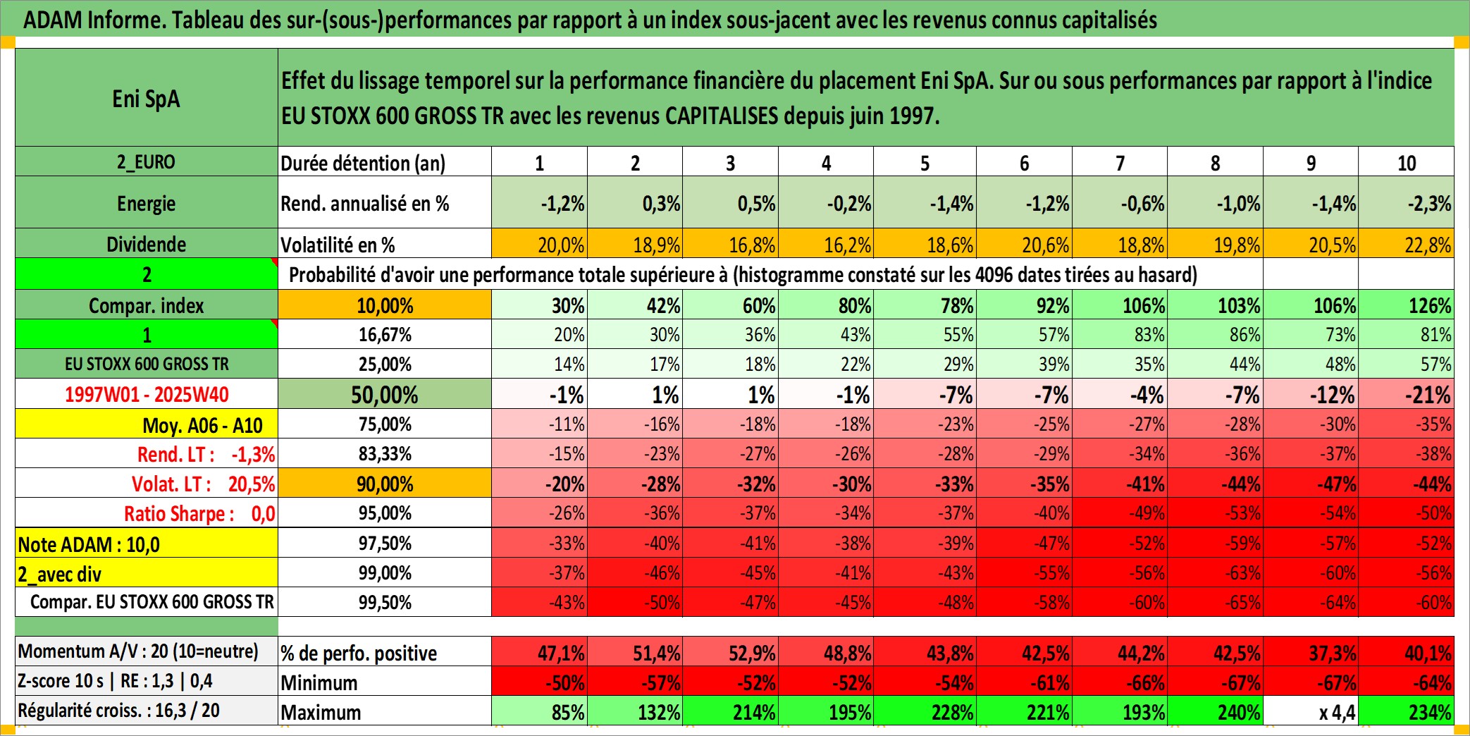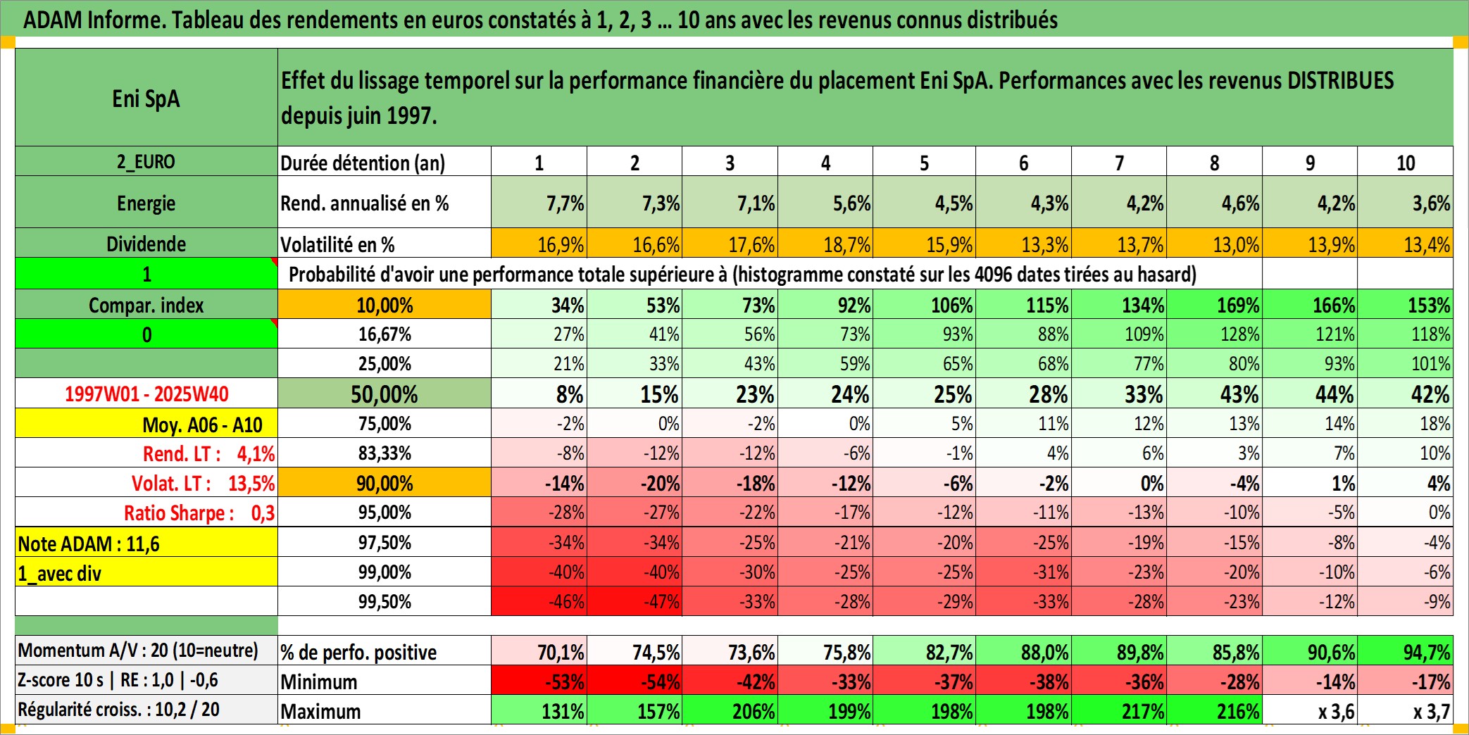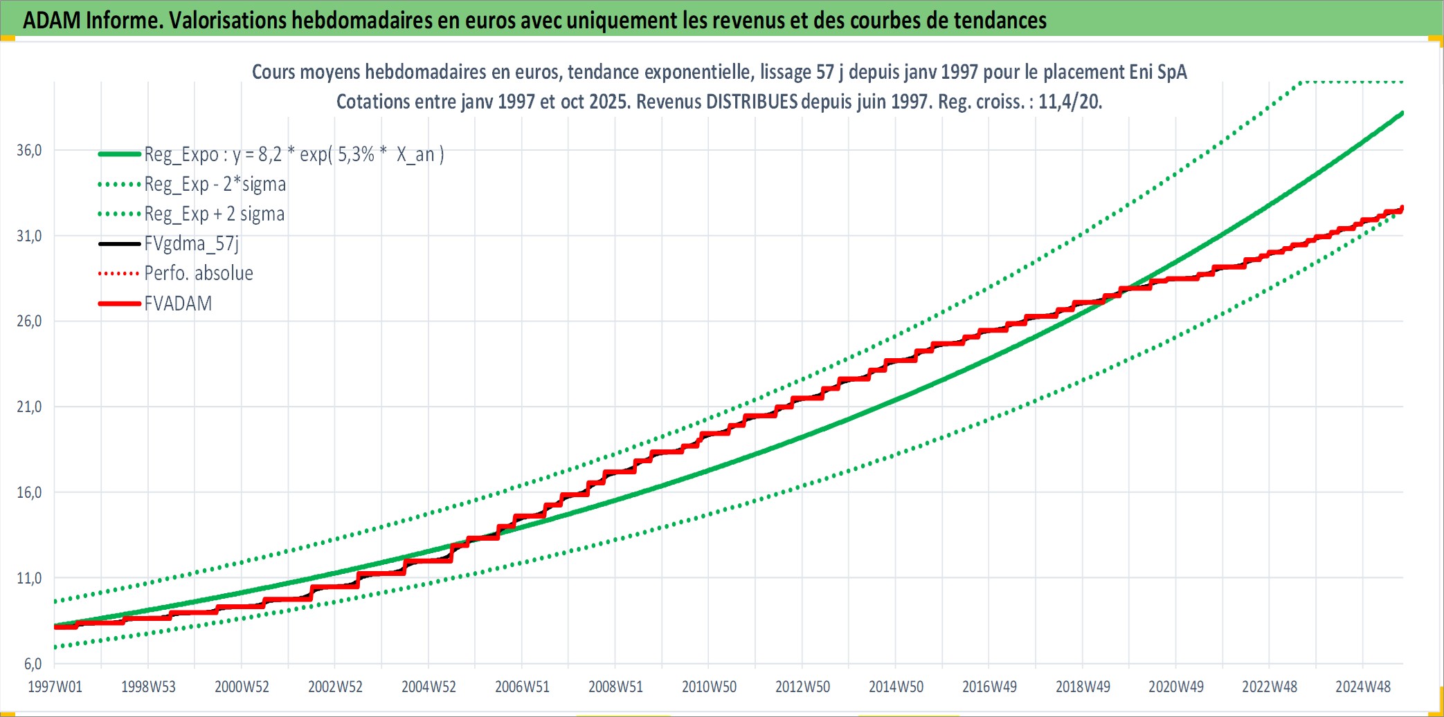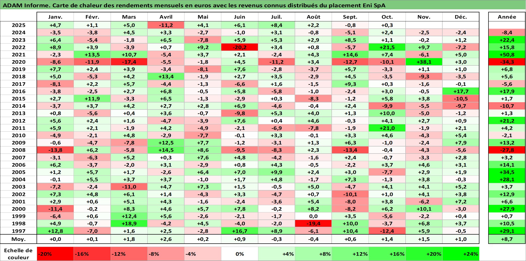 Site dédié aux investisseursPage dédiée sur site financeAnalyse des valorisations hebdomadaires de l'action Eni SpA. Cet actif est cote en EUR. Les valorisations couvrent les semaines 1997W01 a 2025W40. Les revenus de cet actif financier sont pris en compte depuis la semaine 1997W26. La note globale ESG de cet actif est estimee a 7.0 (apres rebasage entre 0 et 20).