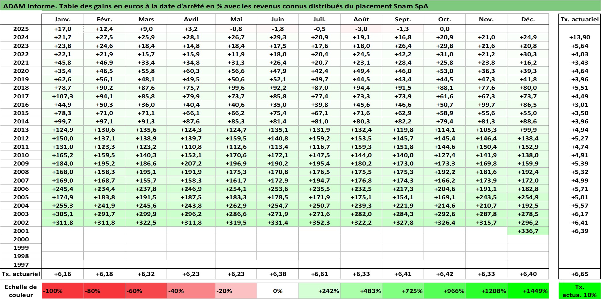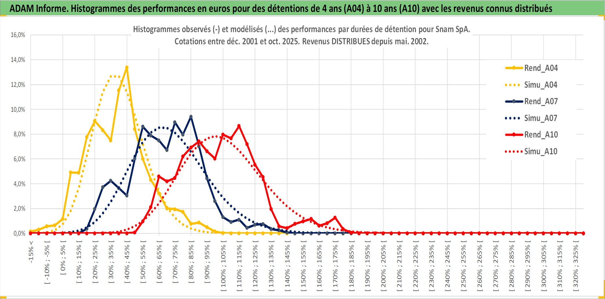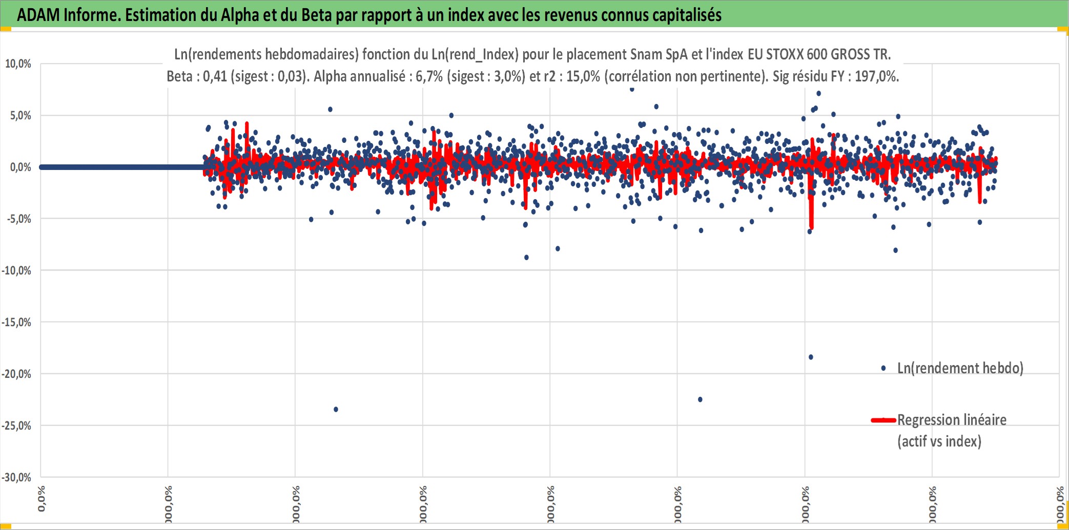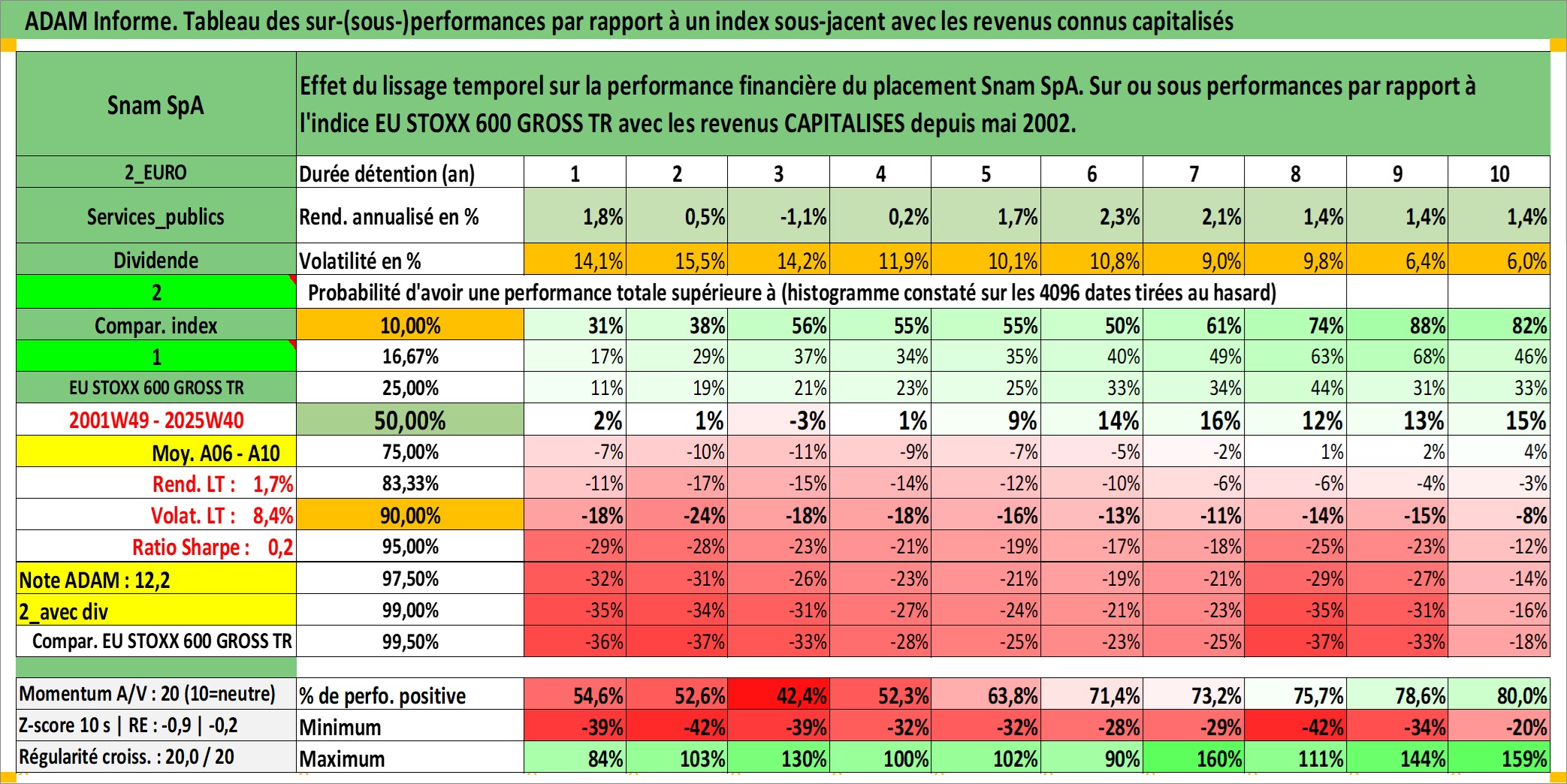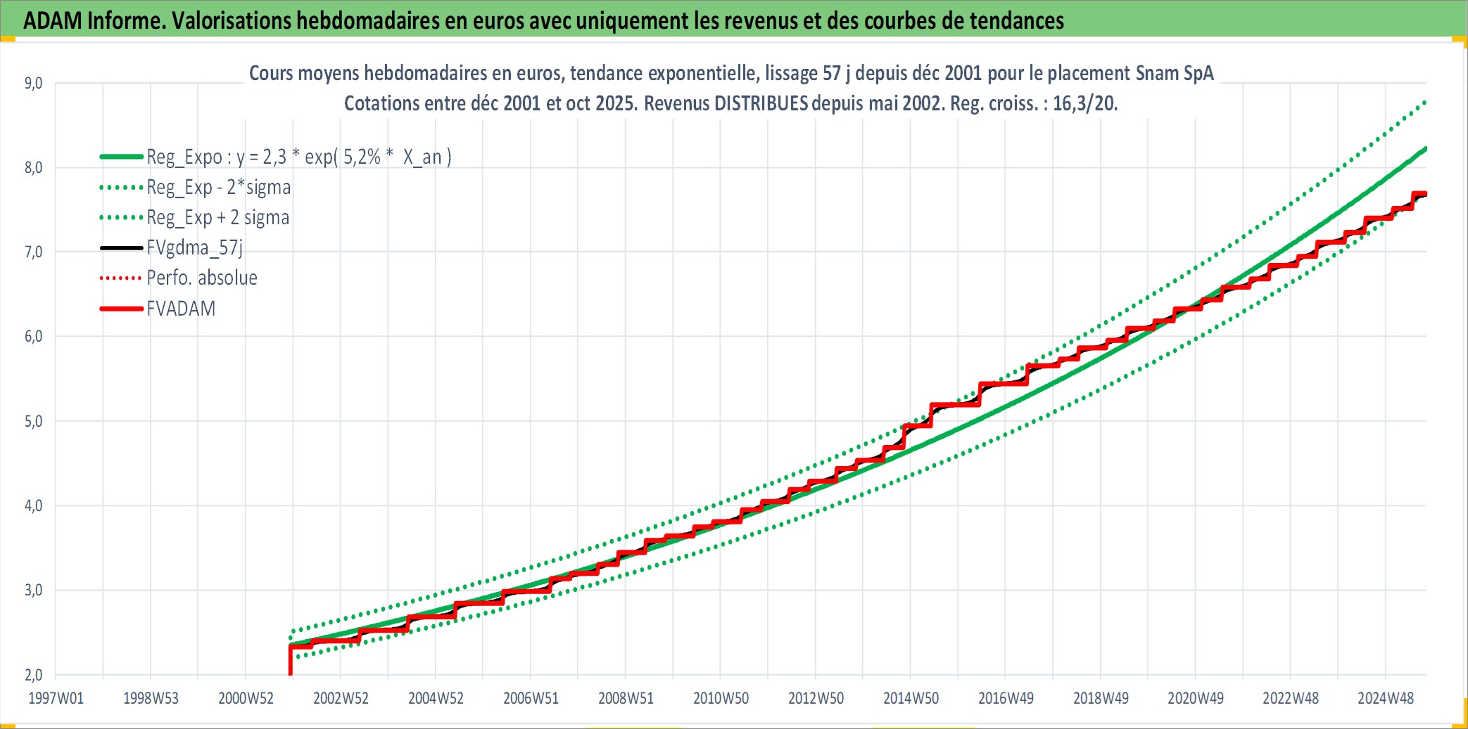 Site dédié aux investisseursPage dédiée sur site financeAnalyse des valorisations hebdomadaires de l'action Snam SpA. Cet actif est cote en EUR. Les valorisations couvrent les semaines 2001W49 a 2025W40. Les revenus de cet actif financier sont pris en compte depuis la semaine 2002W21. La note globale ESG de cet actif est estimee a 13.0 (apres rebasage entre 0 et 20).