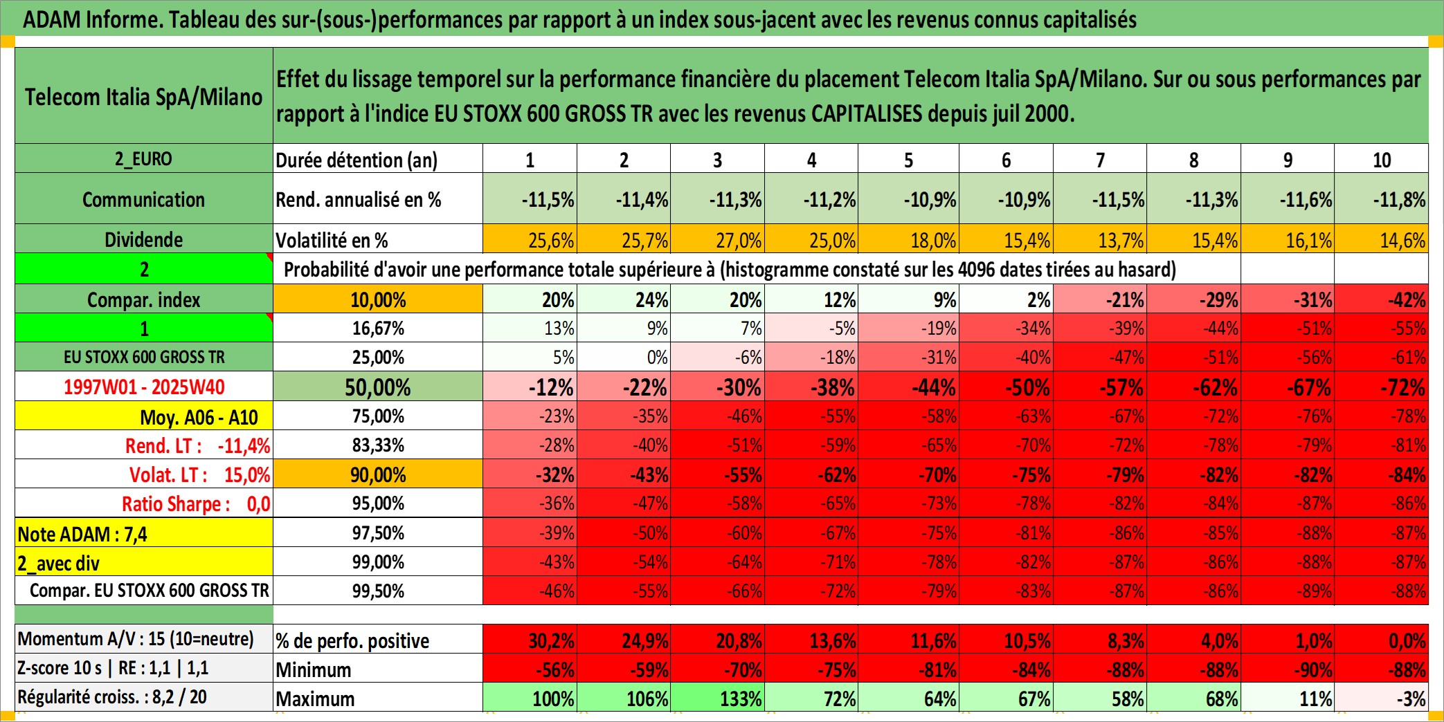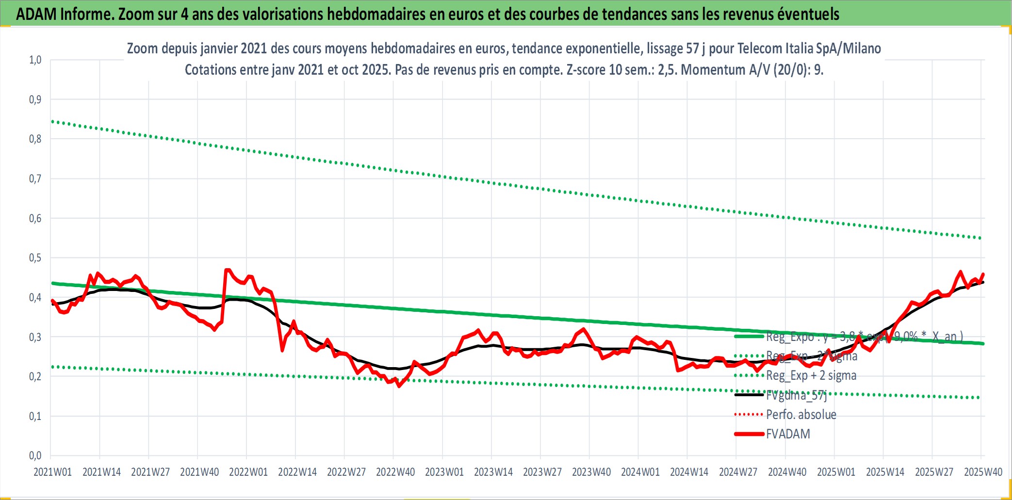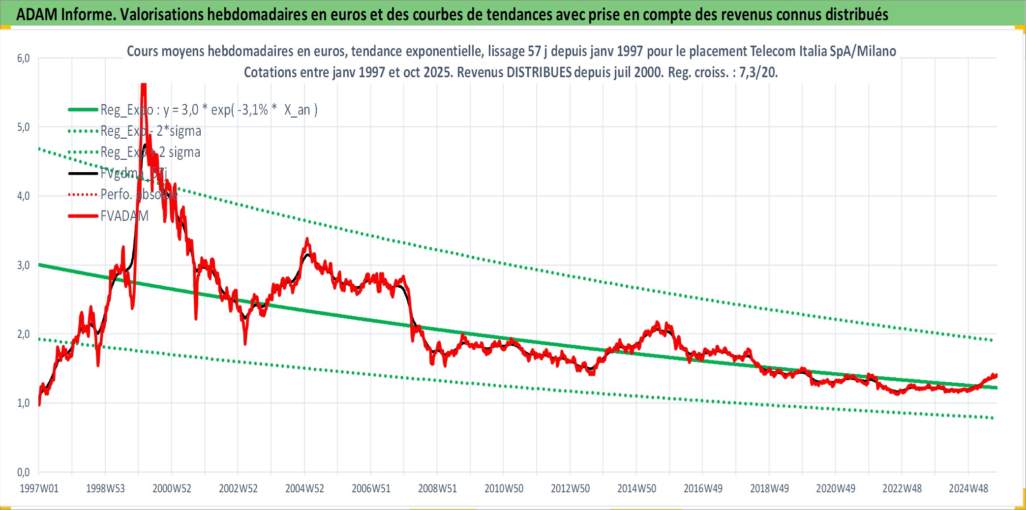Site dédié aux investisseursPage dédiée sur site financeAnalyse des valorisations hebdomadaires de l'action Telecom Italia SpA/Milano. Cet actif est cote en EUR. Les valorisations couvrent les semaines 1997W01 a 2025W40. Les revenus de cet actif financier sont pris en compte depuis la semaine 2000W30. La note globale ESG de cet actif est estimee a 11.0 (apres rebasage entre 0 et 20).