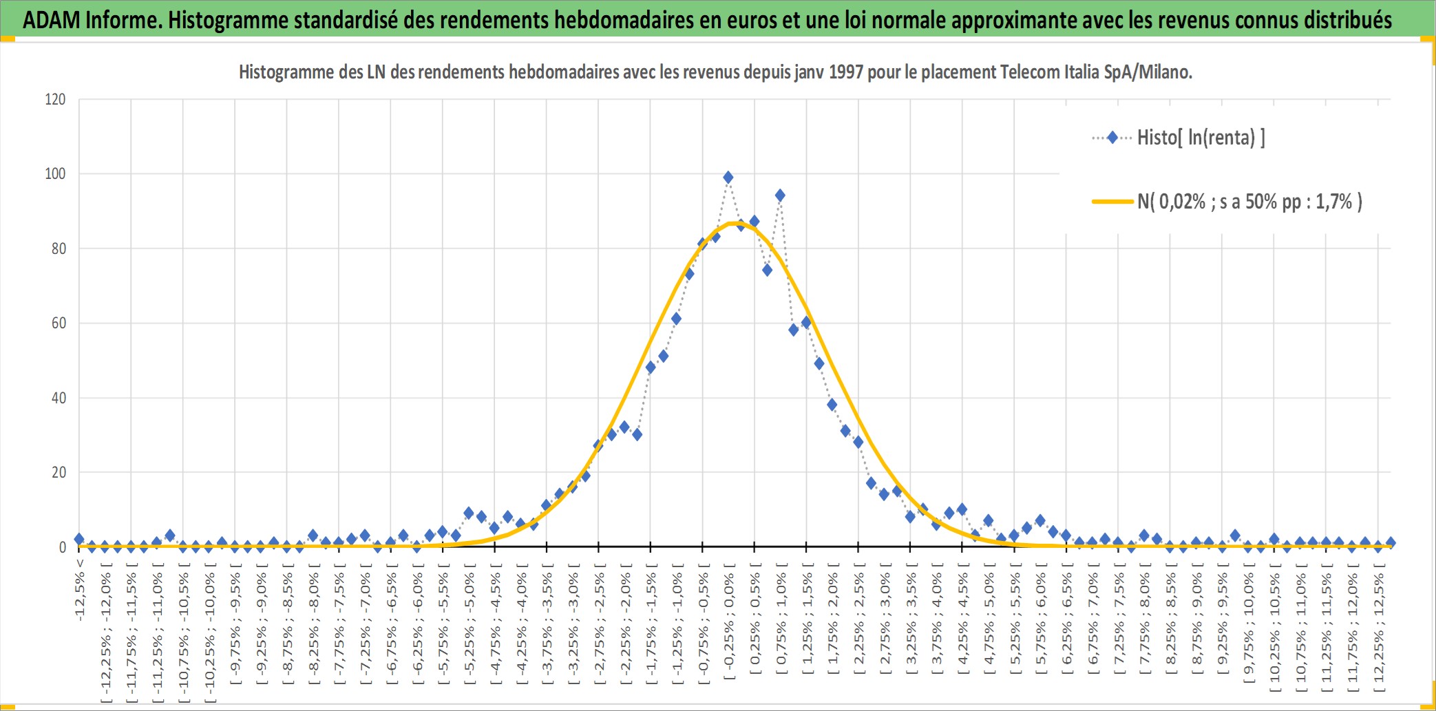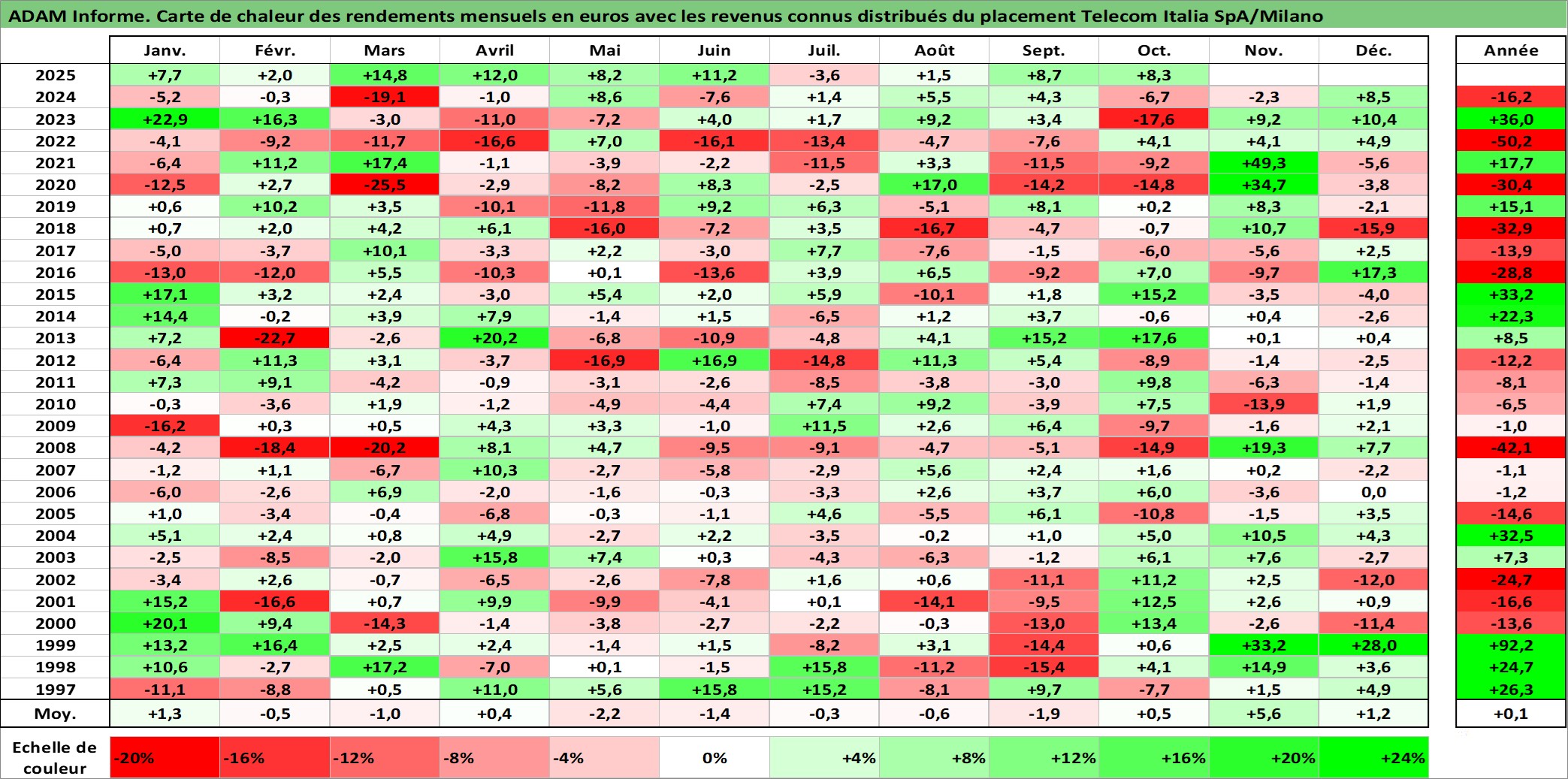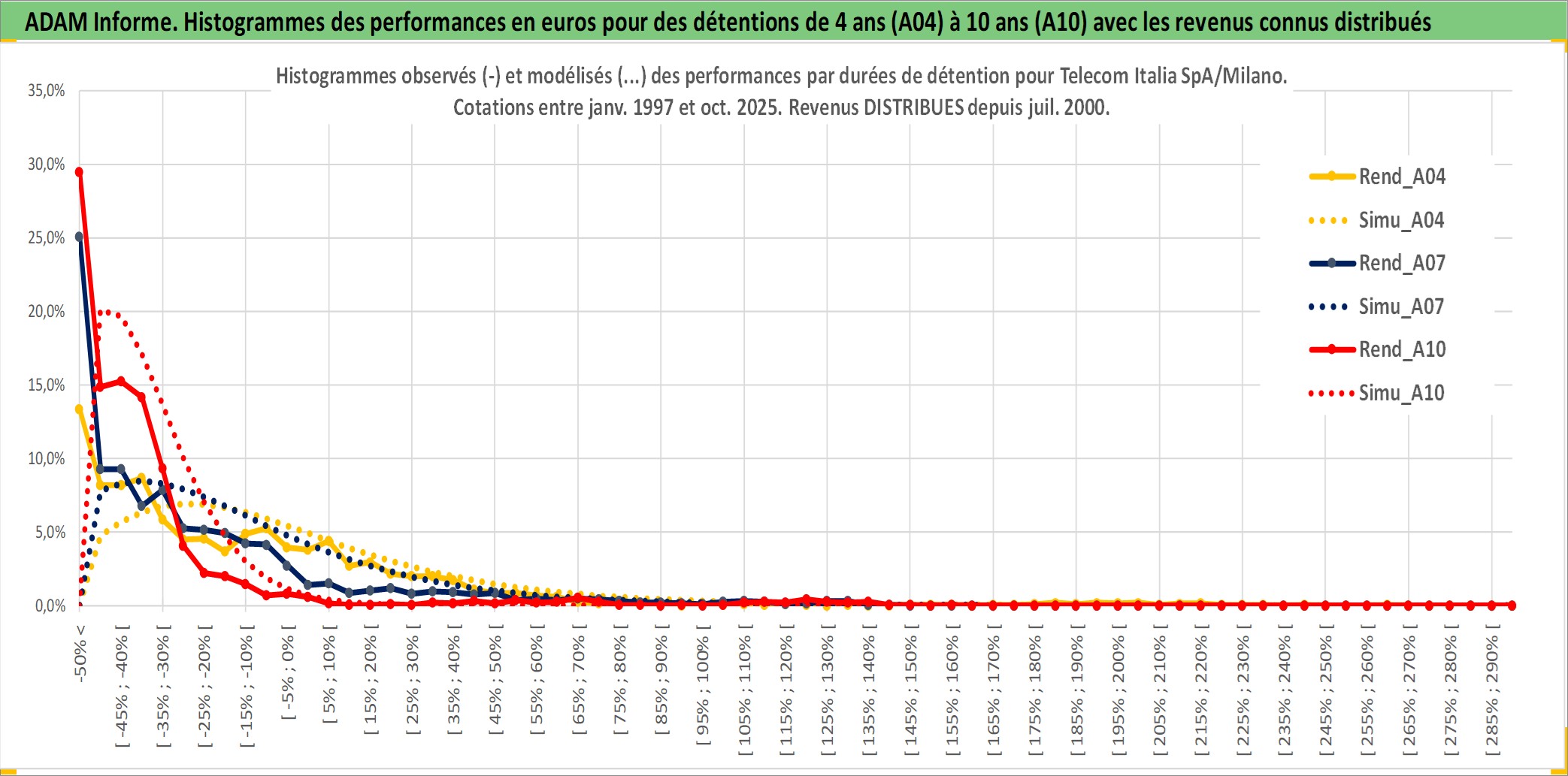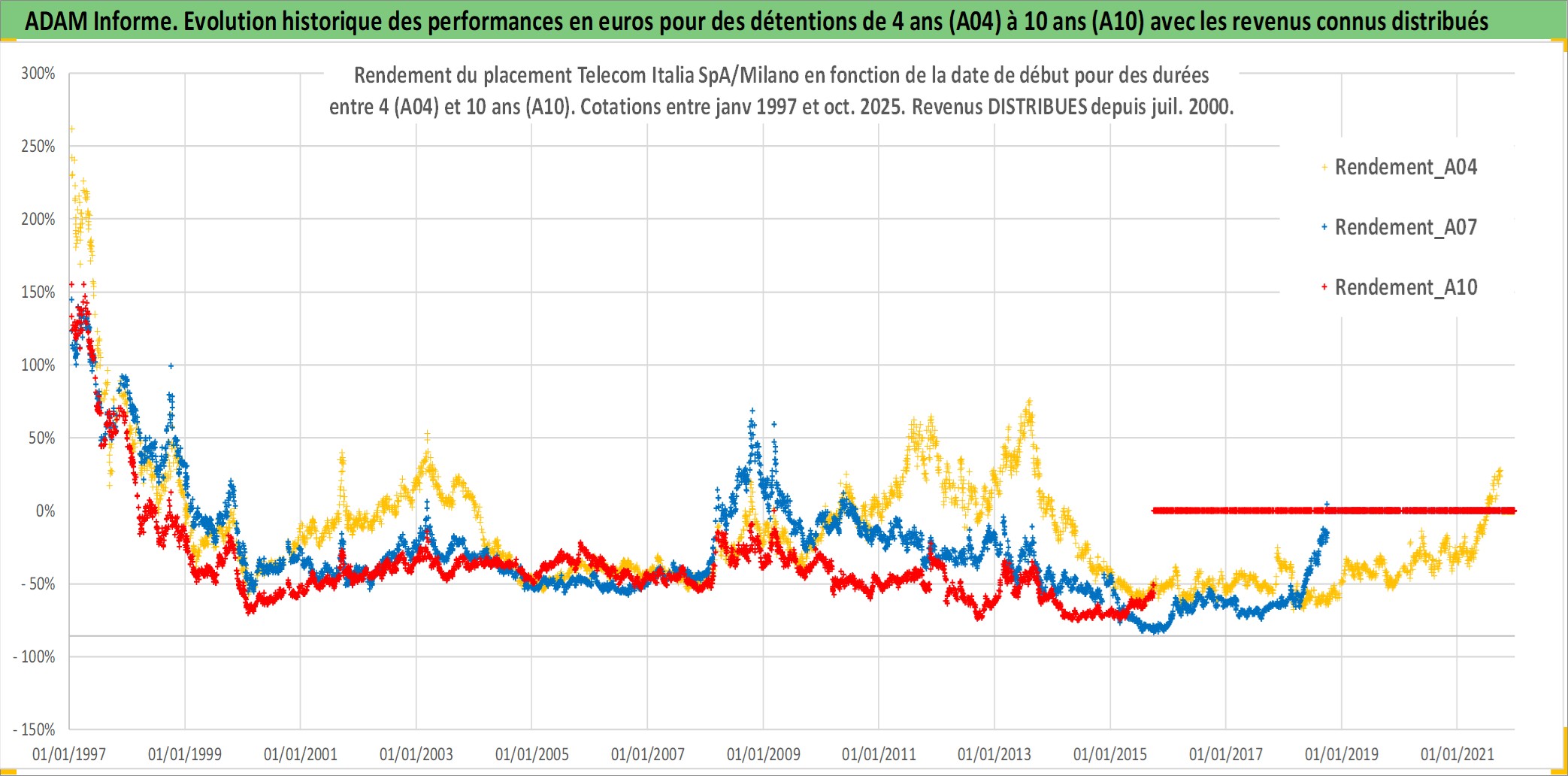 Site dédié aux investisseursPage dédiée sur site financeAnalyse des valorisations hebdomadaires de l'action Telecom Italia SpA/Milano. Cet actif est cote en EUR. Les valorisations couvrent les semaines 1997W01 a 2025W40. Les revenus de cet actif financier sont pris en compte depuis la semaine 2000W30. La note globale ESG de cet actif est estimee a 11.0 (apres rebasage entre 0 et 20).