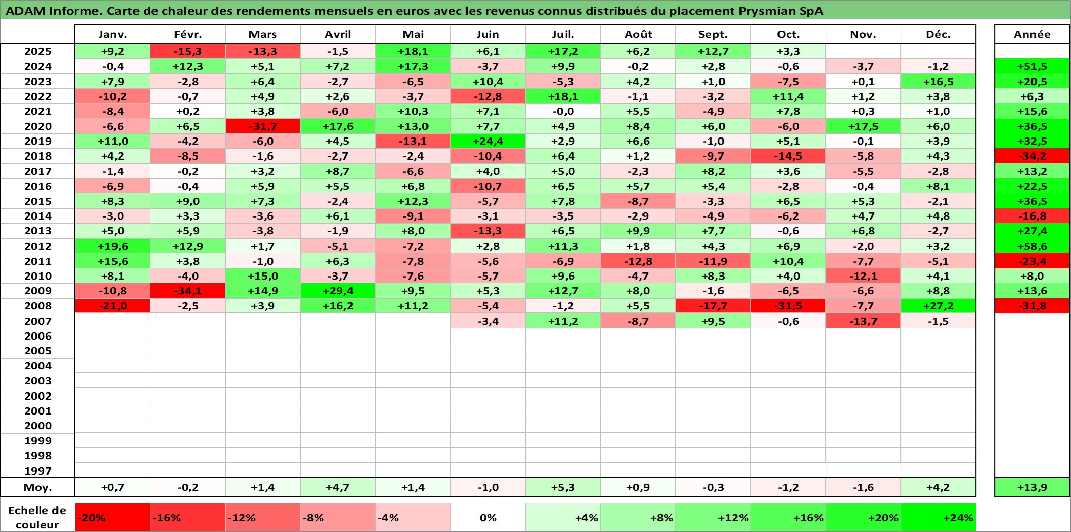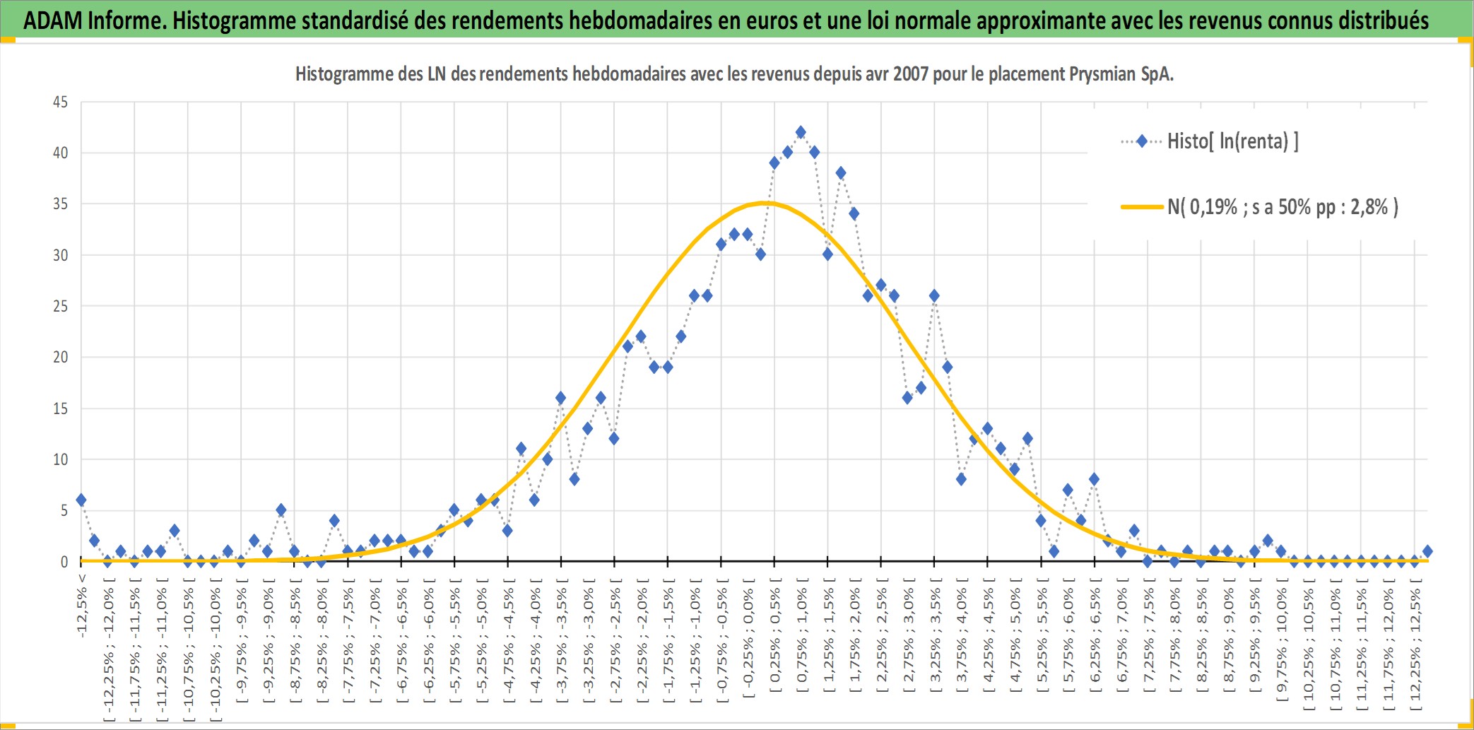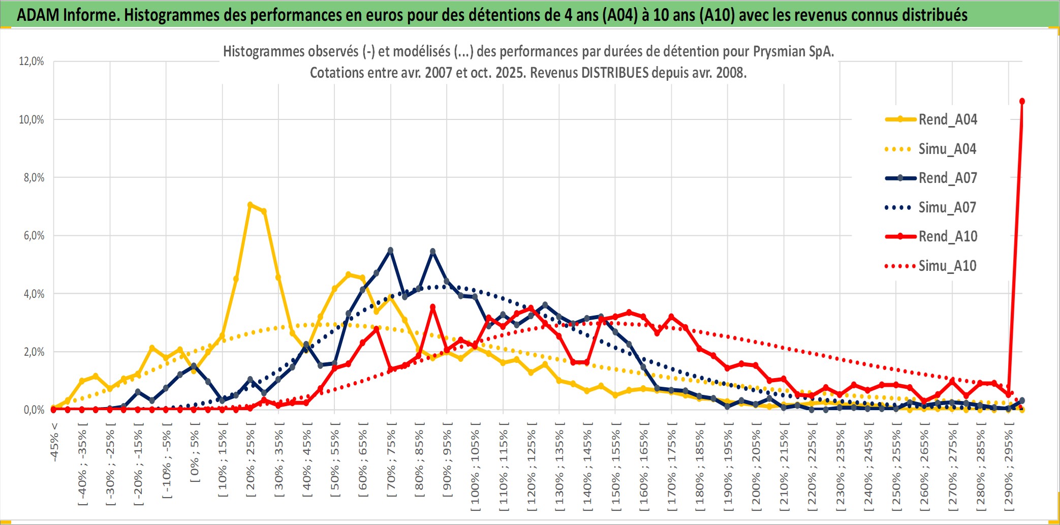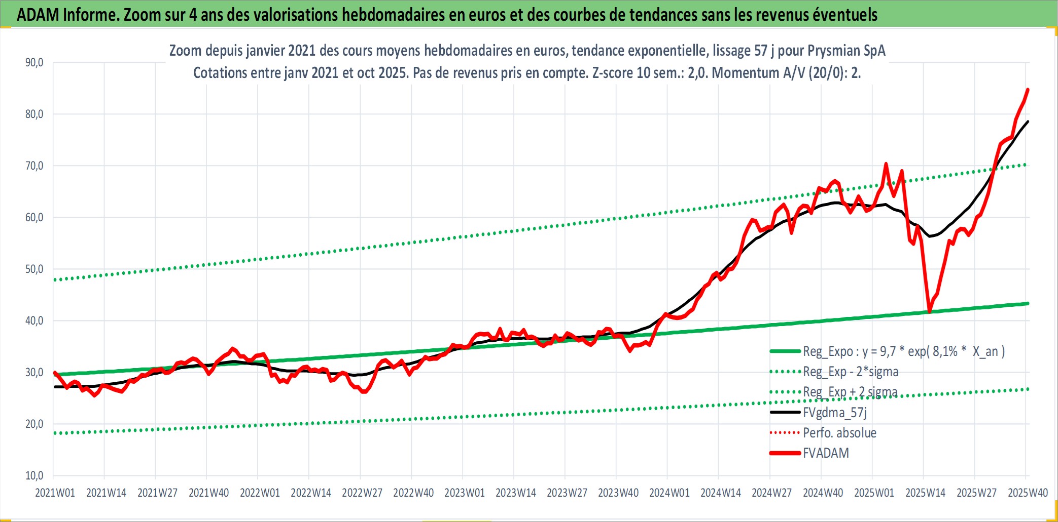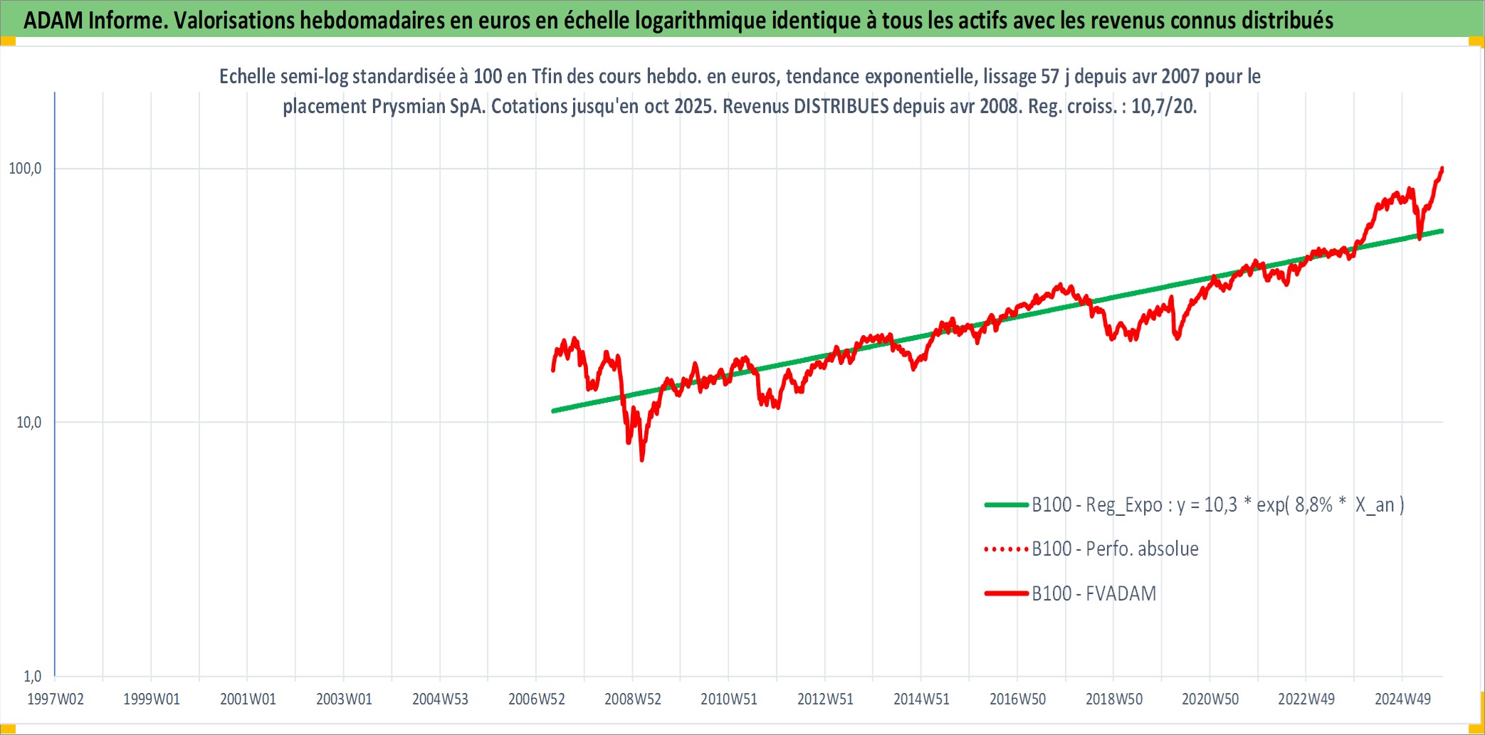 Site dédié aux investisseursPage dédiée sur site financeAnalyse des valorisations hebdomadaires de l'action Prysmian SpA. Cet actif est cote en EUR. Les valorisations couvrent les semaines 2007W18 a 2025W40. Les revenus de cet actif financier sont pris en compte depuis la semaine 2008W17. La note globale ESG de cet actif est estimee a 10.0 (apres rebasage entre 0 et 20).