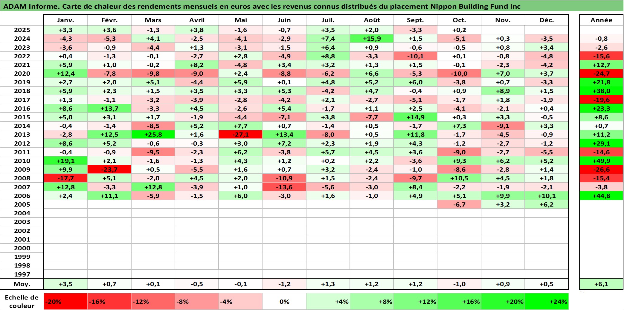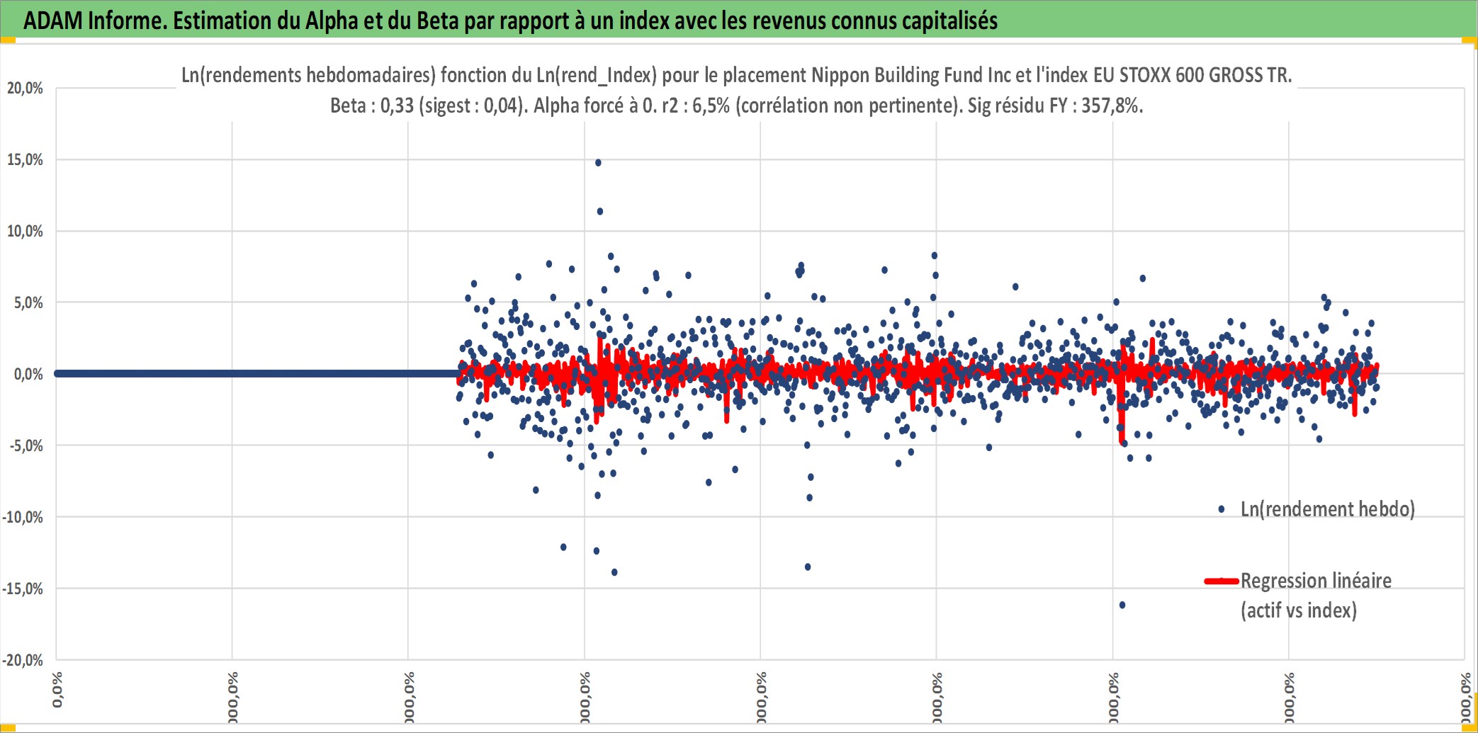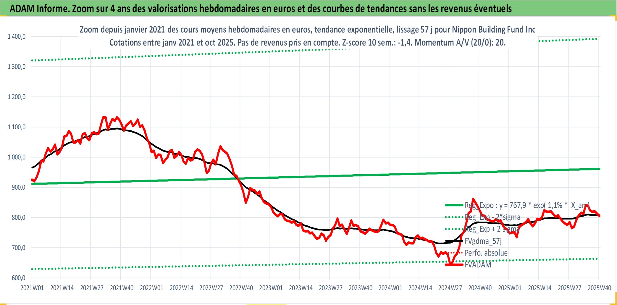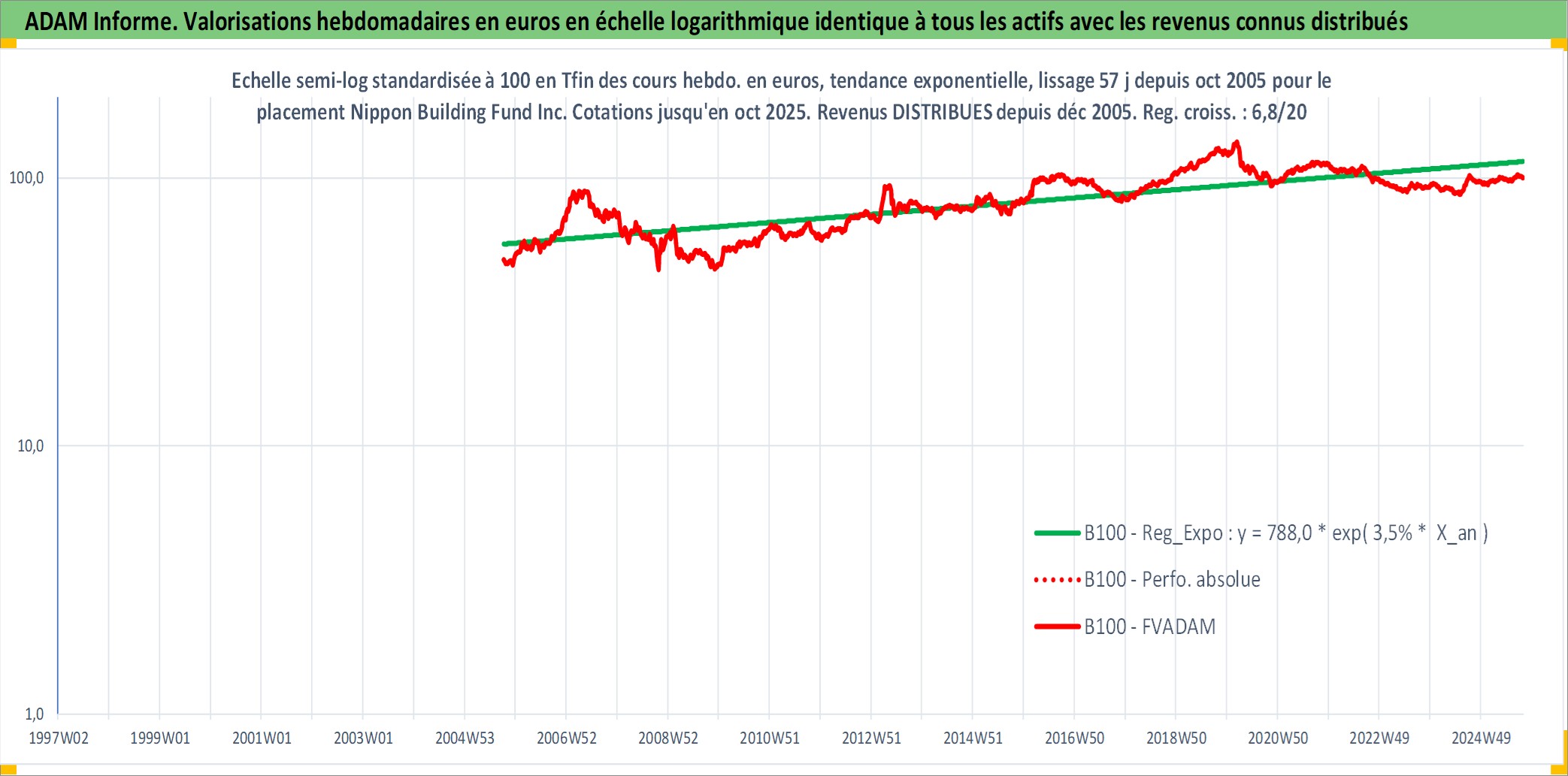 Site dédié aux investisseursPage dédiée sur site financeAnalyse des valorisations hebdomadaires de l'action Nippon Building Fund Inc. Cet actif est cote en JPY. Les valorisations sont en contrevaleur EURO et couvrent les semaines 2005W40 a 2025W40. Les revenus de cet actif financier sont pris en compte depuis la semaine 2005W52. La note globale ESG de cet actif est estimee a 15.0 (apres rebasage entre 0 et 20).