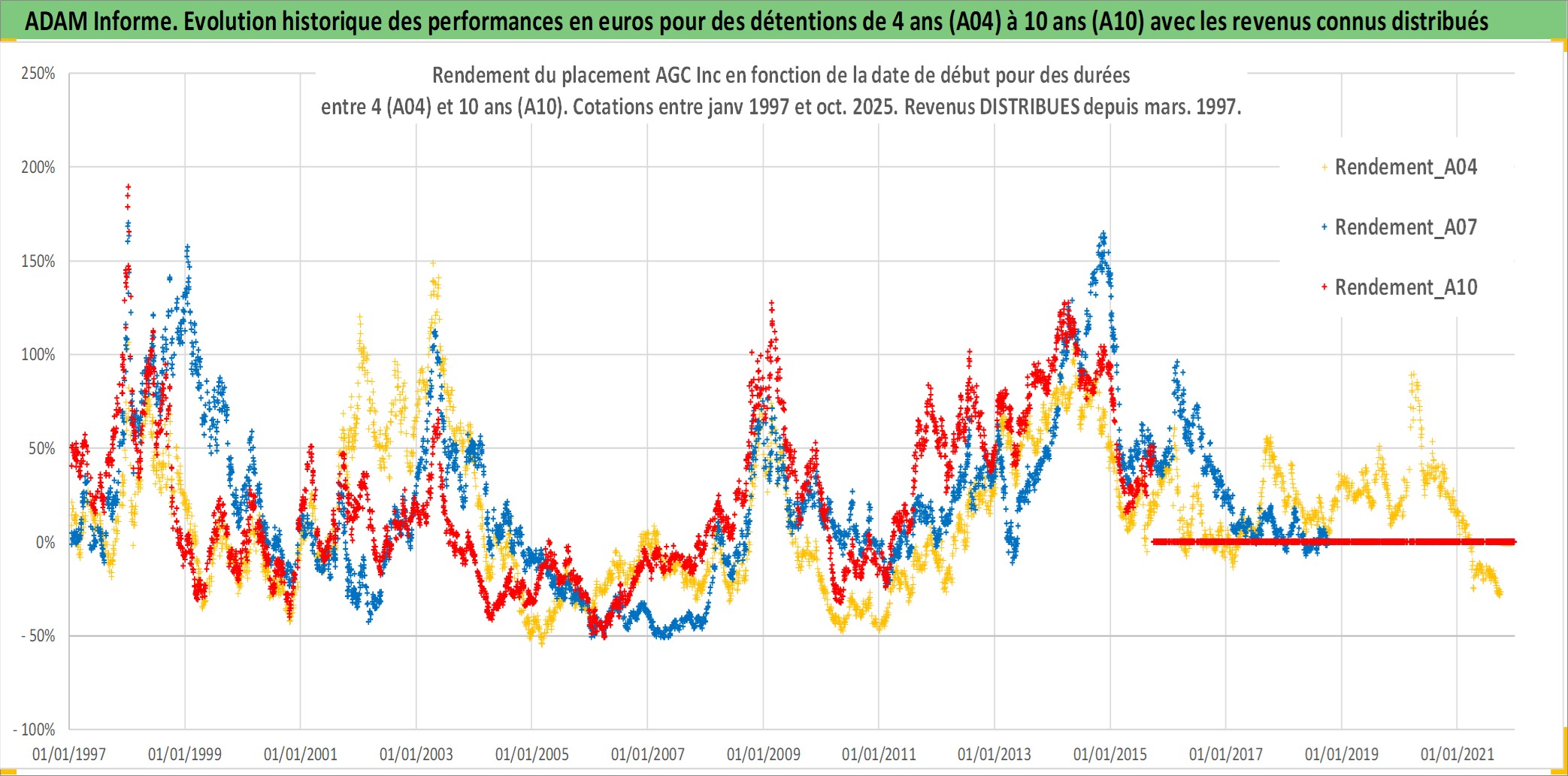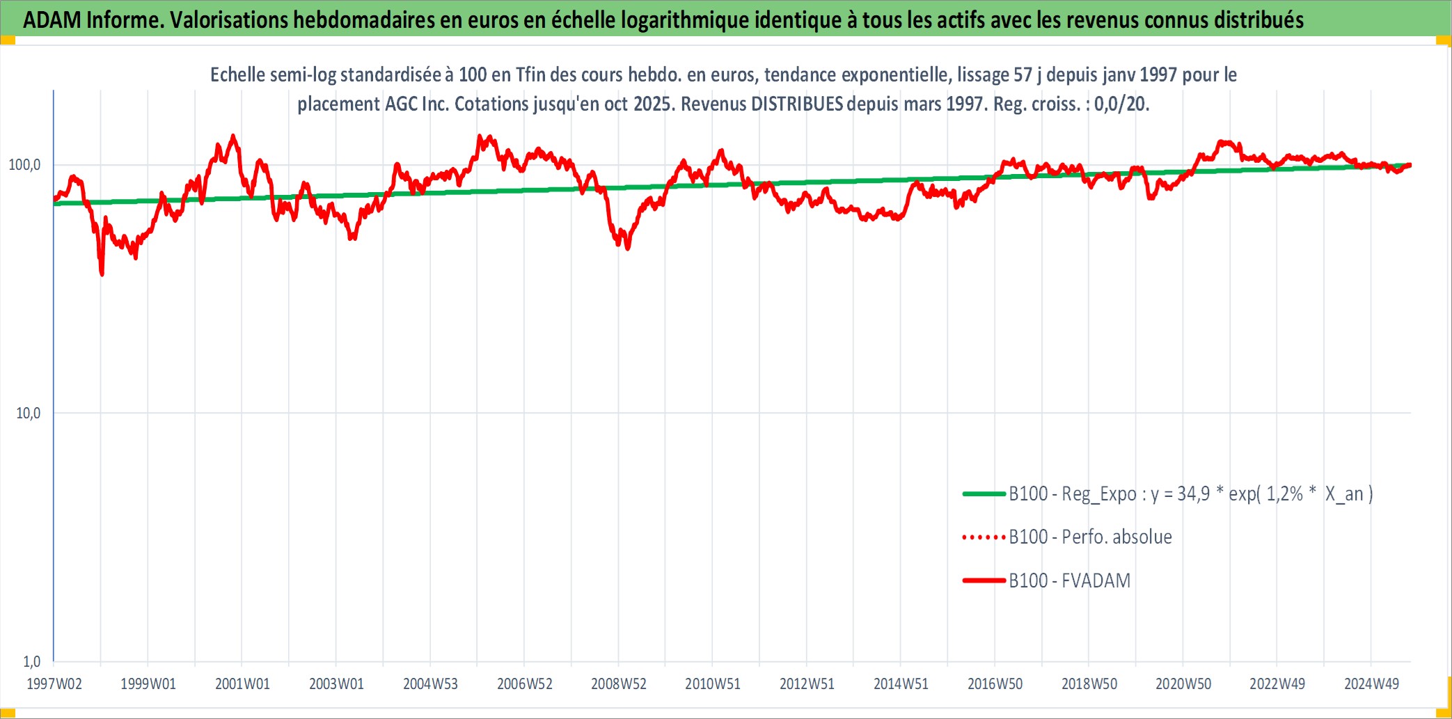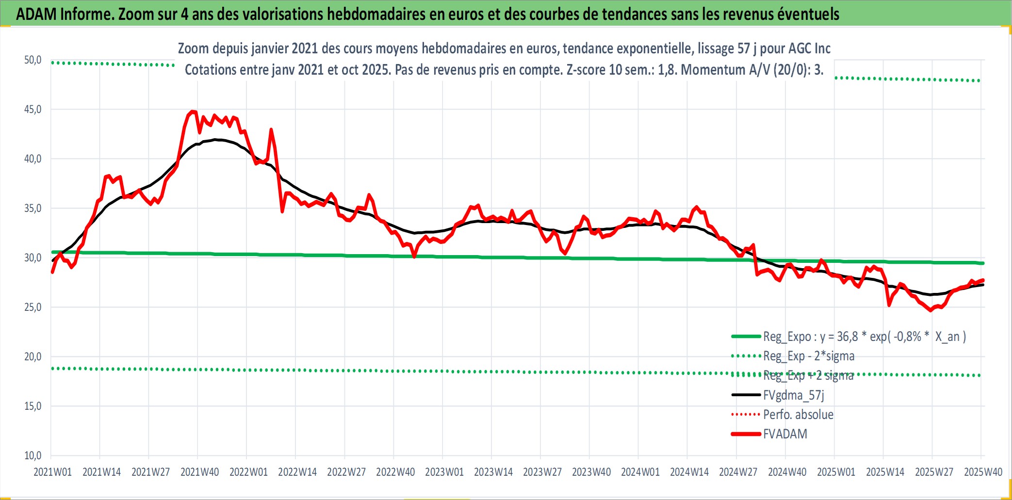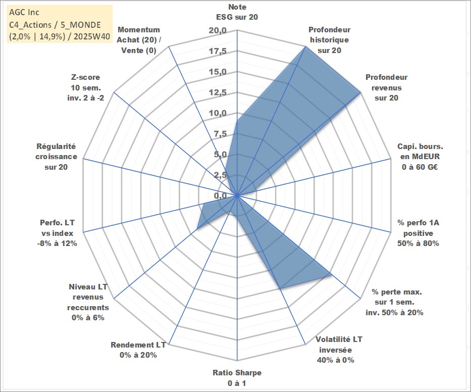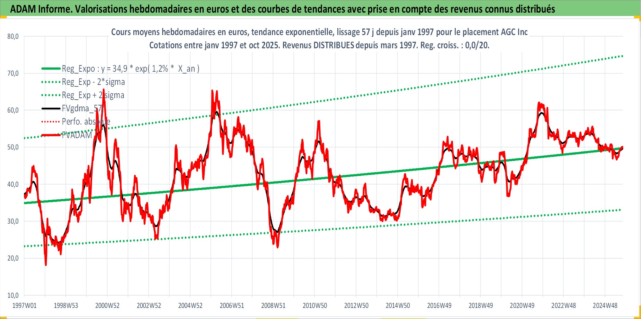 Site dédié aux investisseursPage dédiée sur site financeAnalyse des valorisations hebdomadaires de l'action AGC Inc. Cet actif est cote en JPY. Les valorisations sont en contrevaleur EURO et couvrent les semaines 1997W01 a 2025W40. Les revenus de cet actif financier sont pris en compte depuis la semaine 1997W13. La note globale ESG de cet actif est estimee a 9.0 (apres rebasage entre 0 et 20).