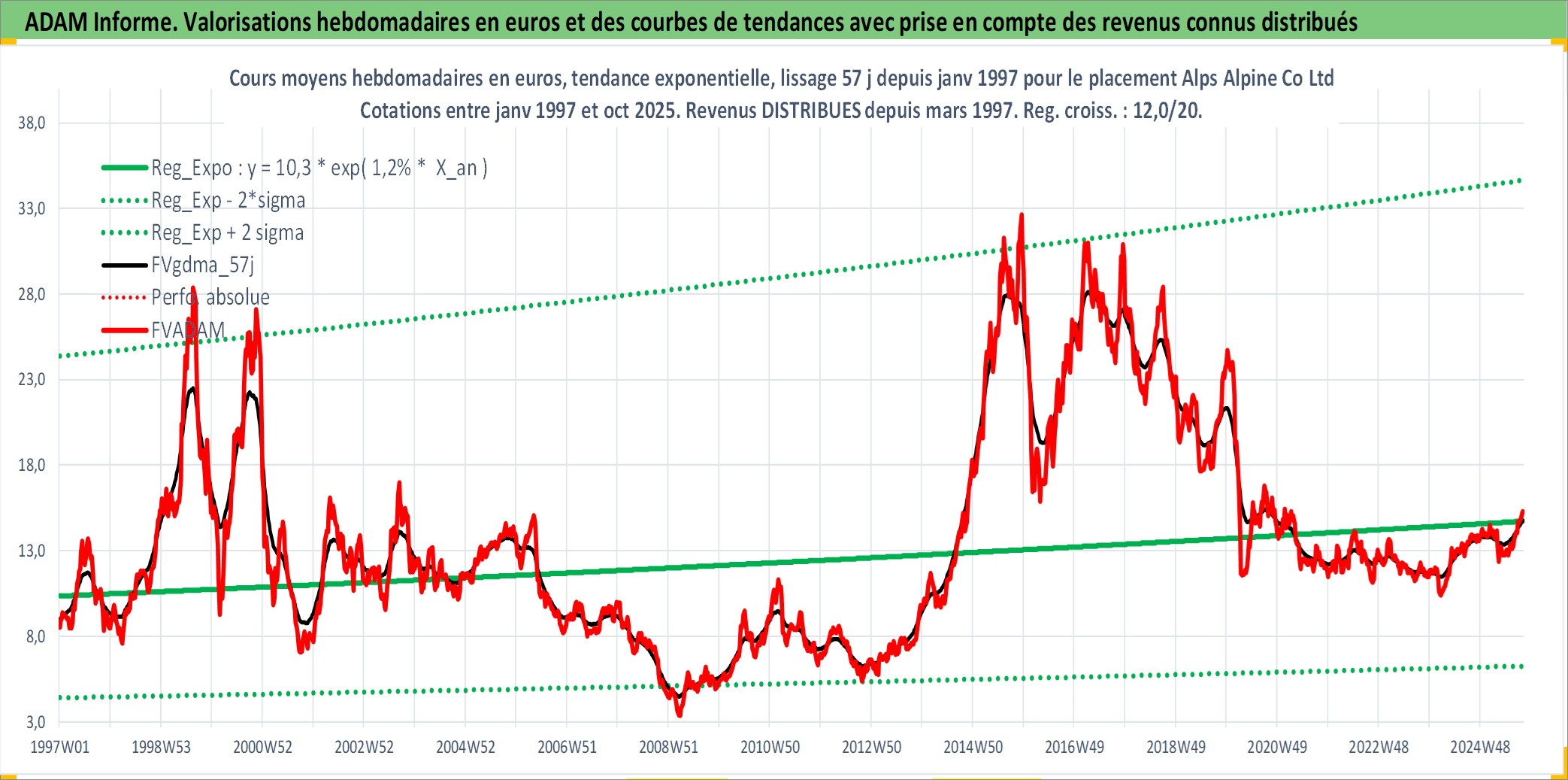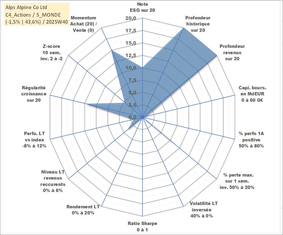 Site dédié aux investisseursPage dédiée sur site financeAnalyse des valorisations hebdomadaires de l'action Alps Alpine Co Ltd. Cet actif est cote en JPY. Les valorisations sont en contrevaleur EURO et couvrent les semaines 1997W01 a 2025W40. Les revenus de cet actif financier sont pris en compte depuis la semaine 1997W13. La note globale ESG de cet actif est estimee a 10.0 (apres rebasage entre 0 et 20).