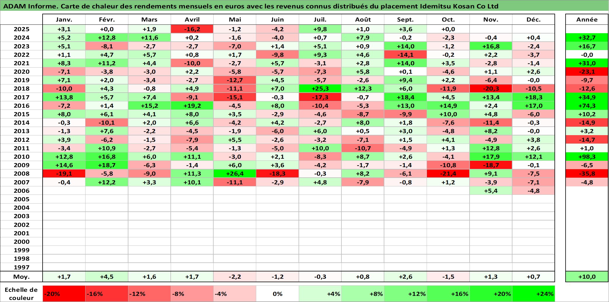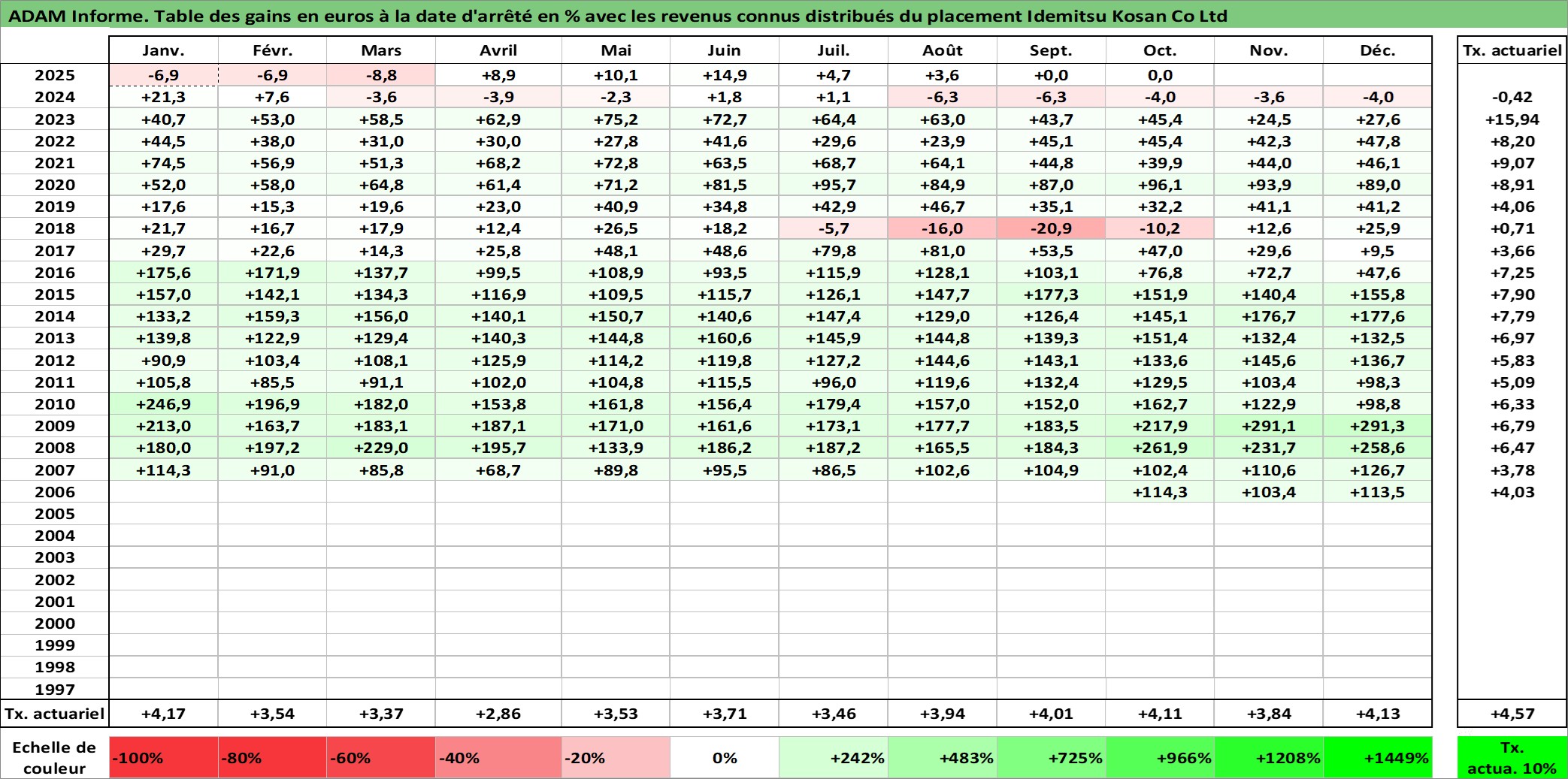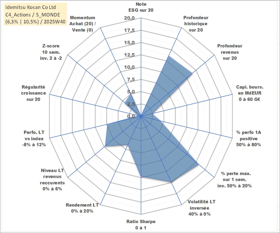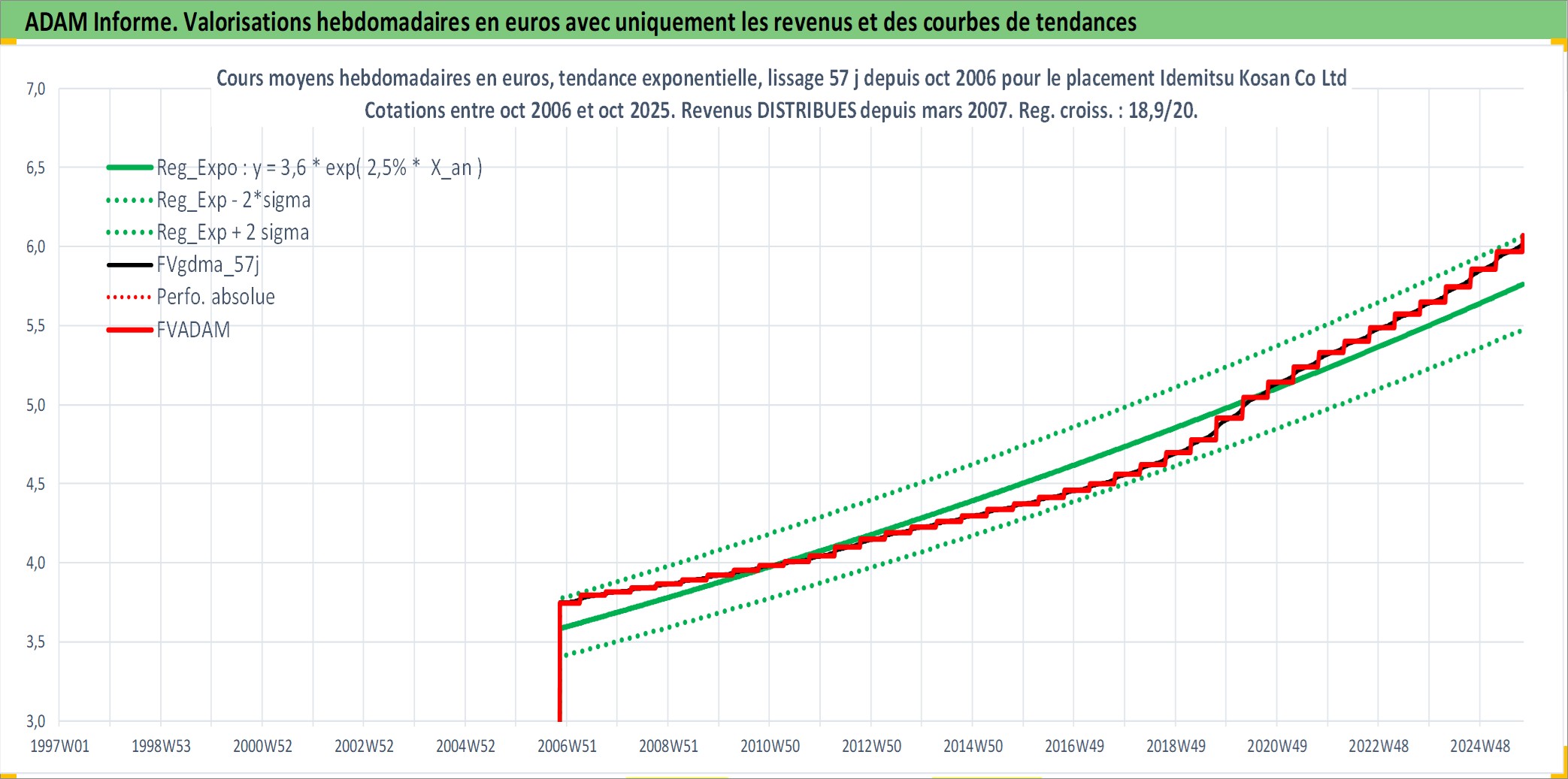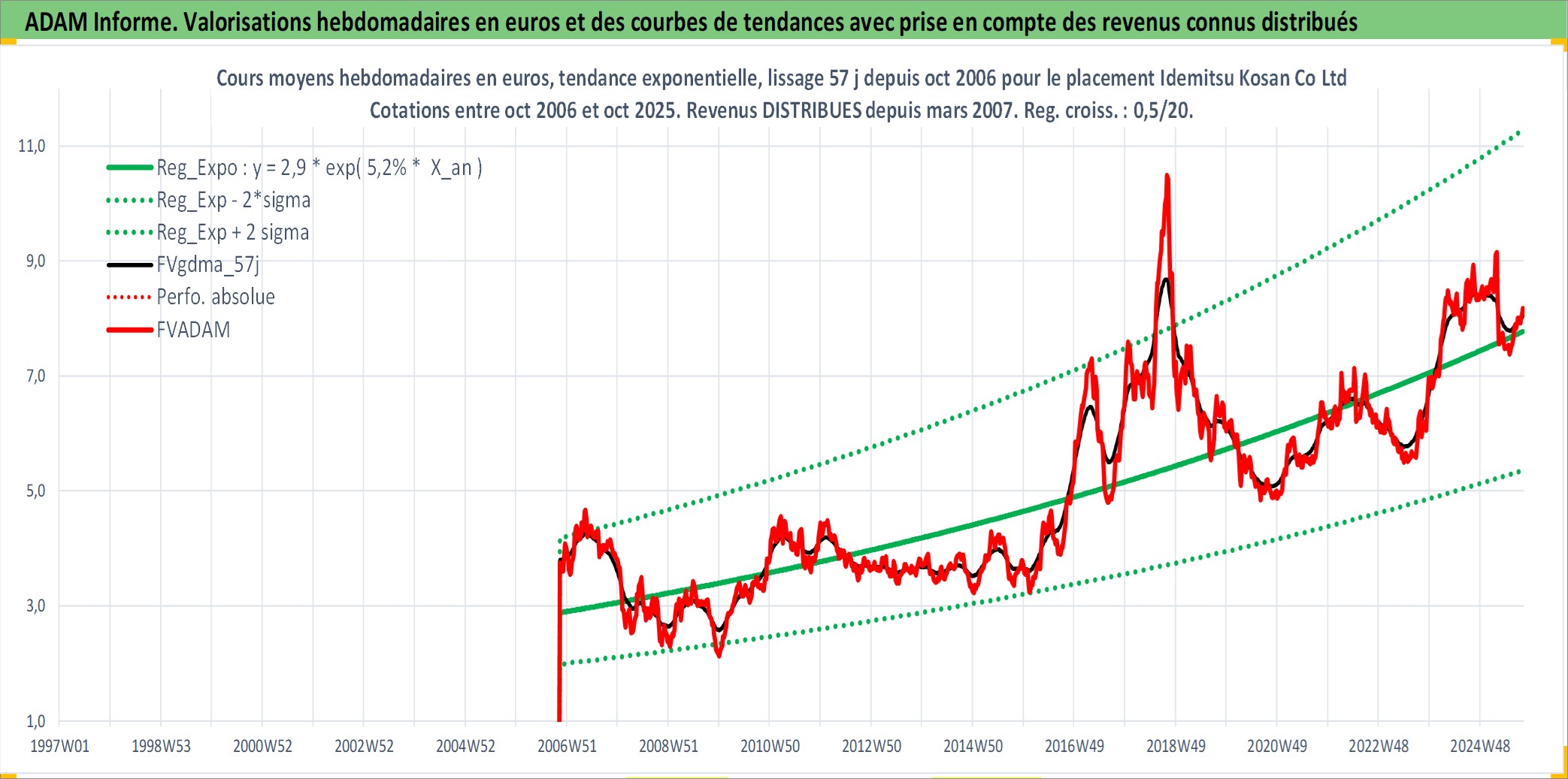 Site dédié aux investisseursPage dédiée sur site financeAnalyse des valorisations hebdomadaires de l'action Idemitsu Kosan Co Ltd. Cet actif est cote en JPY. Les valorisations sont en contrevaleur EURO et couvrent les semaines 2006W44 a 2025W40. Les revenus de cet actif financier sont pris en compte depuis la semaine 2007W13. La note ESG de cet actif n'est pas connue.