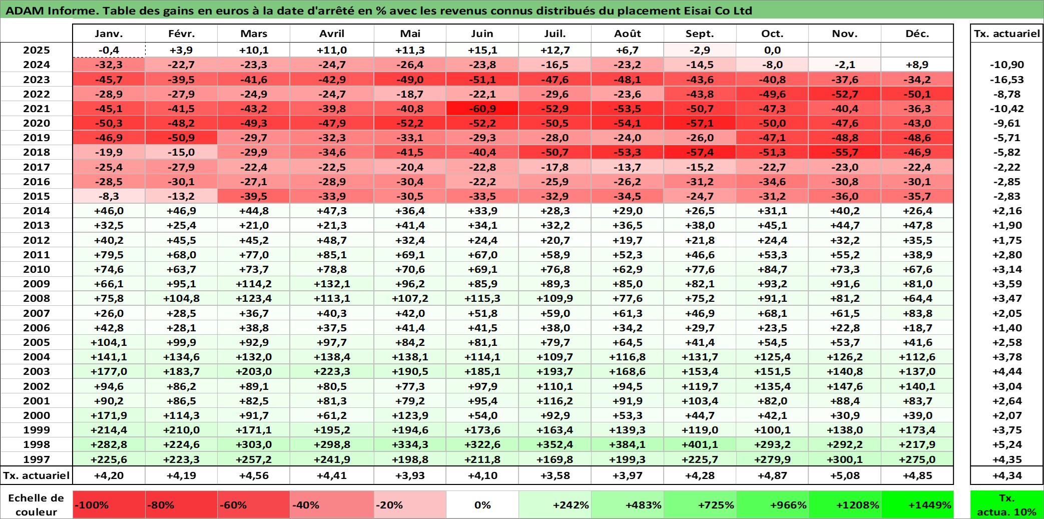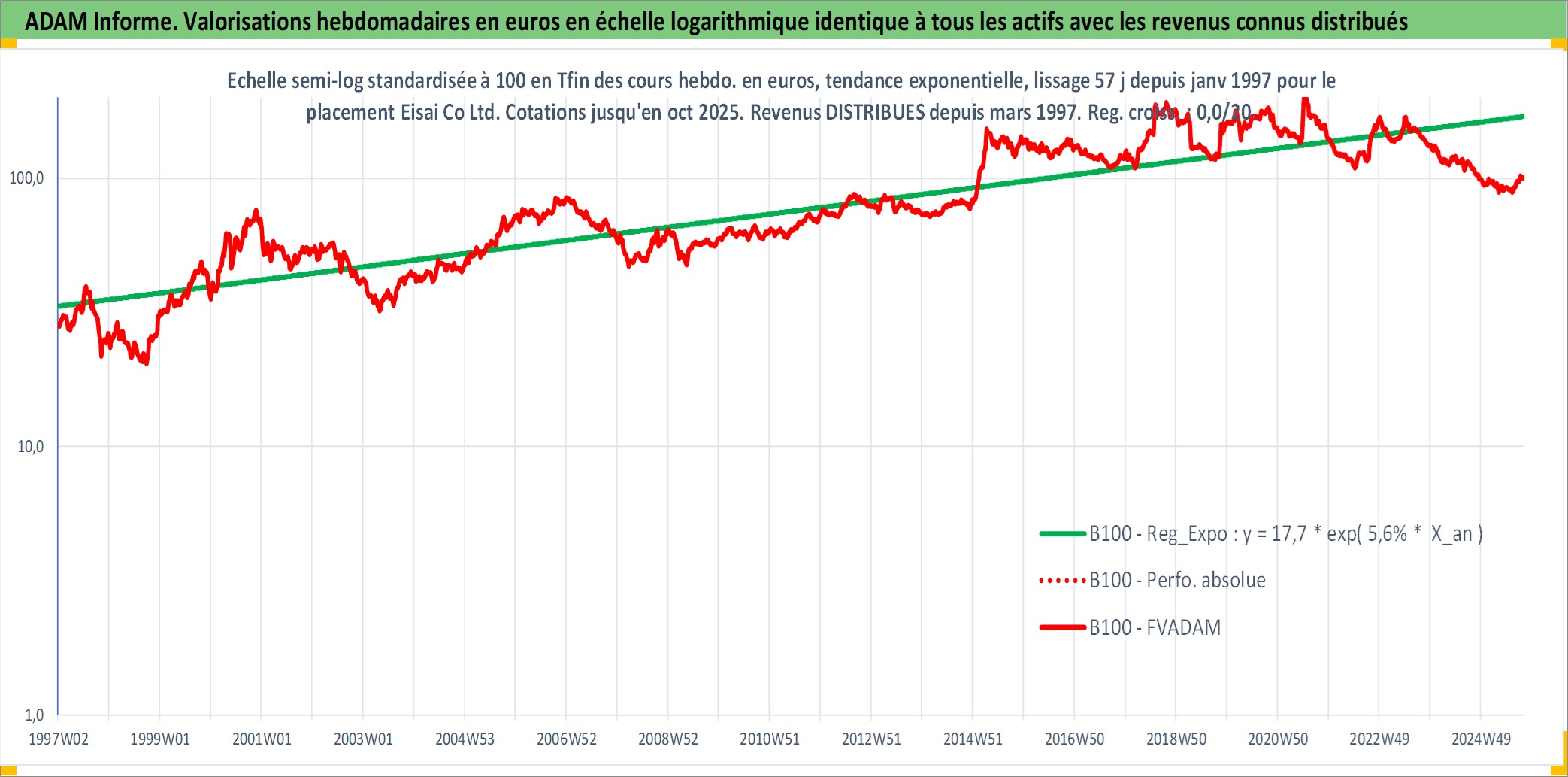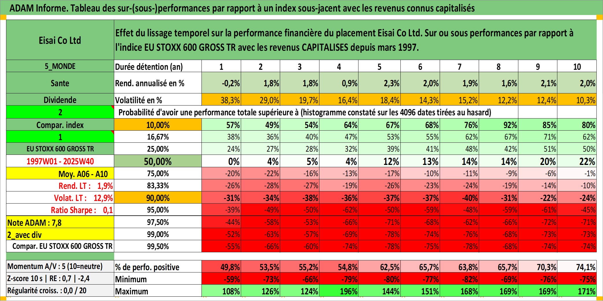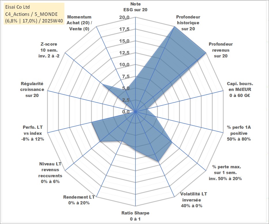 Site dédié aux investisseursPage dédiée sur site financeAnalyse des valorisations hebdomadaires de l'action Eisai Co Ltd. Cet actif est cote en JPY. Les valorisations sont en contrevaleur EURO et couvrent les semaines 1997W01 a 2025W40. Les revenus de cet actif financier sont pris en compte depuis la semaine 1997W13. La note globale ESG de cet actif est estimee a 7.0 (apres rebasage entre 0 et 20).