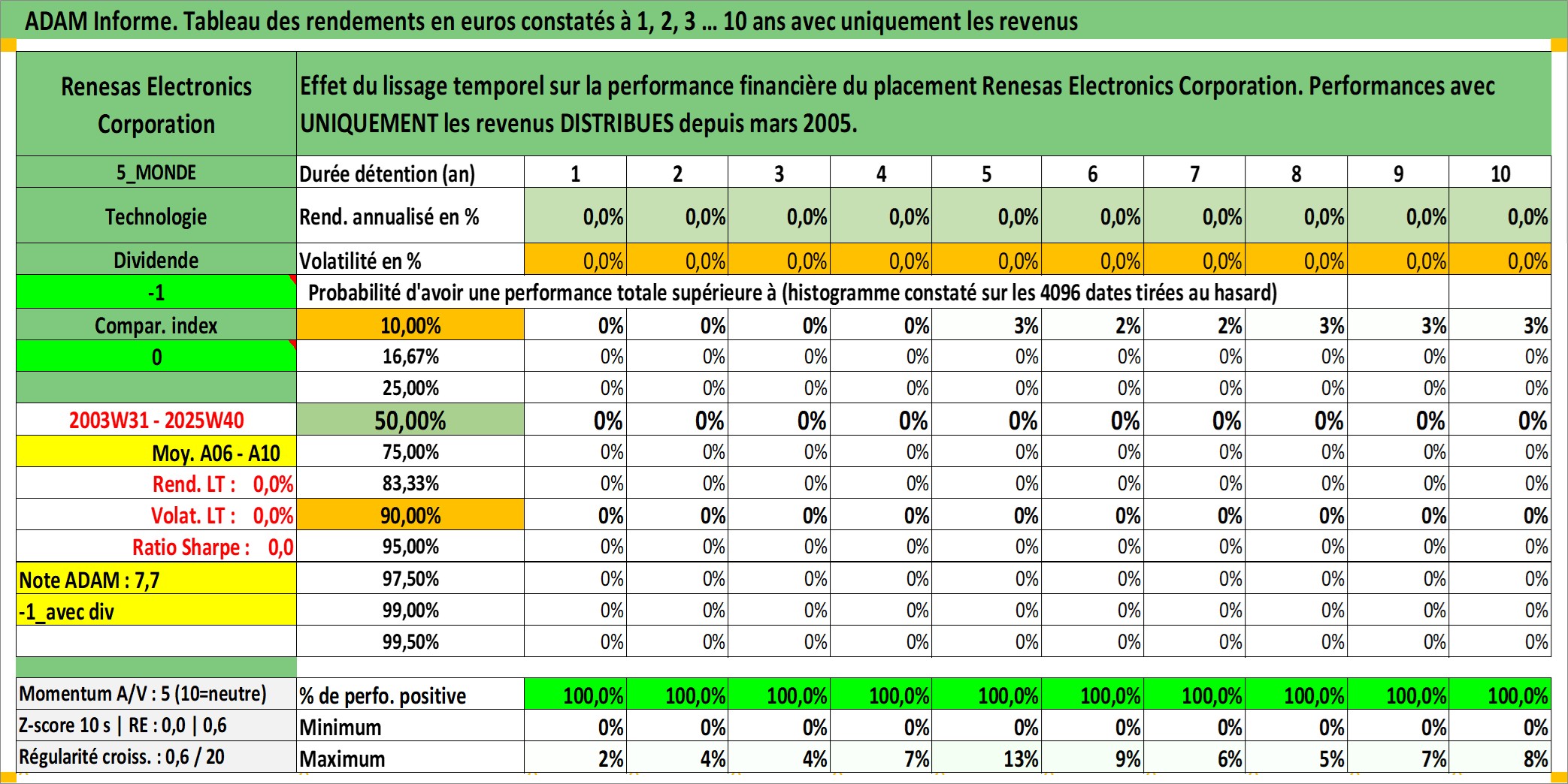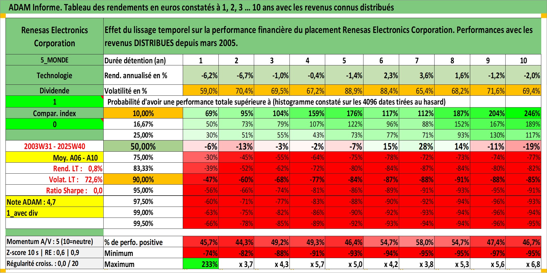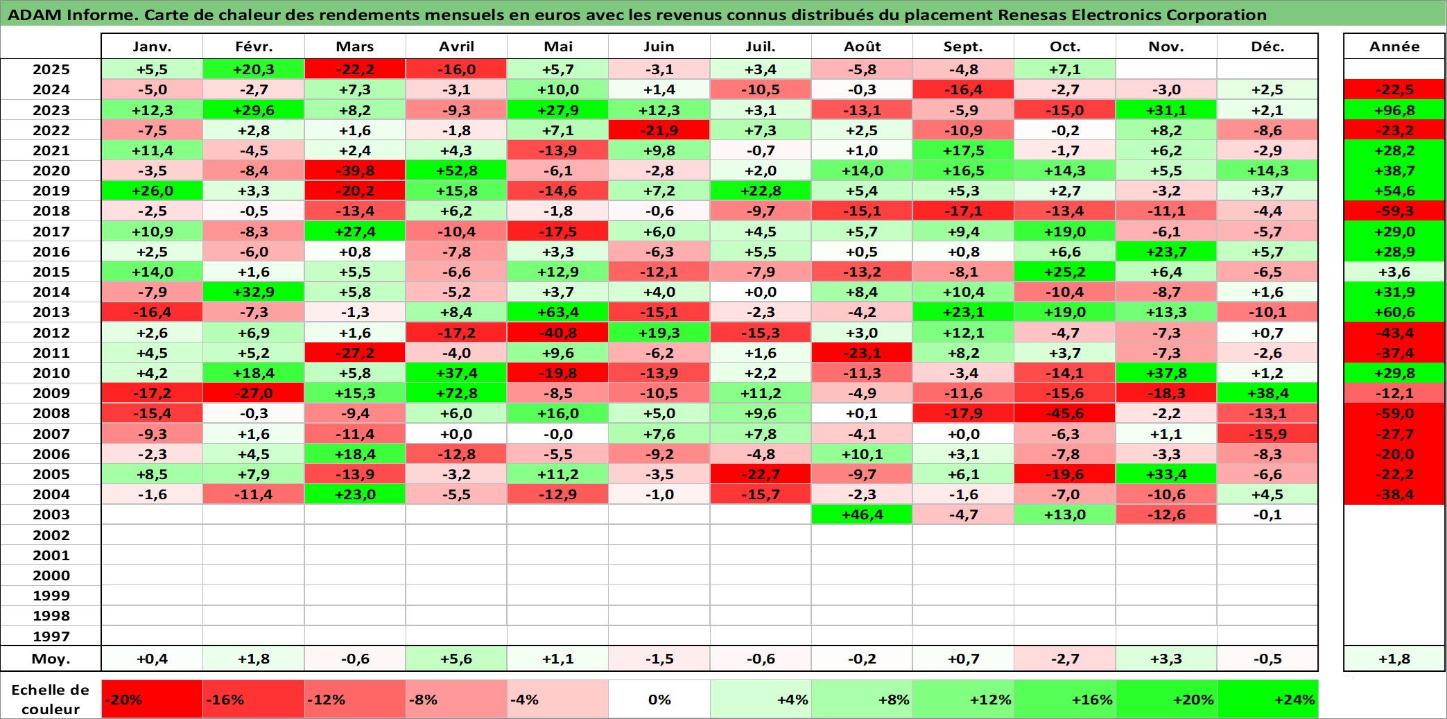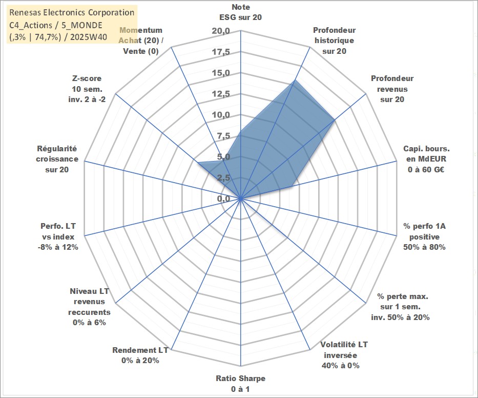 Site dédié aux investisseursPage dédiée sur site financeAnalyse des valorisations hebdomadaires de l'action Renesas Electronics Corporation. Cet actif est cote en JPY. Les valorisations sont en contrevaleur EURO et couvrent les semaines 2003W31 a 2025W40. Les revenus de cet actif financier sont pris en compte depuis la semaine 2005W13. La note globale ESG de cet actif est estimee a 8.0 (apres rebasage entre 0 et 20).
