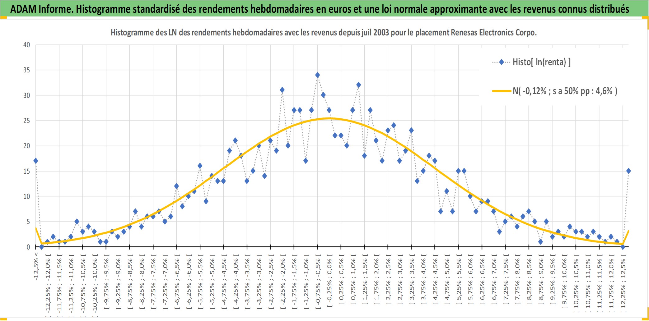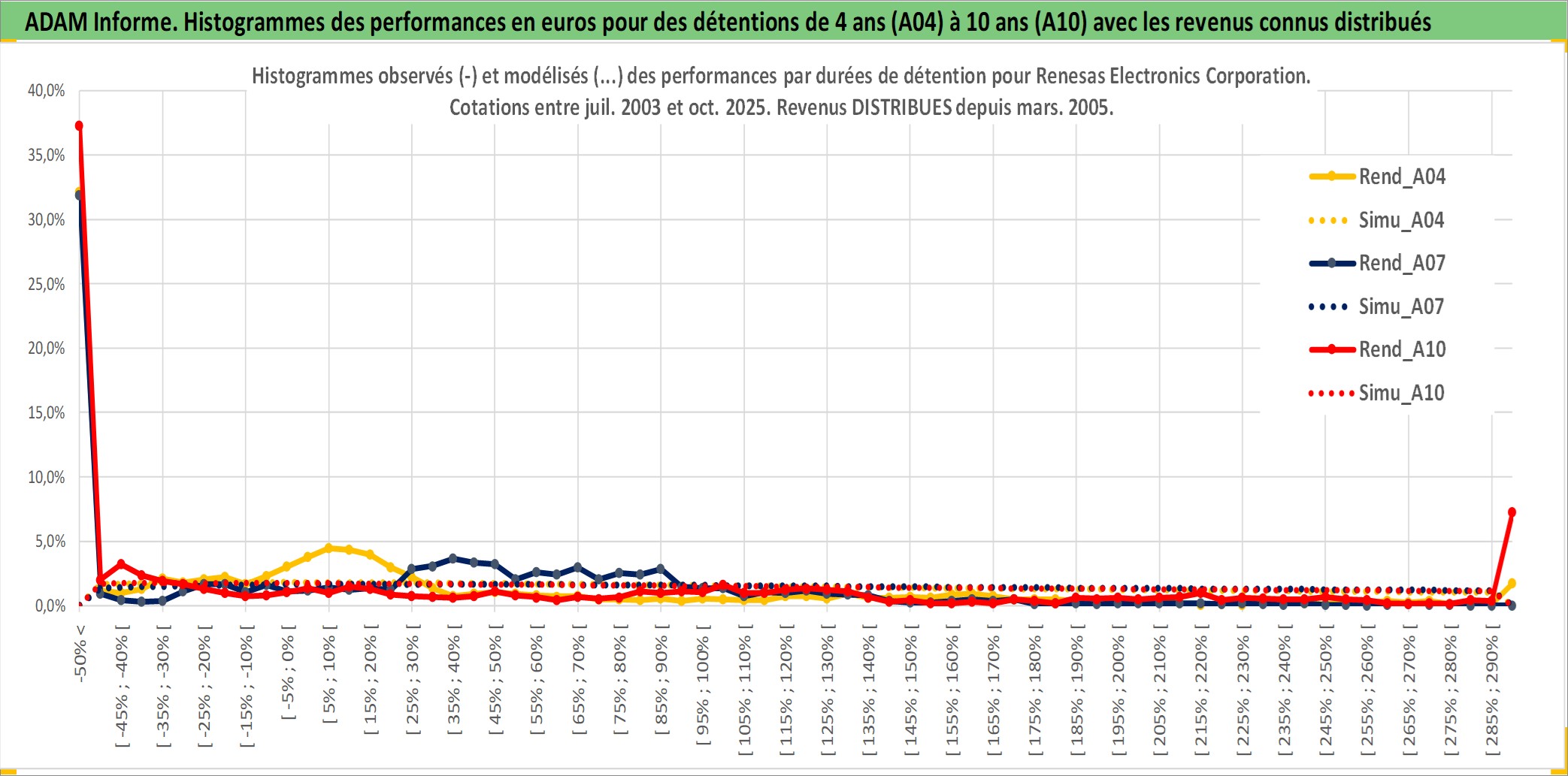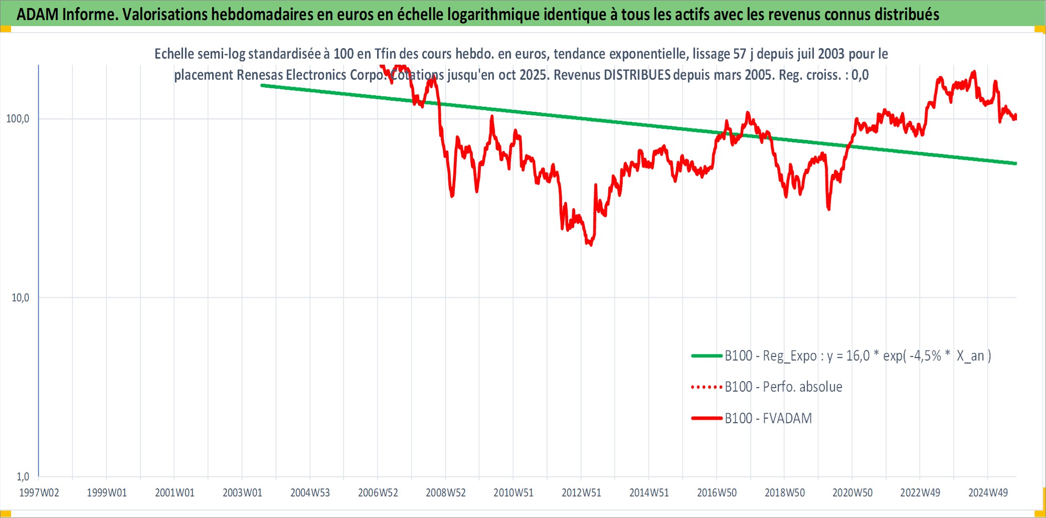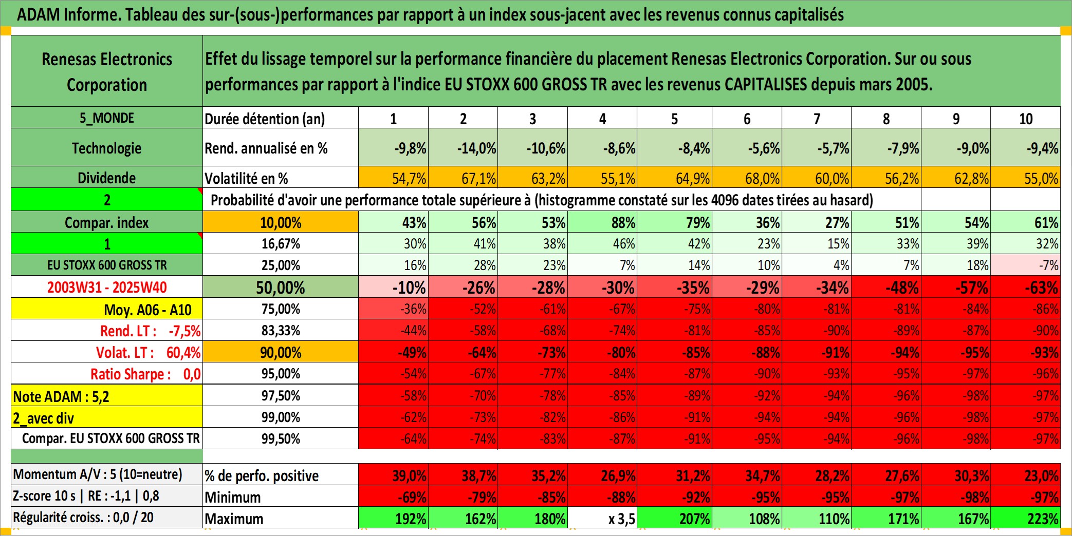 Site dédié aux investisseursPage dédiée sur site financeAnalyse des valorisations hebdomadaires de l'action Renesas Electronics Corporation. Cet actif est cote en JPY. Les valorisations sont en contrevaleur EURO et couvrent les semaines 2003W31 a 2025W40. Les revenus de cet actif financier sont pris en compte depuis la semaine 2005W13. La note globale ESG de cet actif est estimee a 8.0 (apres rebasage entre 0 et 20).