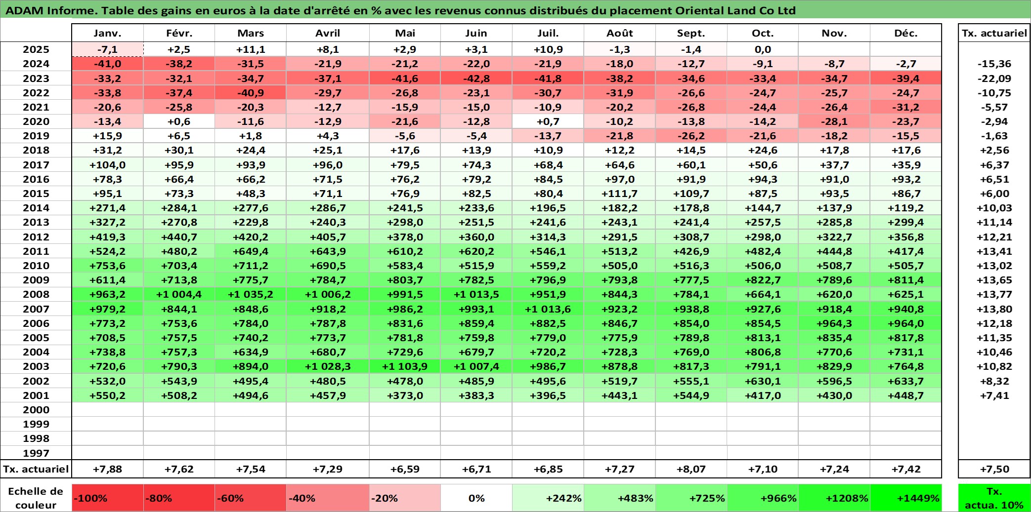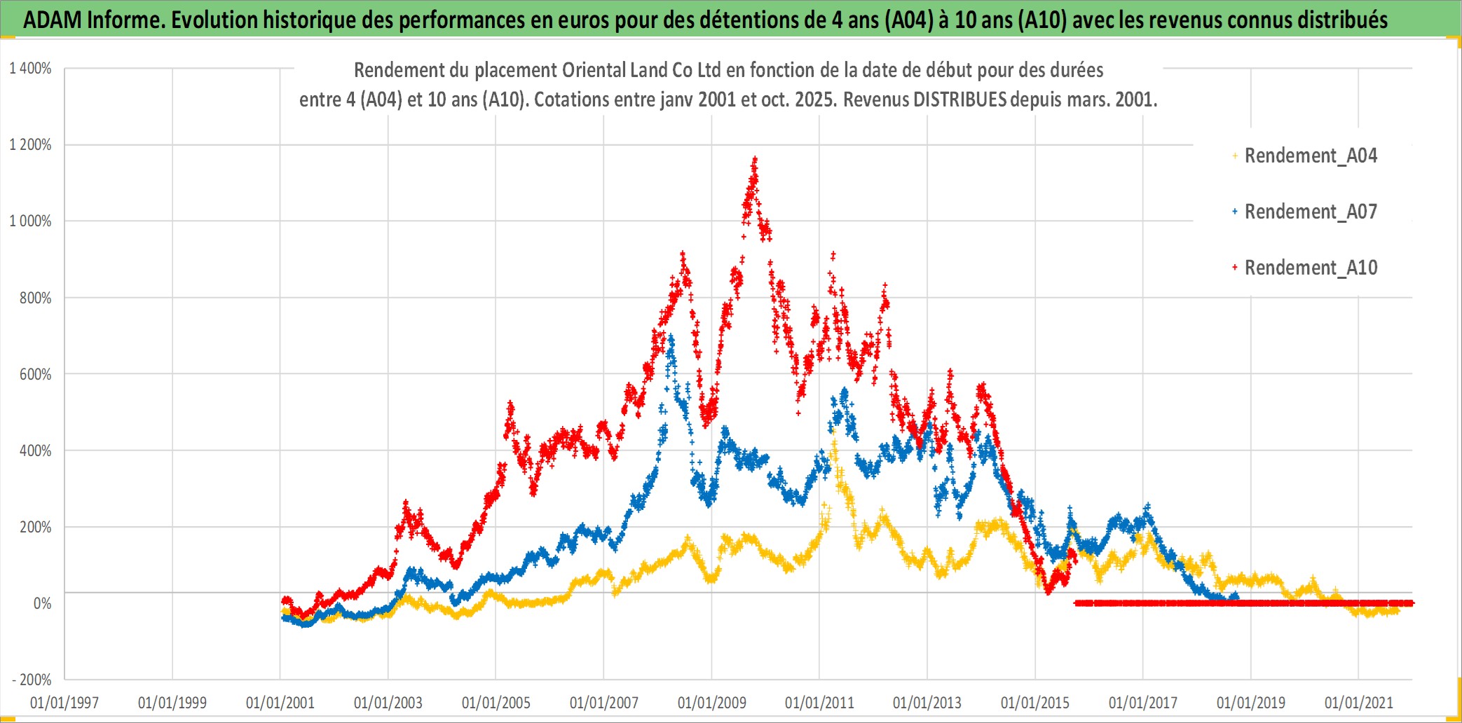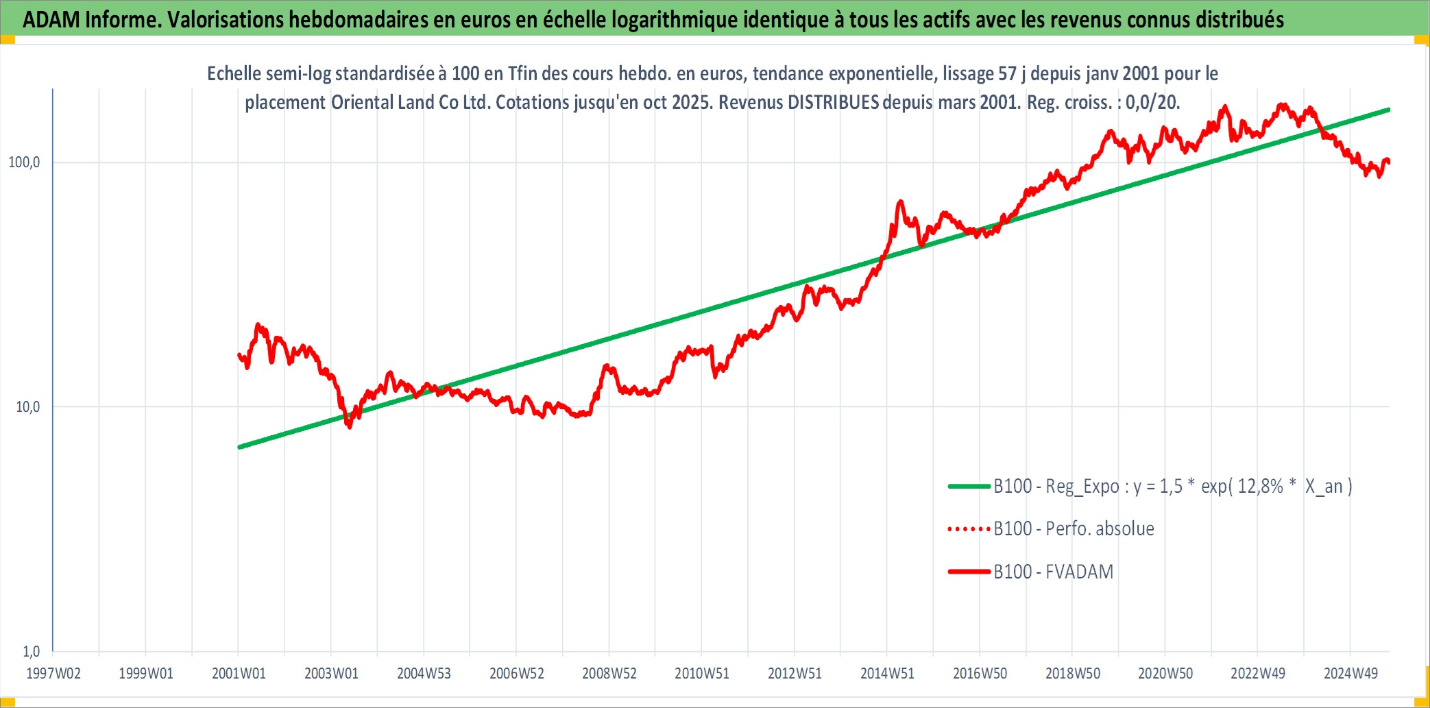 Site dédié aux investisseursPage dédiée sur site financeAnalyse des valorisations hebdomadaires de l'action Oriental Land Co Ltd. Cet actif est cote en JPY. Les valorisations sont en contrevaleur EURO et couvrent les semaines 2001W02 a 2025W40. Les revenus de cet actif financier sont pris en compte depuis la semaine 2001W13. La note globale ESG de cet actif est estimee a 9.0 (apres rebasage entre 0 et 20).