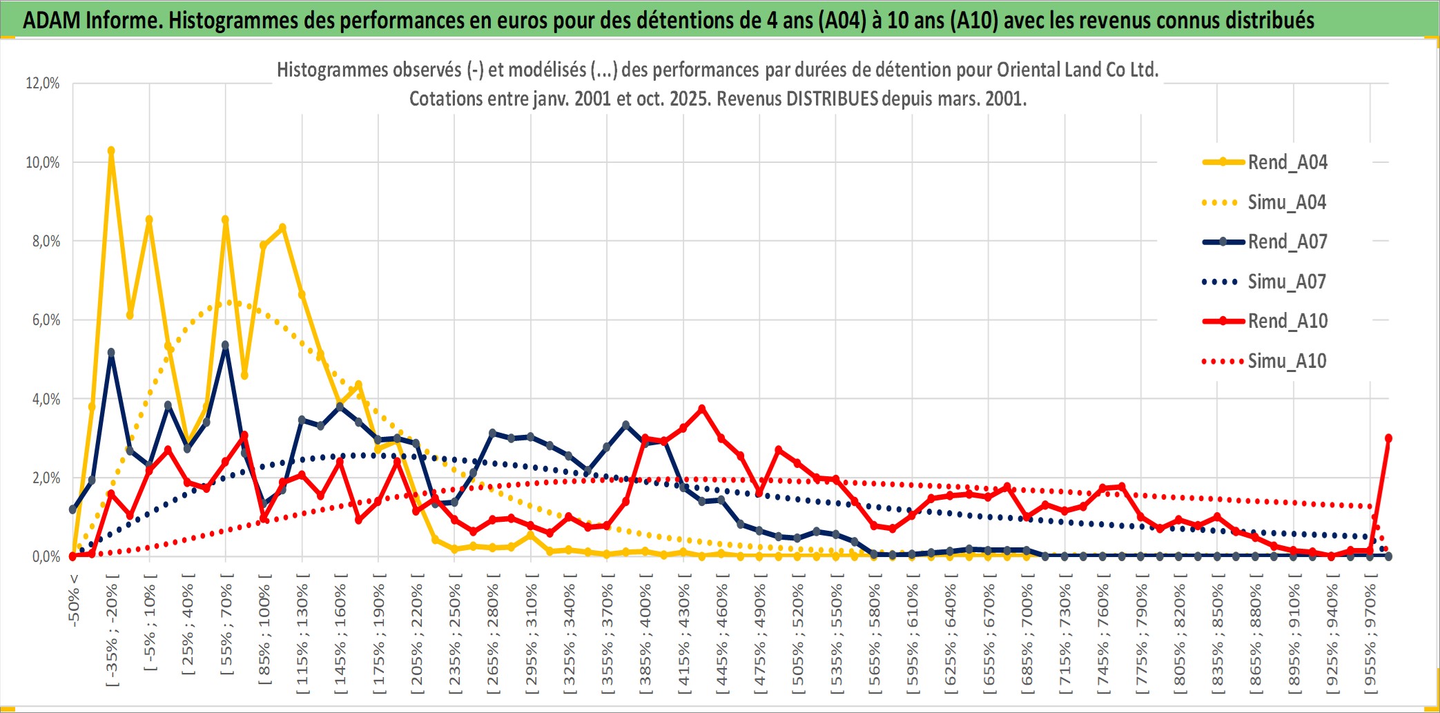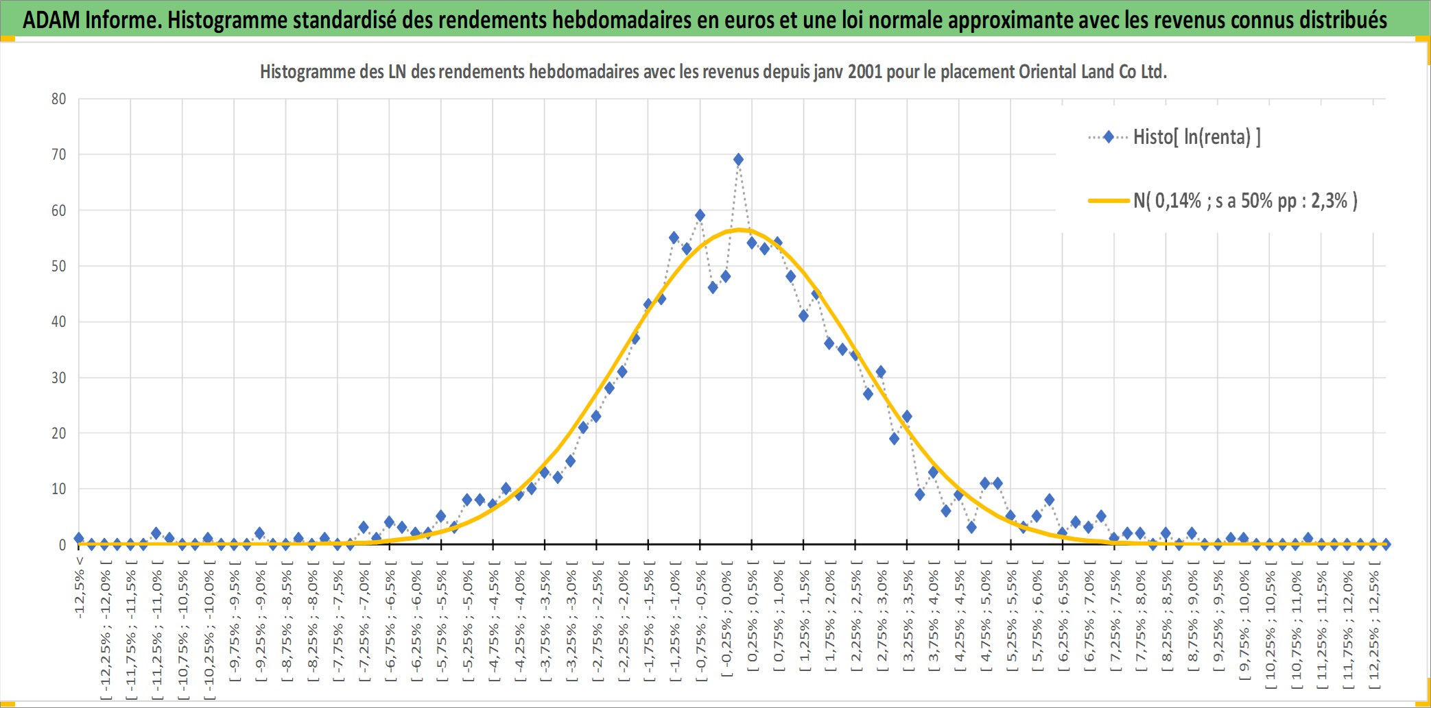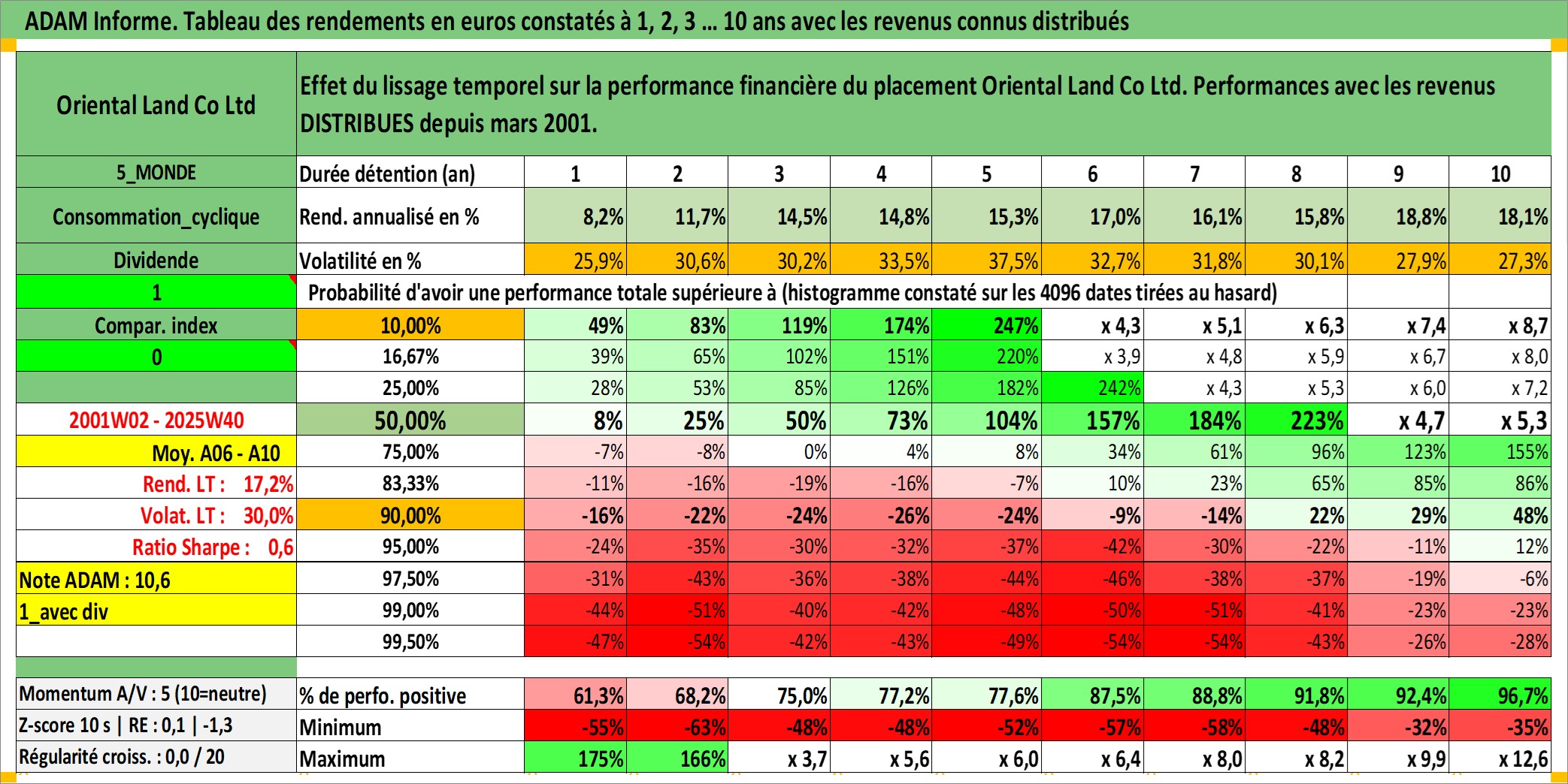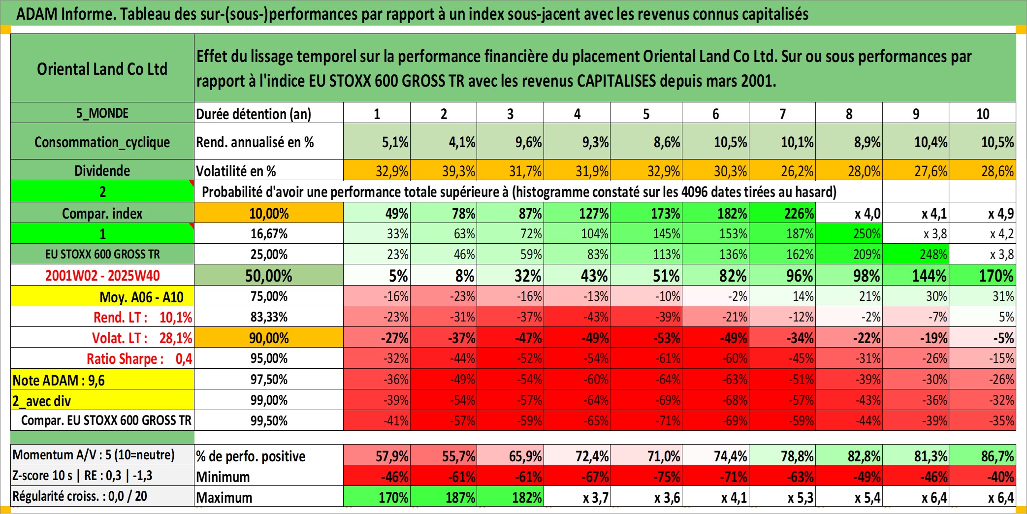 Site dédié aux investisseursPage dédiée sur site financeAnalyse des valorisations hebdomadaires de l'action Oriental Land Co Ltd. Cet actif est cote en JPY. Les valorisations sont en contrevaleur EURO et couvrent les semaines 2001W02 a 2025W40. Les revenus de cet actif financier sont pris en compte depuis la semaine 2001W13. La note globale ESG de cet actif est estimee a 9.0 (apres rebasage entre 0 et 20).
