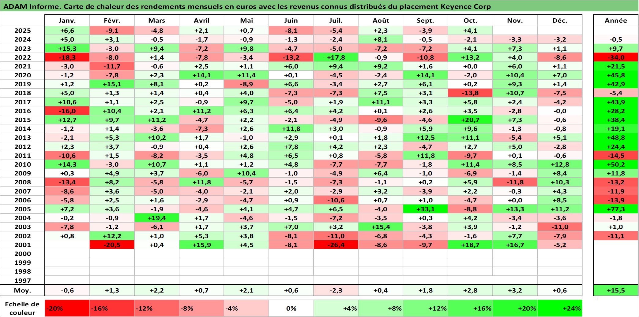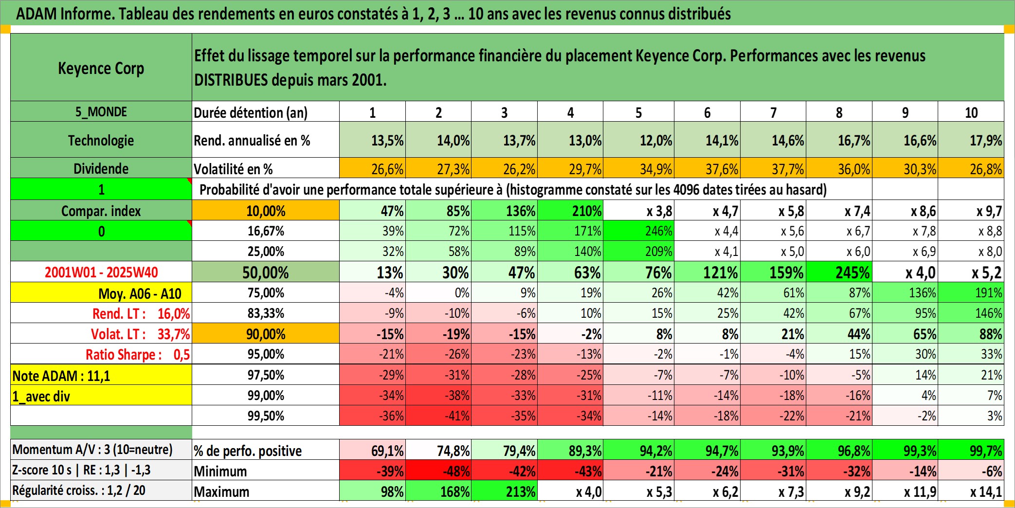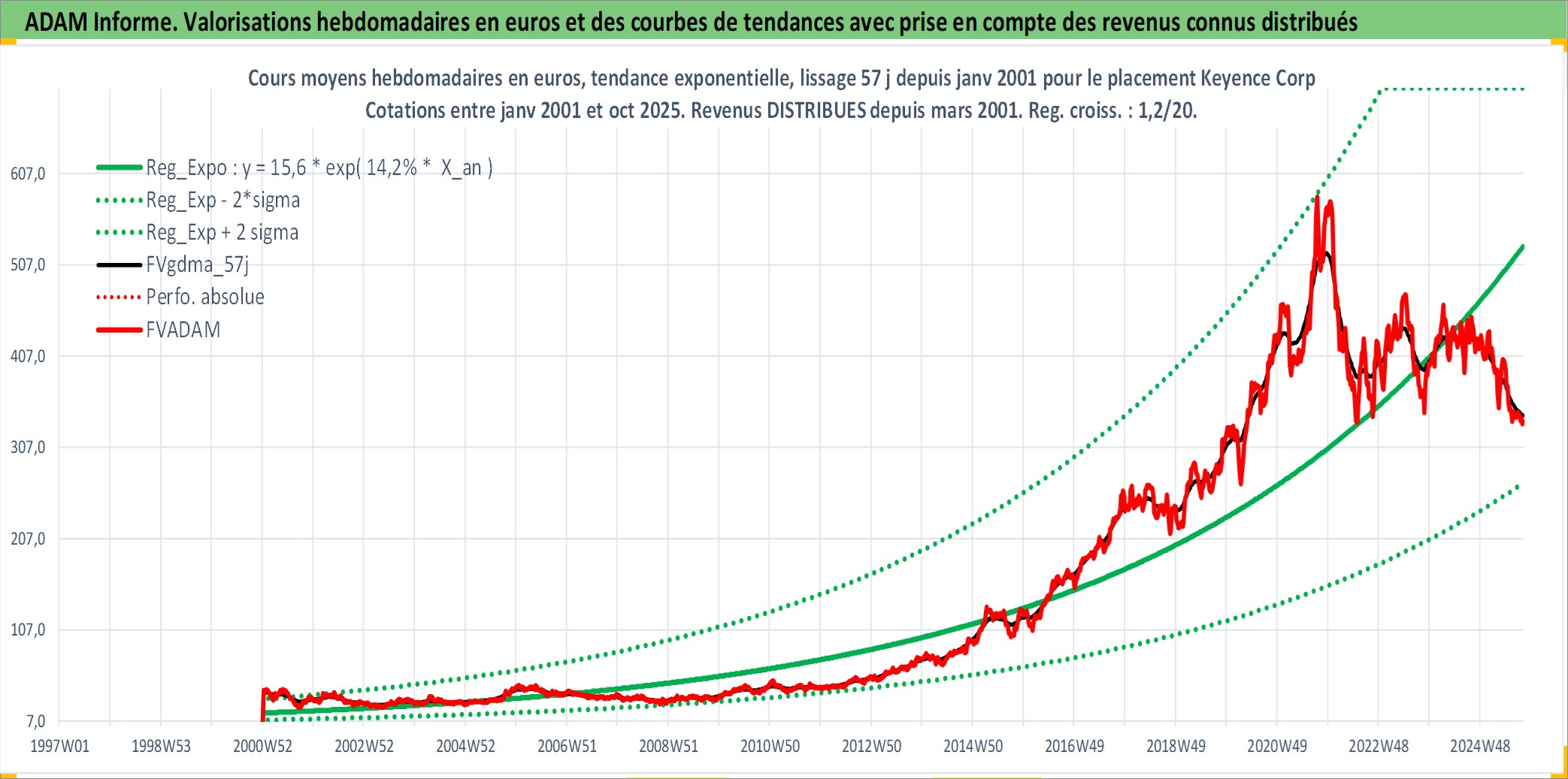 Site dédié aux investisseursPage dédiée sur site financeAnalyse des valorisations hebdomadaires de l'action Keyence Corp. Cet actif est cote en JPY. Les valorisations sont en contrevaleur EURO et couvrent les semaines 2001W01 a 2025W40. Les revenus de cet actif financier sont pris en compte depuis la semaine 2001W11. La note globale ESG de cet actif est estimee a 15.0 (apres rebasage entre 0 et 20).