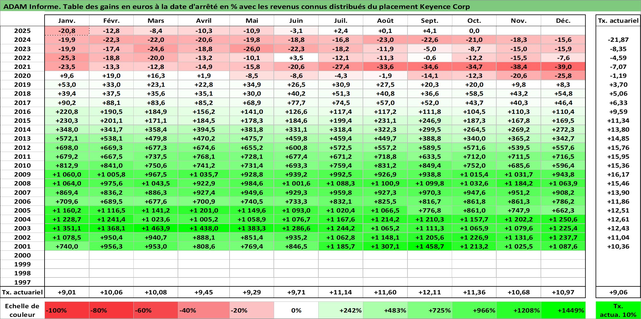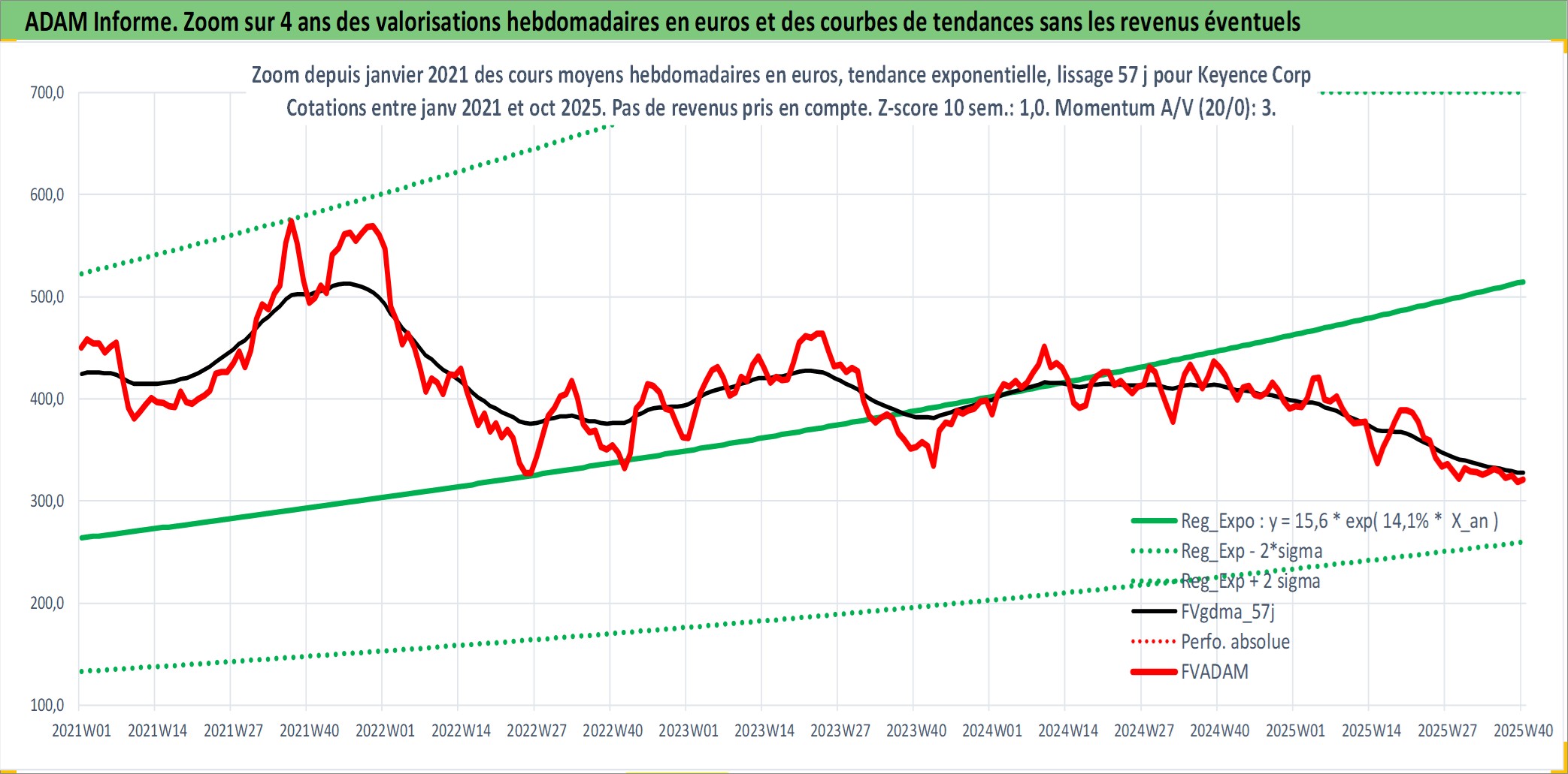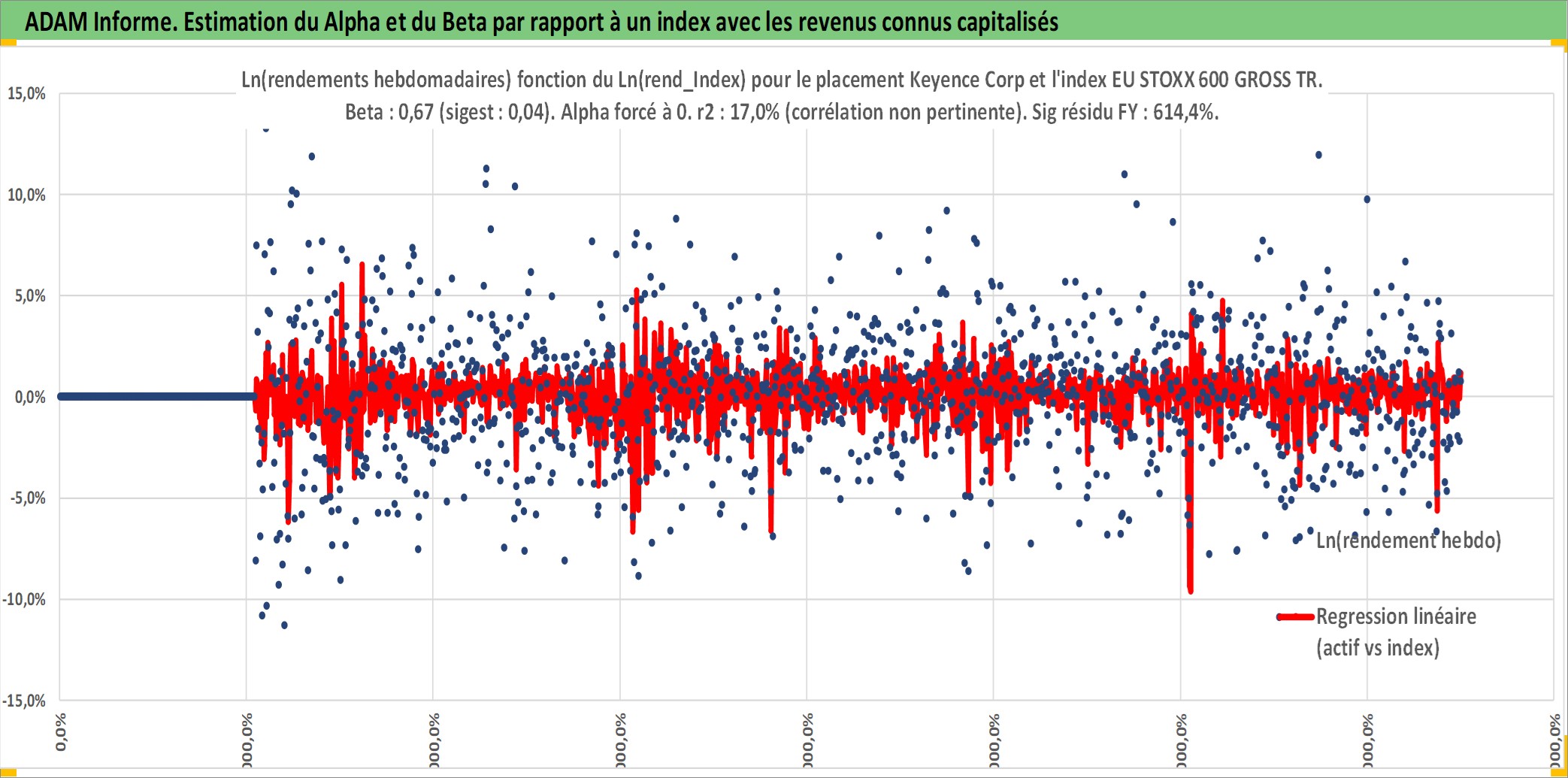 Site dédié aux investisseursPage dédiée sur site financeAnalyse des valorisations hebdomadaires de l'action Keyence Corp. Cet actif est cote en JPY. Les valorisations sont en contrevaleur EURO et couvrent les semaines 2001W01 a 2025W40. Les revenus de cet actif financier sont pris en compte depuis la semaine 2001W11. La note globale ESG de cet actif est estimee a 15.0 (apres rebasage entre 0 et 20).