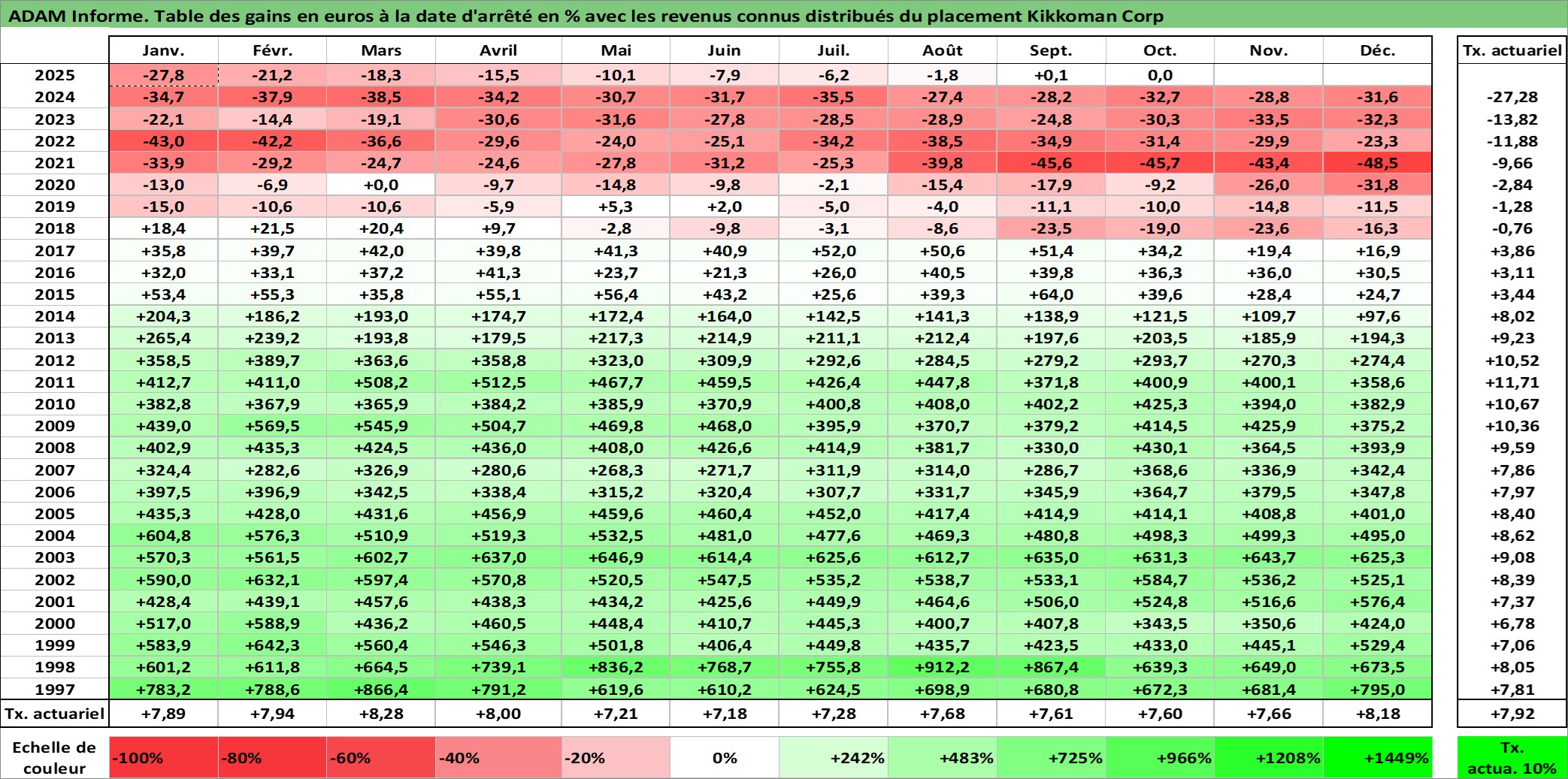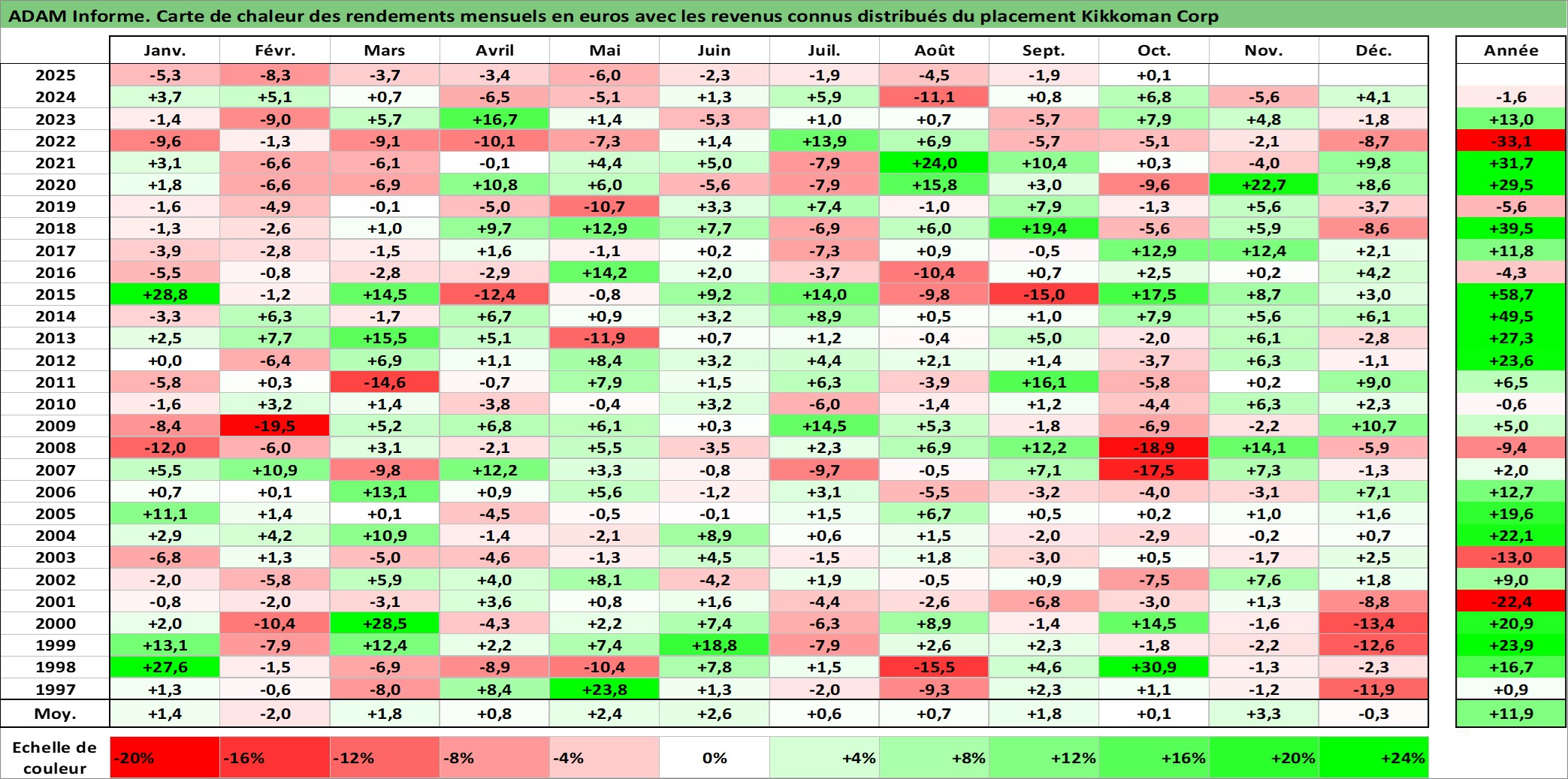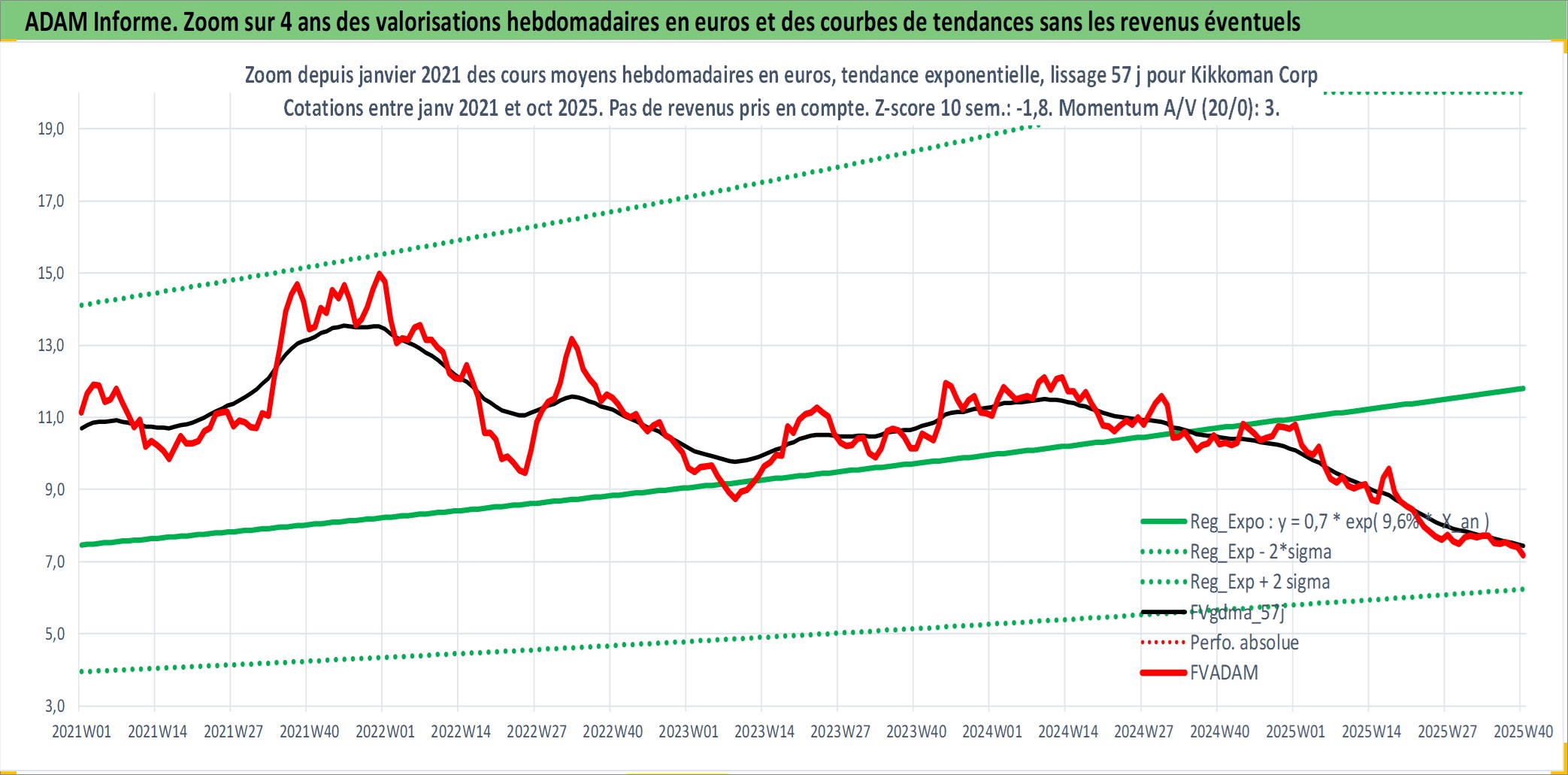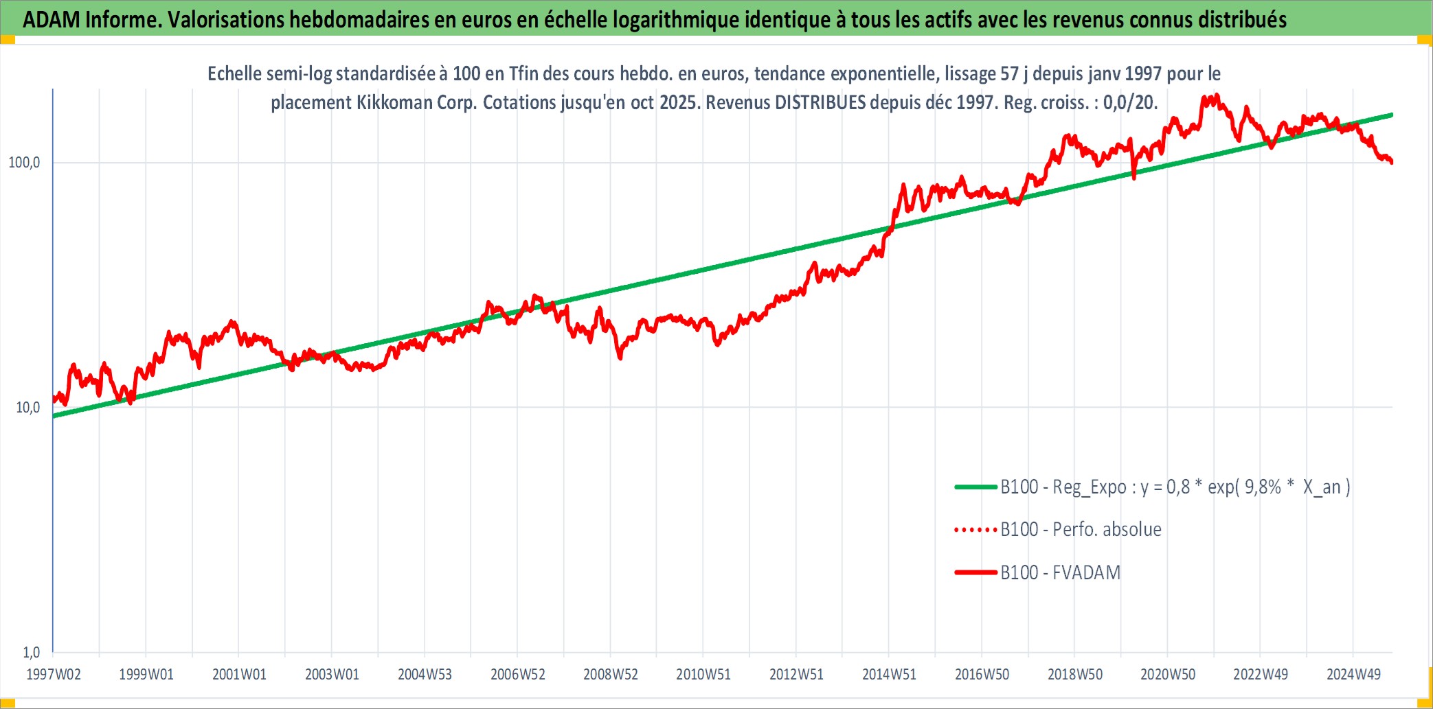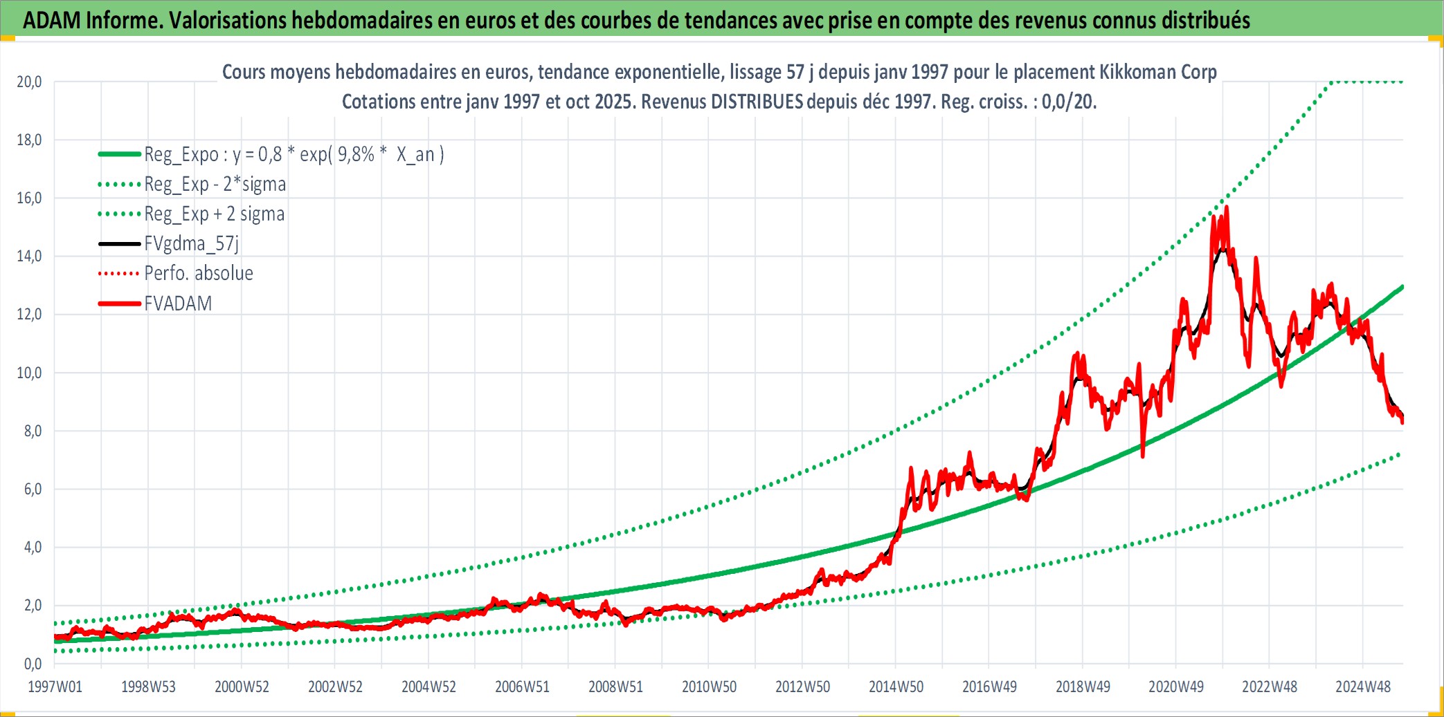 Site dédié aux investisseursPage dédiée sur site financeAnalyse des valorisations hebdomadaires de l'action Kikkoman Corp. Cet actif est cote en JPY. Les valorisations sont en contrevaleur EURO et couvrent les semaines 1997W01 a 2025W40. Les revenus de cet actif financier sont pris en compte depuis la semaine 1997W52. La note globale ESG de cet actif est estimee a 3.0 (apres rebasage entre 0 et 20).