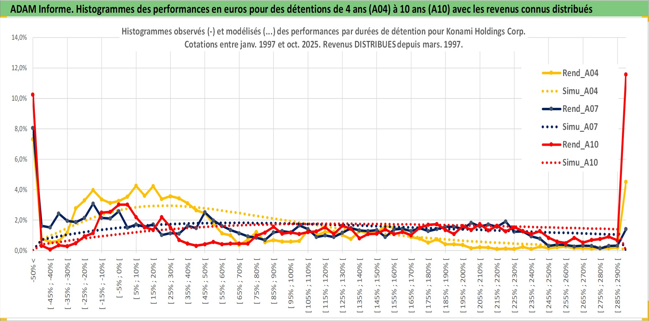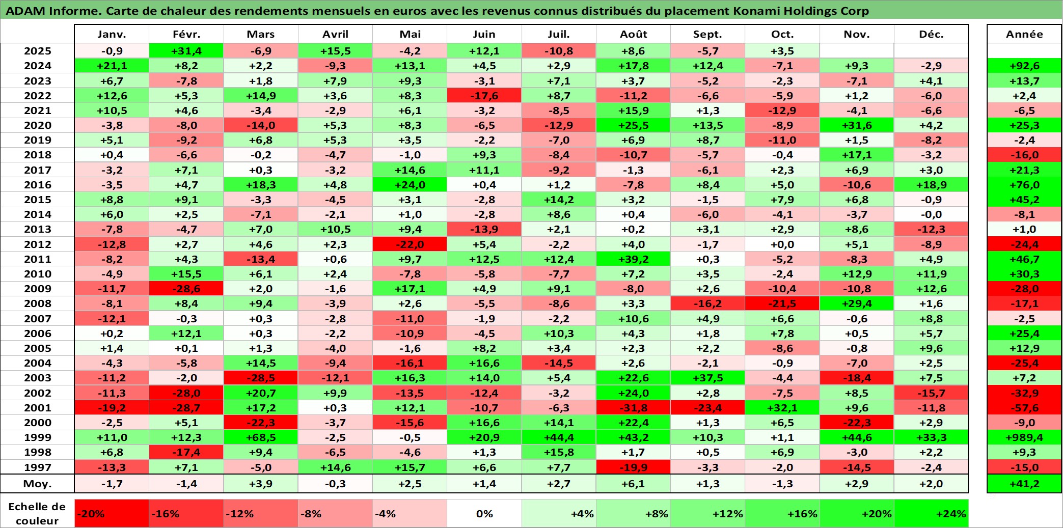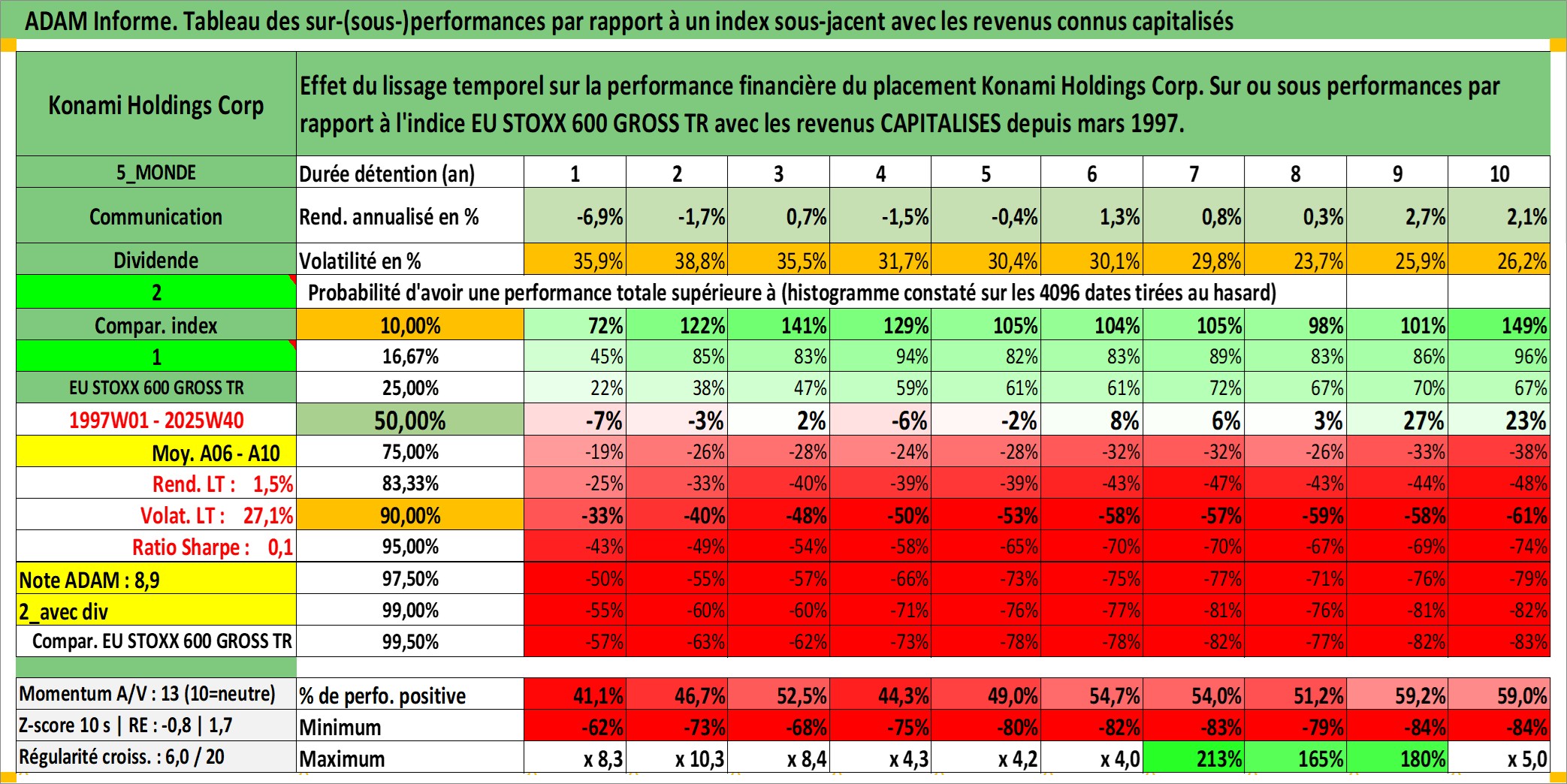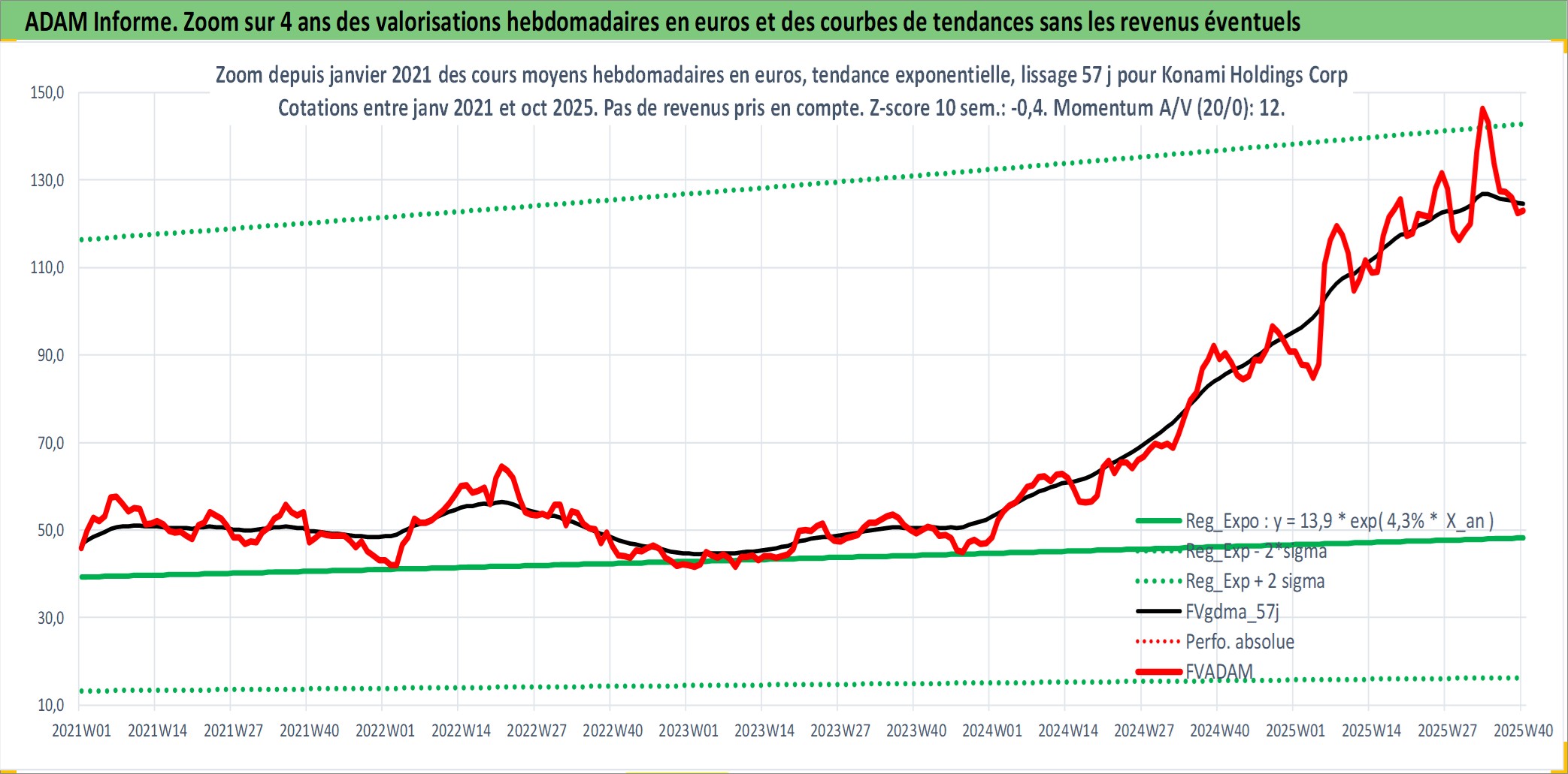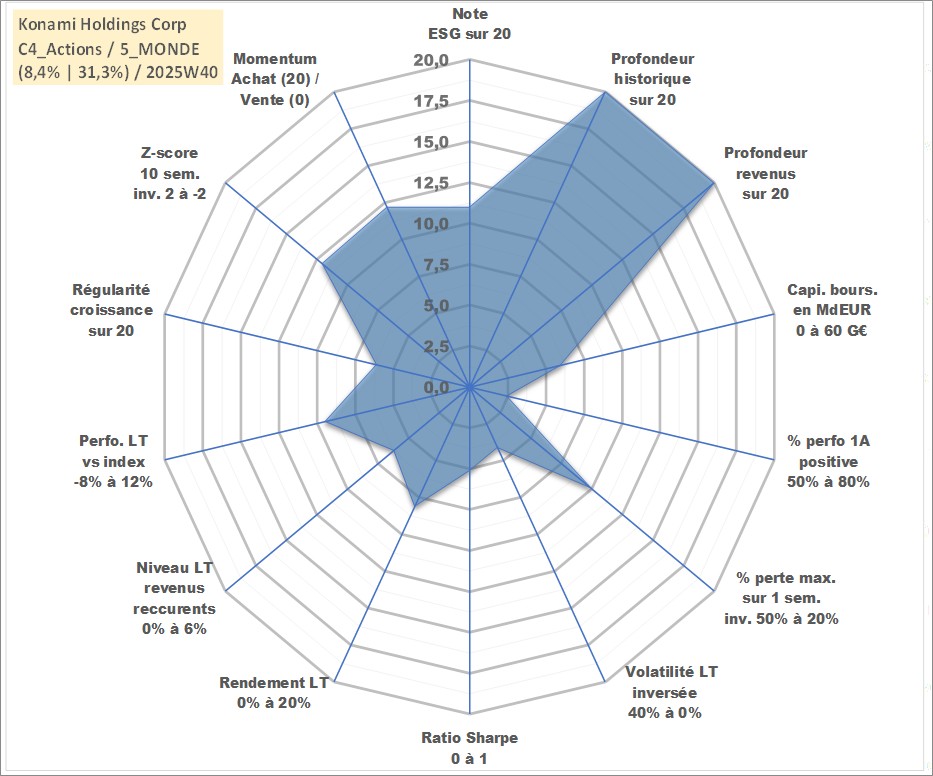 Site dédié aux investisseursPage dédiée sur site financeAnalyse des valorisations hebdomadaires de l'action Konami Holdings Corp. Cet actif est cote en JPY. Les valorisations sont en contrevaleur EURO et couvrent les semaines 1997W01 a 2025W40. Les revenus de cet actif financier sont pris en compte depuis la semaine 1997W13. La note globale ESG de cet actif est estimee a 11.0 (apres rebasage entre 0 et 20).
