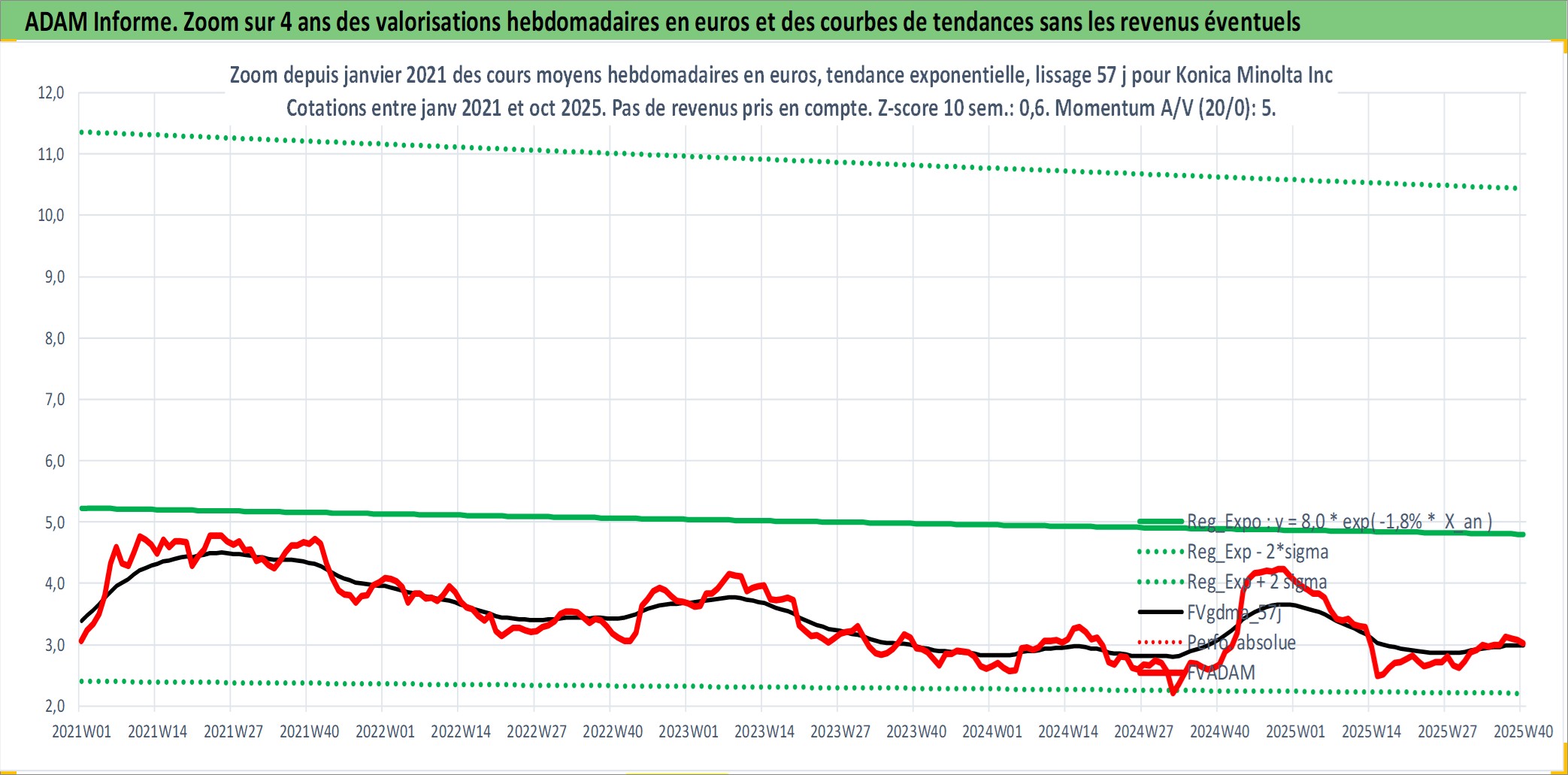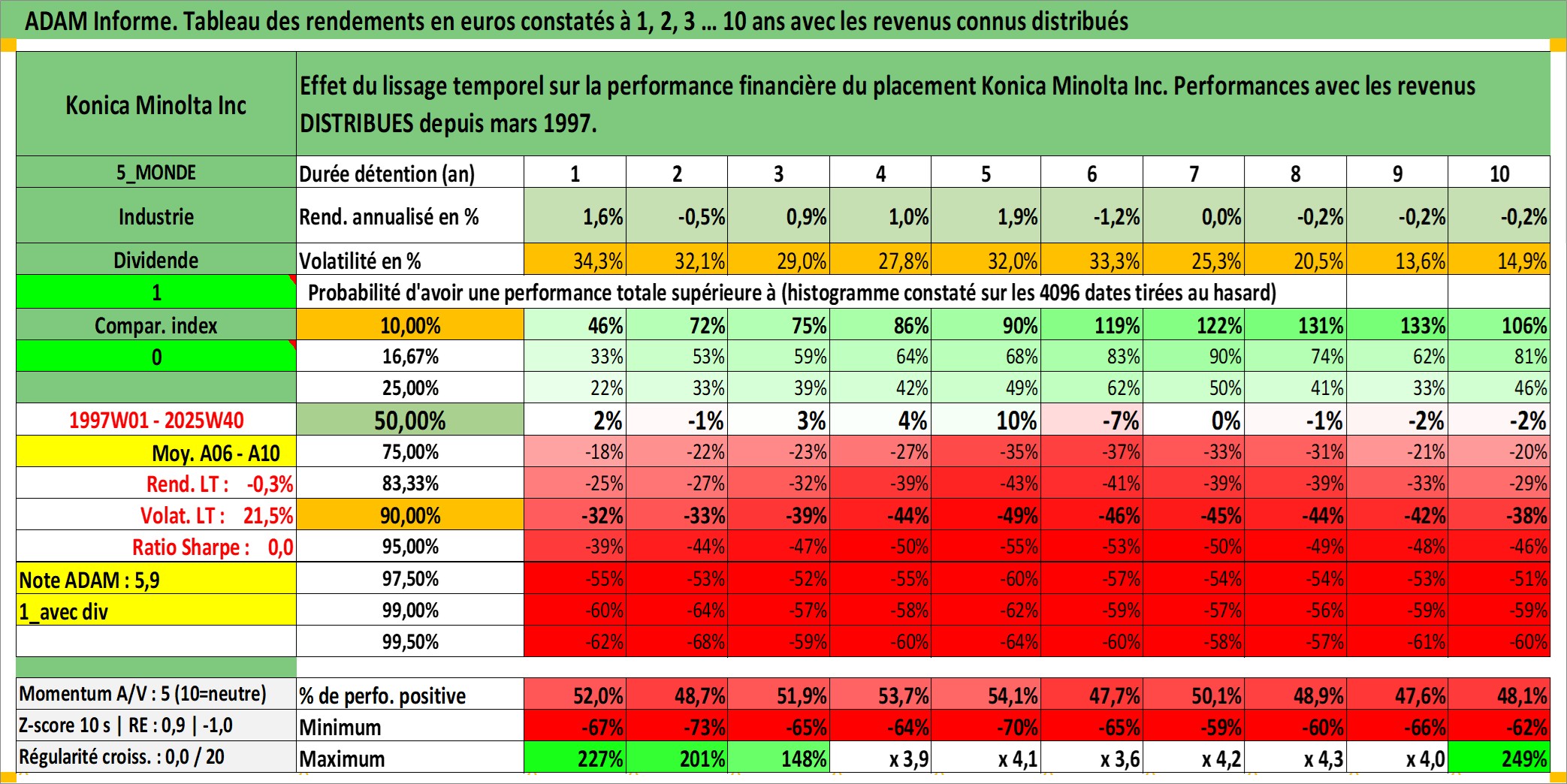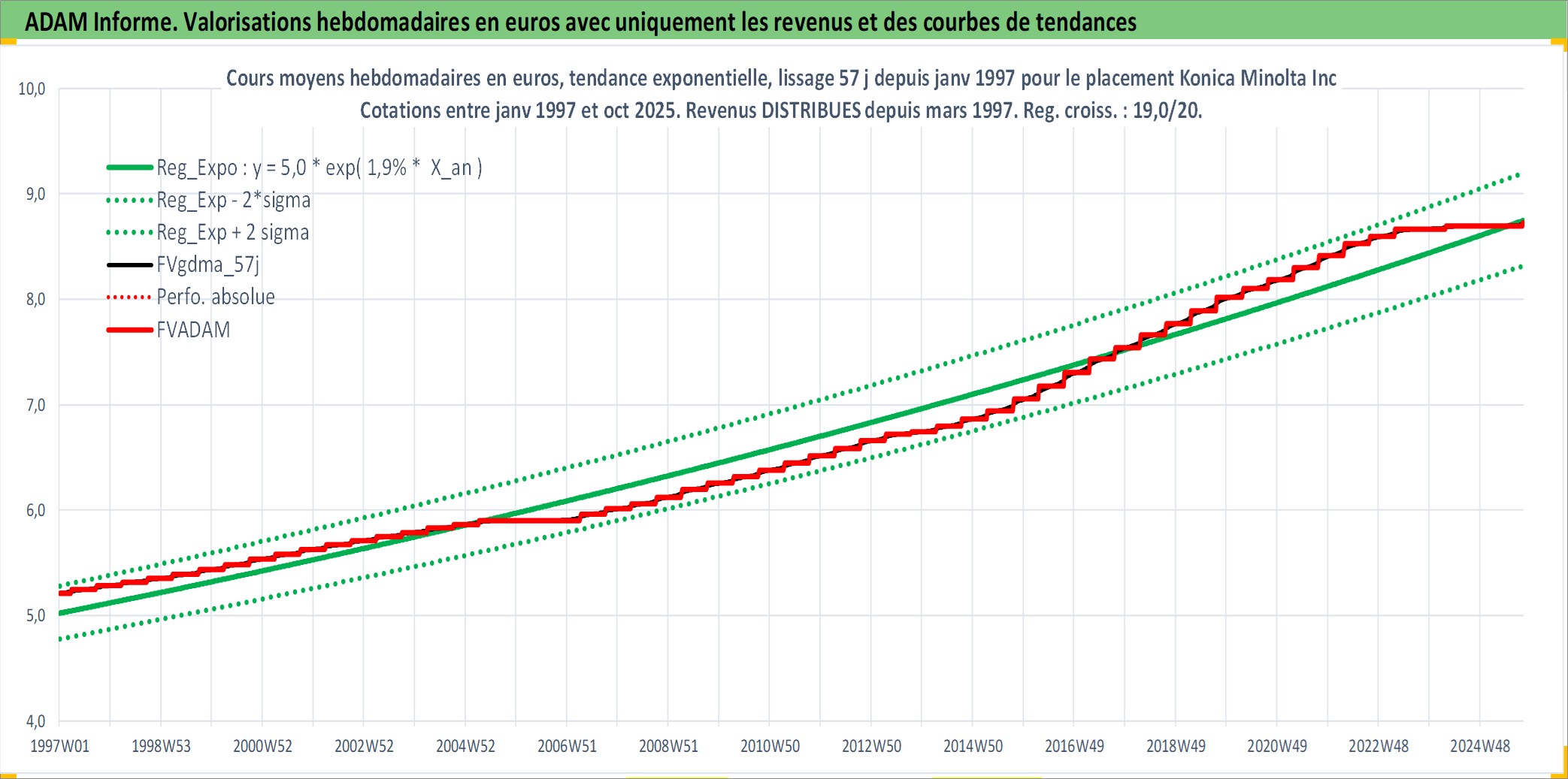Site dédié aux investisseursPage dédiée sur site financeAnalyse des valorisations hebdomadaires de l'action Konica Minolta Inc. Cet actif est cote en JPY. Les valorisations sont en contrevaleur EURO et couvrent les semaines 1997W01 a 2025W40. Les revenus de cet actif financier sont pris en compte depuis la semaine 1997W13. La note ESG de cet actif n'est pas connue.