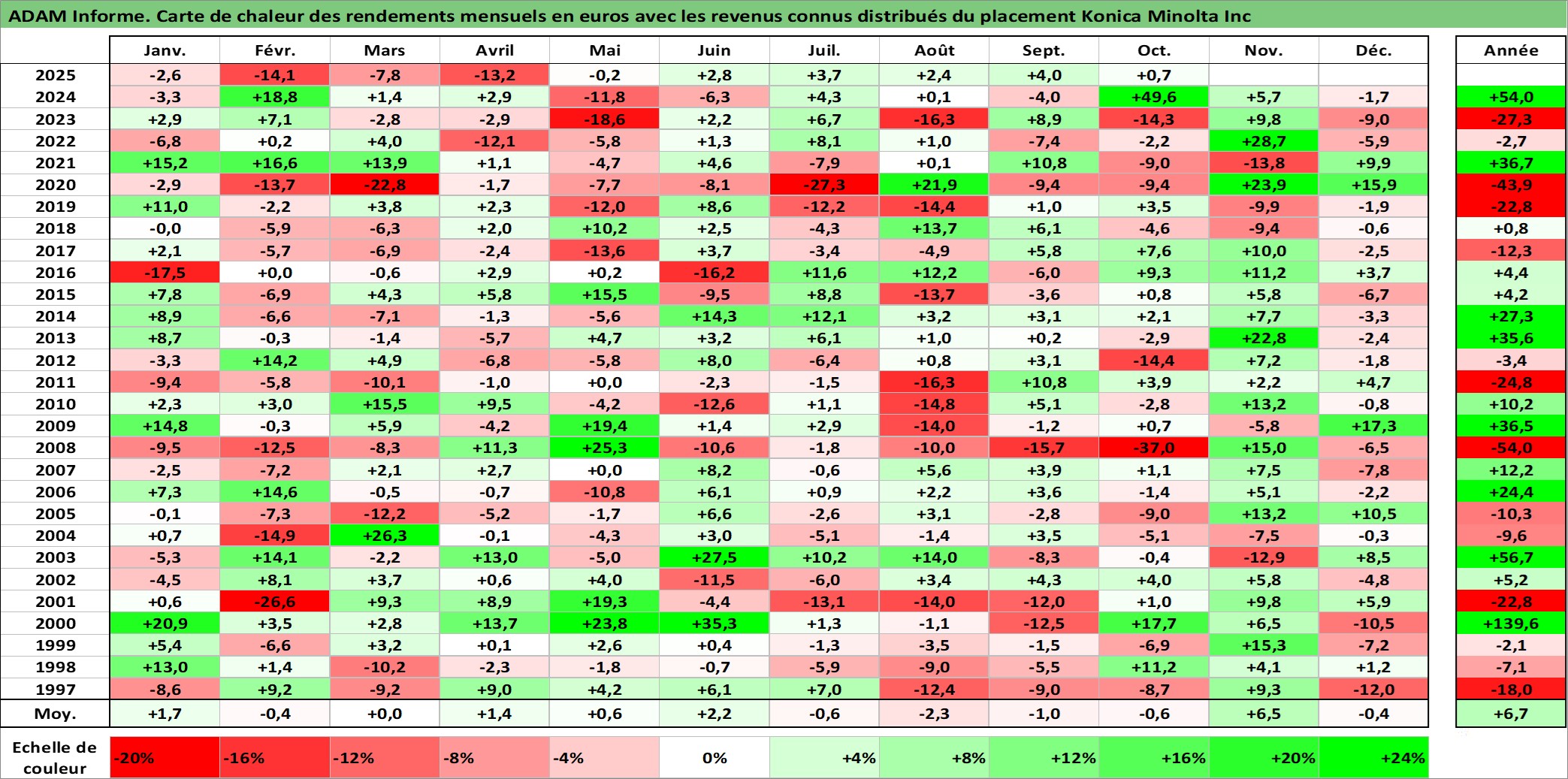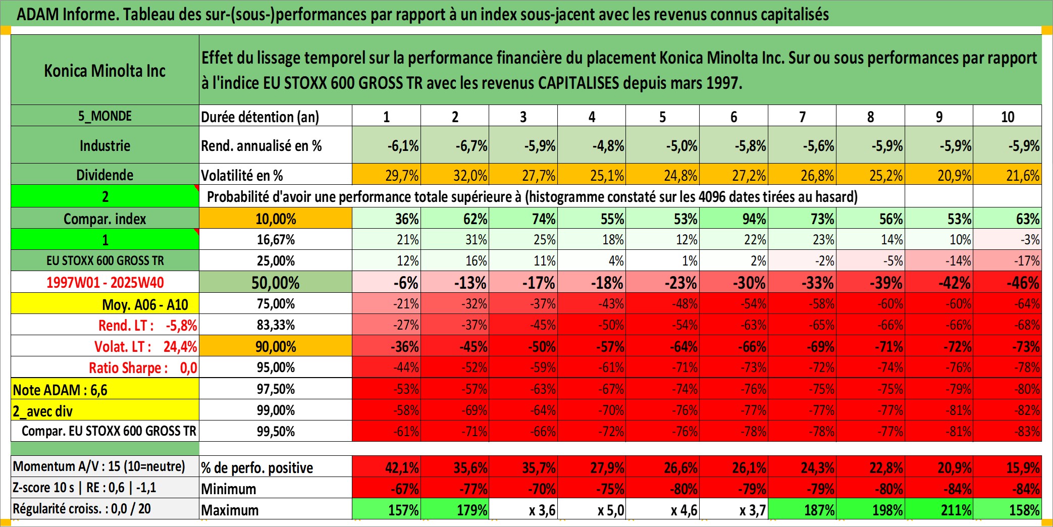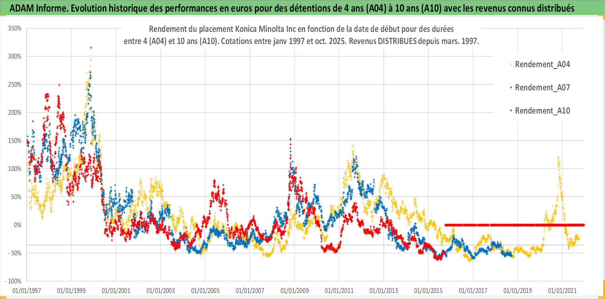 Site dédié aux investisseursPage dédiée sur site financeAnalyse des valorisations hebdomadaires de l'action Konica Minolta Inc. Cet actif est cote en JPY. Les valorisations sont en contrevaleur EURO et couvrent les semaines 1997W01 a 2025W40. Les revenus de cet actif financier sont pris en compte depuis la semaine 1997W13. La note ESG de cet actif n'est pas connue.
