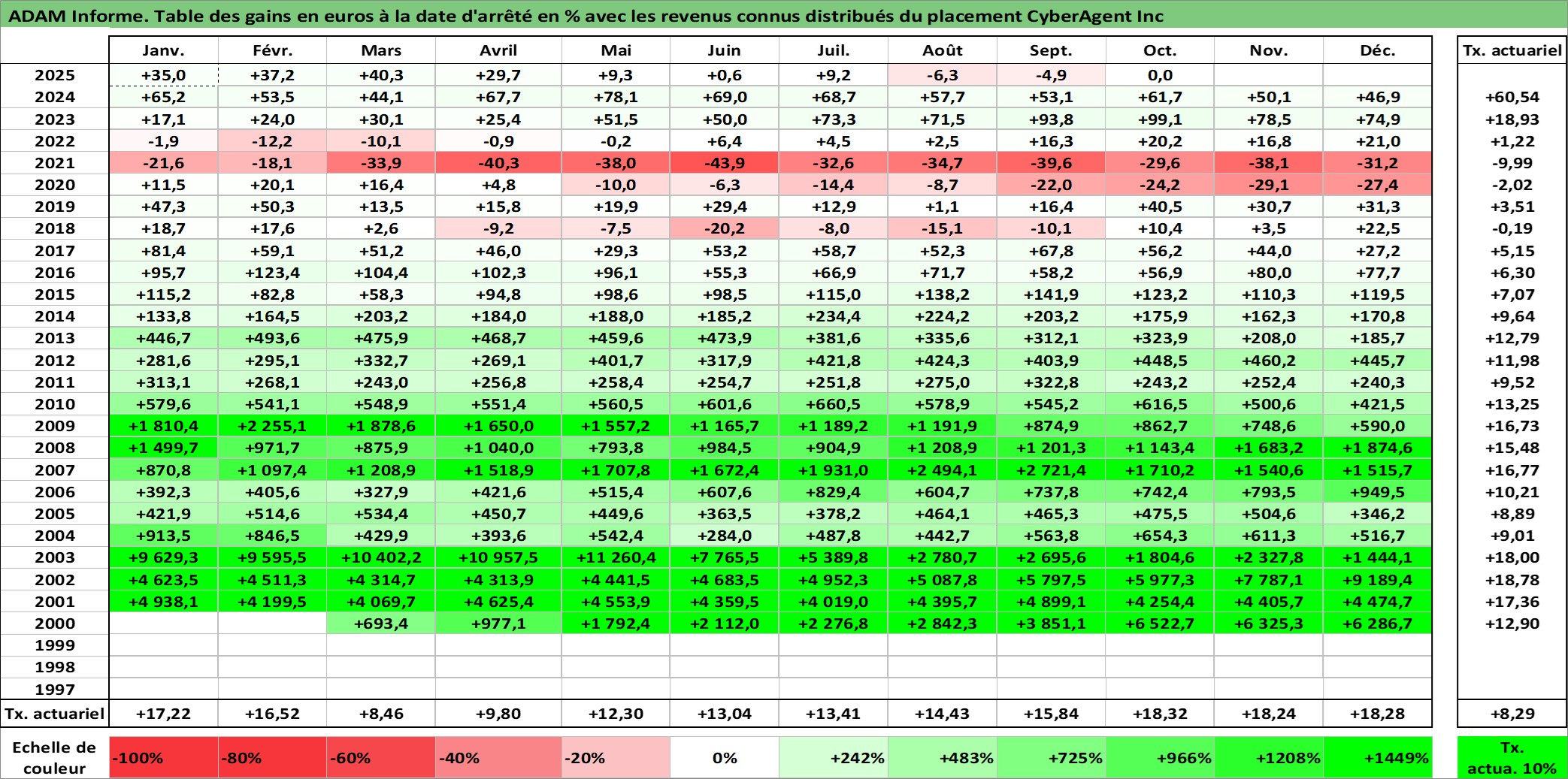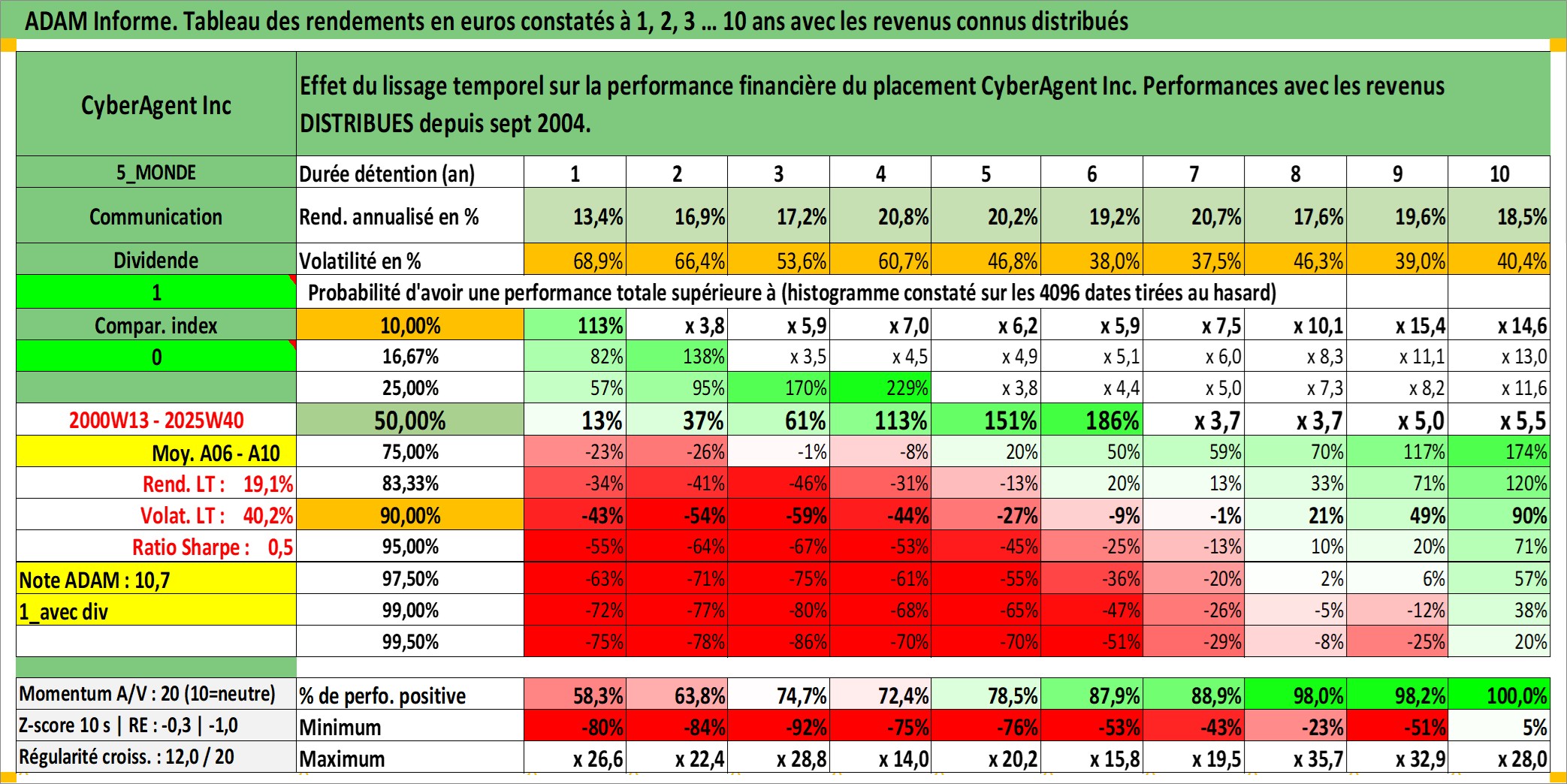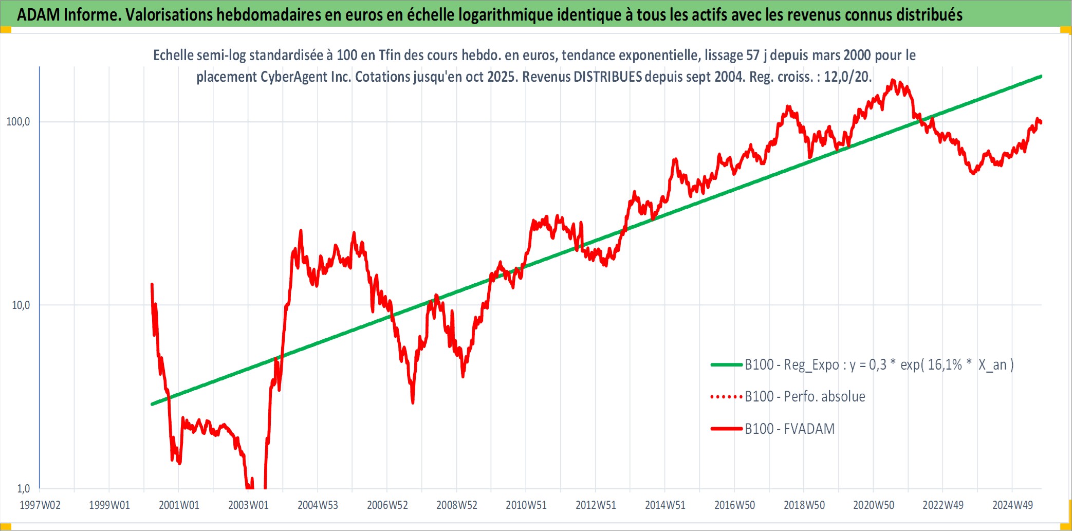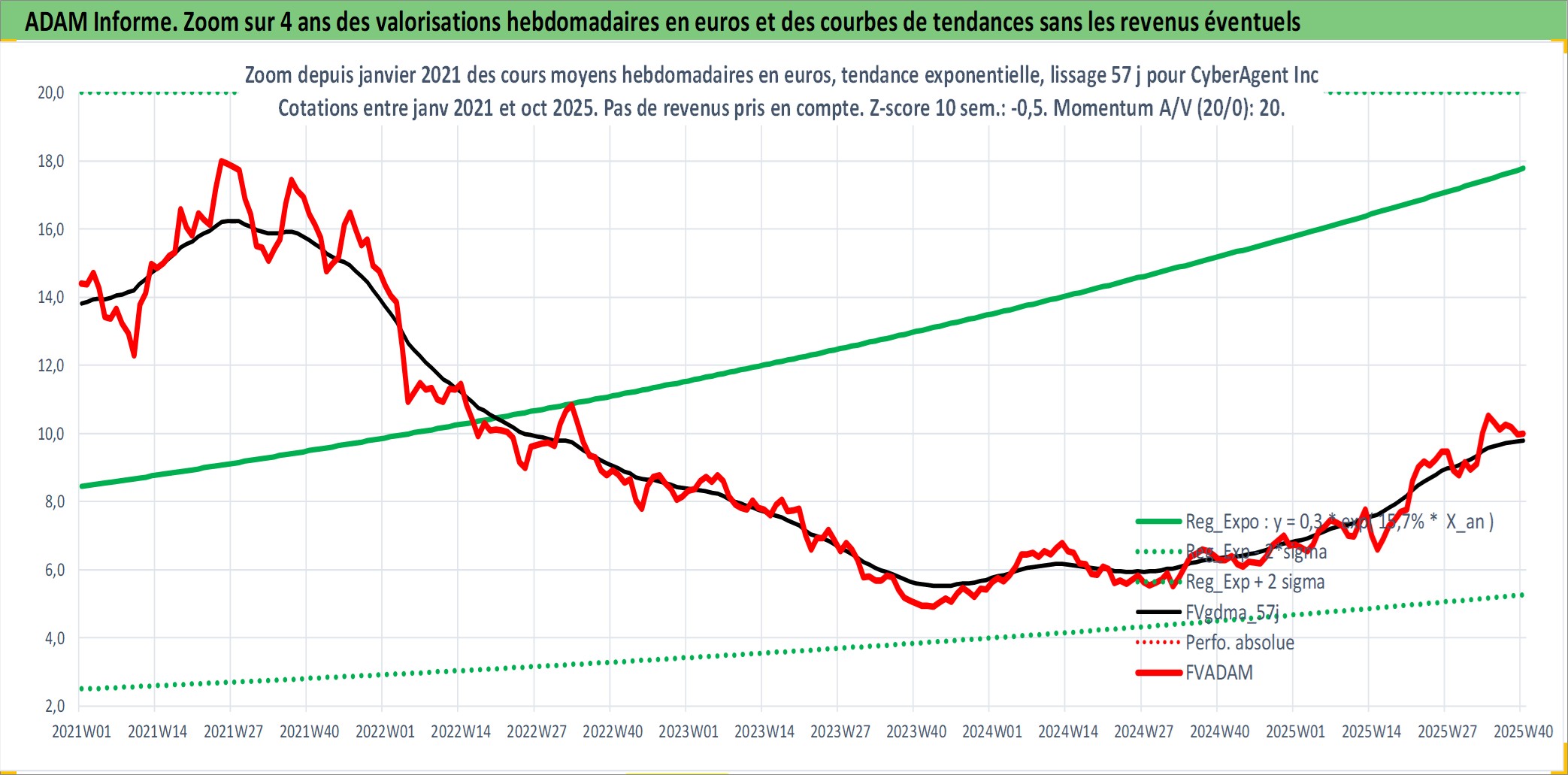 Site dédié aux investisseursPage dédiée sur site financeAnalyse des valorisations hebdomadaires de l'action CyberAgent Inc. Cet actif est cote en JPY. Les valorisations sont en contrevaleur EURO et couvrent les semaines 2000W13 a 2025W40. Les revenus de cet actif financier sont pris en compte depuis la semaine 2004W40. La note ESG de cet actif n'est pas connue.