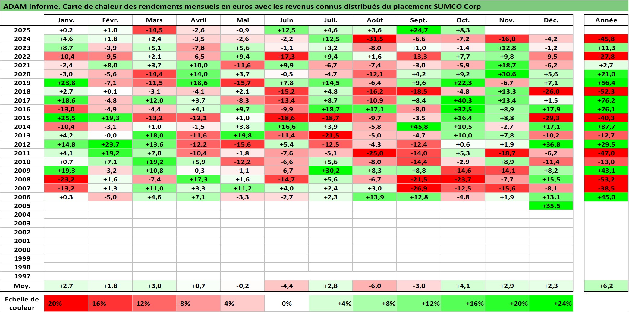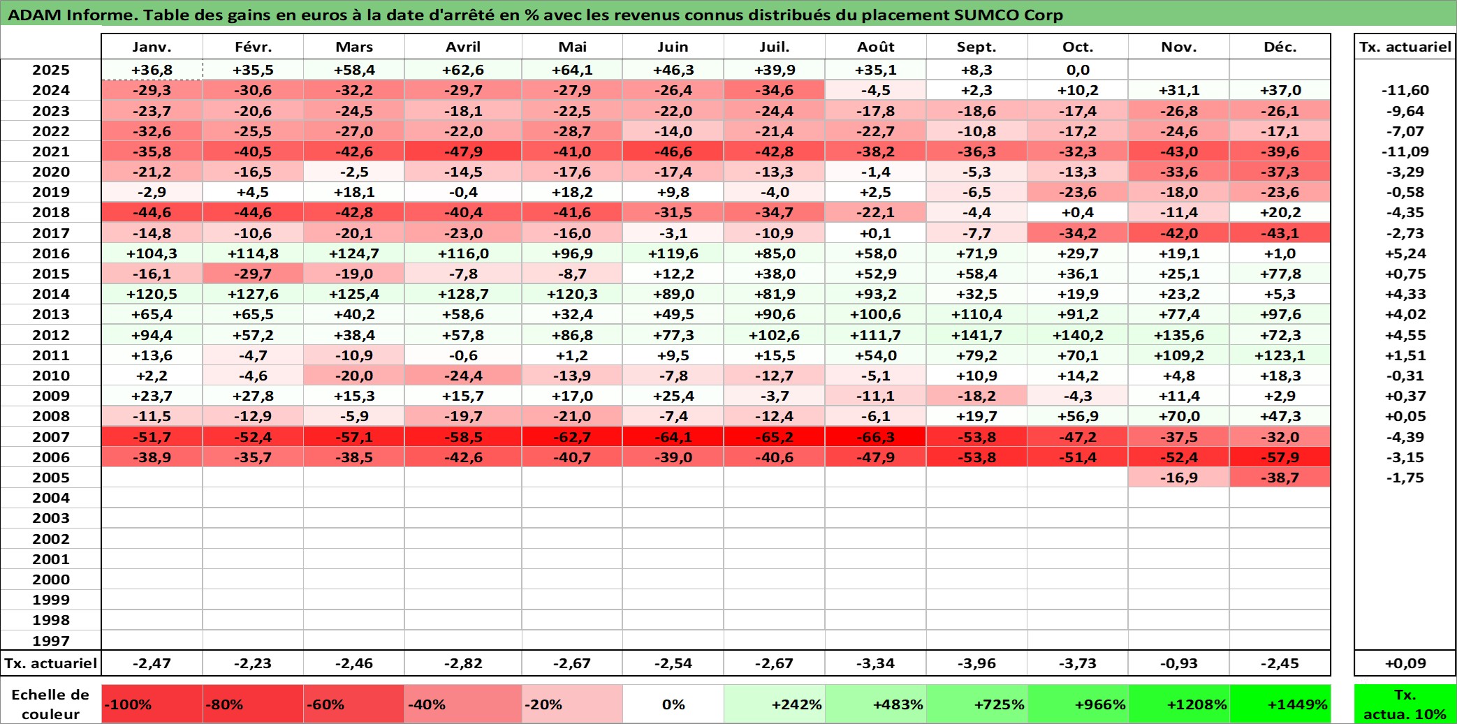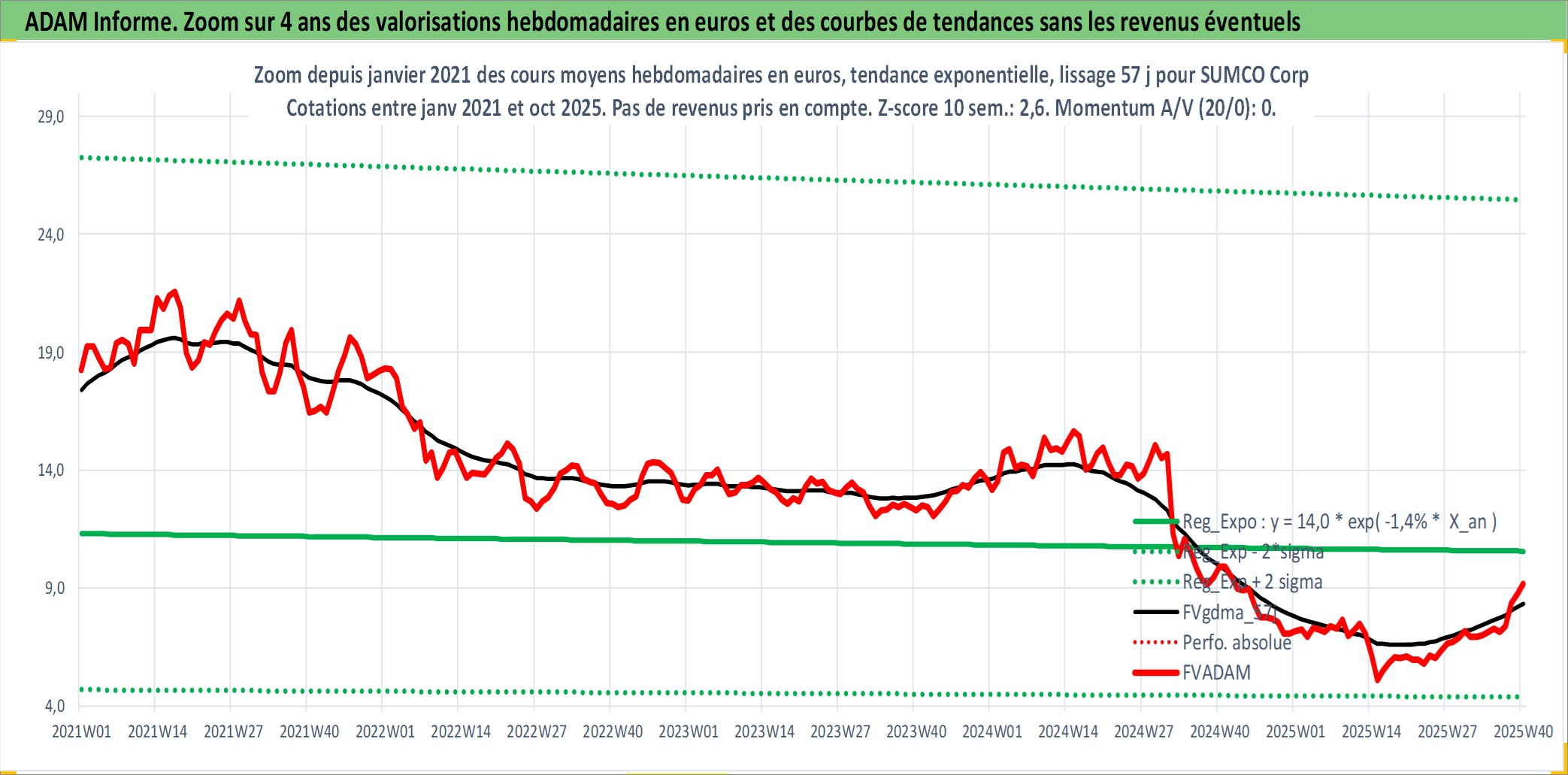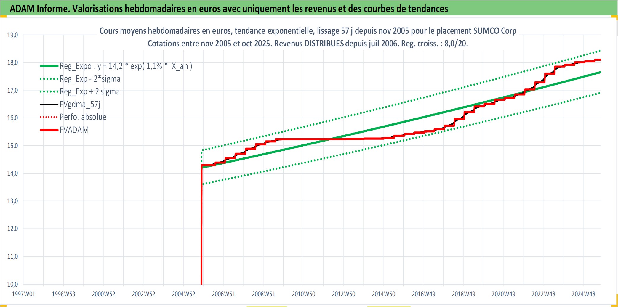 Site dédié aux investisseursPage dédiée sur site financeAnalyse des valorisations hebdomadaires de l'action SUMCO Corp. Cet actif est cote en JPY. Les valorisations sont en contrevaleur EURO et couvrent les semaines 2005W46 a 2025W40. Les revenus de cet actif financier sont pris en compte depuis la semaine 2006W30. La note ESG de cet actif n'est pas connue.