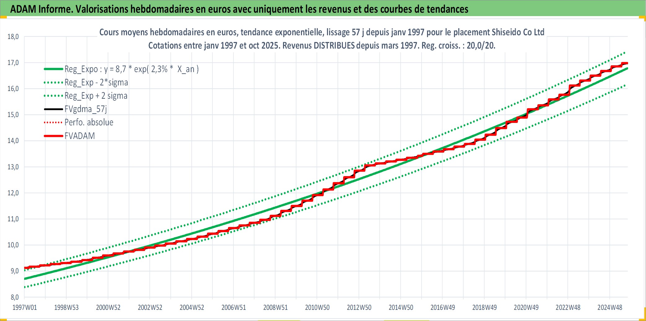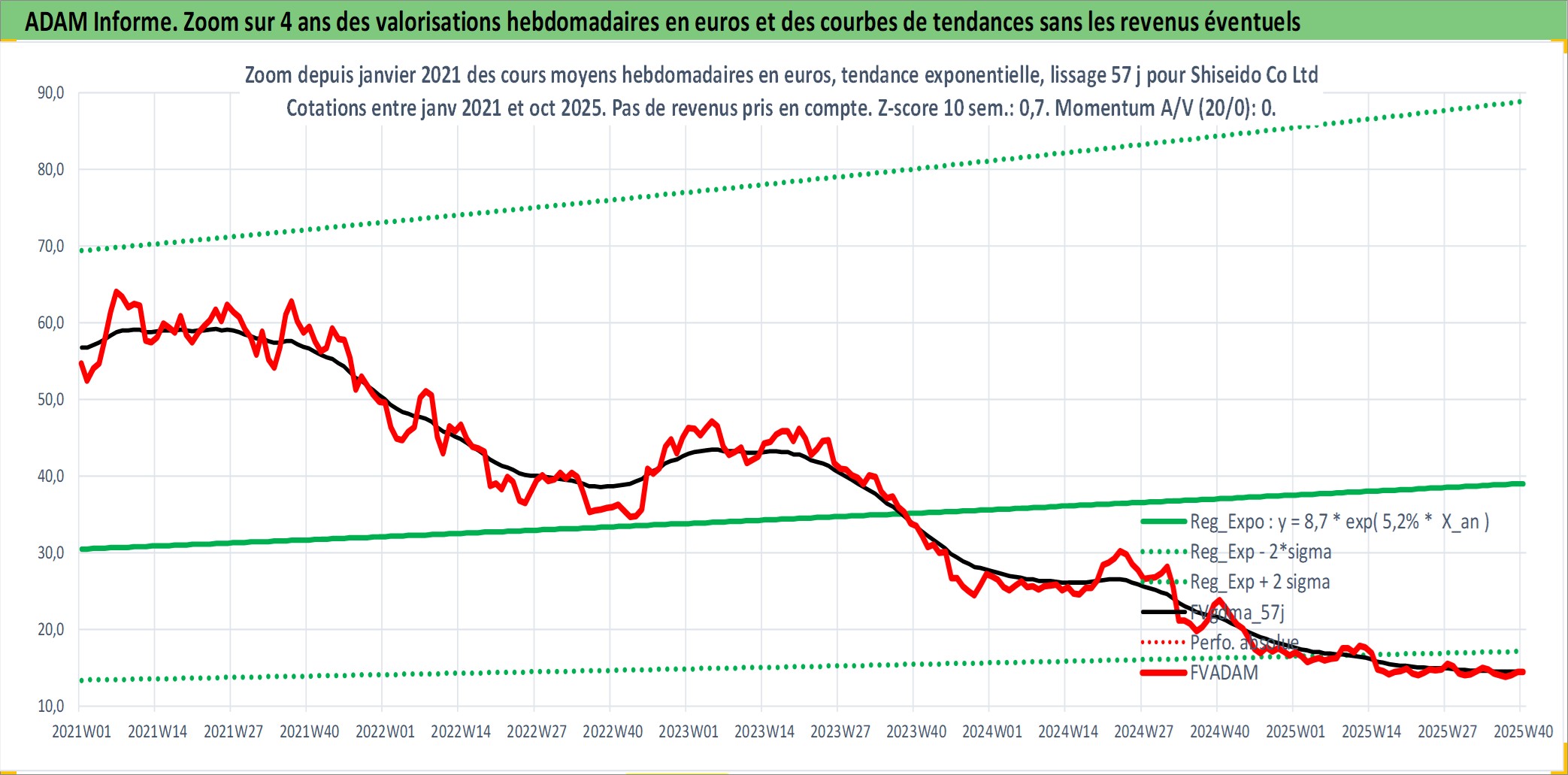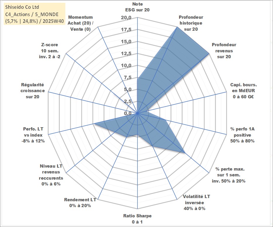 Site dédié aux investisseursPage dédiée sur site financeAnalyse des valorisations hebdomadaires de l'action Shiseido Co Ltd. Cet actif est cote en JPY. Les valorisations sont en contrevaleur EURO et couvrent les semaines 1997W01 a 2025W40. Les revenus de cet actif financier sont pris en compte depuis la semaine 1997W13. La note globale ESG de cet actif est estimee a 7.0 (apres rebasage entre 0 et 20).