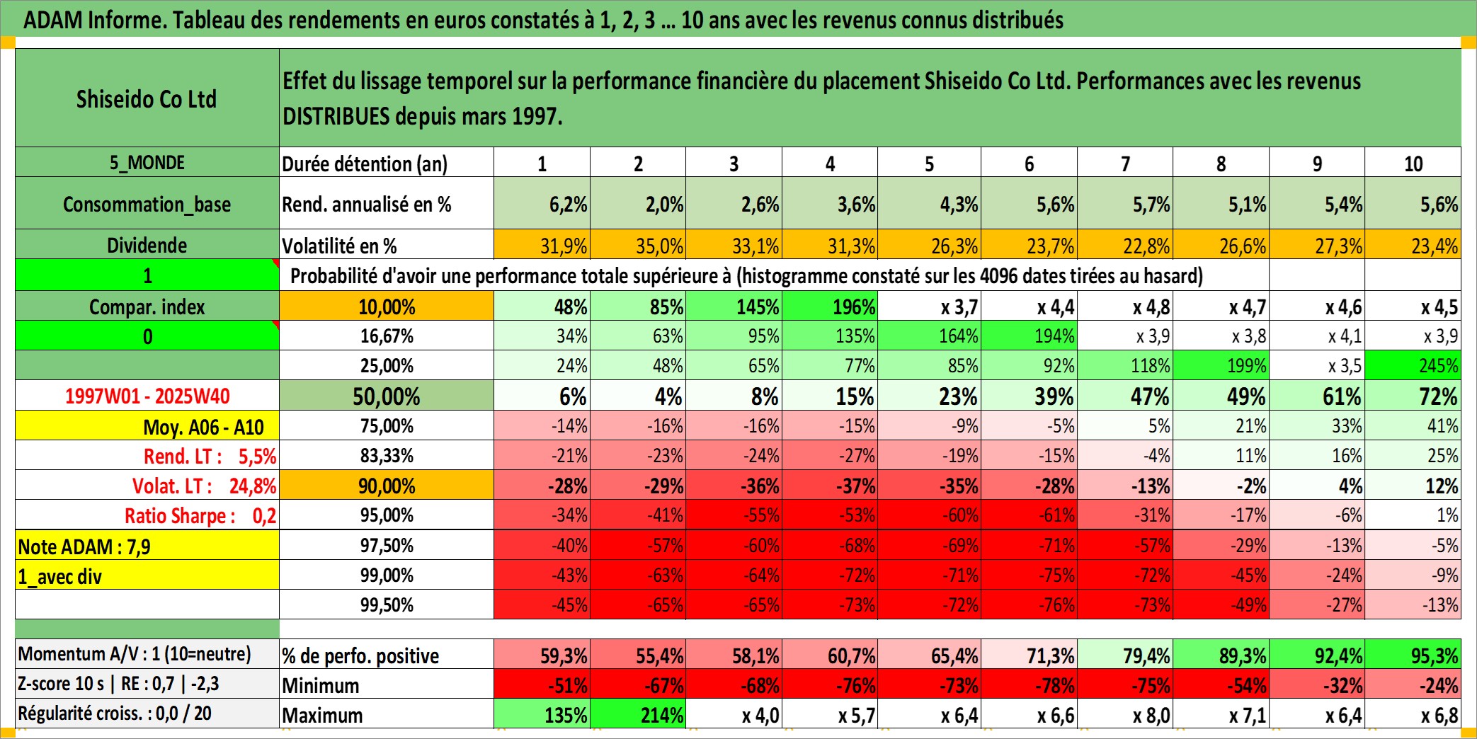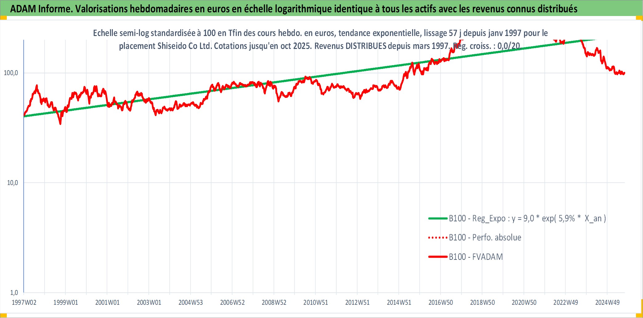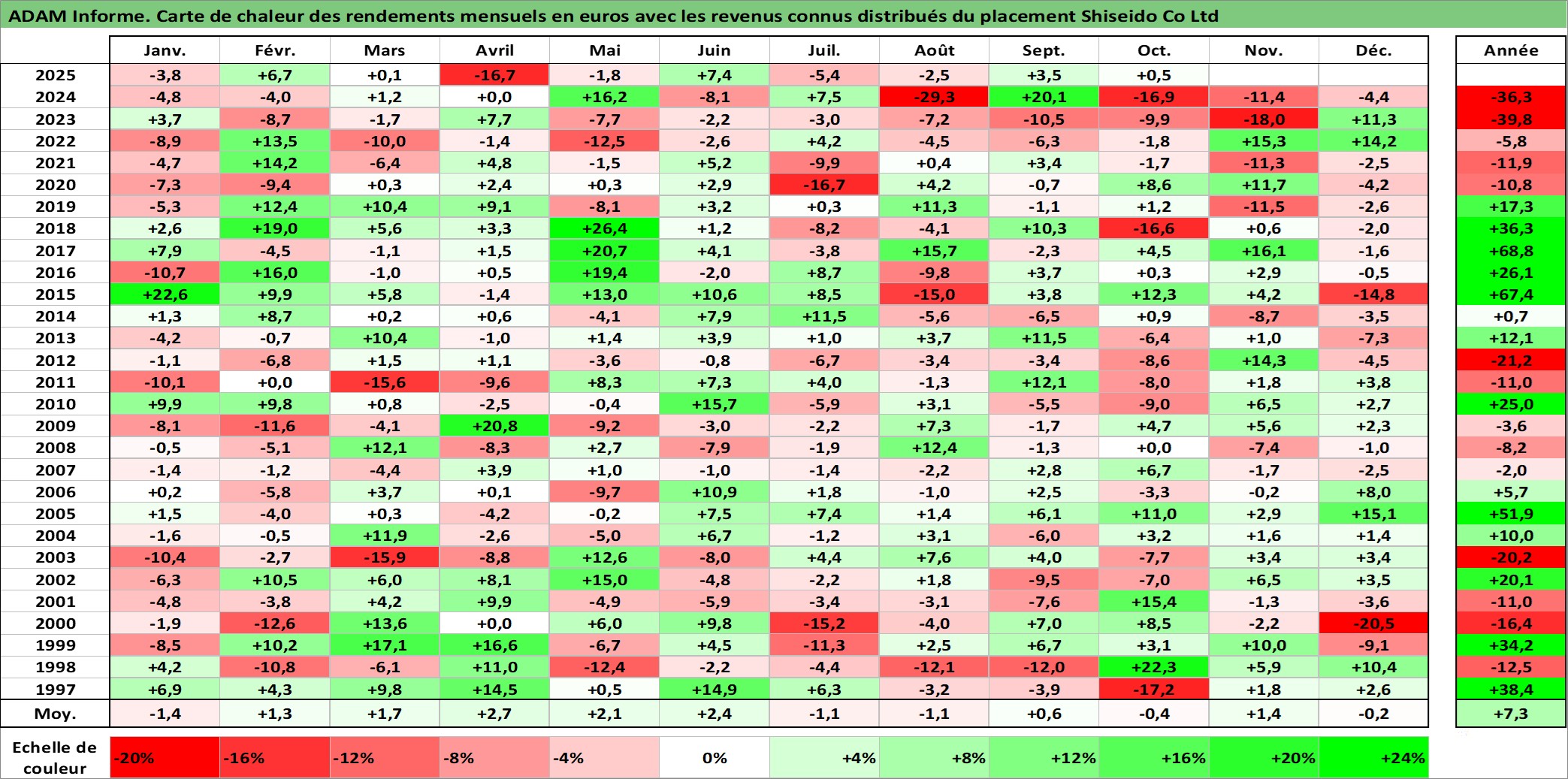 Site dédié aux investisseursPage dédiée sur site financeAnalyse des valorisations hebdomadaires de l'action Shiseido Co Ltd. Cet actif est cote en JPY. Les valorisations sont en contrevaleur EURO et couvrent les semaines 1997W01 a 2025W40. Les revenus de cet actif financier sont pris en compte depuis la semaine 1997W13. La note globale ESG de cet actif est estimee a 7.0 (apres rebasage entre 0 et 20).