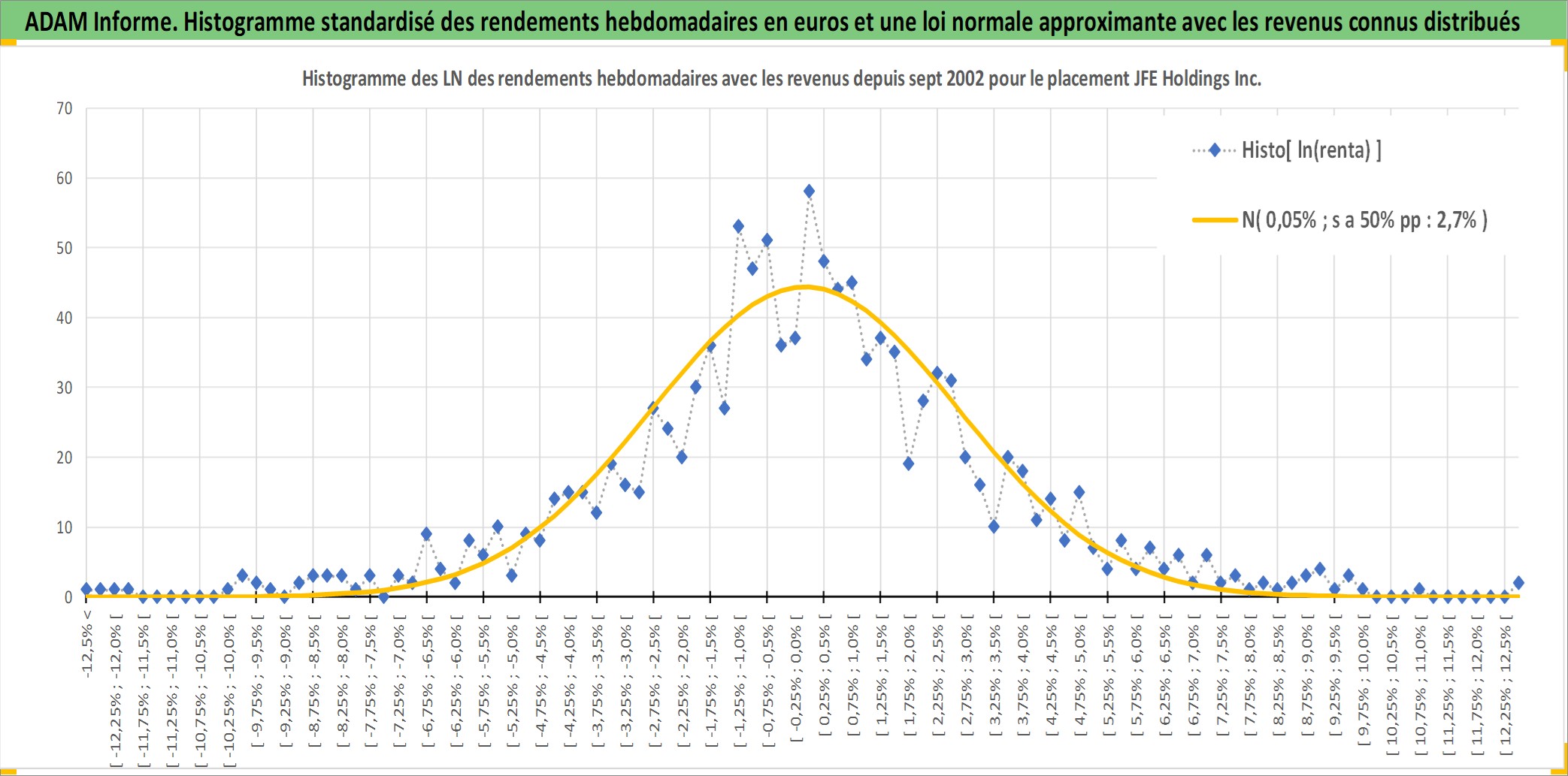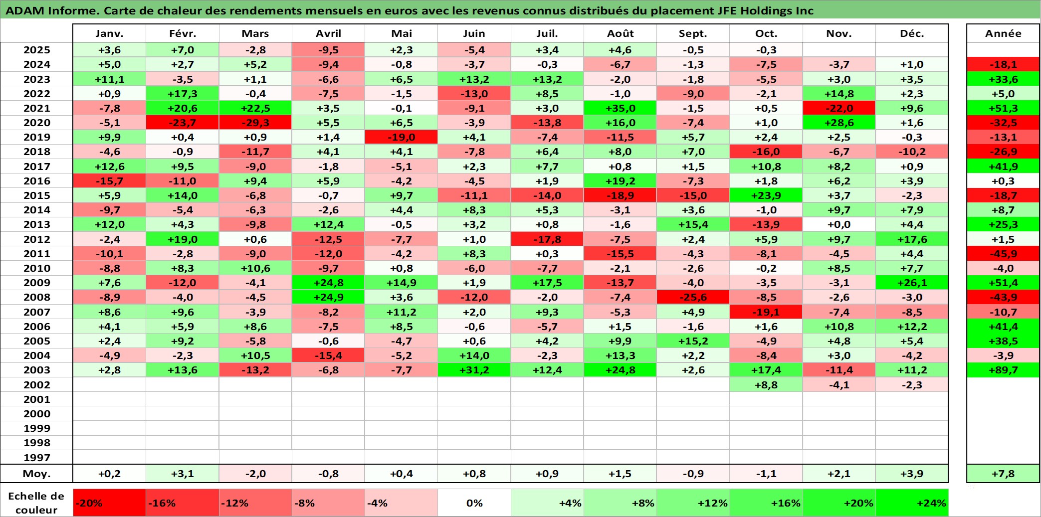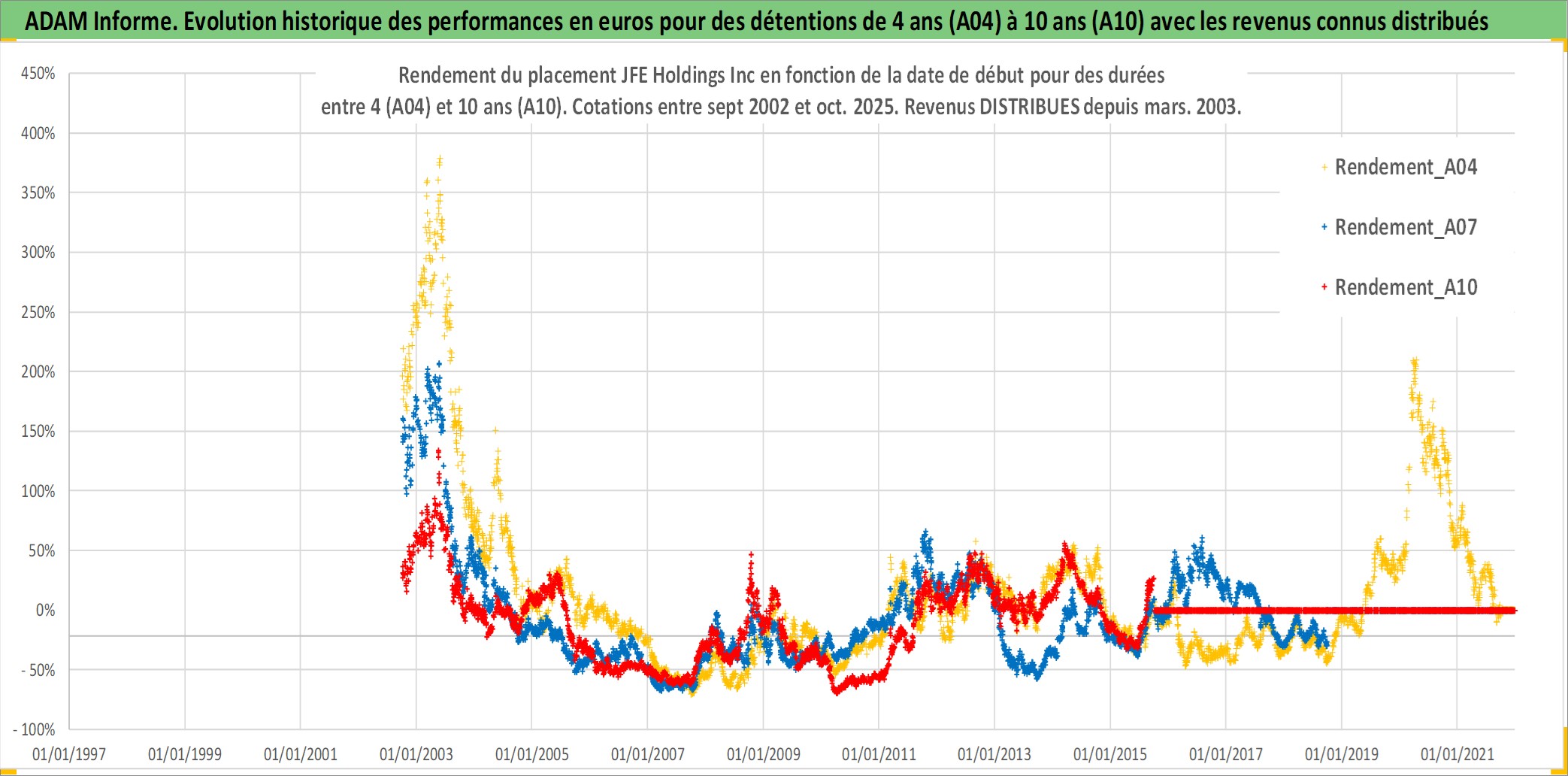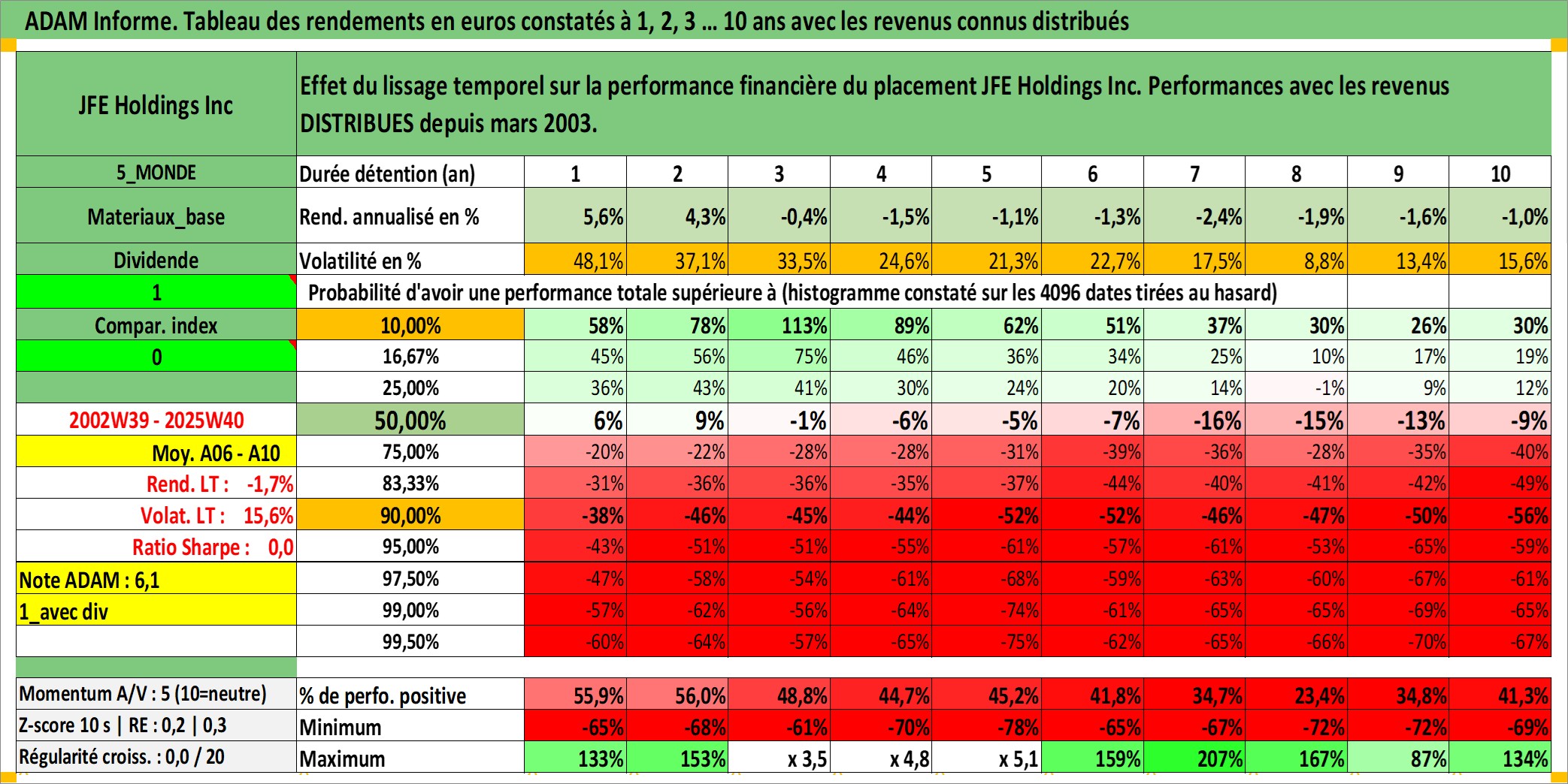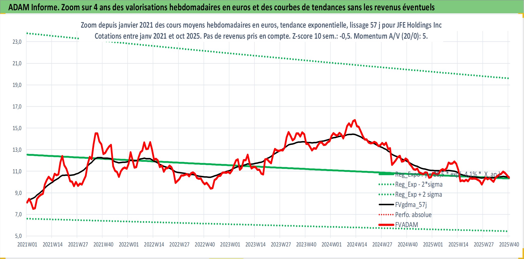 Site dédié aux investisseursPage dédiée sur site financeAnalyse des valorisations hebdomadaires de l'action JFE Holdings Inc. Cet actif est cote en JPY. Les valorisations sont en contrevaleur EURO et couvrent les semaines 2002W39 a 2025W40. Les revenus de cet actif financier sont pris en compte depuis la semaine 2003W13. La note globale ESG de cet actif est estimee a 3.0 (apres rebasage entre 0 et 20).