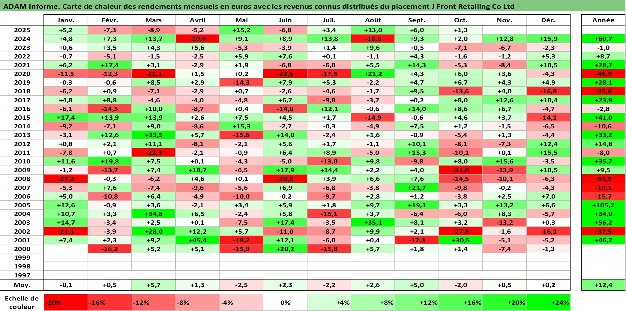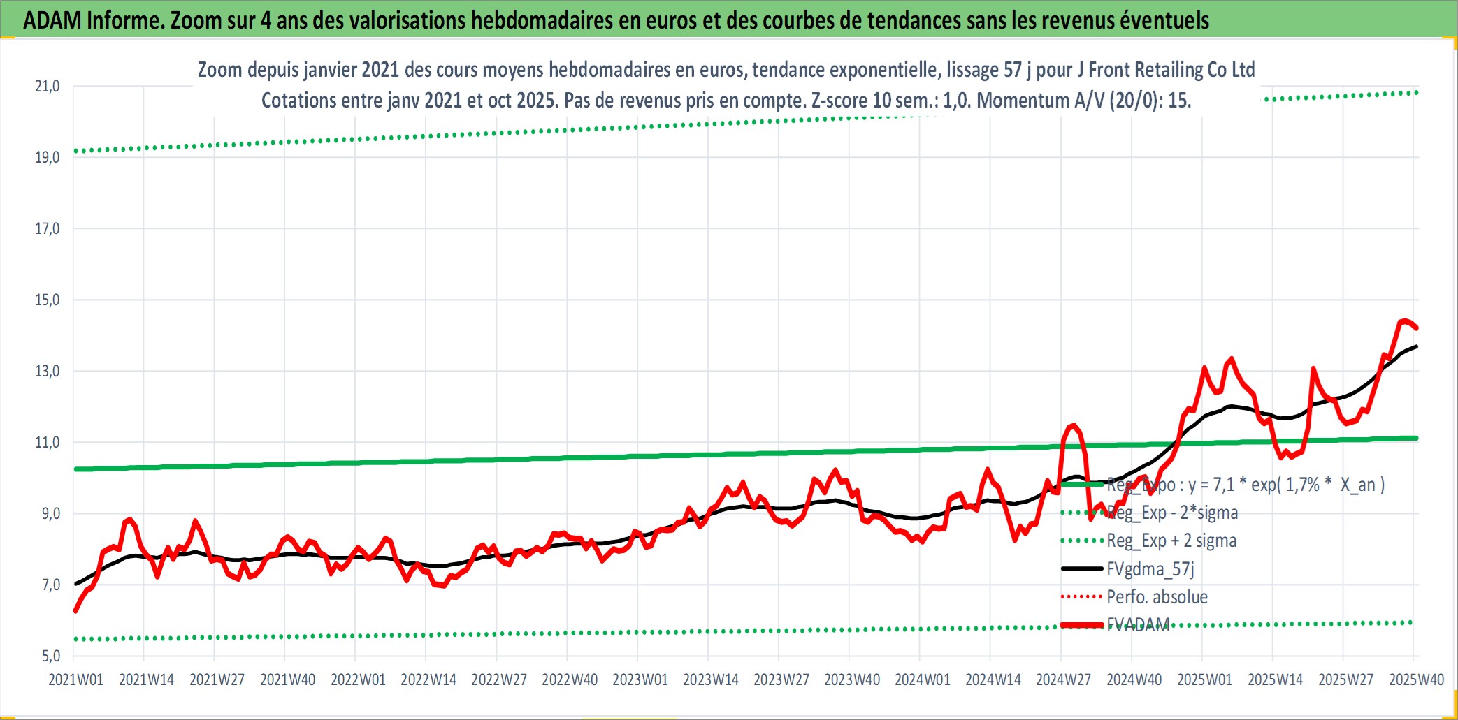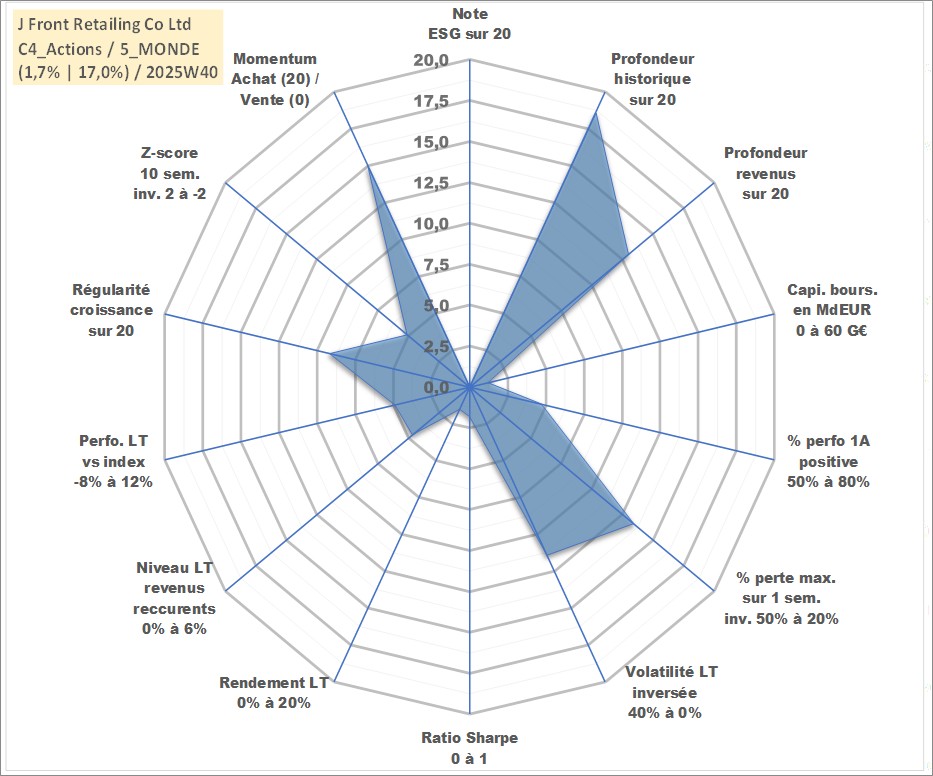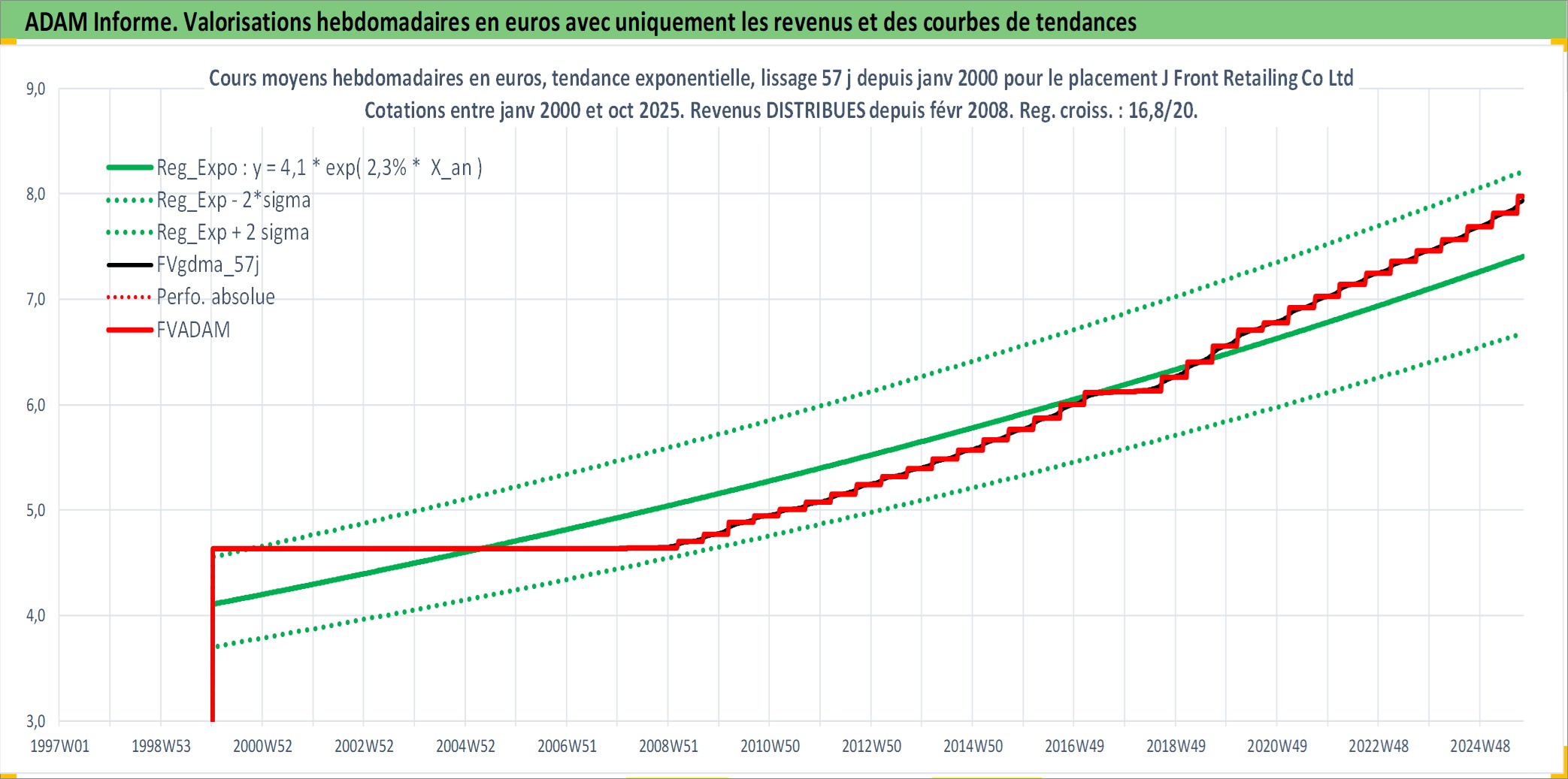 Site dédié aux investisseursPage dédiée sur site financeAnalyse des valorisations hebdomadaires de l'action J Front Retailing Co Ltd. Cet actif est cote en JPY. Les valorisations sont en contrevaleur EURO et couvrent les semaines 2000W01 a 2025W40. Les revenus de cet actif financier sont pris en compte depuis la semaine 2008W09. La note ESG de cet actif n'est pas connue.