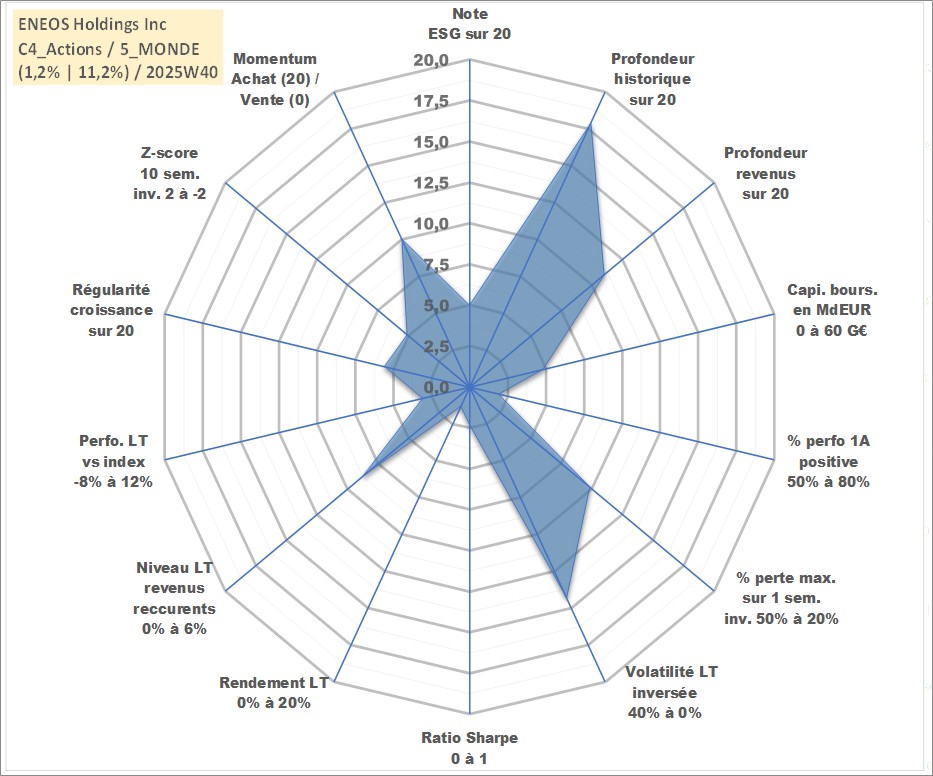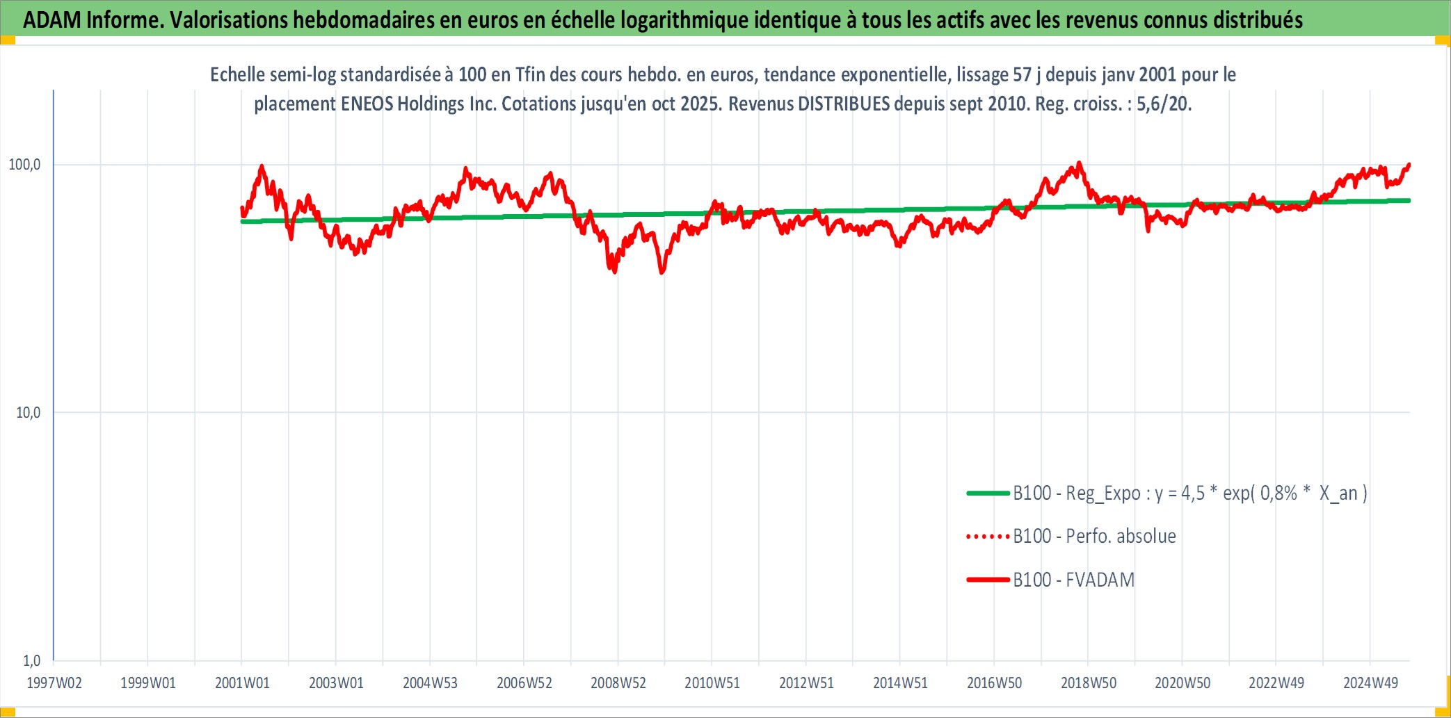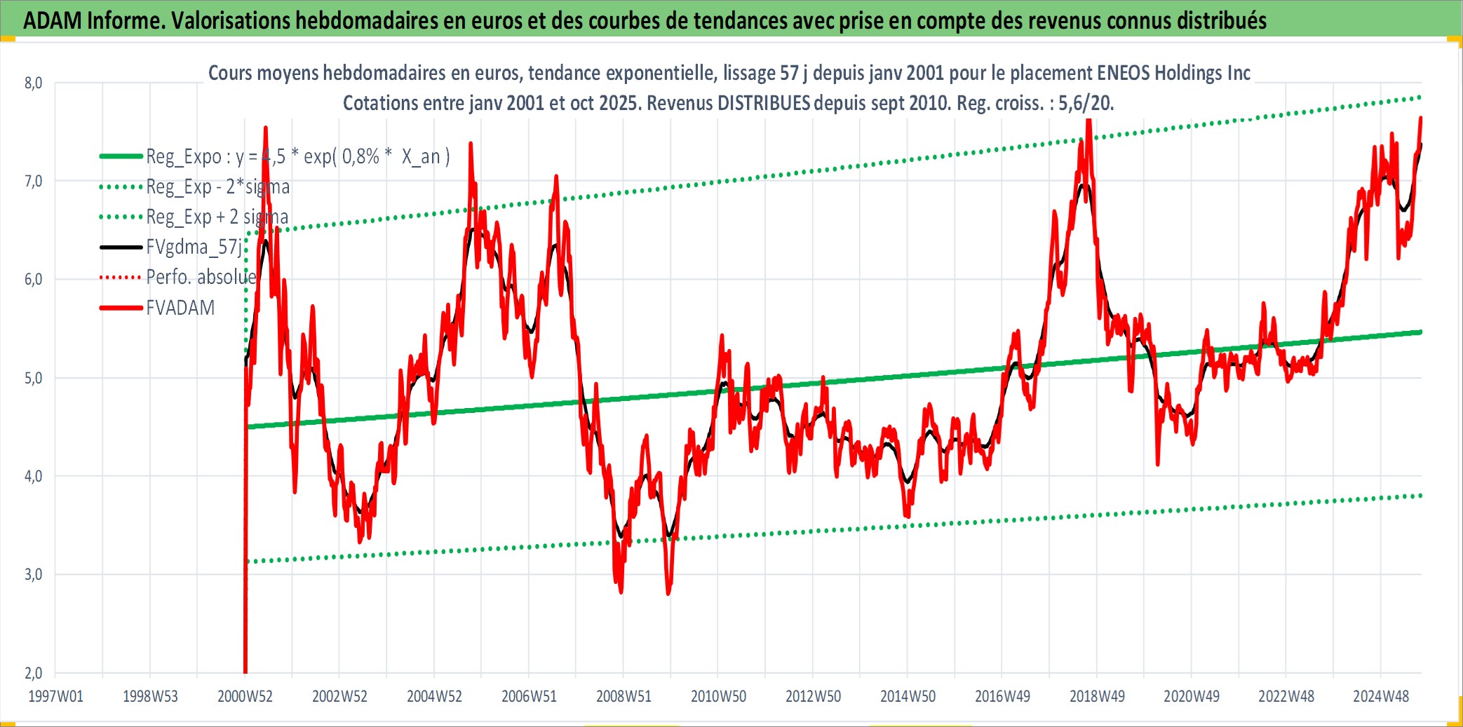 Site dédié aux investisseursPage dédiée sur site financeAnalyse des valorisations hebdomadaires de l'action ENEOS Holdings Inc. Cet actif est cote en JPY. Les valorisations sont en contrevaleur EURO et couvrent les semaines 2001W01 a 2025W40. Les revenus de cet actif financier sont pris en compte depuis la semaine 2010W39. La note globale ESG de cet actif est estimee a 5.0 (apres rebasage entre 0 et 20).