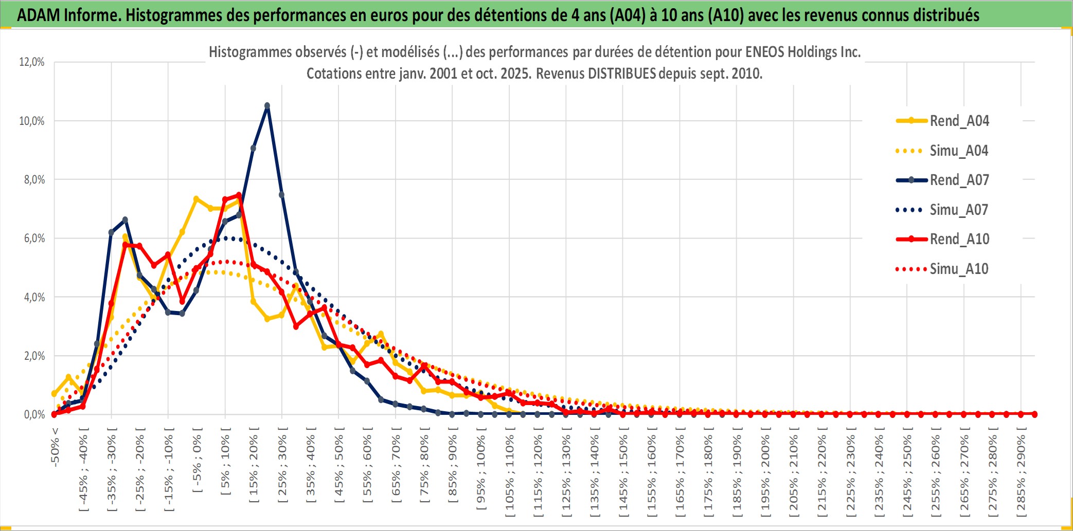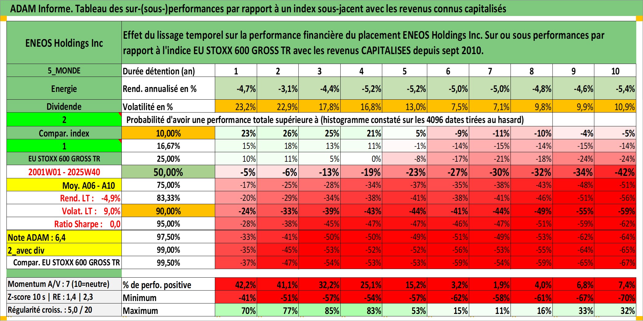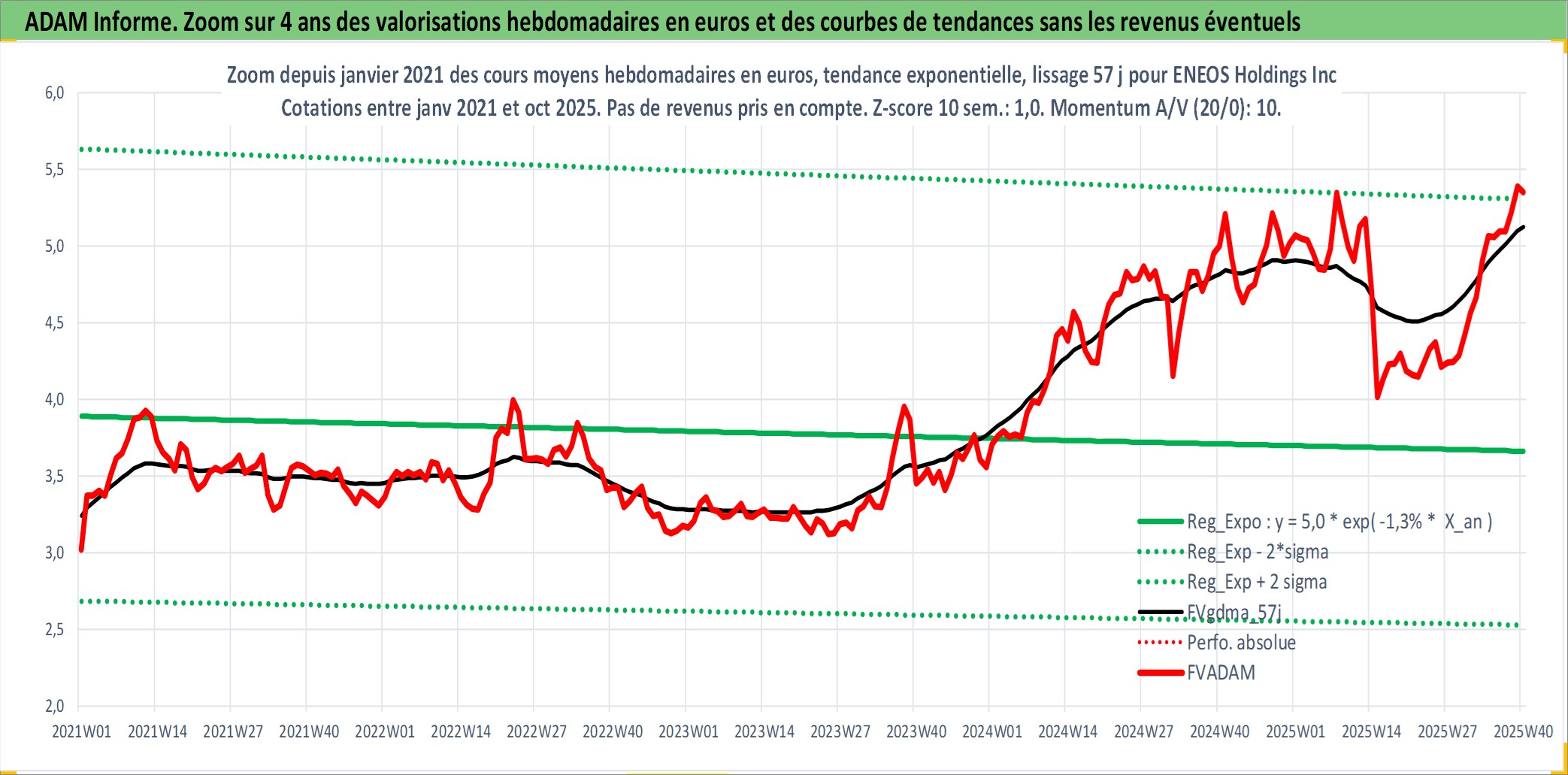 Site dédié aux investisseursPage dédiée sur site financeAnalyse des valorisations hebdomadaires de l'action ENEOS Holdings Inc. Cet actif est cote en JPY. Les valorisations sont en contrevaleur EURO et couvrent les semaines 2001W01 a 2025W40. Les revenus de cet actif financier sont pris en compte depuis la semaine 2010W39. La note globale ESG de cet actif est estimee a 5.0 (apres rebasage entre 0 et 20).