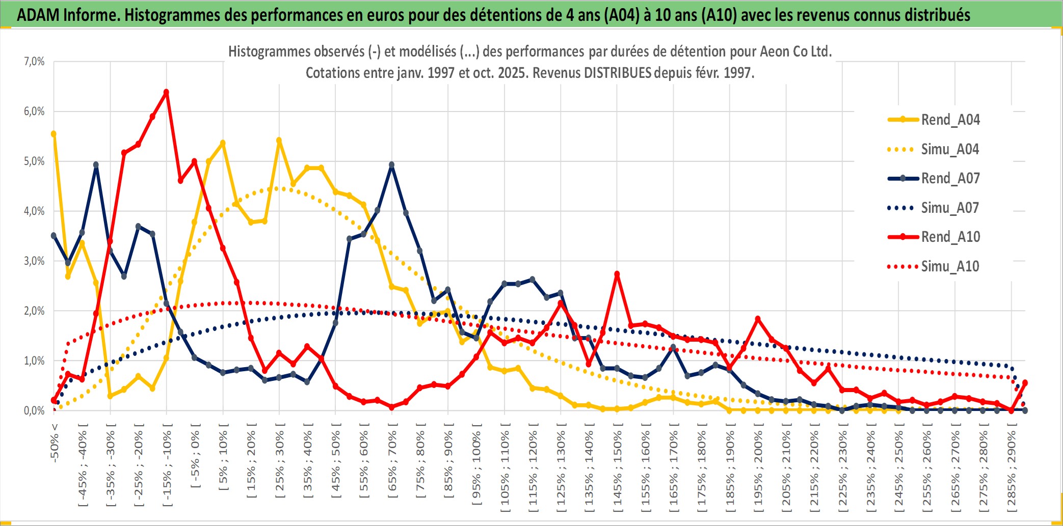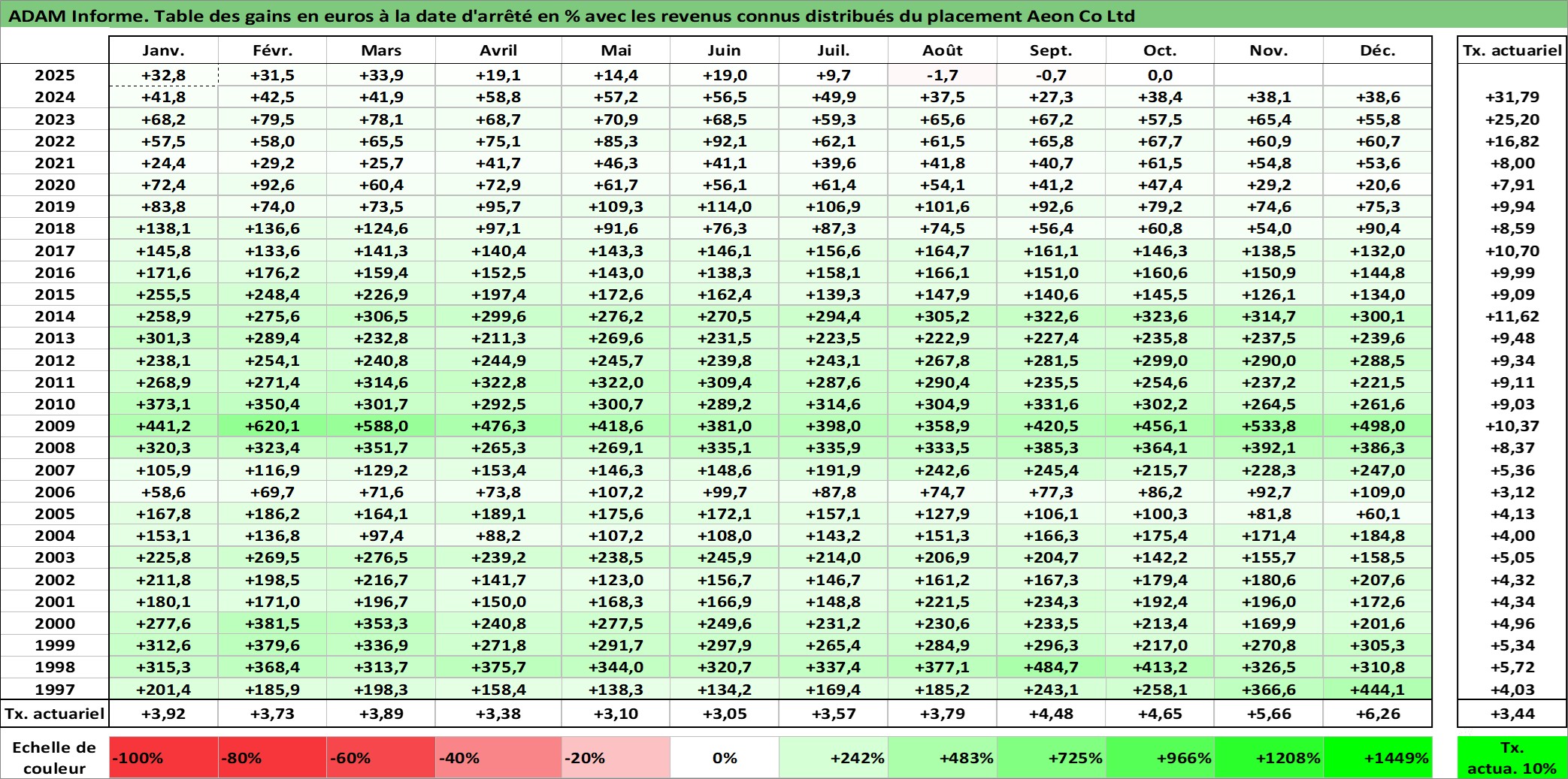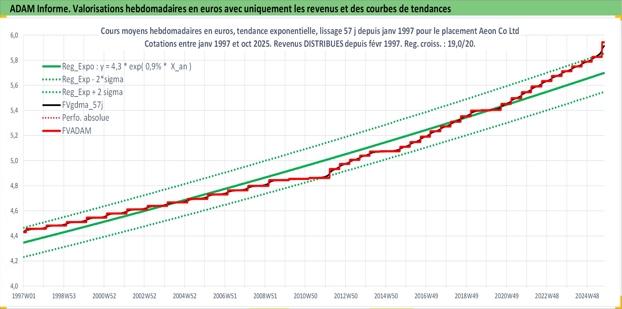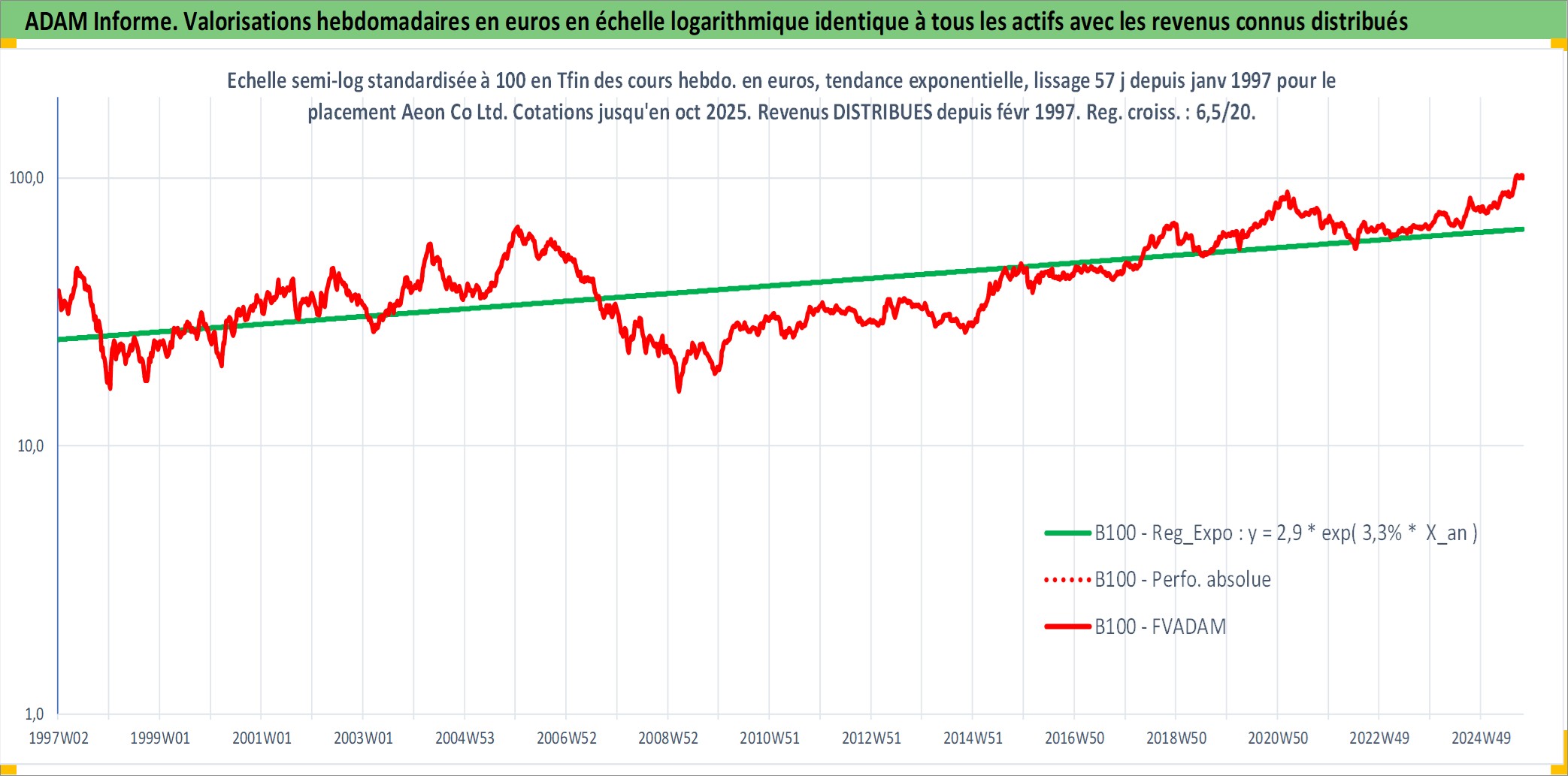 Site dédié aux investisseursPage dédiée sur site financeAnalyse des valorisations hebdomadaires de l'action Aeon Co Ltd. Cet actif est cote en JPY. Les valorisations sont en contrevaleur EURO et couvrent les semaines 1997W01 a 2025W40. Les revenus de cet actif financier sont pris en compte depuis la semaine 1997W08. La note globale ESG de cet actif est estimee a 10.0 (apres rebasage entre 0 et 20).