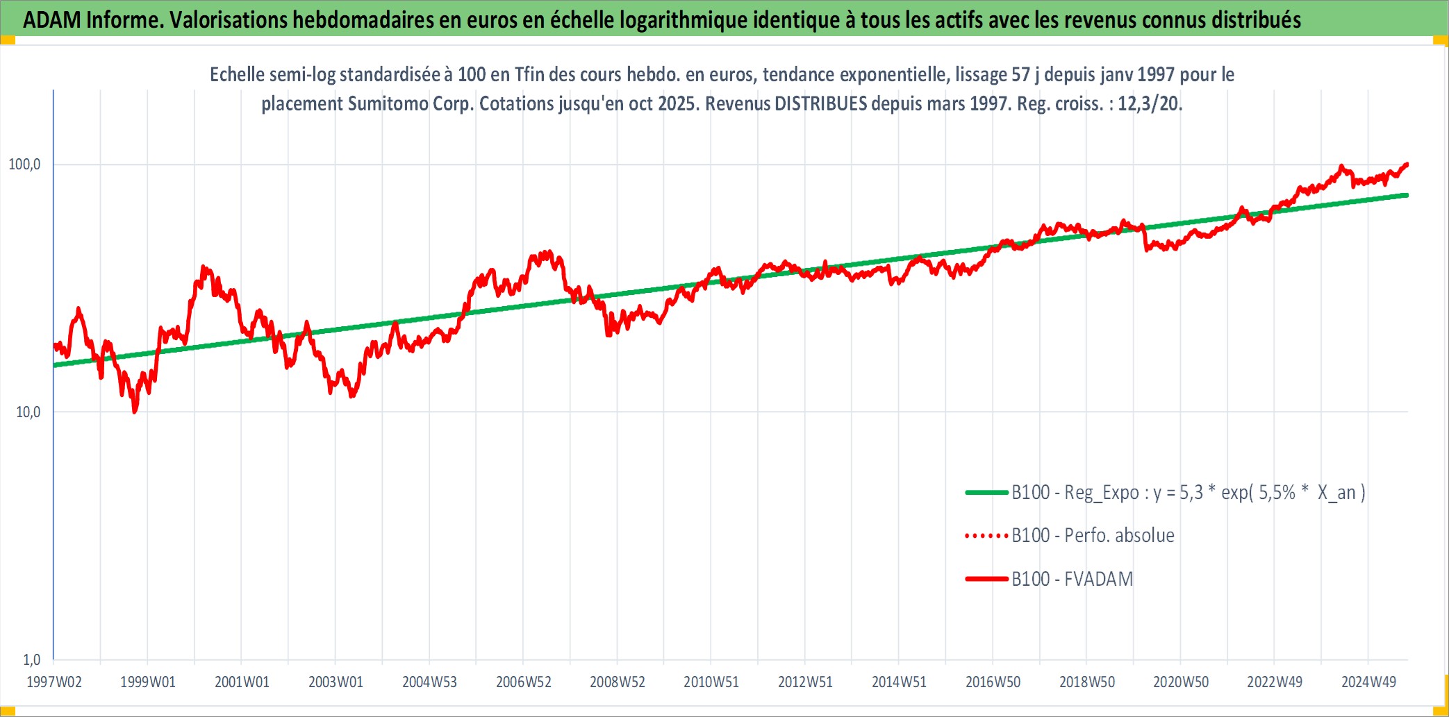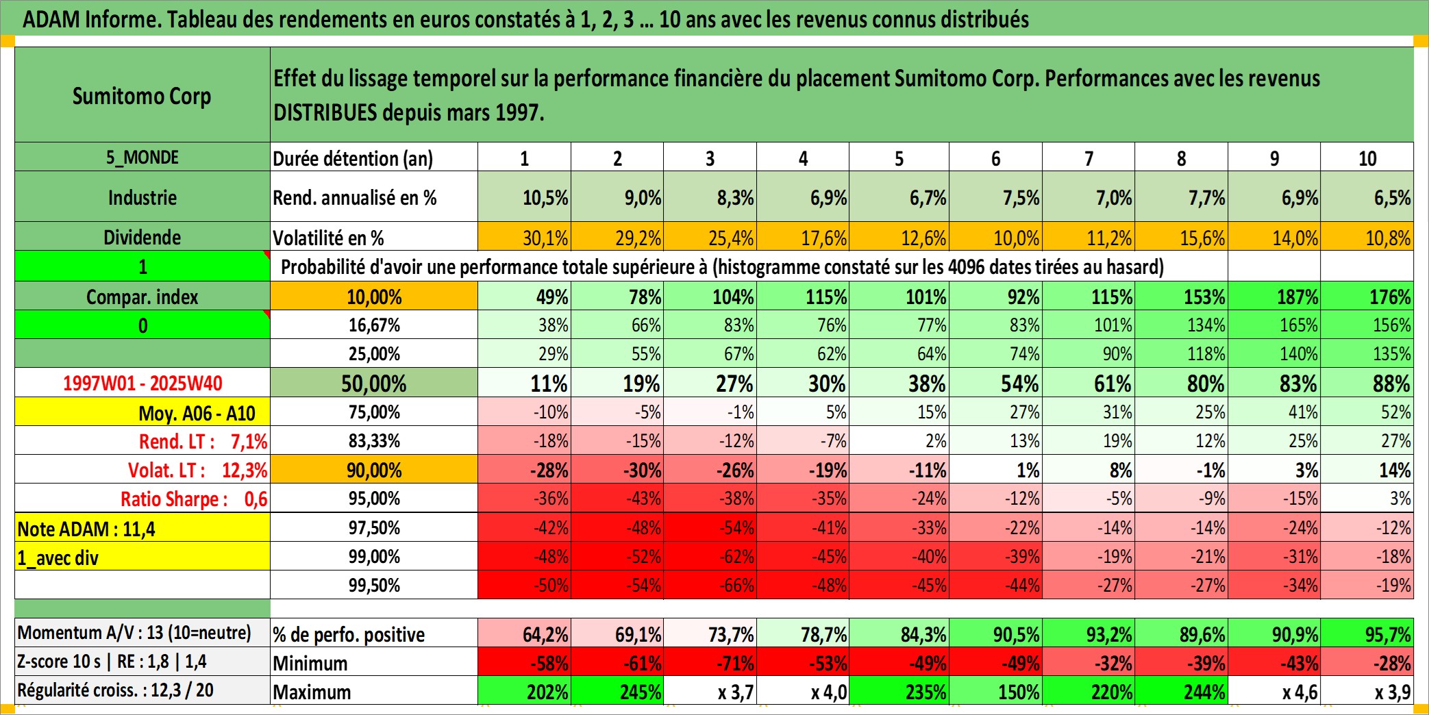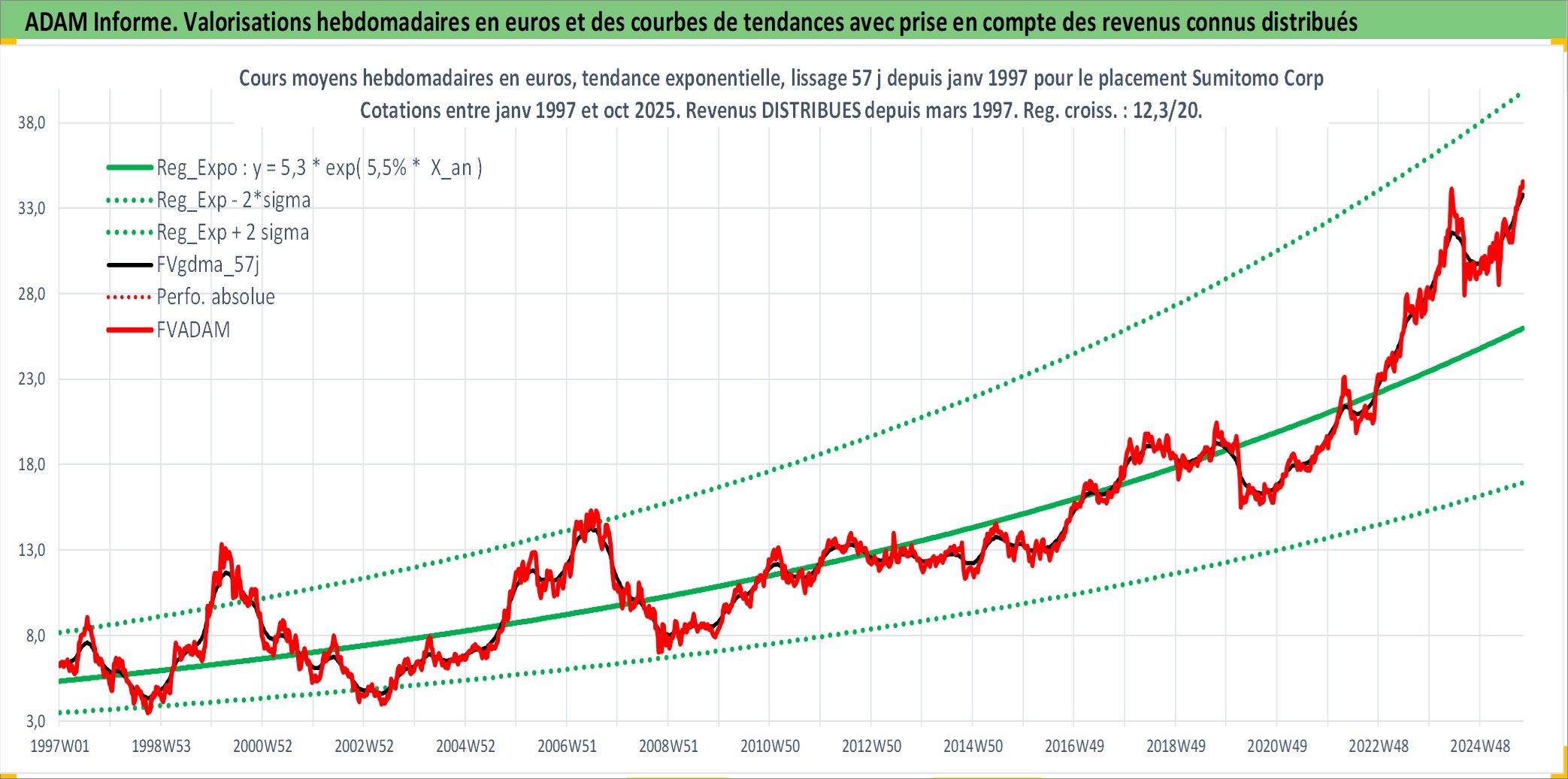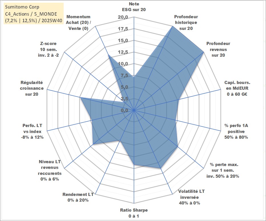 Site dédié aux investisseursPage dédiée sur site financeAnalyse des valorisations hebdomadaires de l'action Sumitomo Corp. Cet actif est cote en JPY. Les valorisations sont en contrevaleur EURO et couvrent les semaines 1997W01 a 2025W40. Les revenus de cet actif financier sont pris en compte depuis la semaine 1997W13. La note globale ESG de cet actif est estimee a 7.0 (apres rebasage entre 0 et 20).