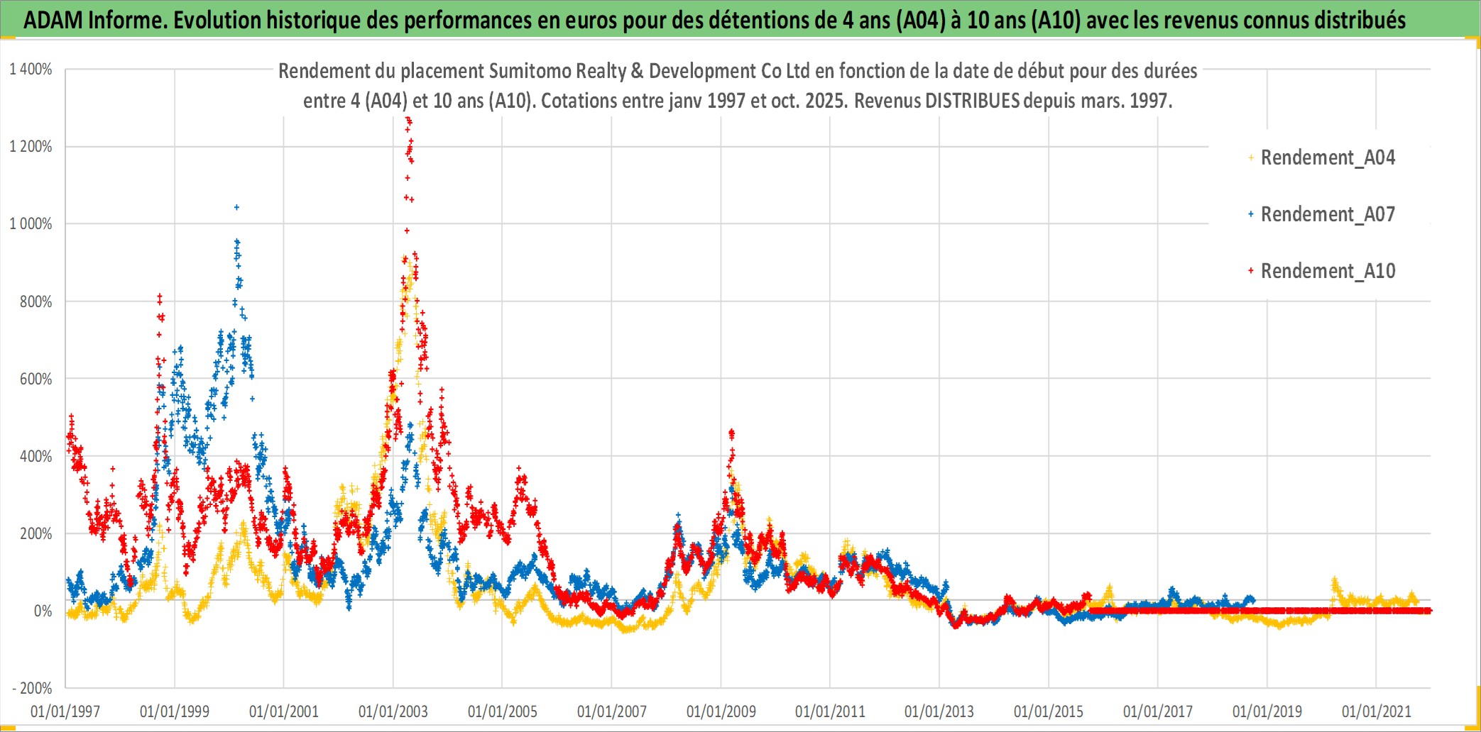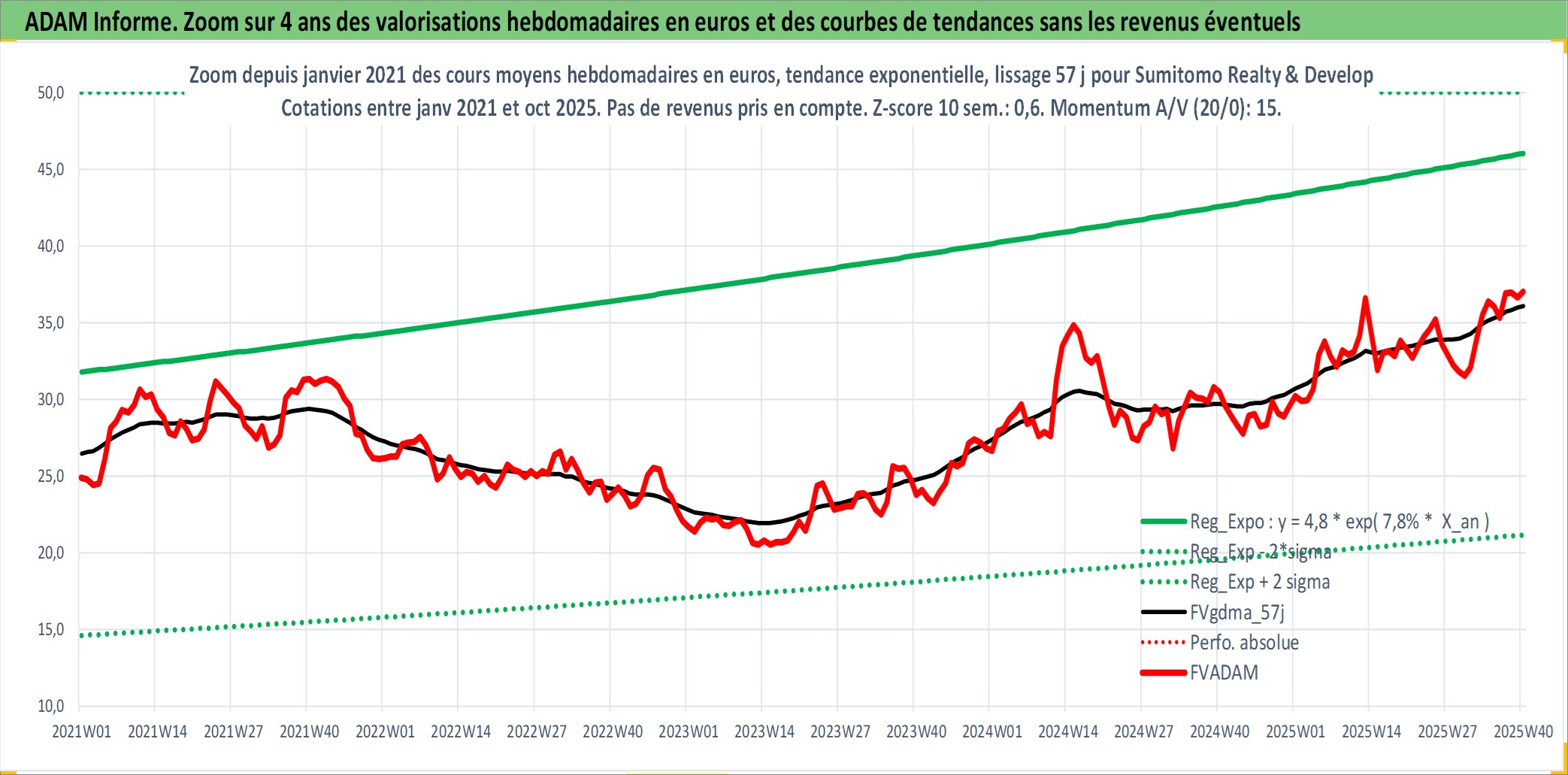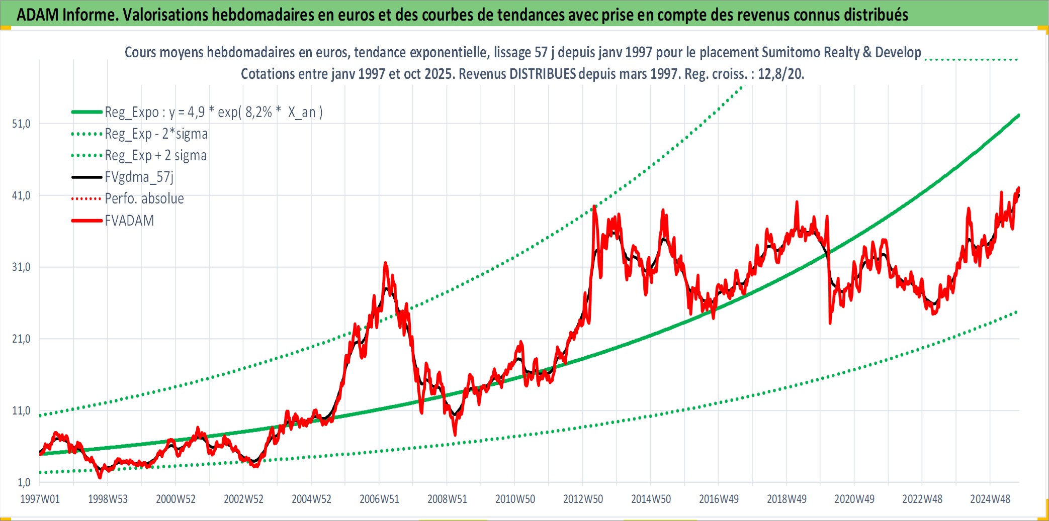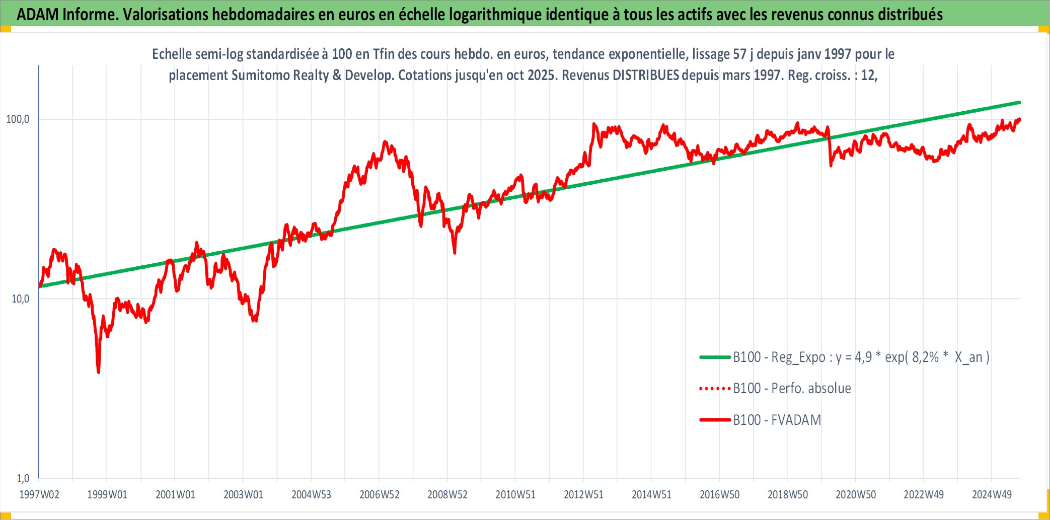 Site dédié aux investisseursPage dédiée sur site financeAnalyse des valorisations hebdomadaires de l'action Sumitomo Realty & Development Co Ltd. Cet actif est cote en JPY. Les valorisations sont en contrevaleur EURO et couvrent les semaines 1997W01 a 2025W40. Les revenus de cet actif financier sont pris en compte depuis la semaine 1997W13. La note globale ESG de cet actif est estimee a 8.0 (apres rebasage entre 0 et 20).